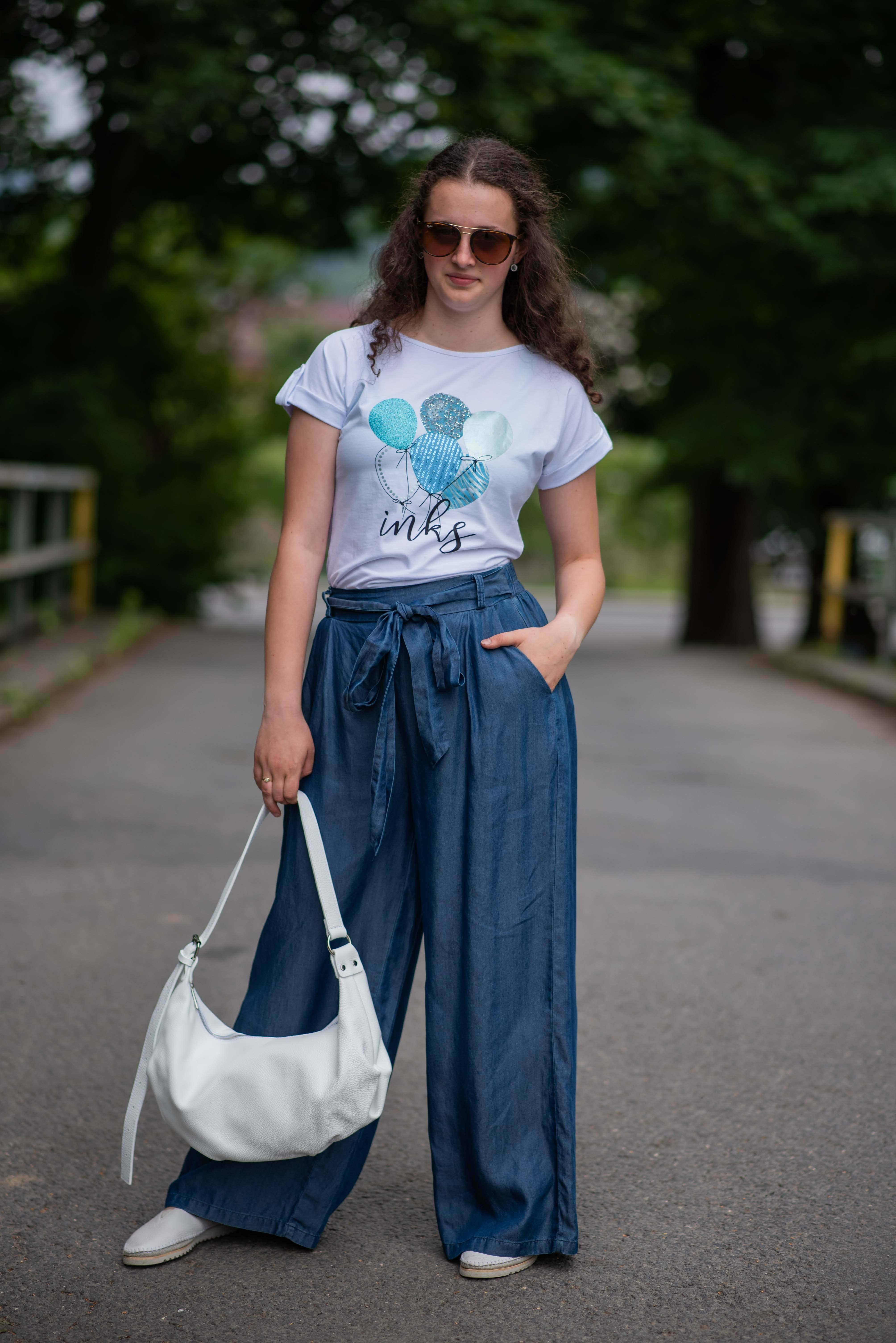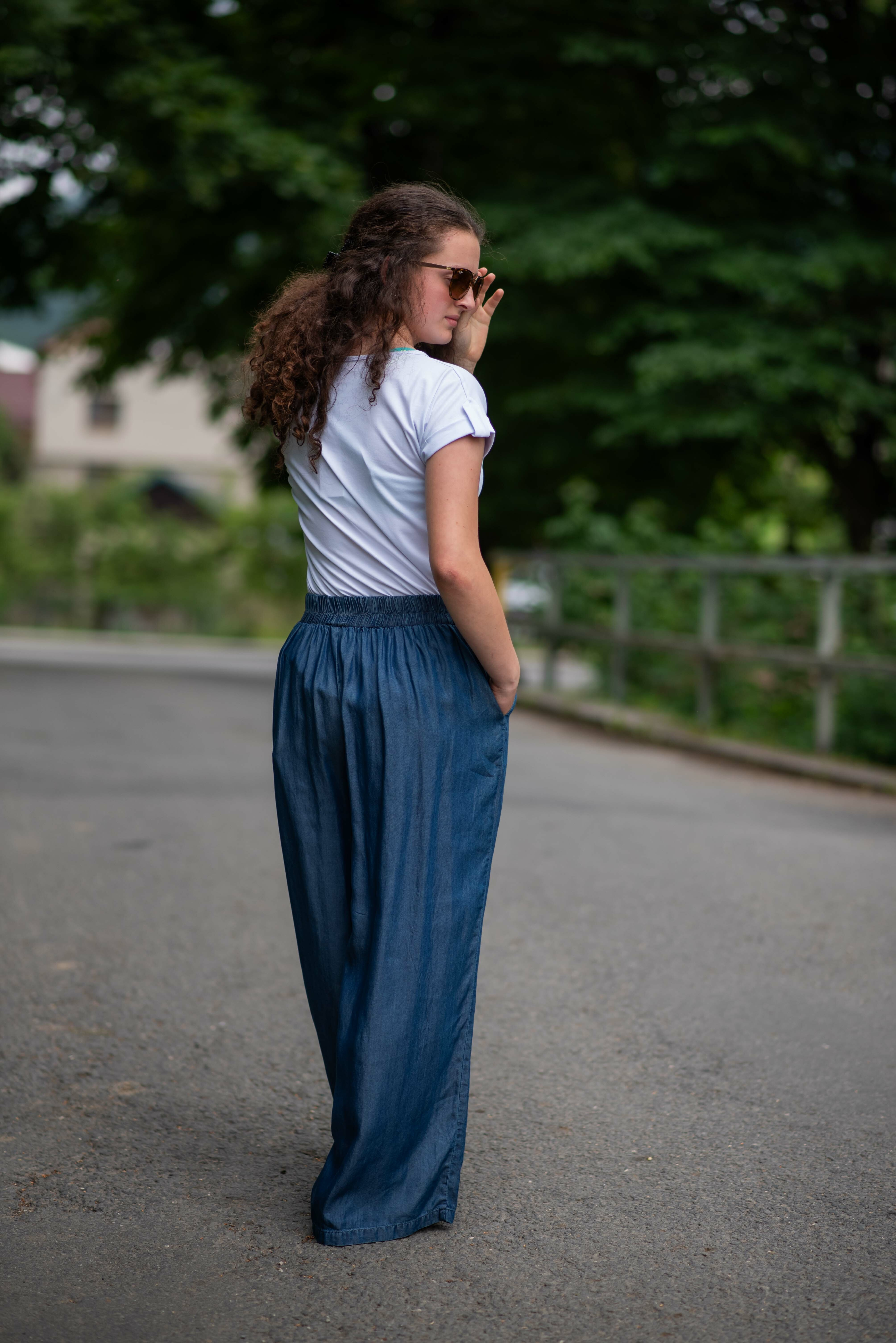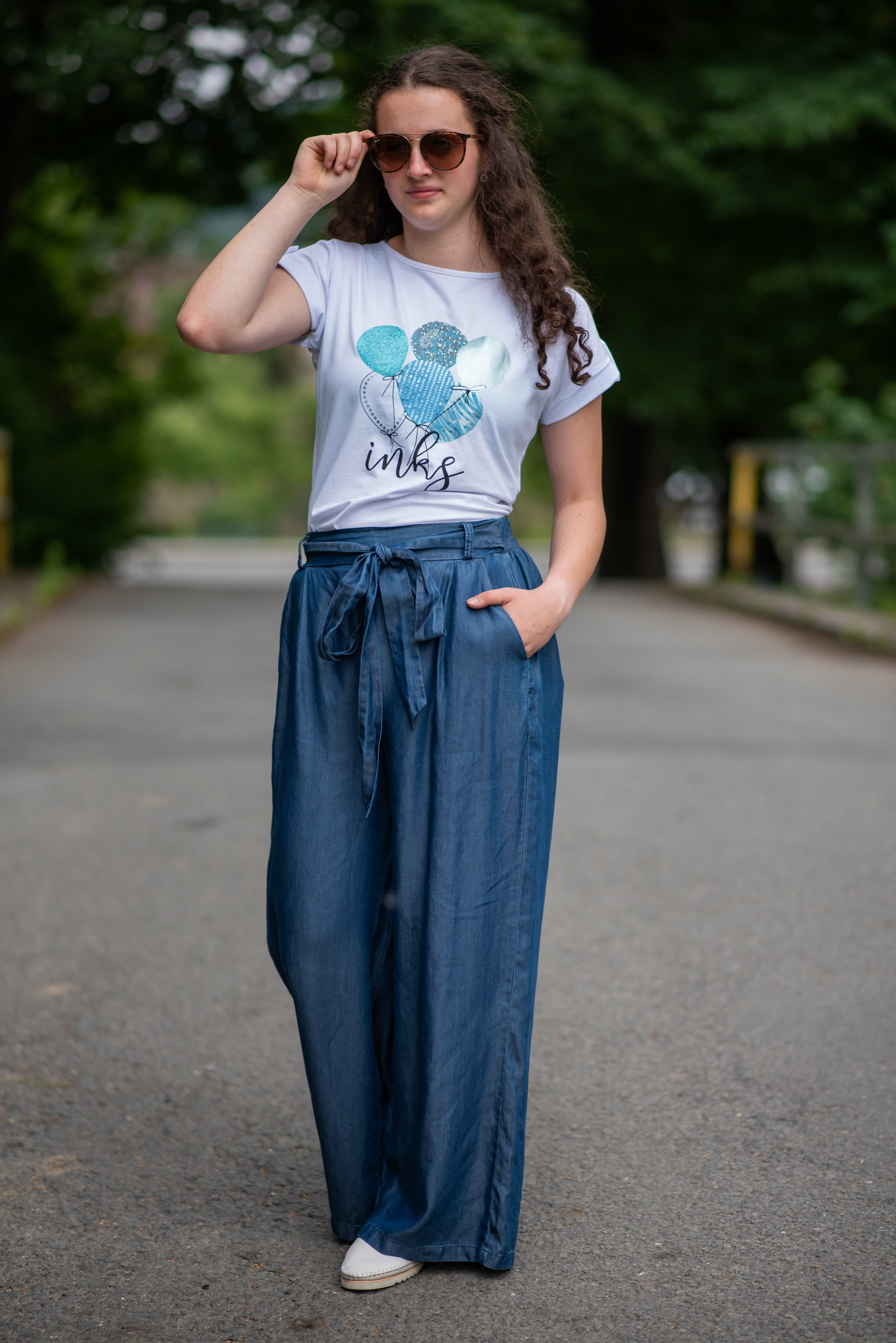 Stylové dámská široké kalhoty culottes pro denní nošení, v pase guma , postranní kapsy, 7/8 délka. Vyrobeny z odlehčené džínoviny.