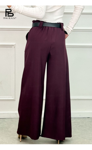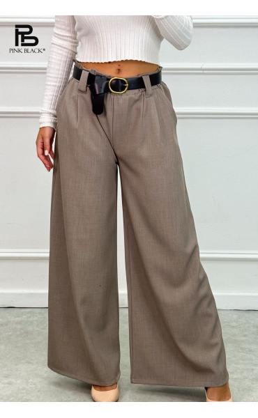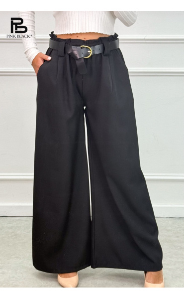 Kalhoty s širokými nohavicemi, v pase do gumy, doplněny páskem.