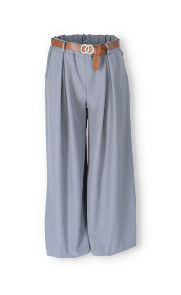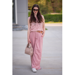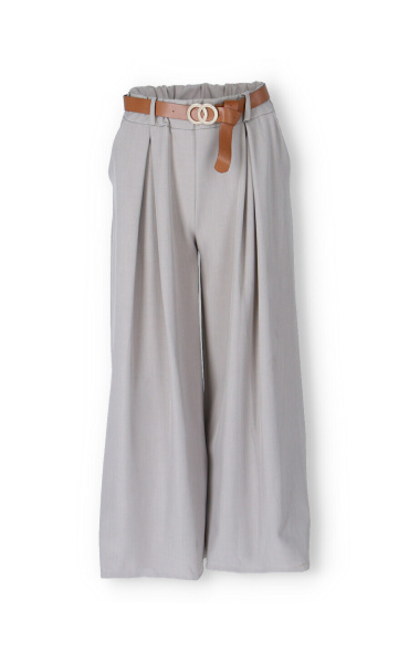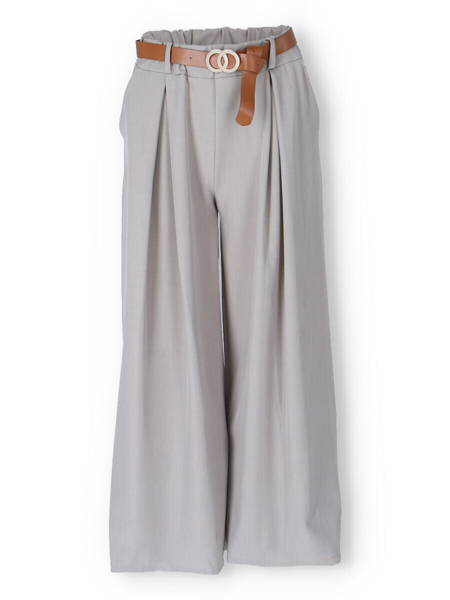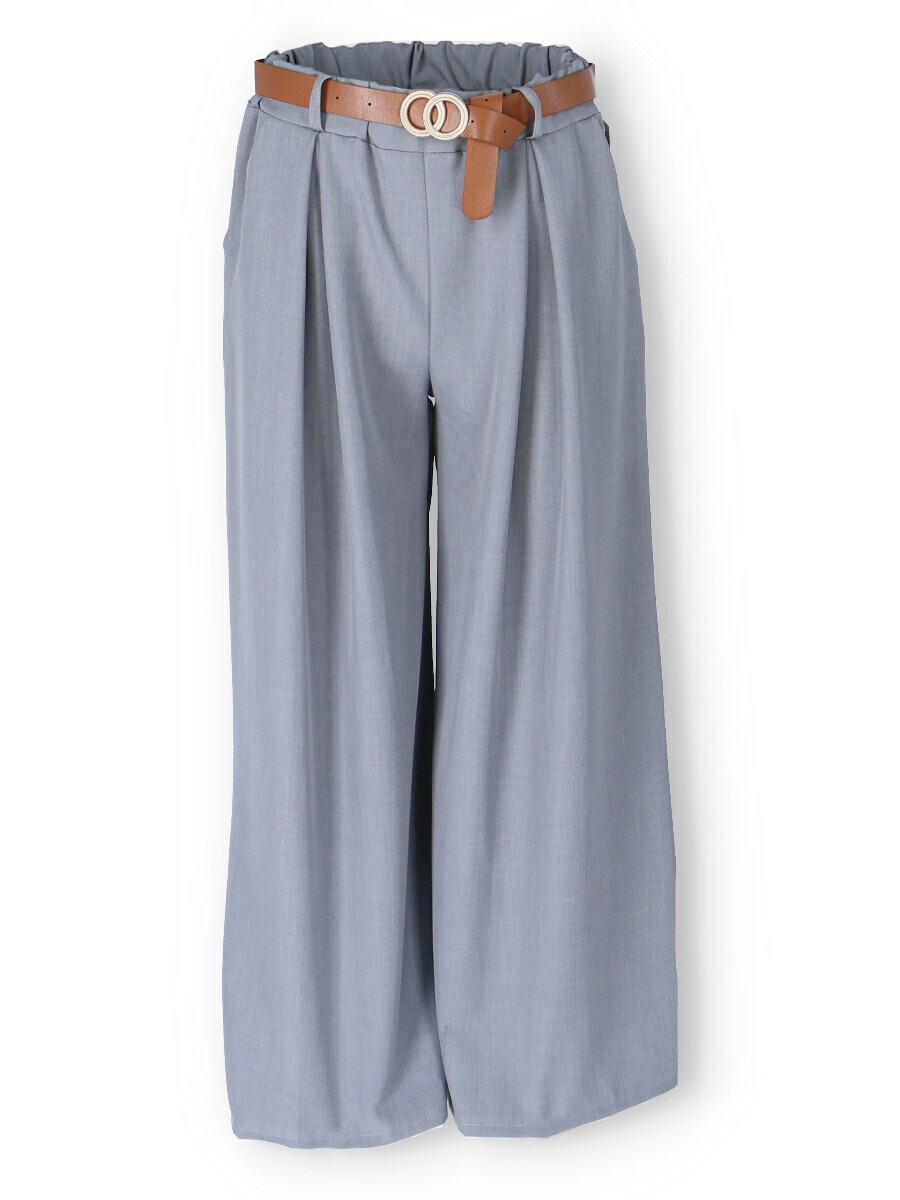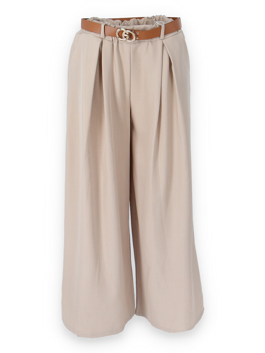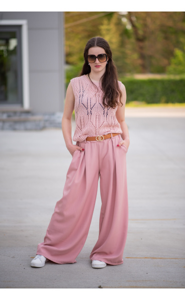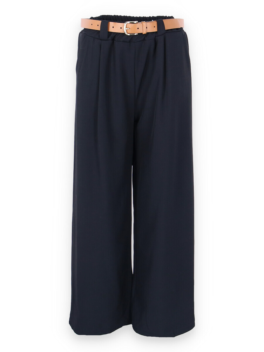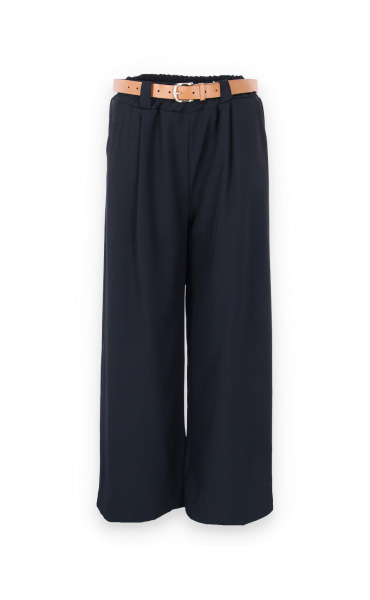 Dámské široké kalhoty do gumy. Kalhoty jsou wide-leg střihu, mají všité kapsy a jsou doplněny módním páskem.