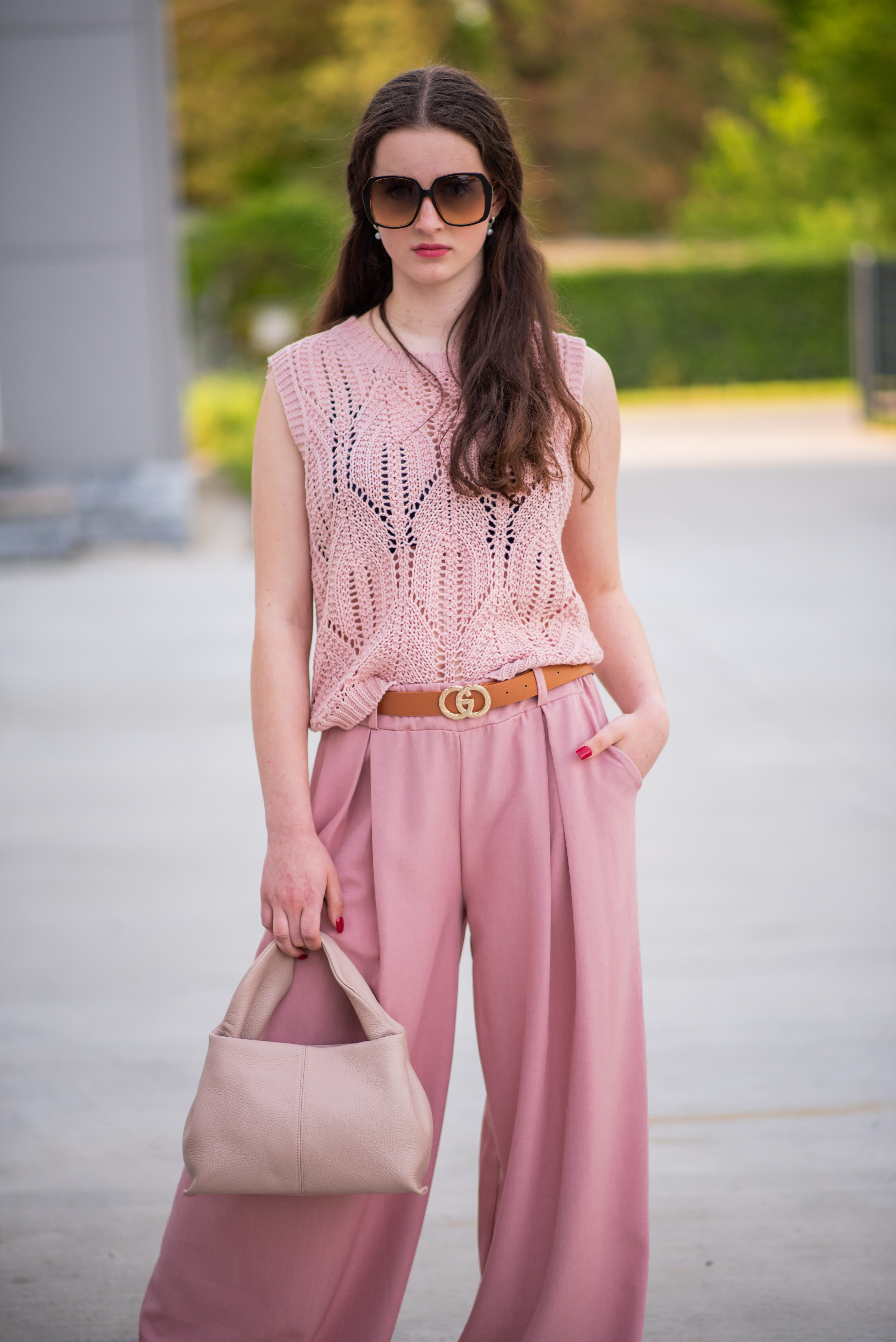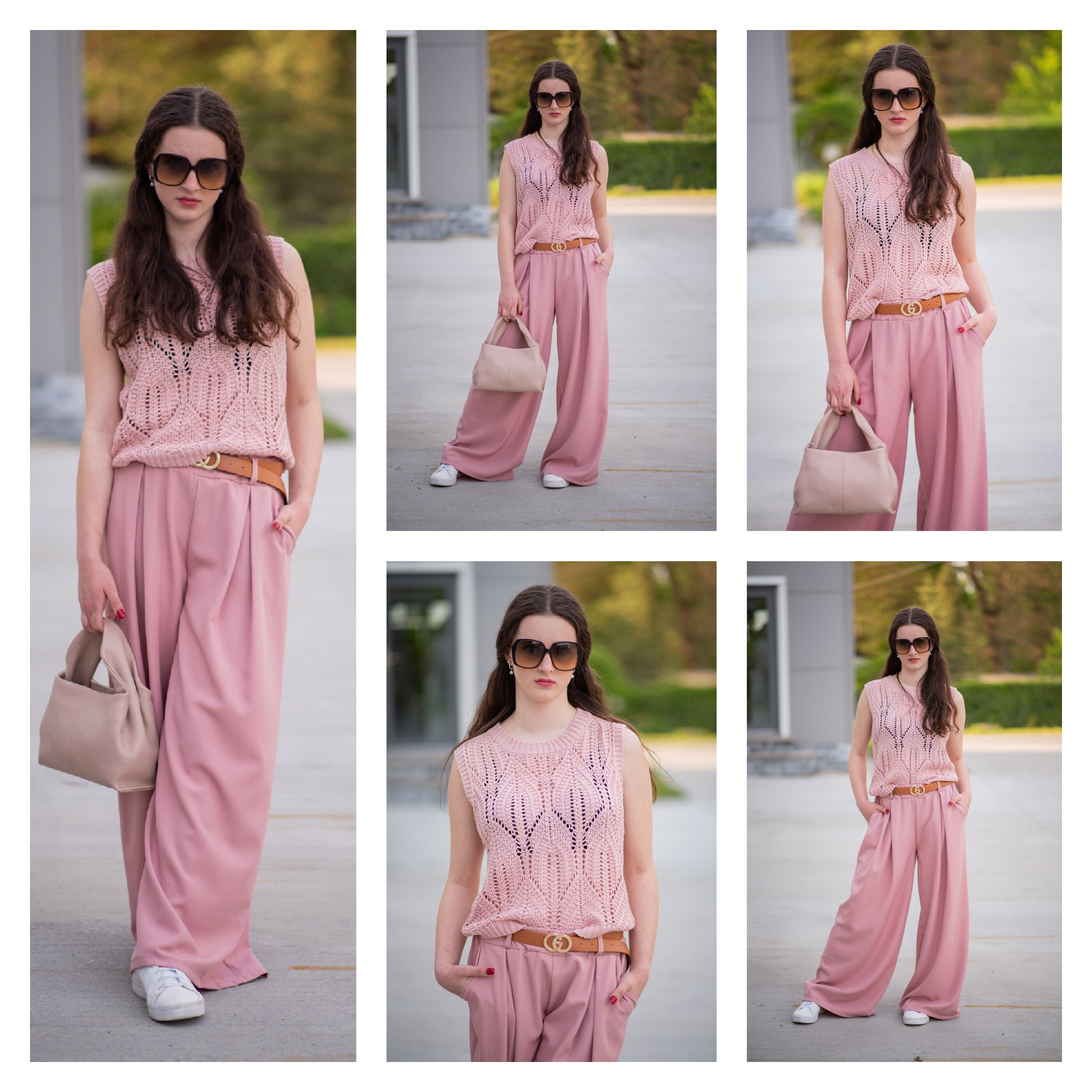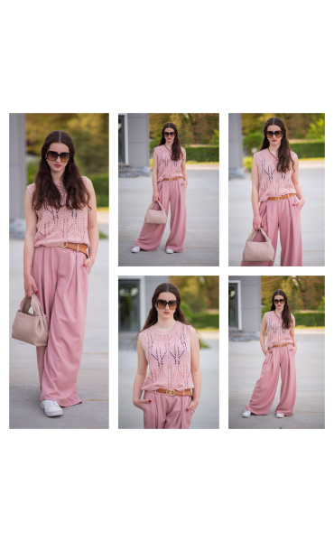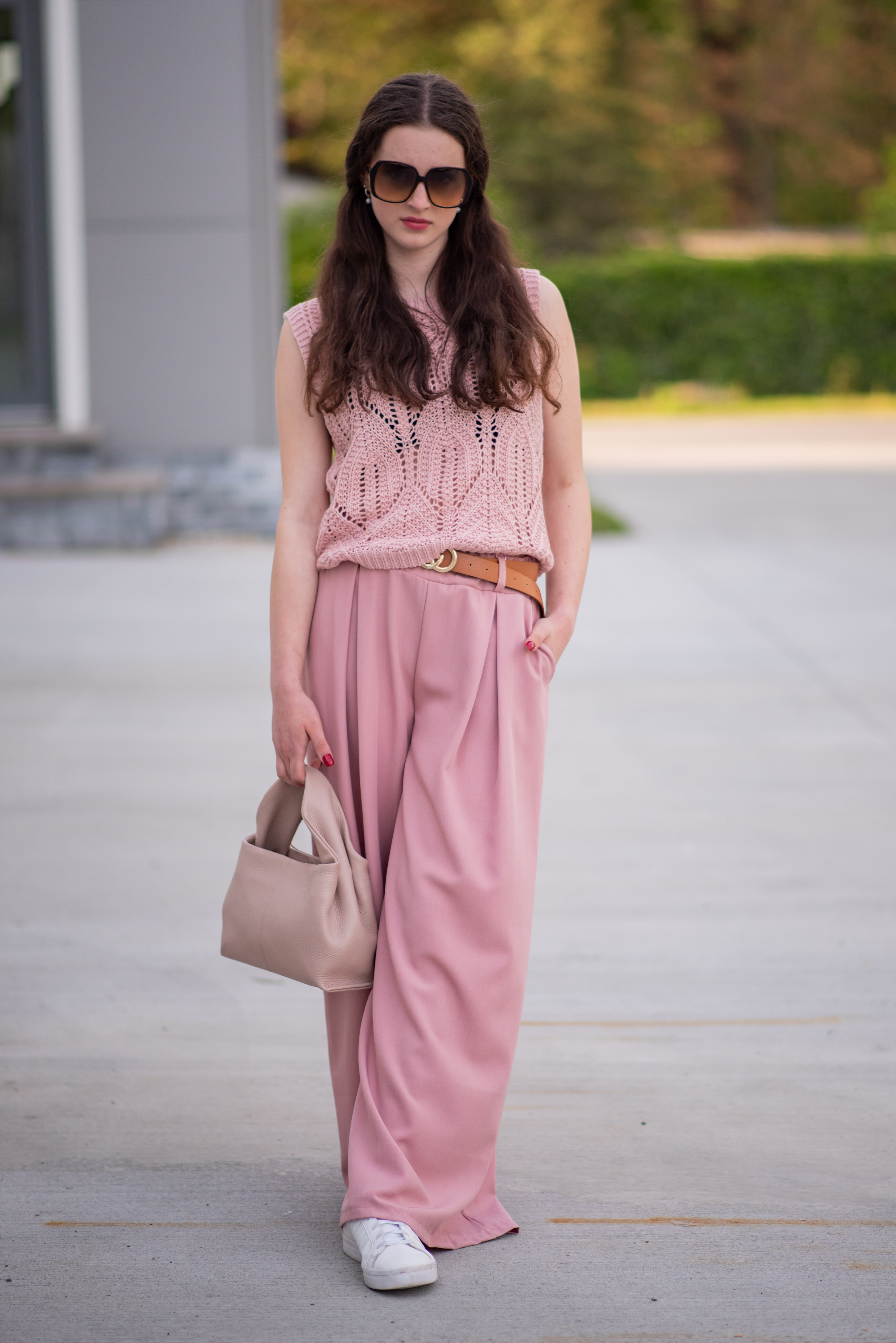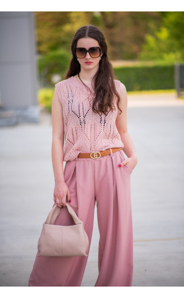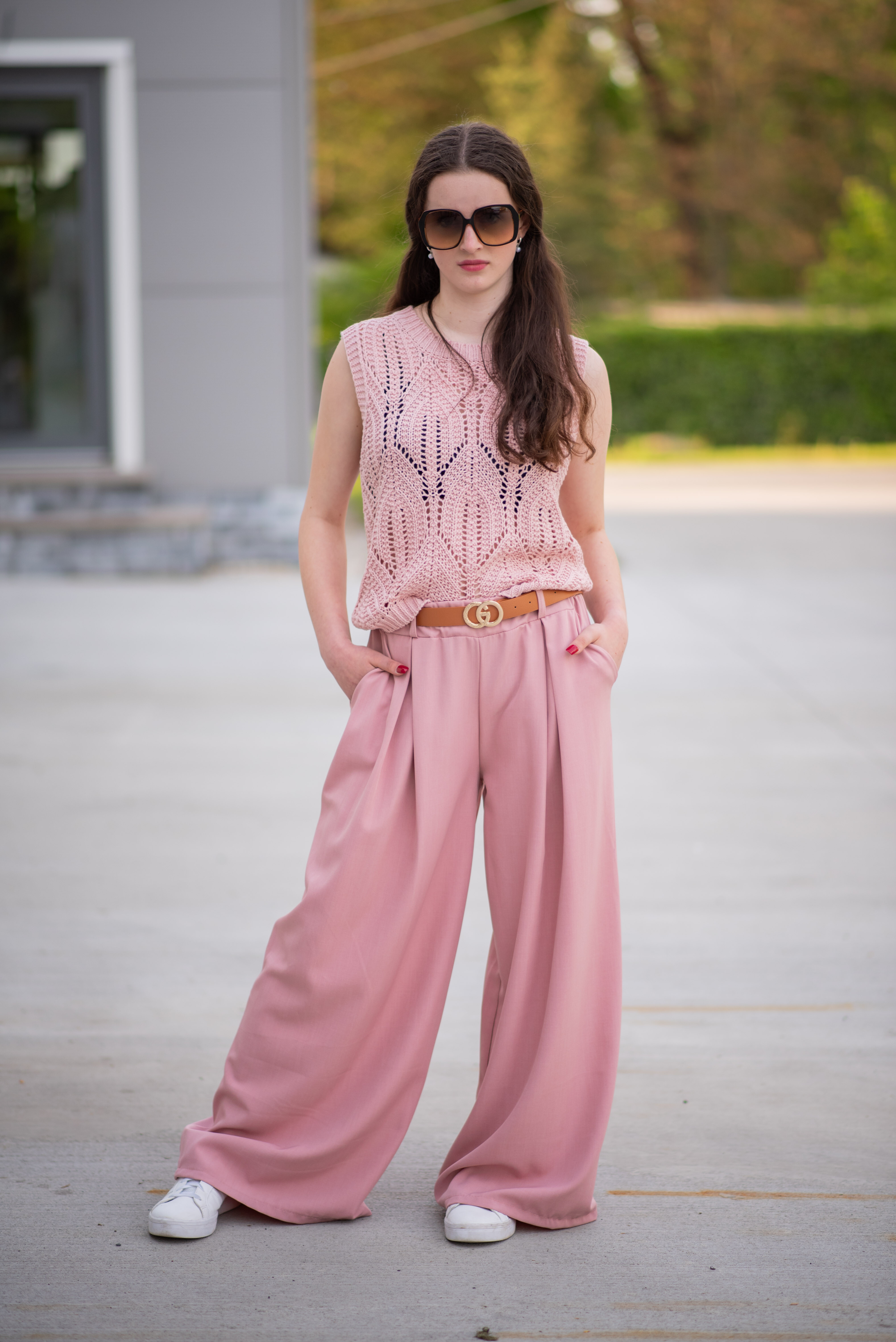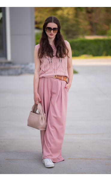 Dámské široké kalhoty do gumy. Kalhoty jsou wide-leg střihu, mají všité kapsy a jsou doplněny módním páskem.