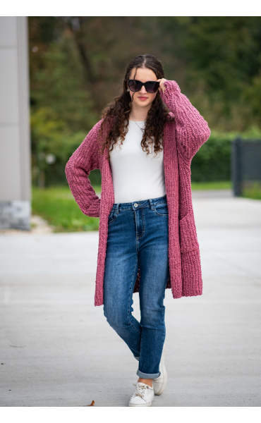 Kardigan je volnějšího střihu z velmi příjemného materiálu.
