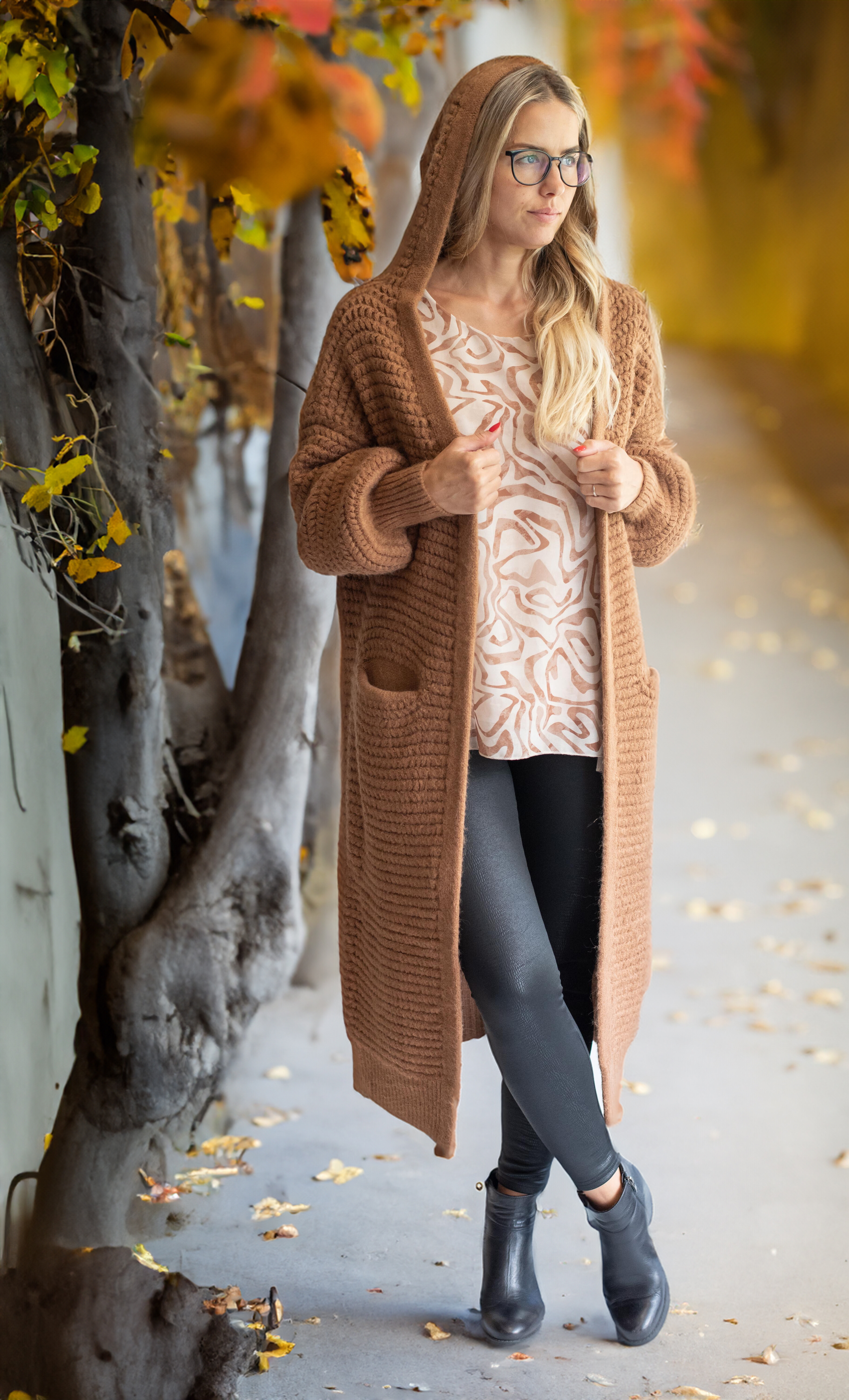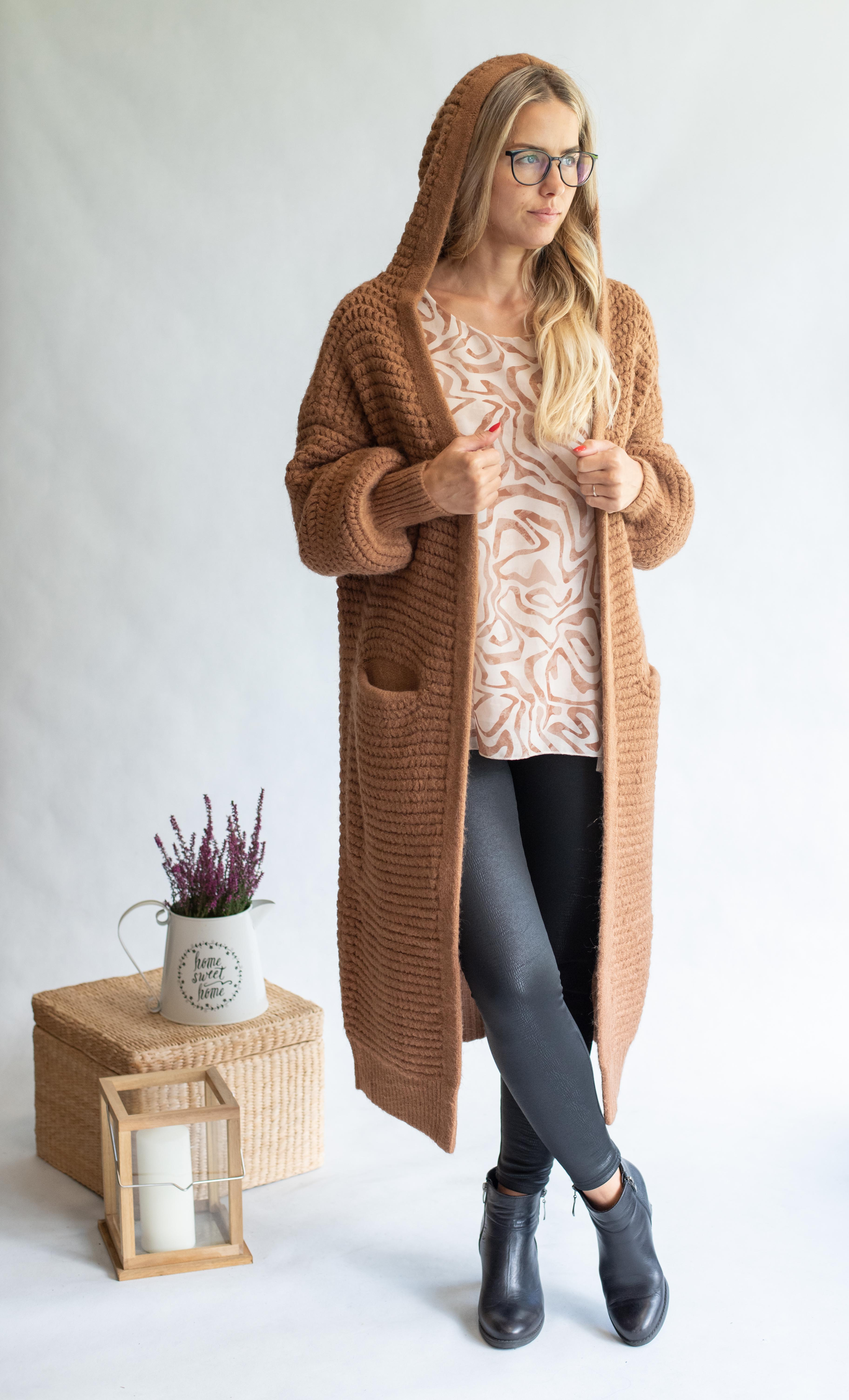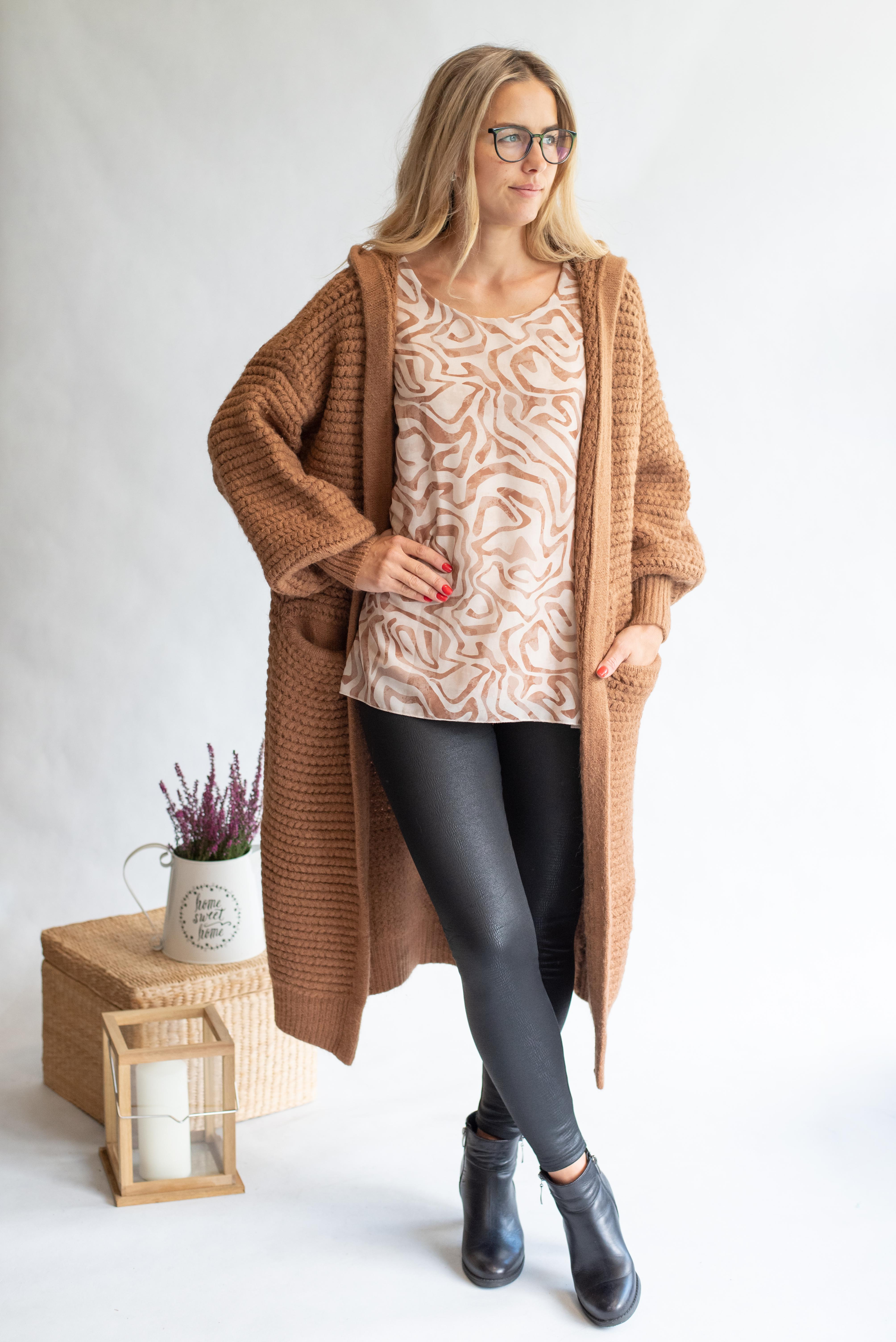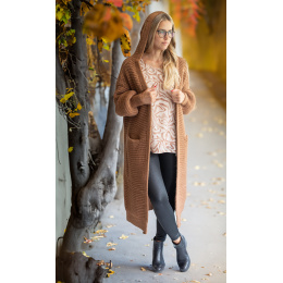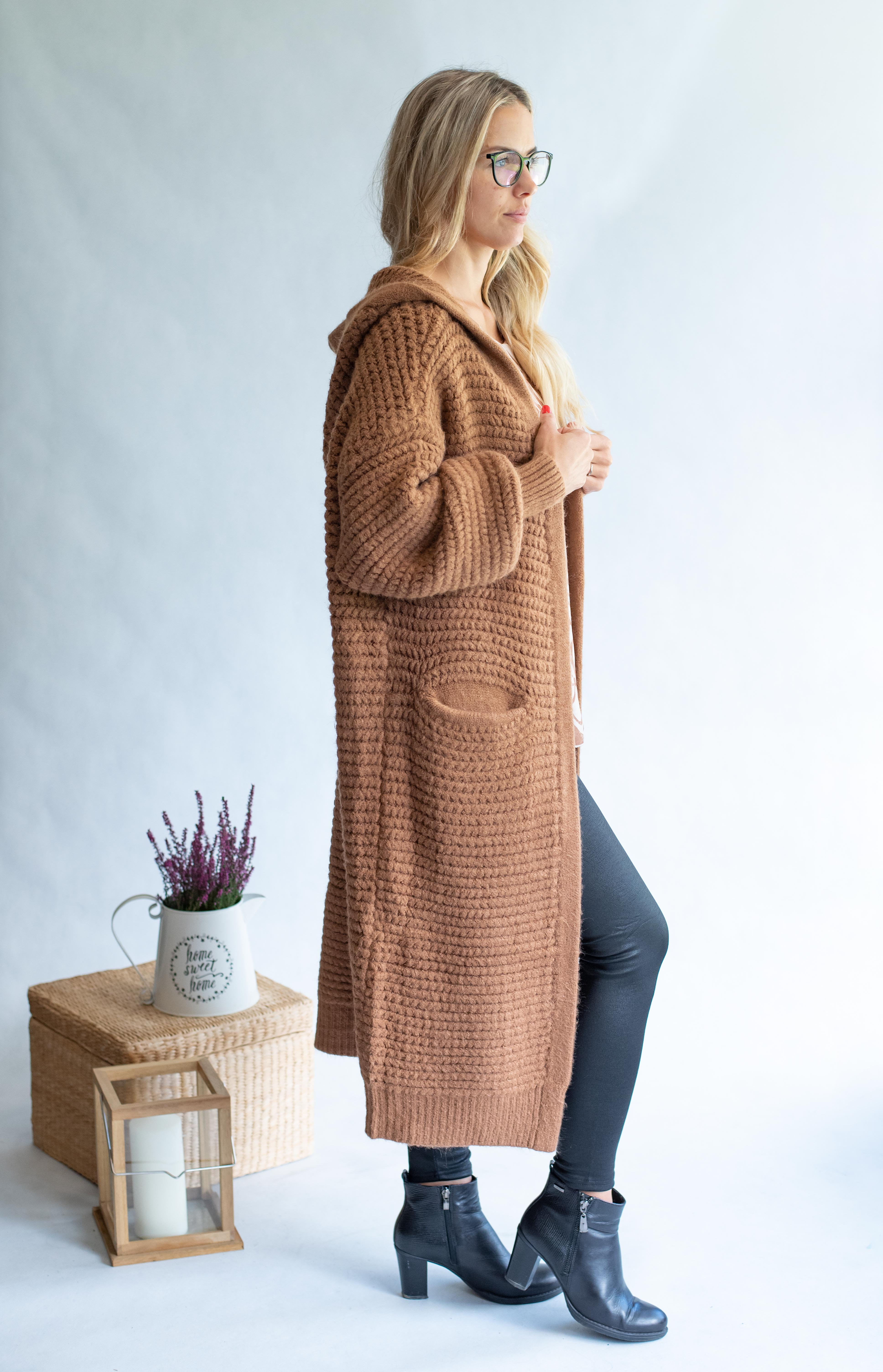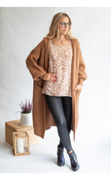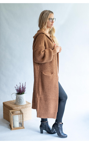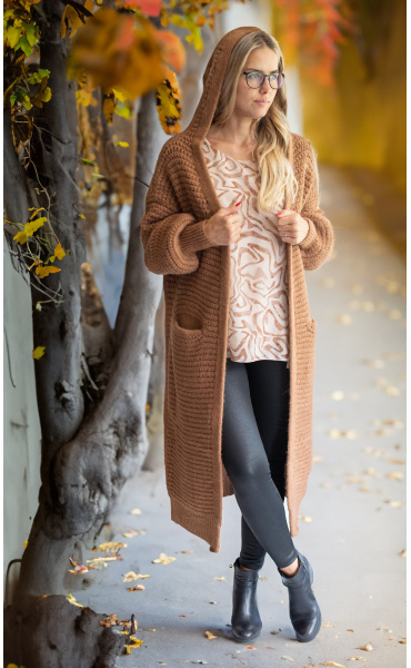 Kardigan dlouhý úpletový s kapucí USee 9587 Itálie barva: hnědá-camel