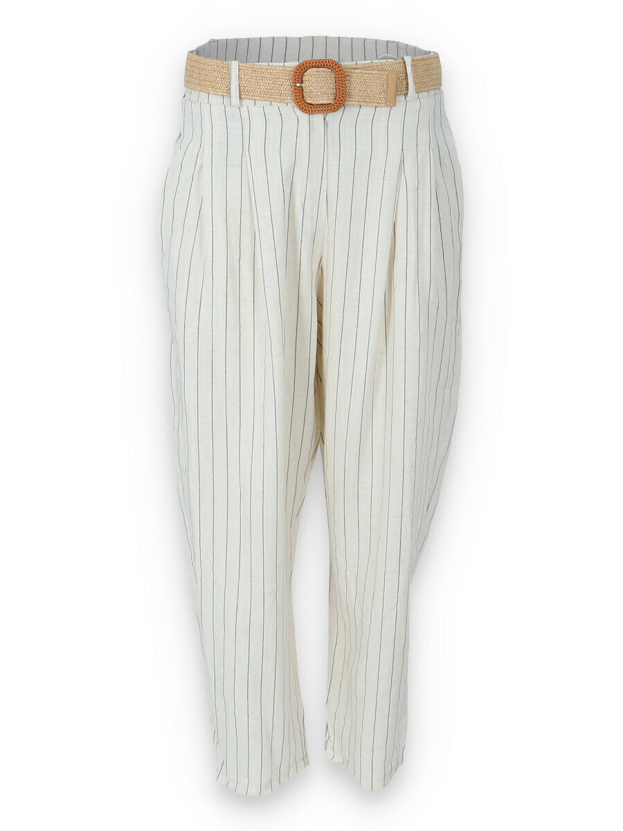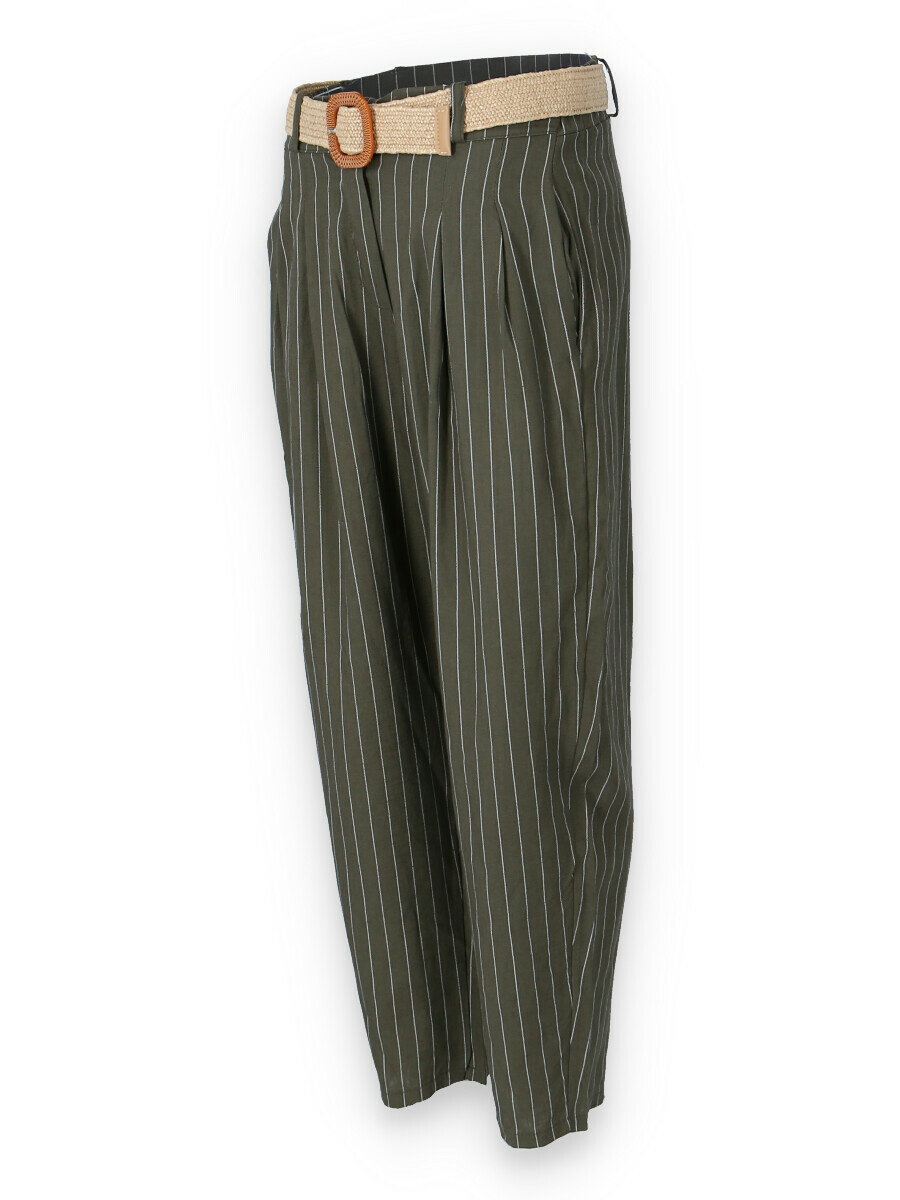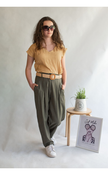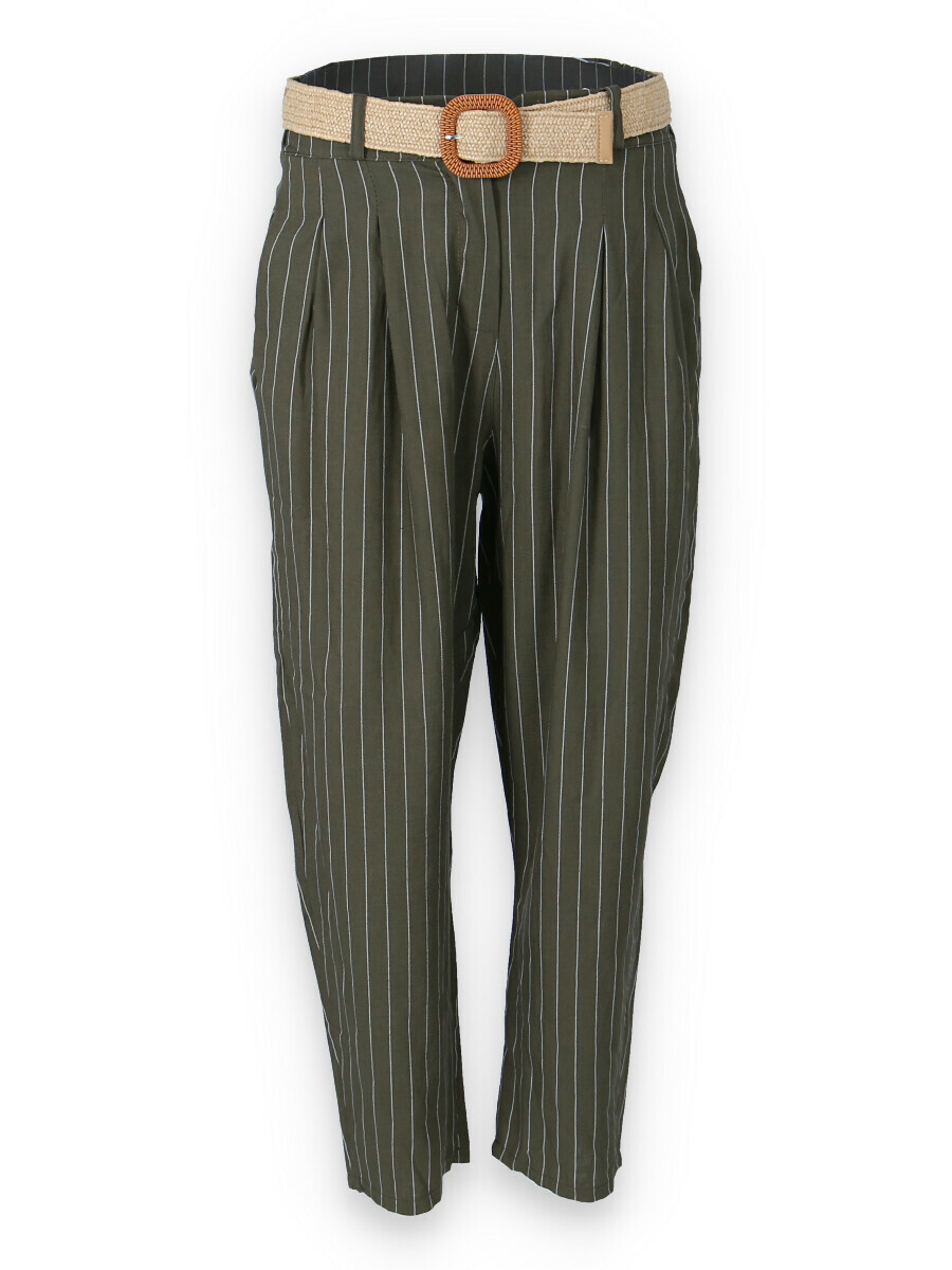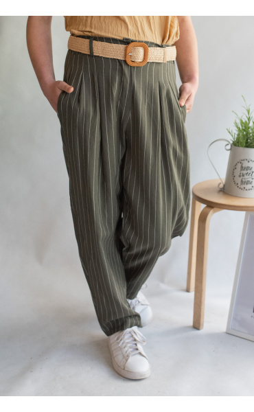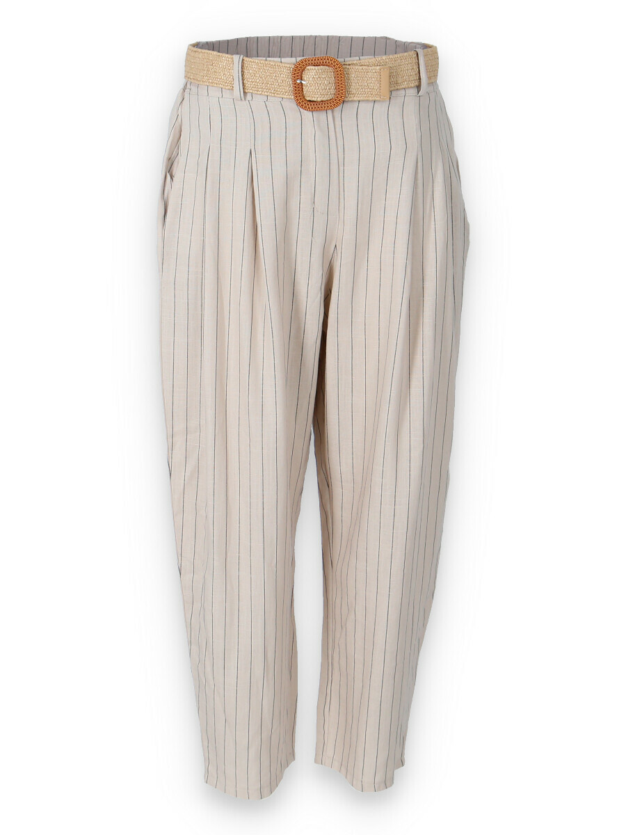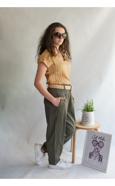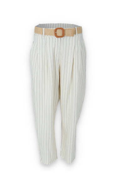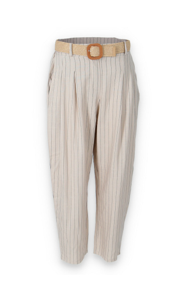 Lněné elegantní kalhoty s proužkem, kalhoty jsou doplněny páskem, mají zúžené nohavice.