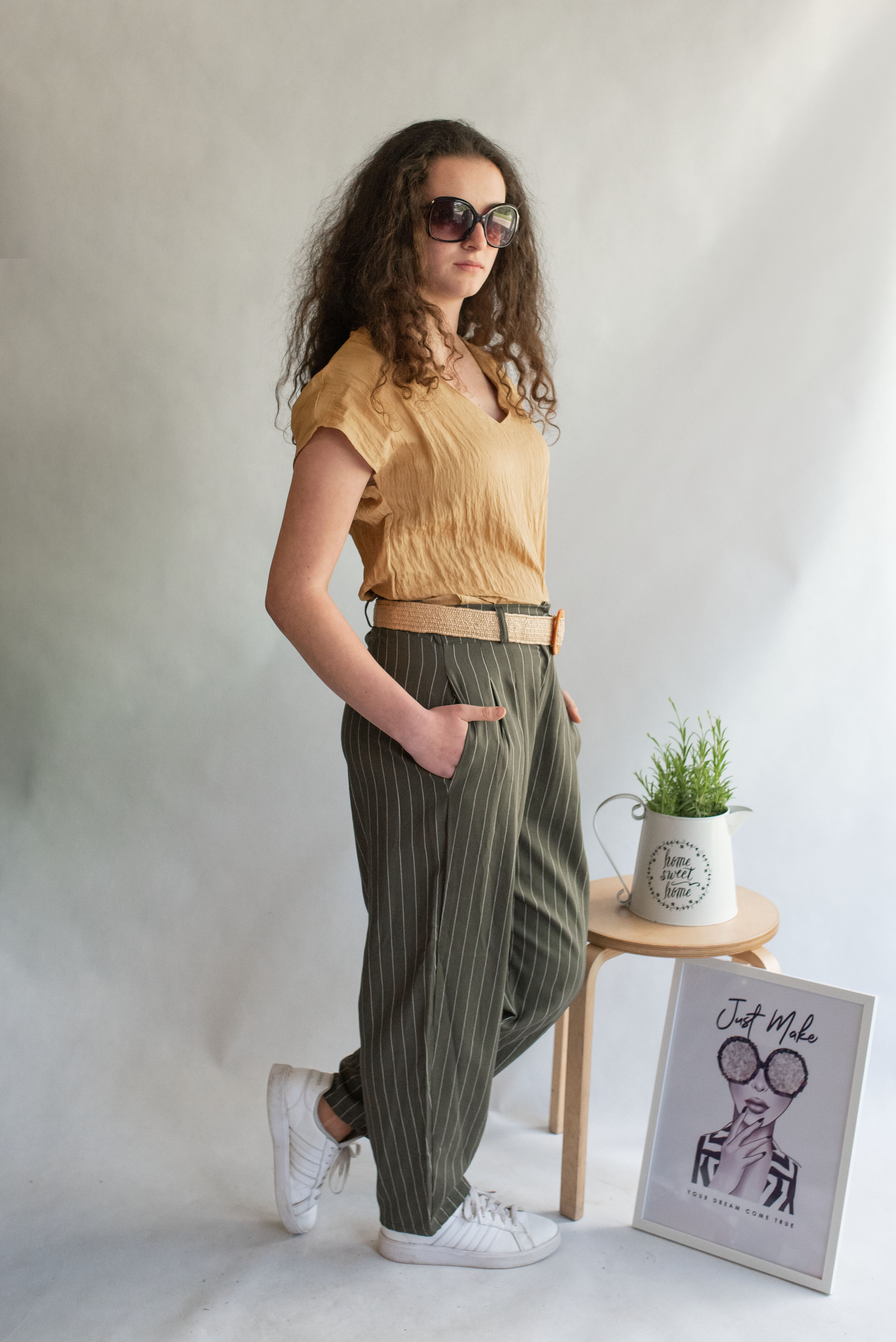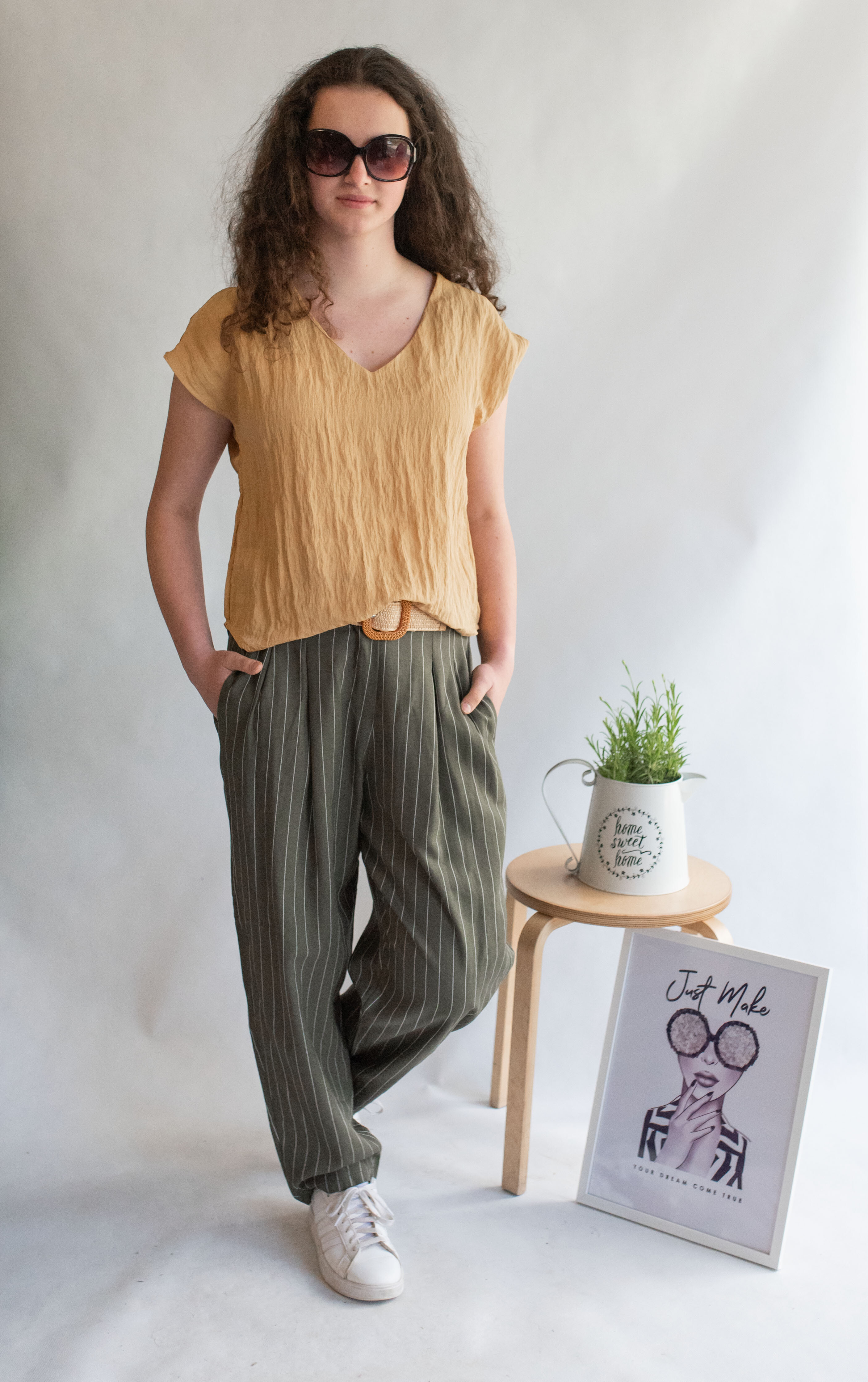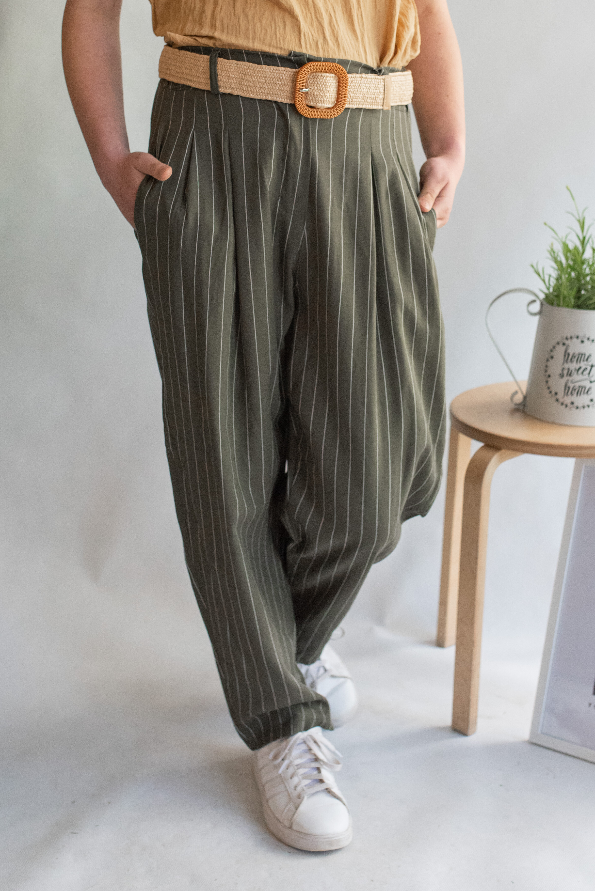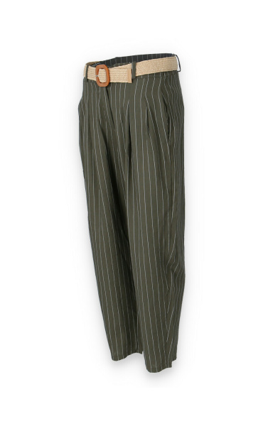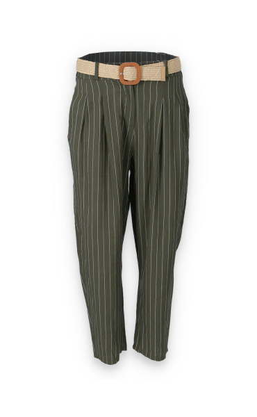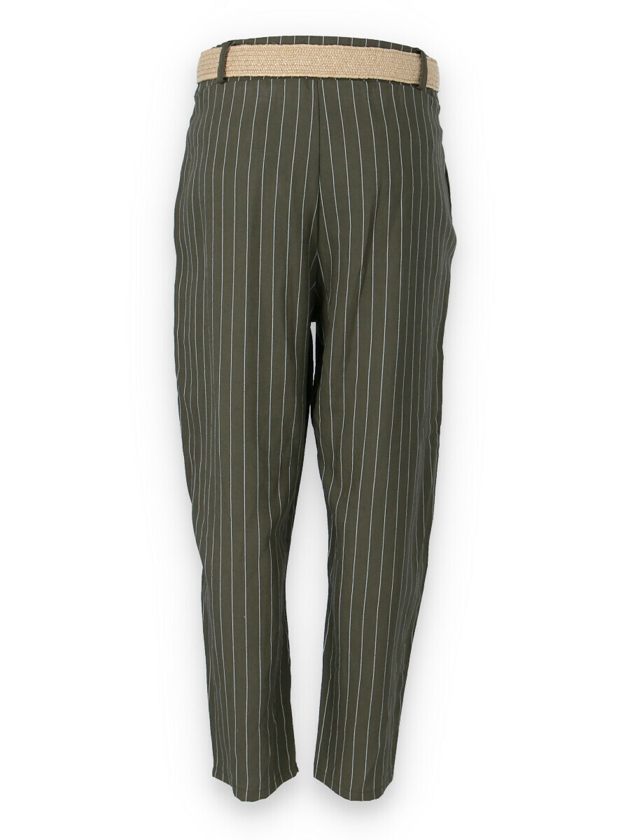 Lněné elegantní kalhoty s proužkem, kalhoty jsou doplněny páskem, mají zúžené nohavice.