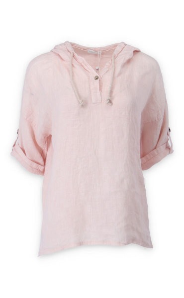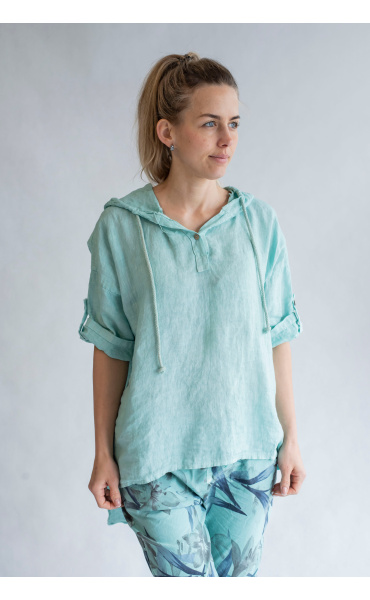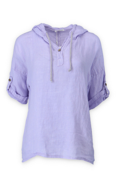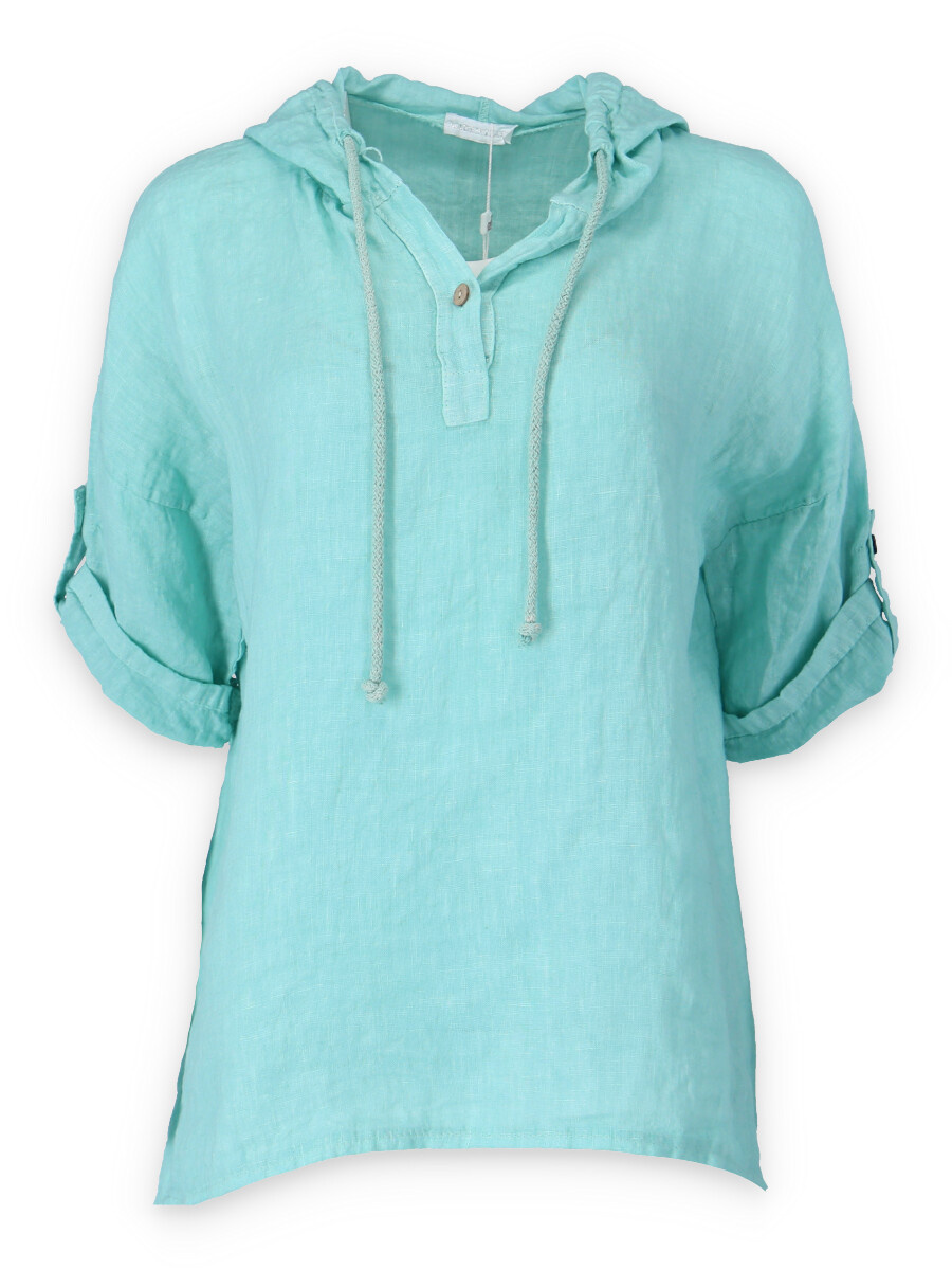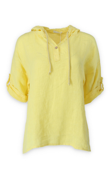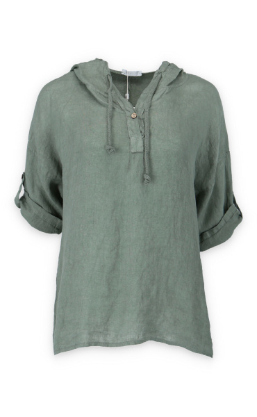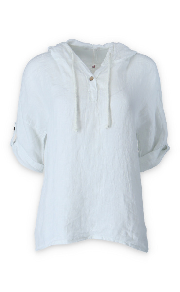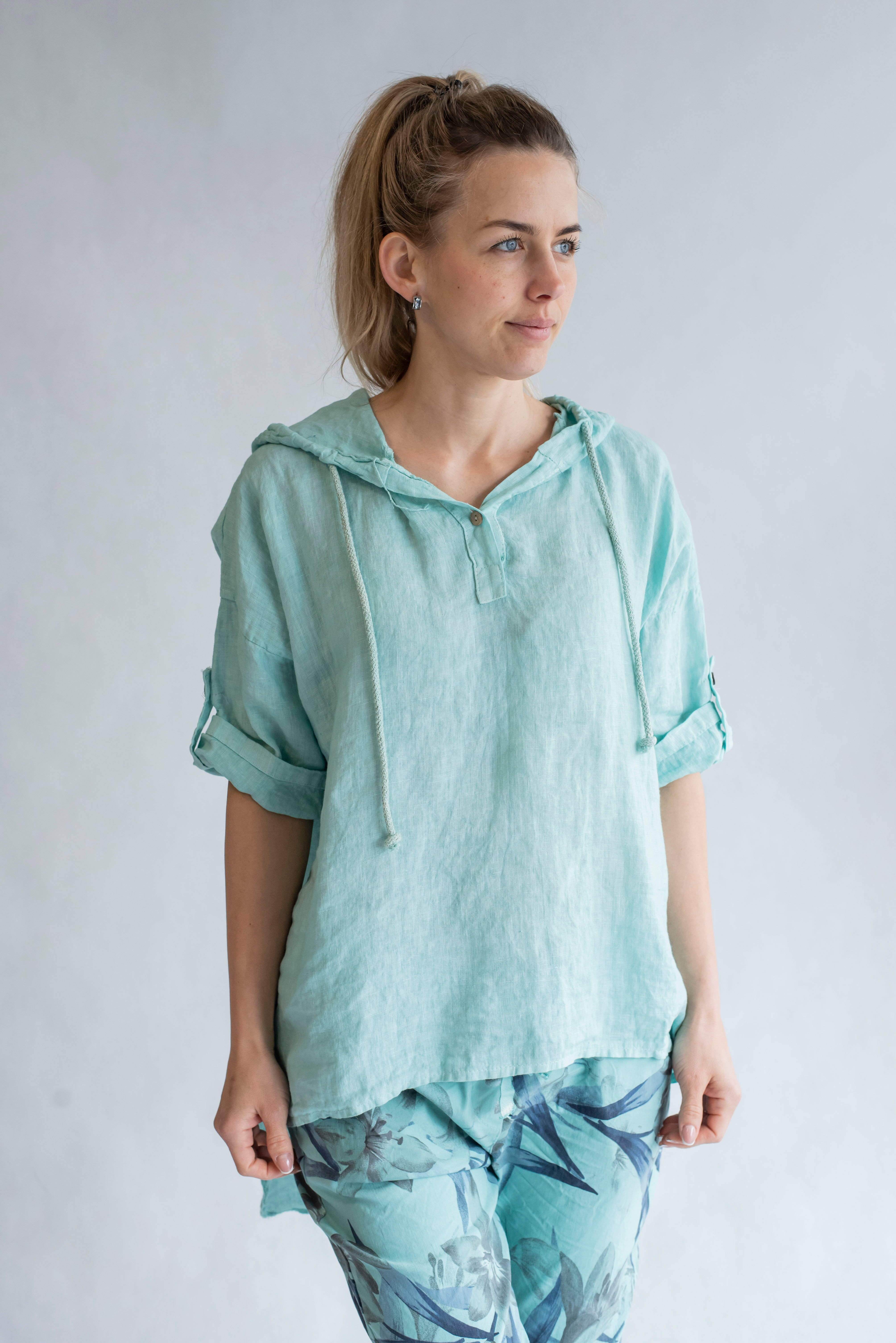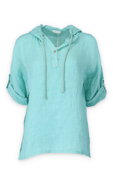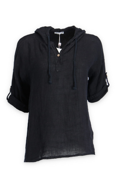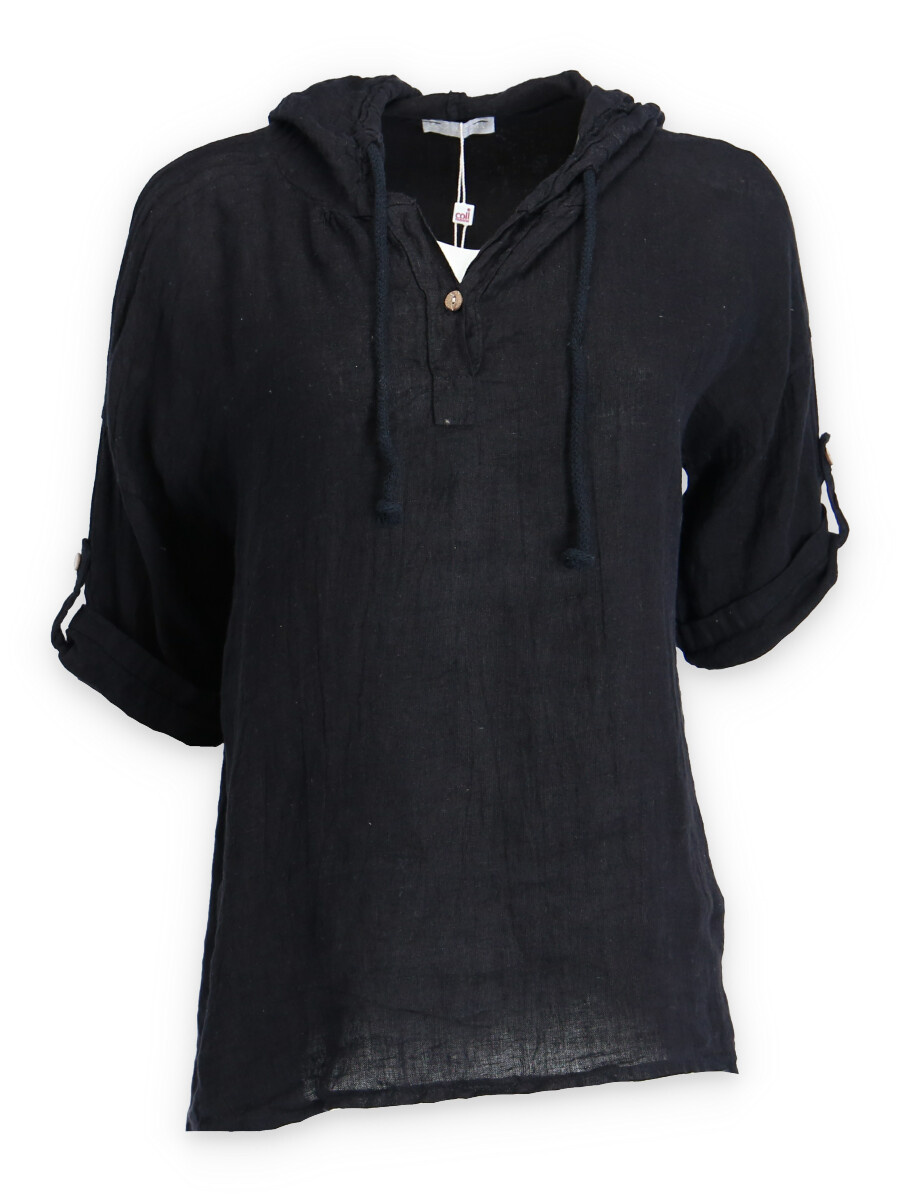 Módní košile s kapucí , krátký rukáv, na rameni knoflík , přední díl kratší, vyrobeno v Itálii