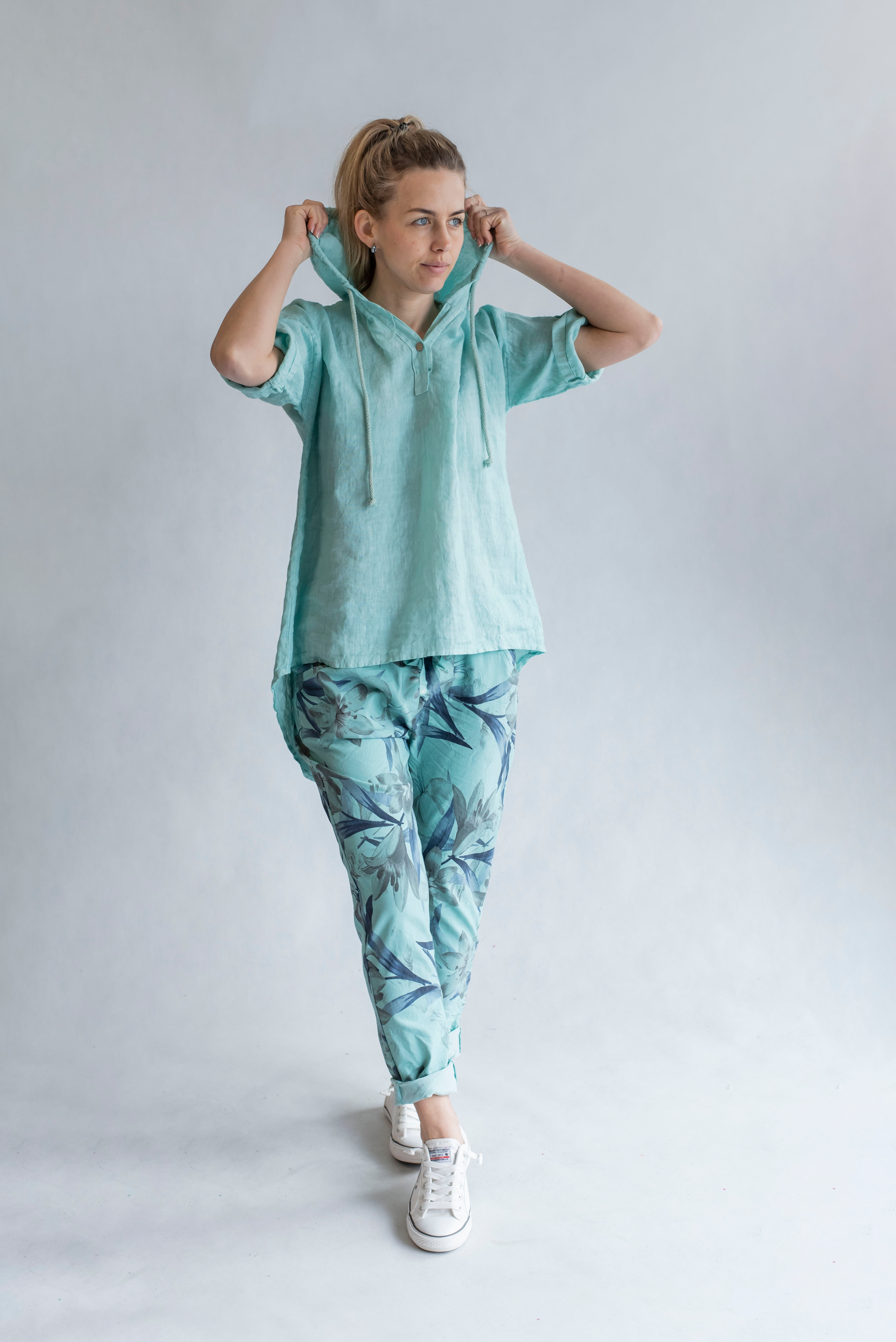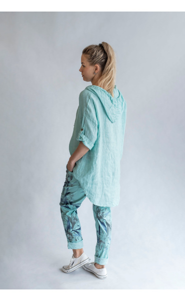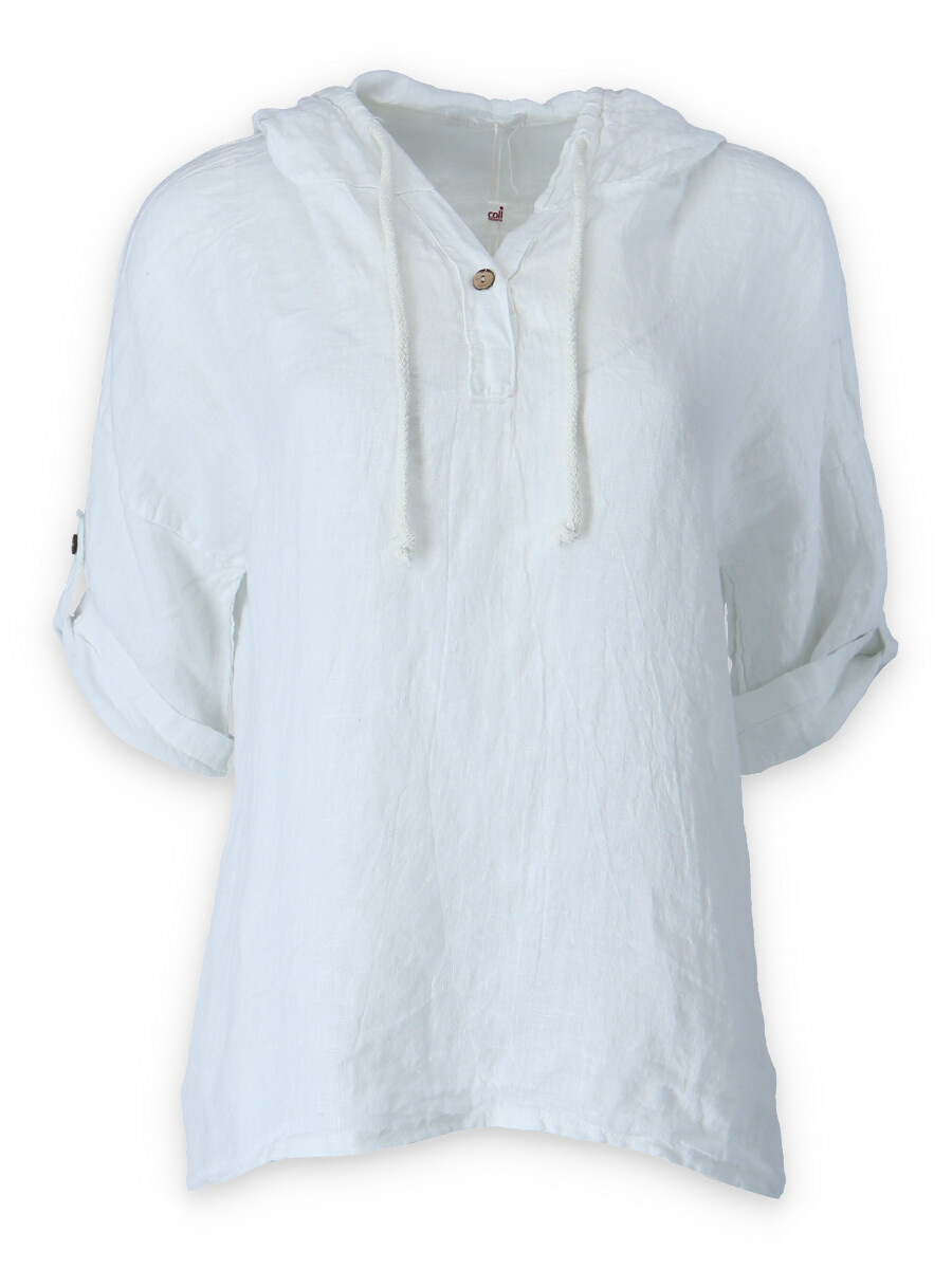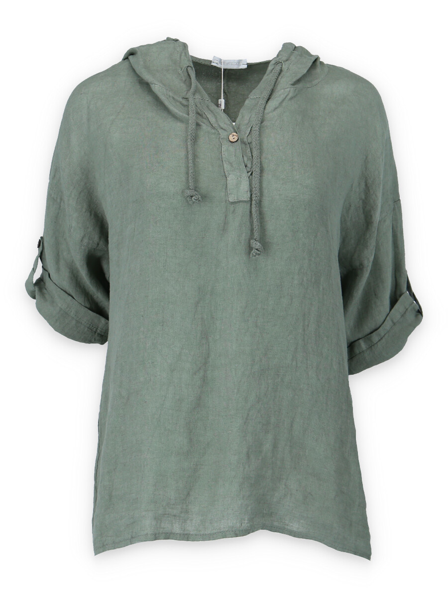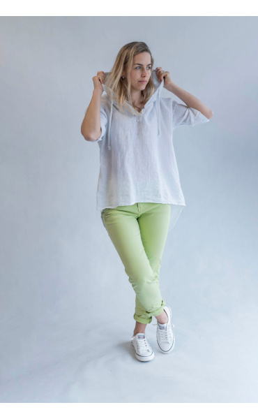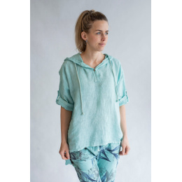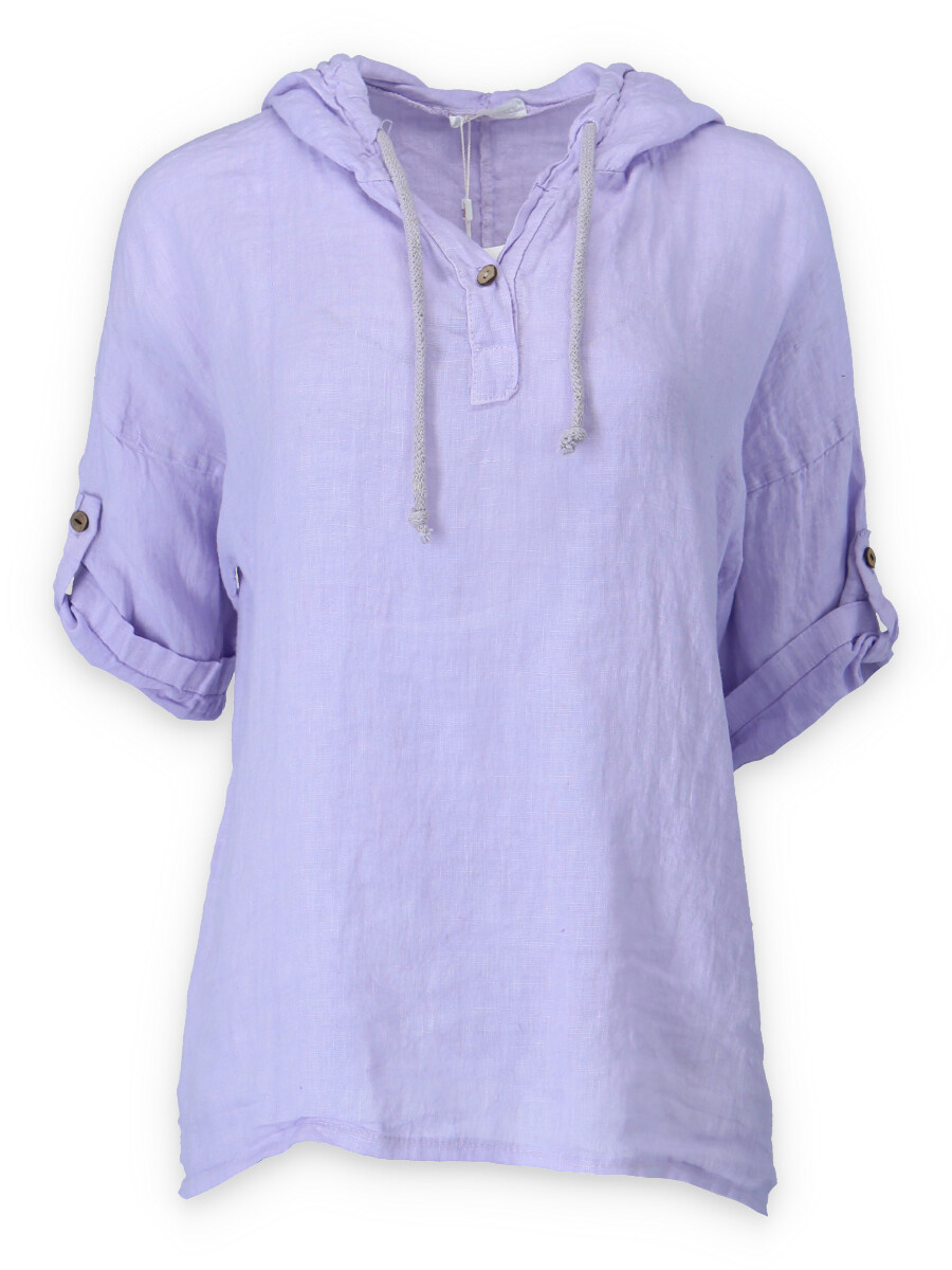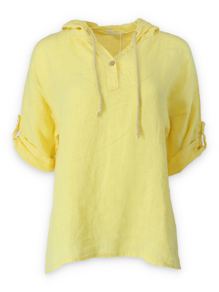 Módní košile s kapucí , krátký rukáv, na rameni knoflík , přední díl kratší, vyrobeno v Itálii