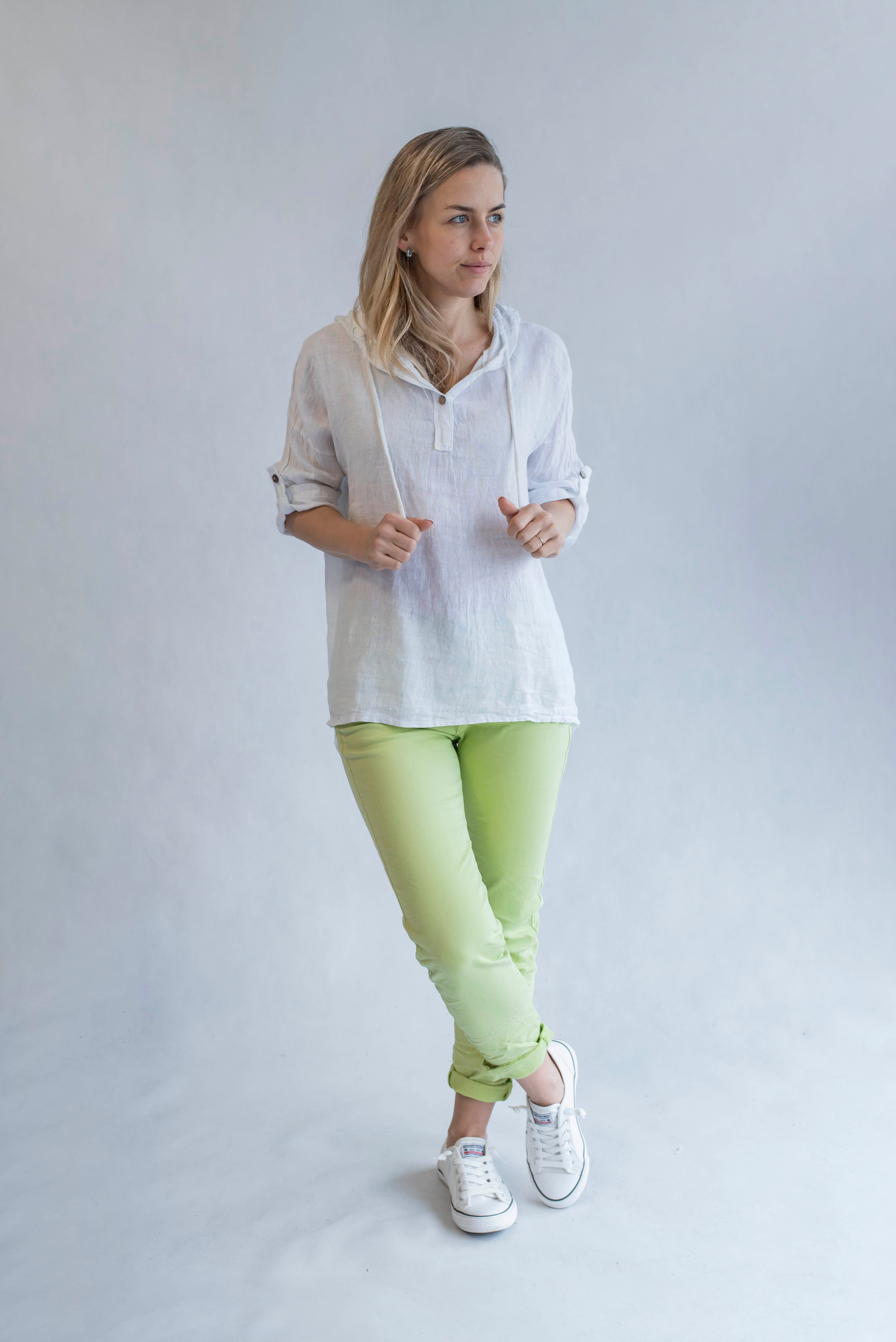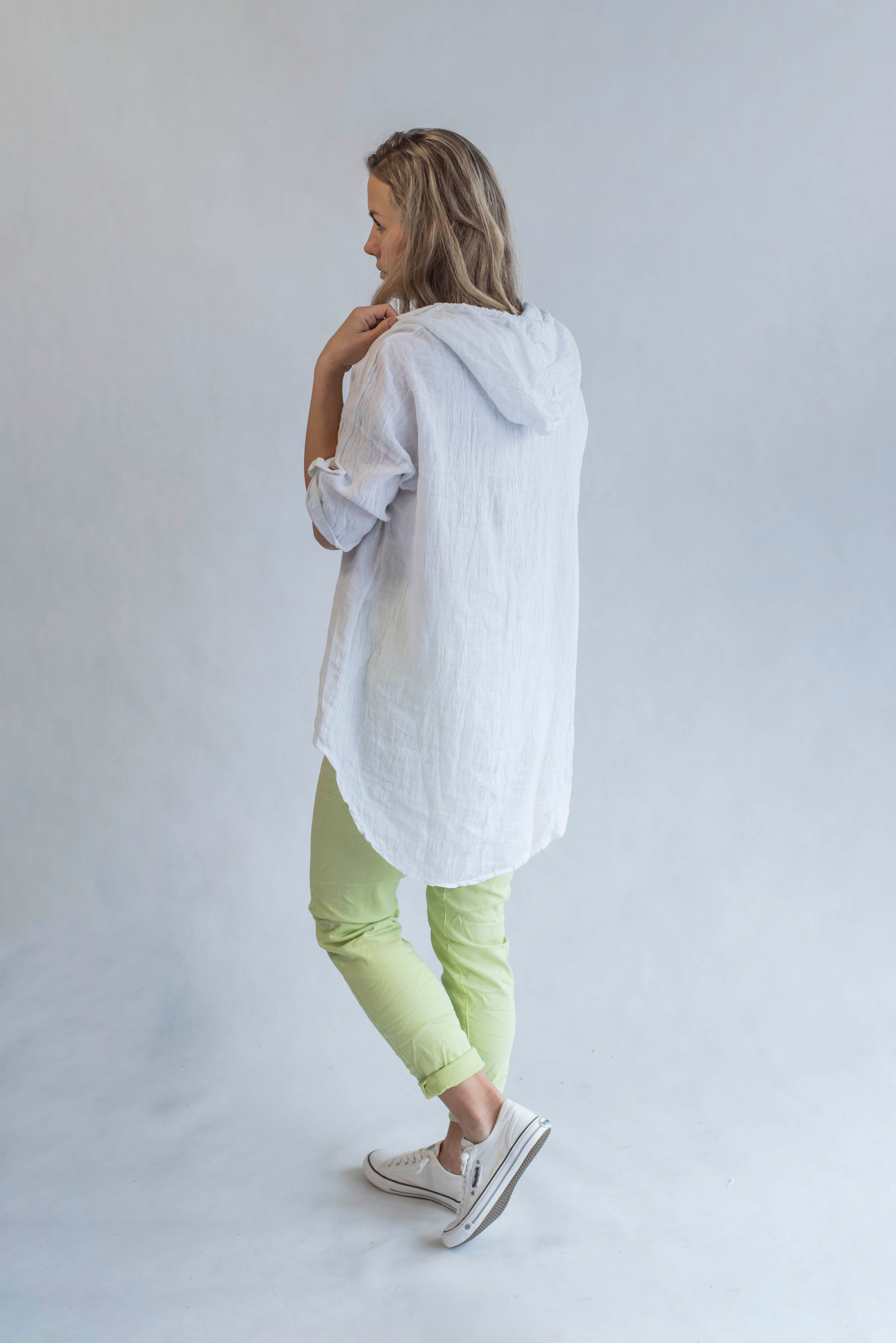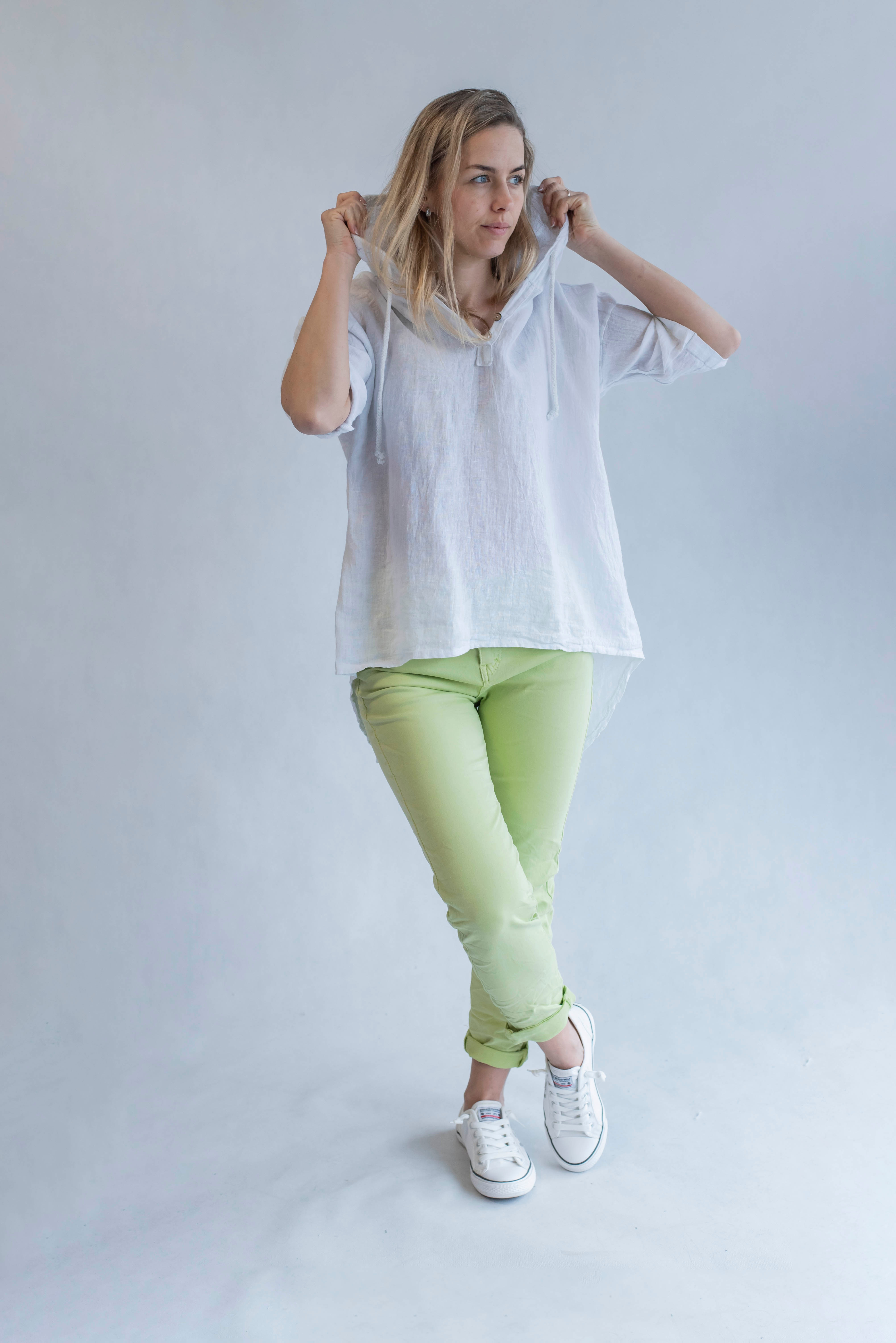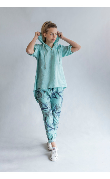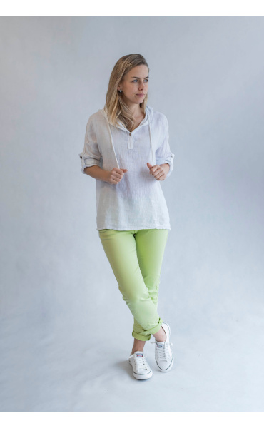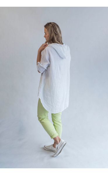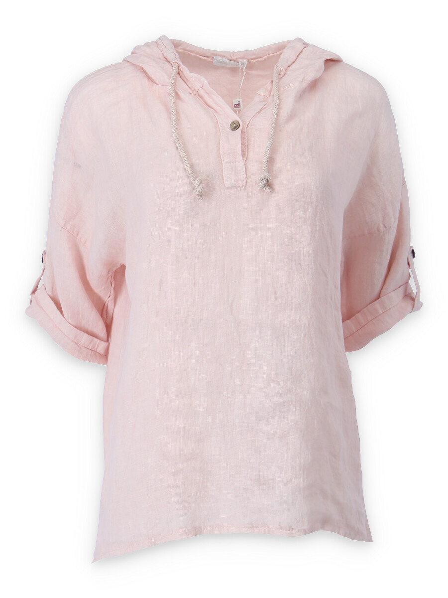 Módní košile s kapucí , krátký rukáv, na rameni knoflík , přední díl kratší, vyrobeno v Itálii