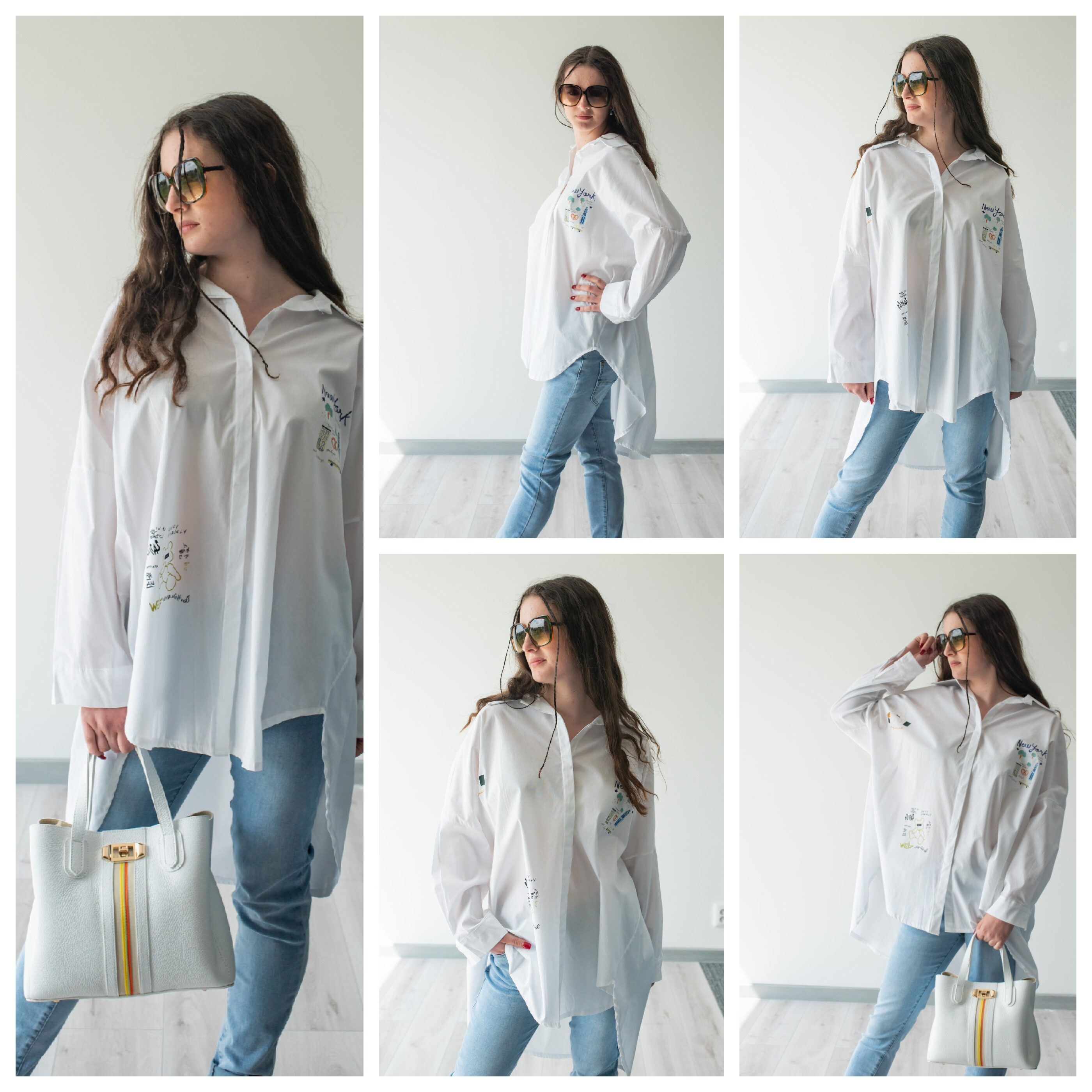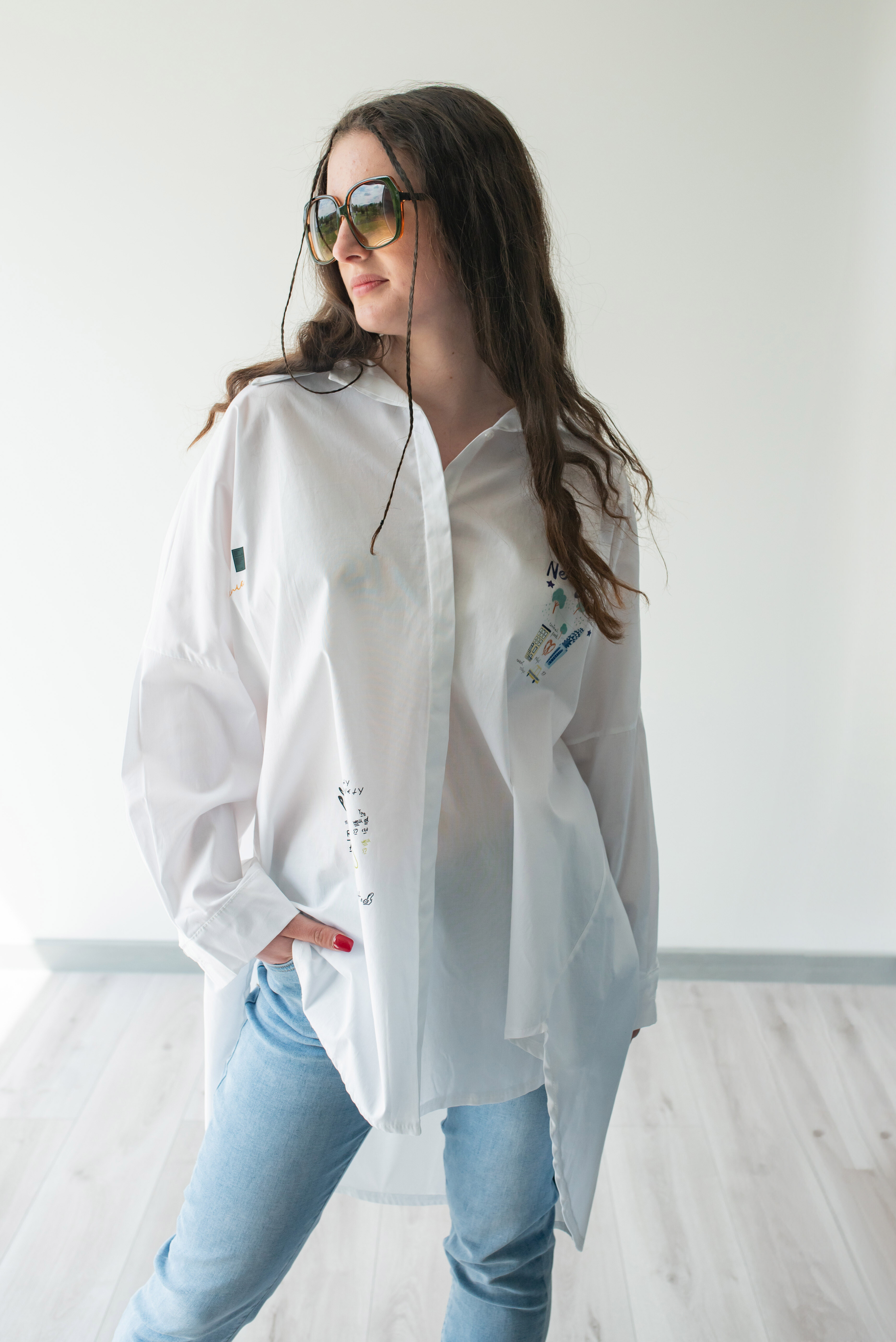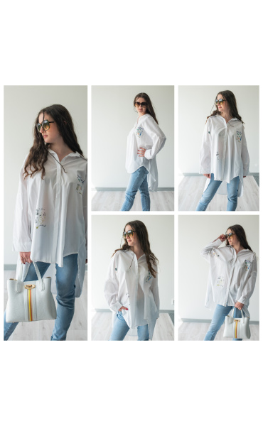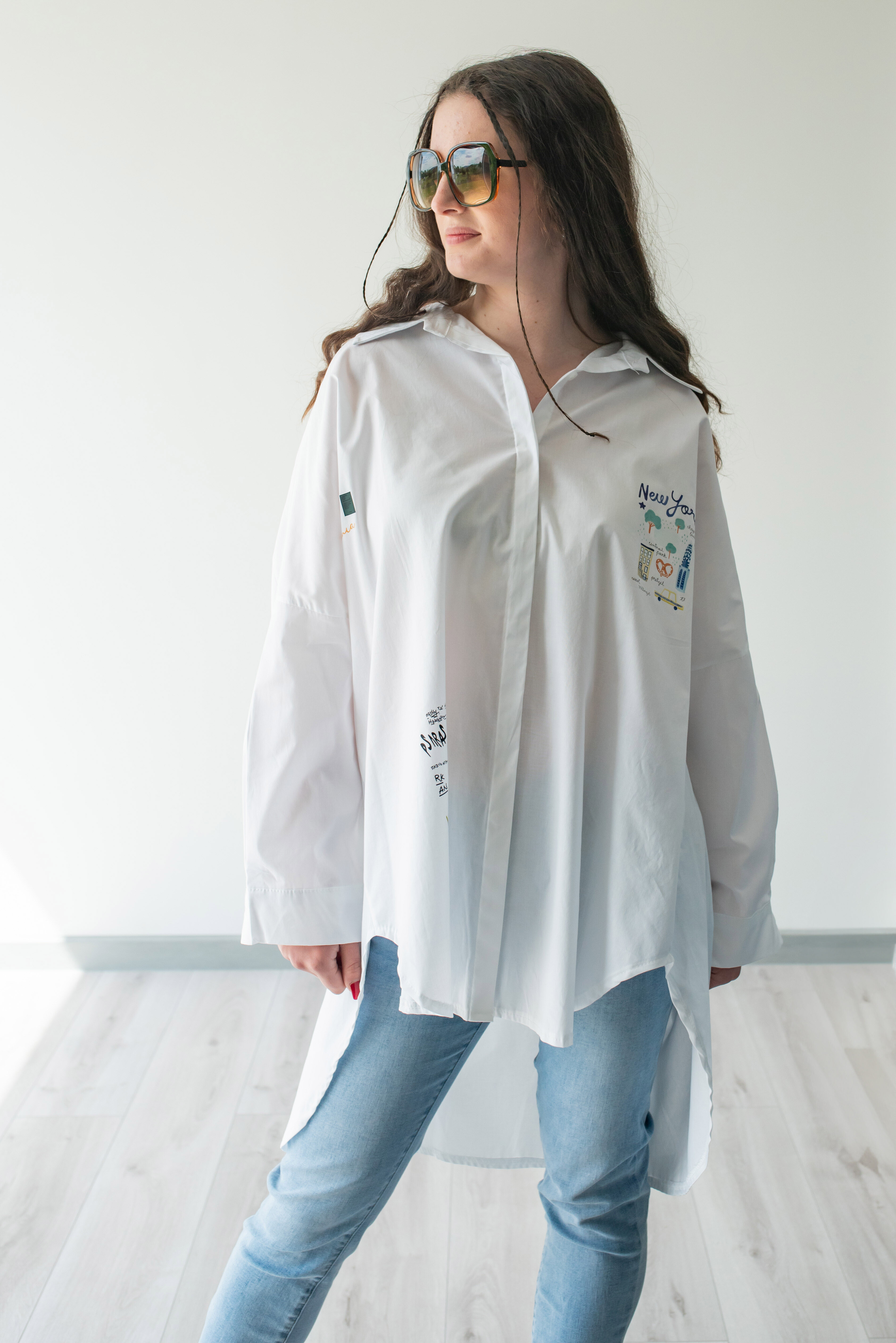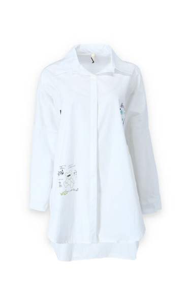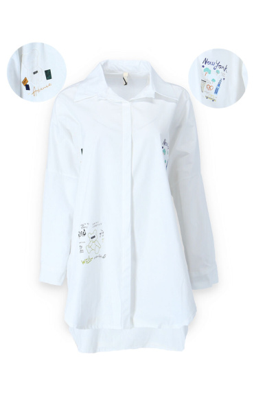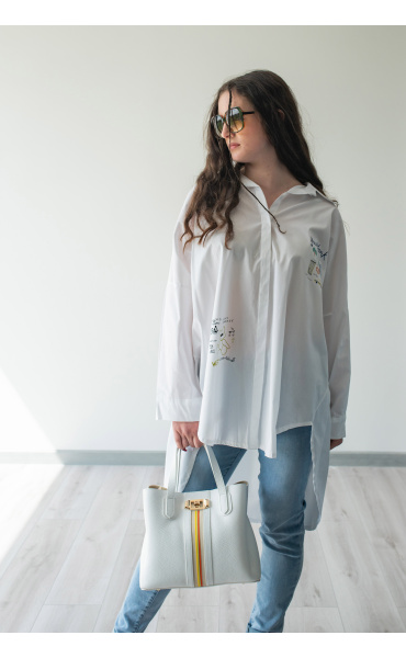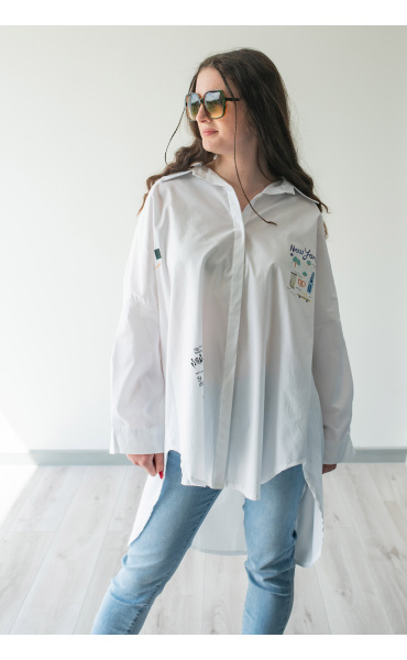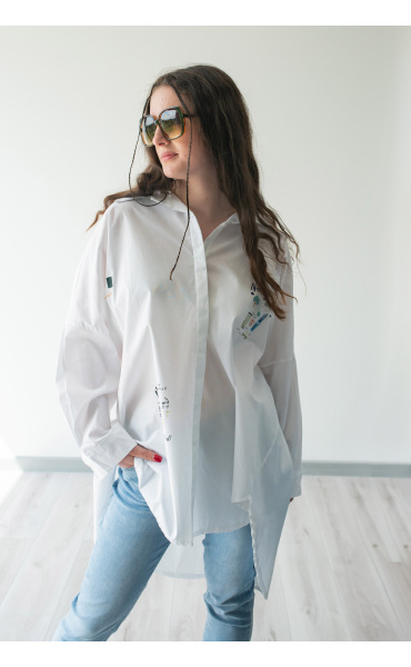 Dámská stylová košile oversize střihu s aplikací. Košile má 3/4 rukáv, je propínací a má prodlouženou zadní délku.