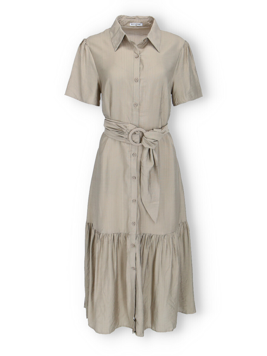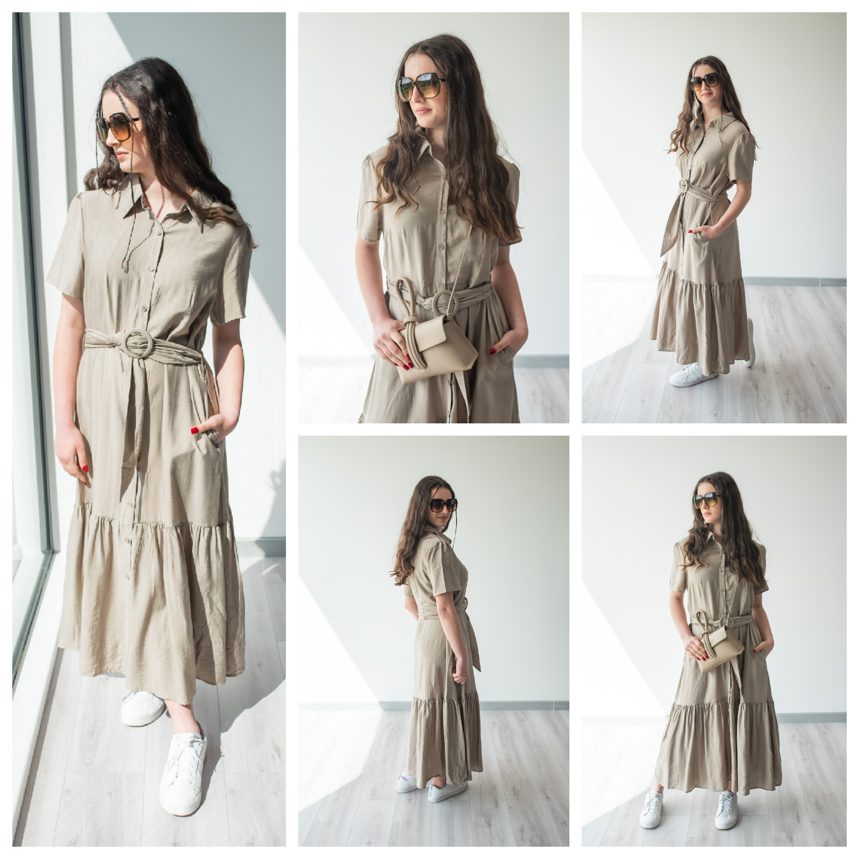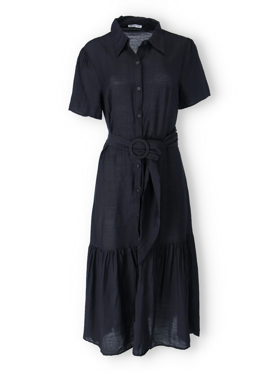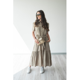Dámské dlouhé košilové šaty s volánem. Šaty jsou doplněny páskem, mají krátký rukáv, jsou propínací a po stranách mají všité kapsy. Dovezeno z Itálie.