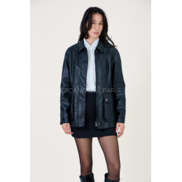 Koženková bunda delšího střihu pod zadek. Bunda má našité kapsy na přední straně.