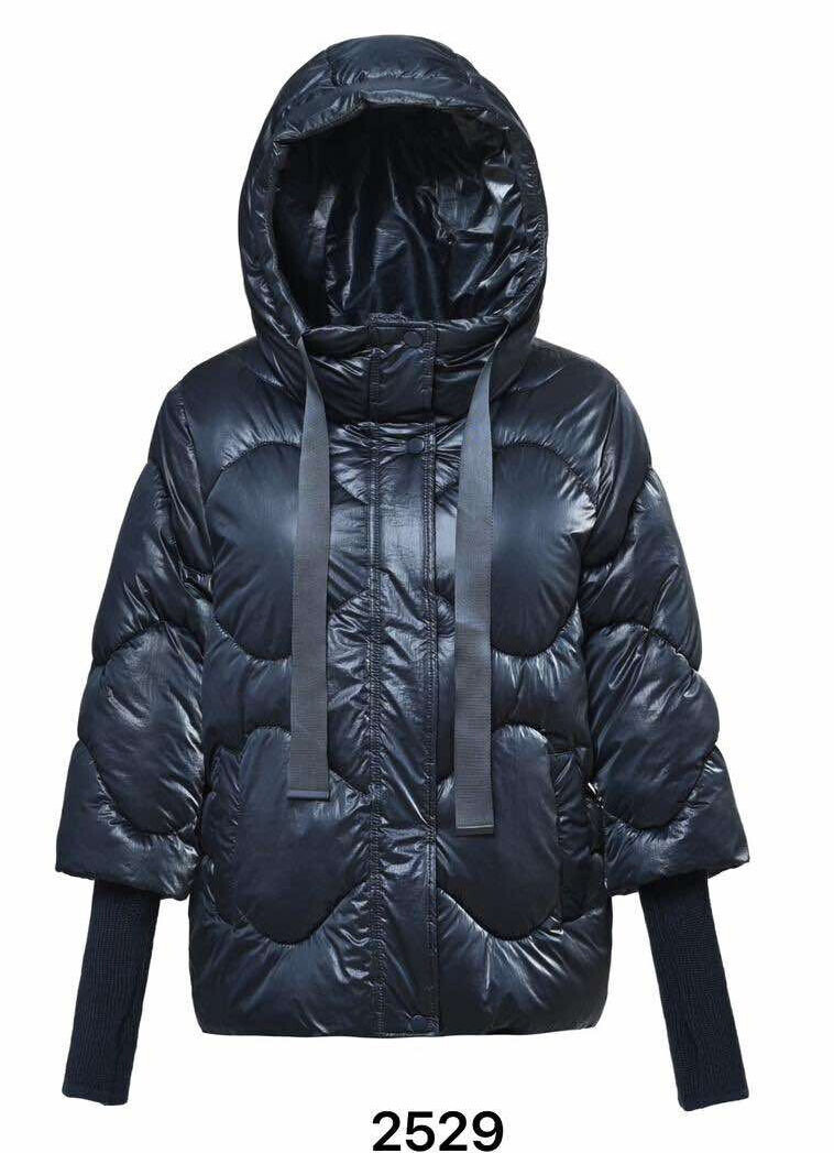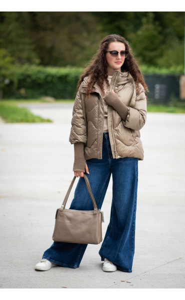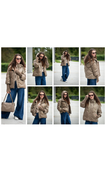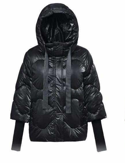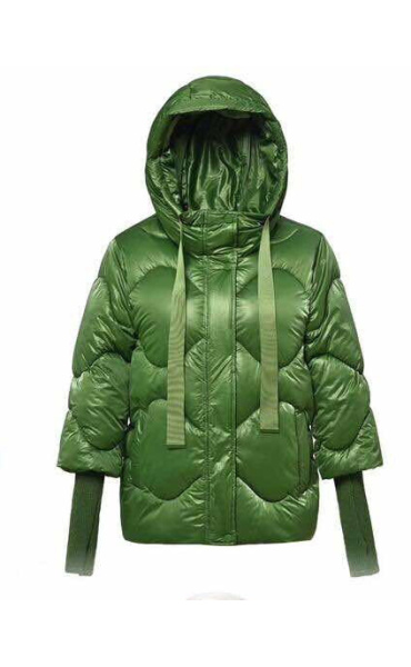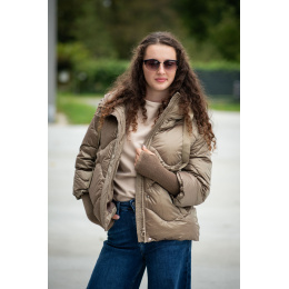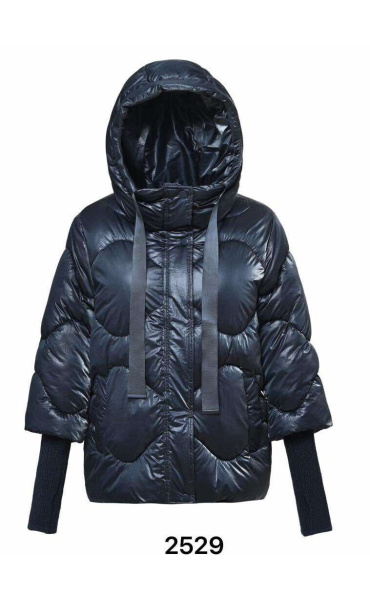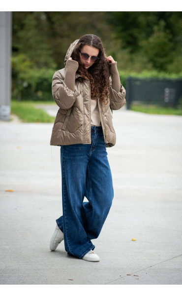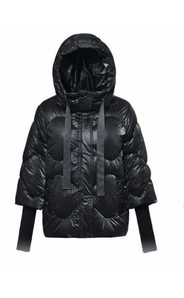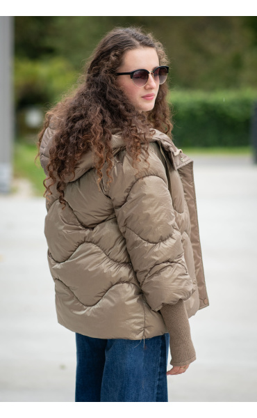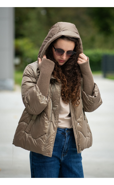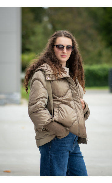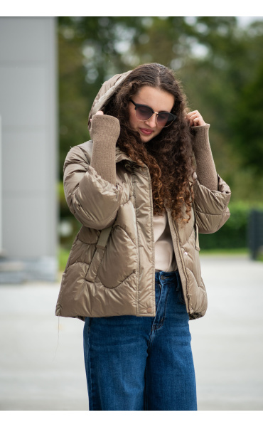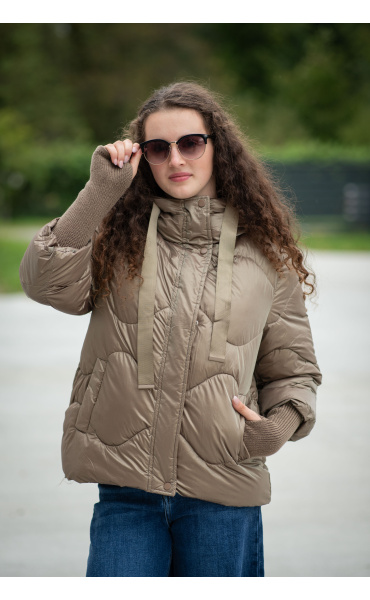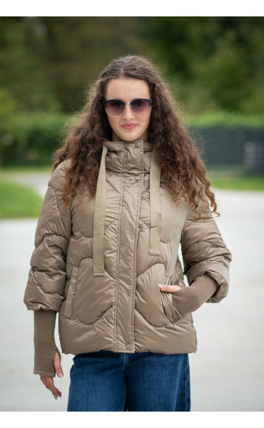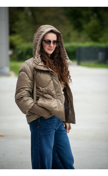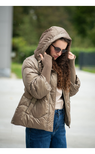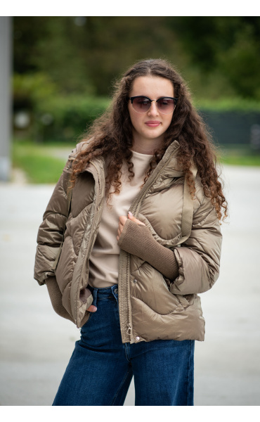 Krátká stylová bunda s kapucí, 3/4rukáv - zbývající délka doplněna úpletem. Přední kapsy jsou na druky. Možnost regulace stažení ve spodní části bundy. Dovoz Itálie