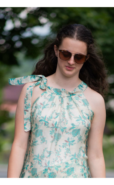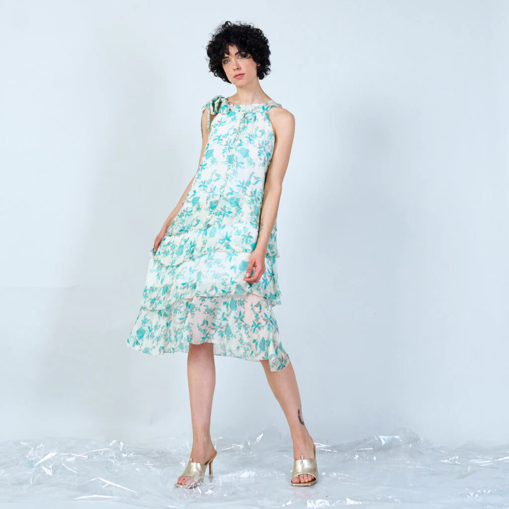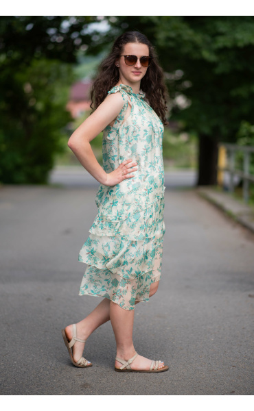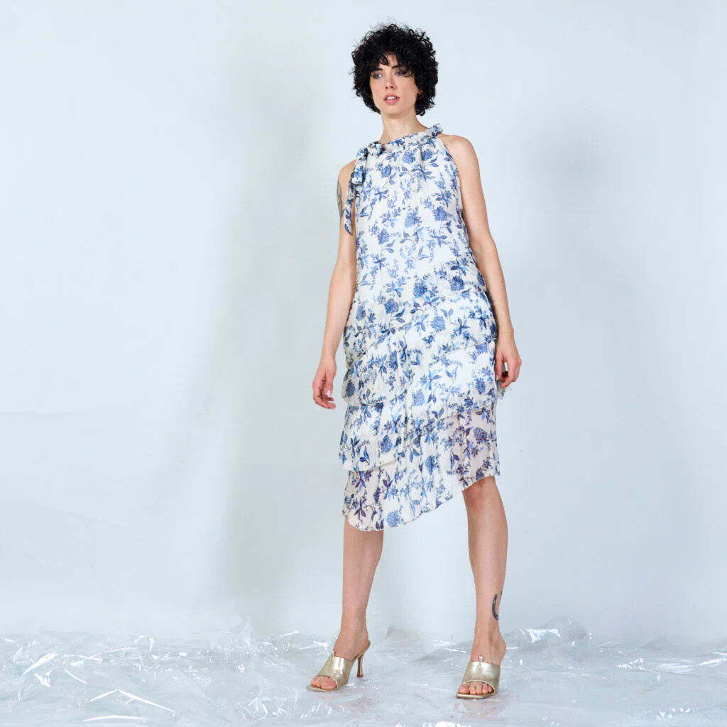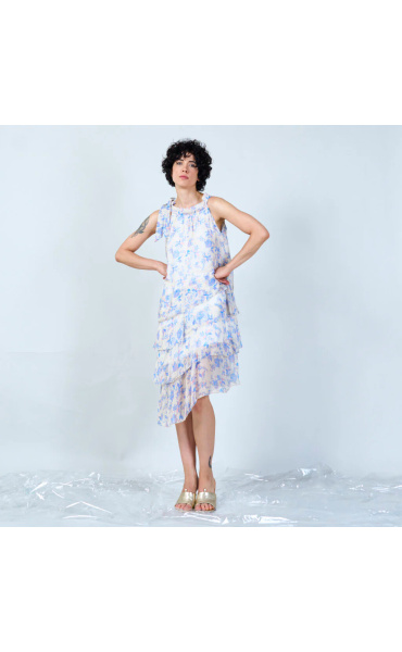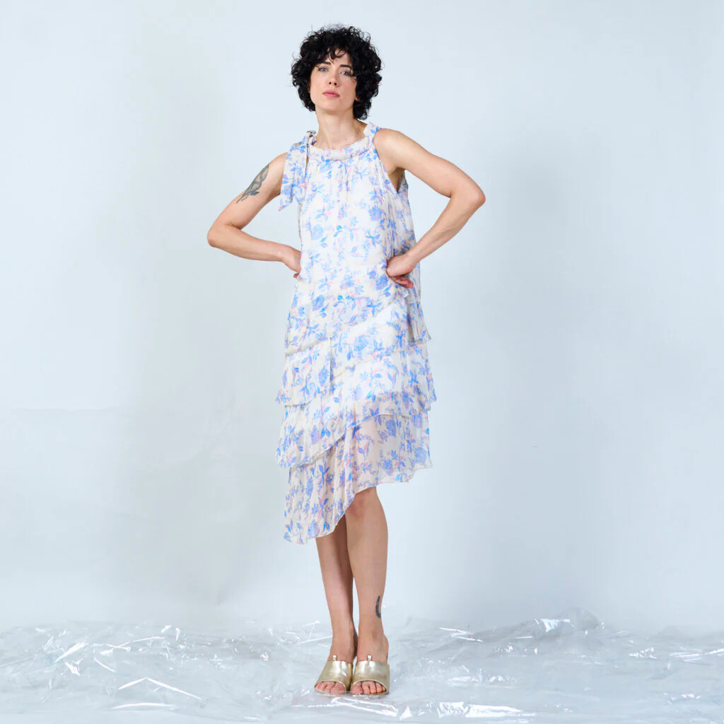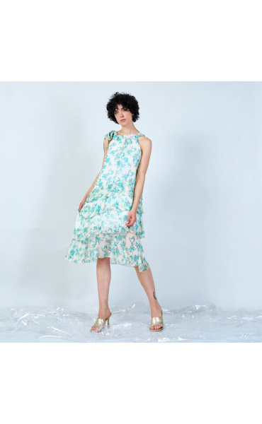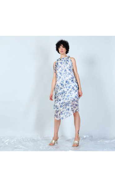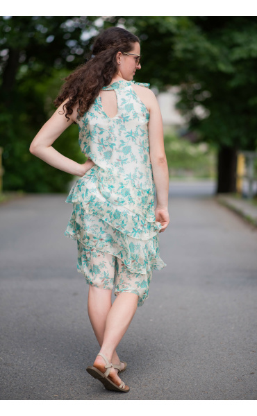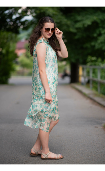 Módní hedvábné šaty volánového kaskádovitého střihu v midi délce. Šaty jsou bez rukávu se stojáčkem na uvázání kolem krku.