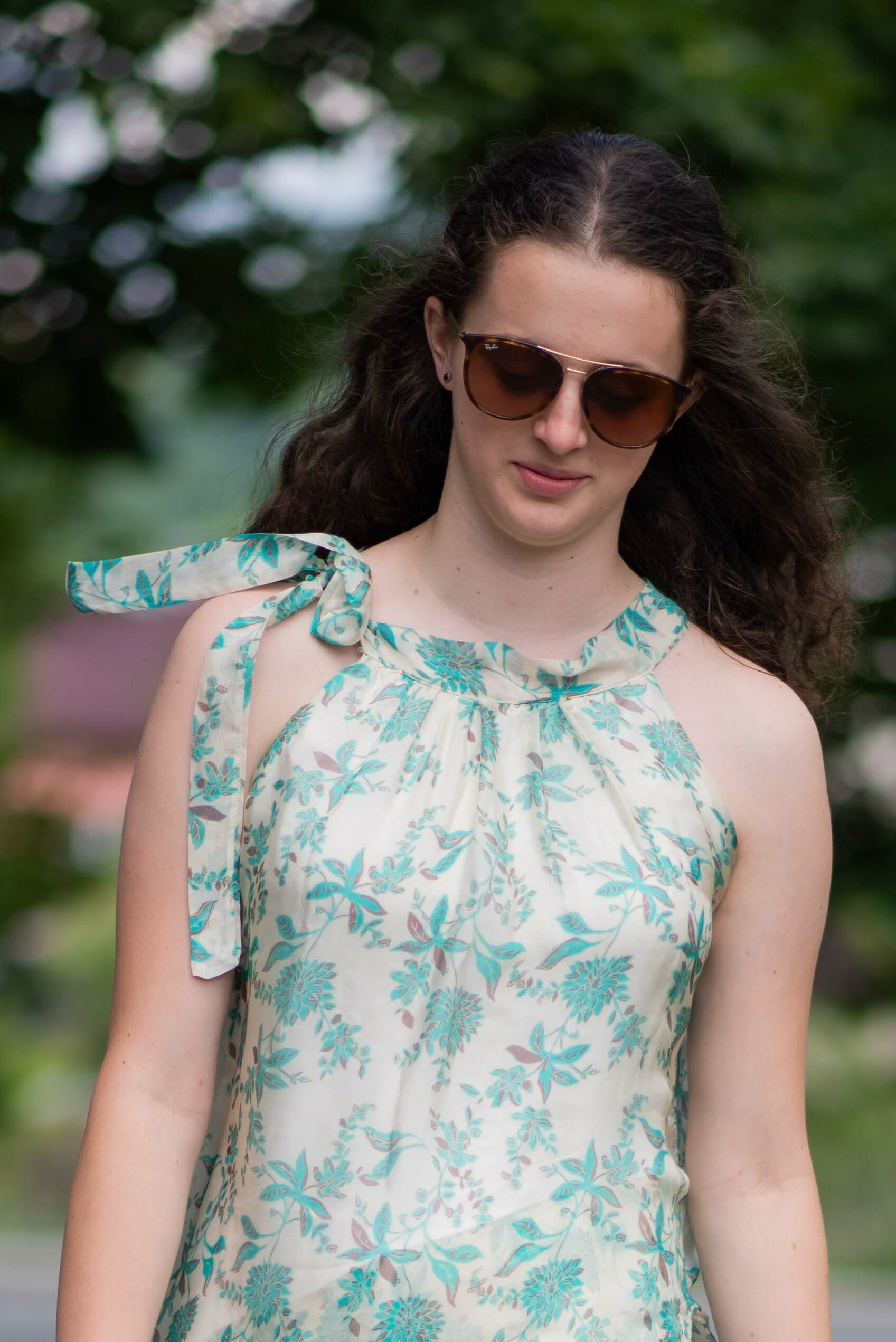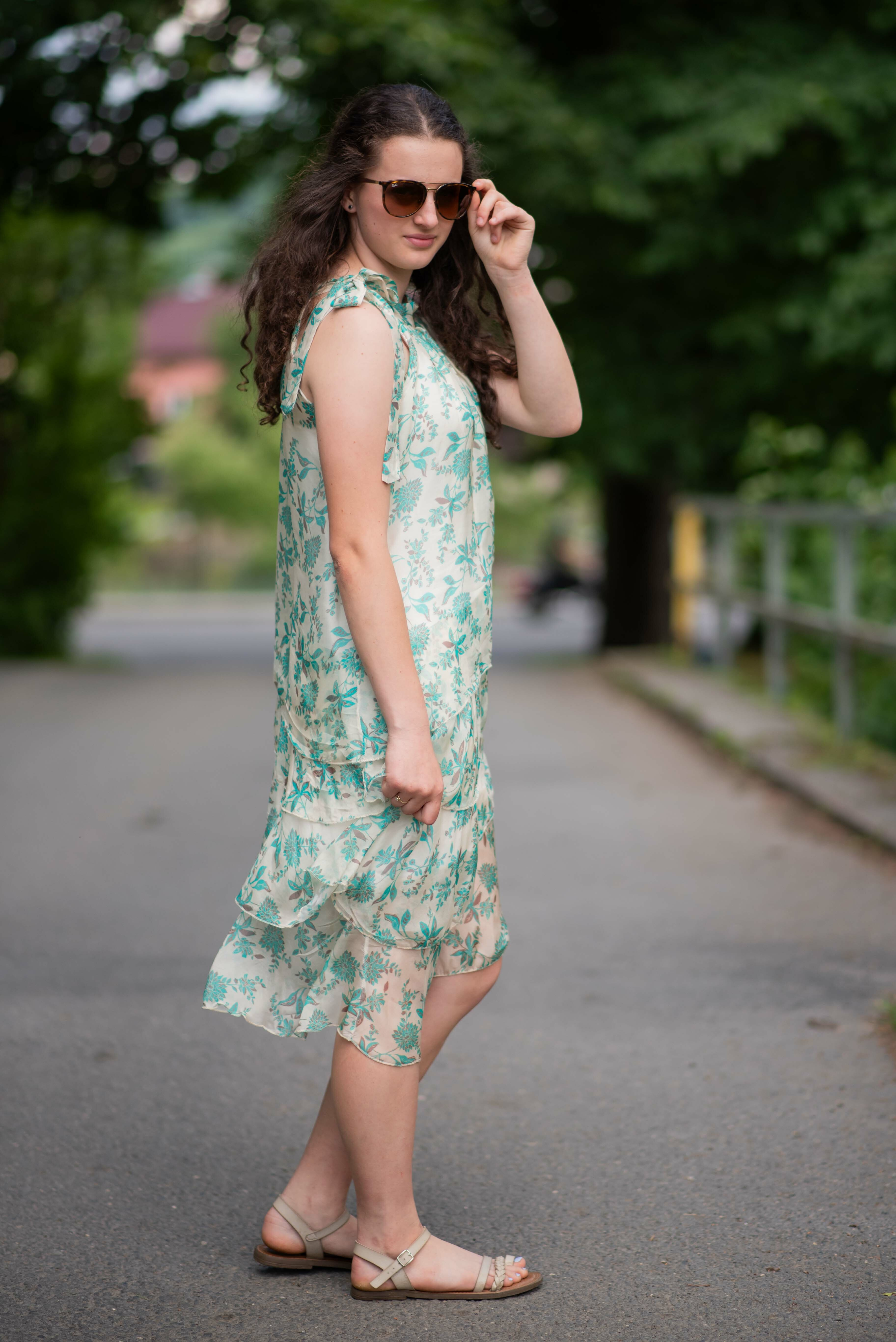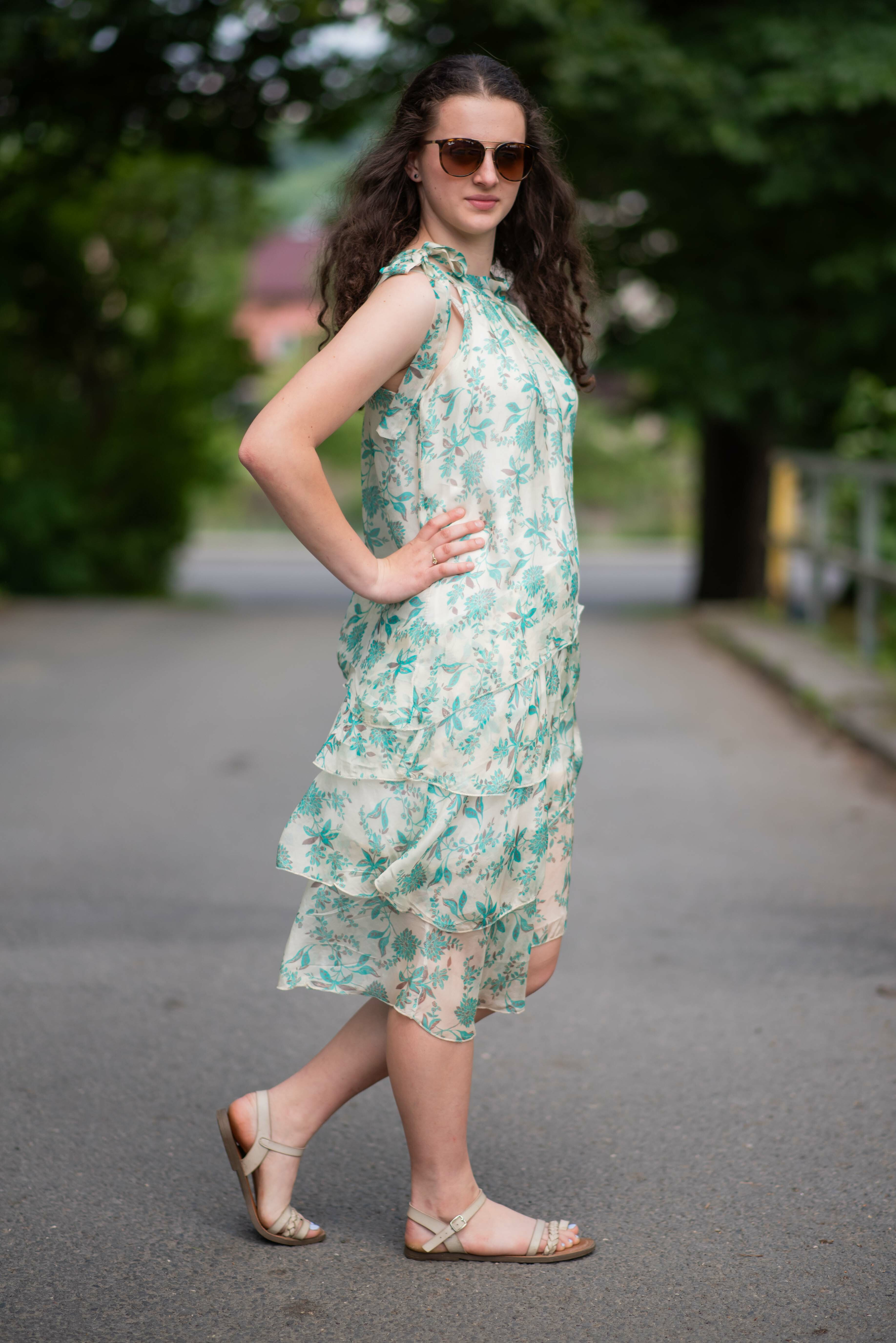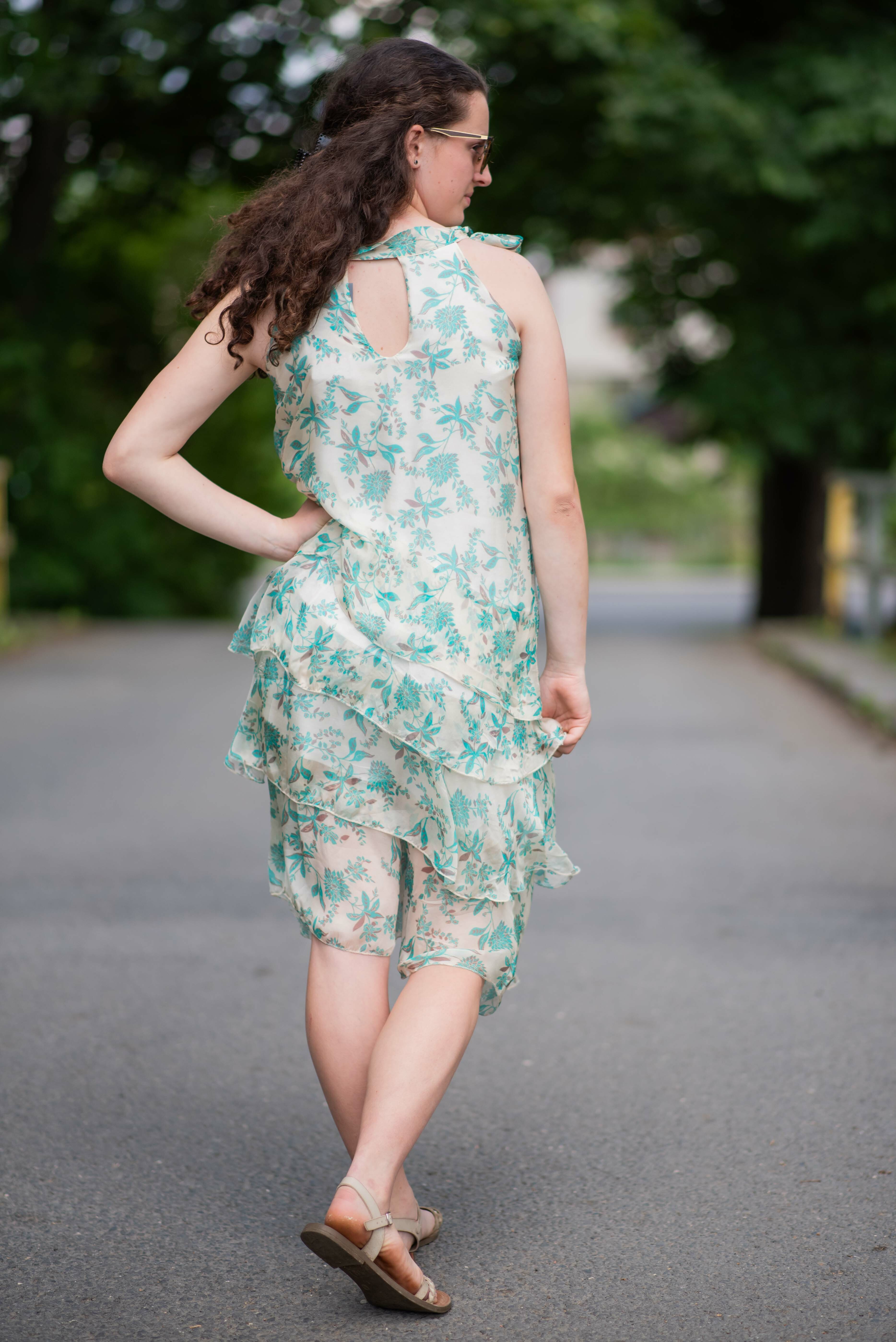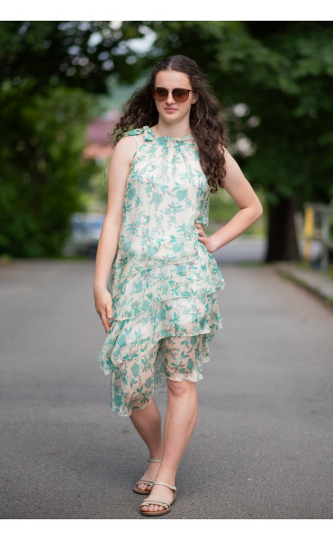 Módní hedvábné šaty volánového kaskádovitého střihu v midi délce. Šaty jsou bez rukávu se stojáčkem na uvázání kolem krku.