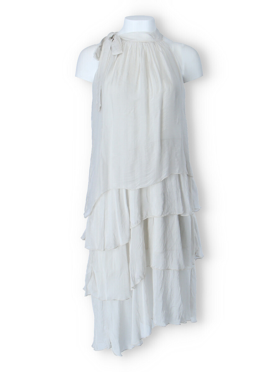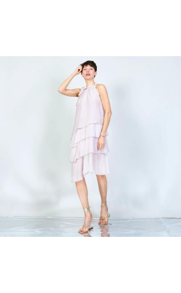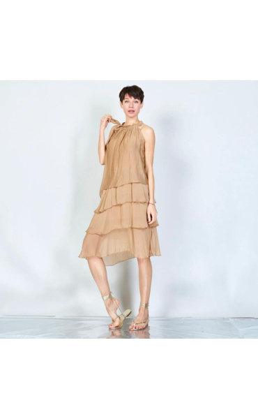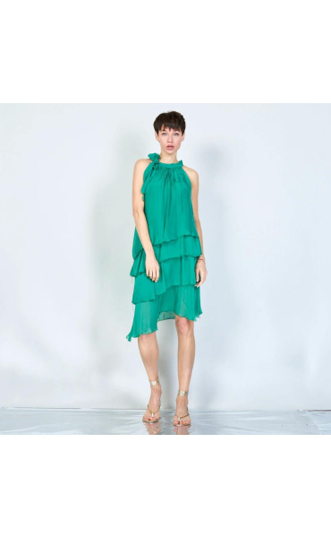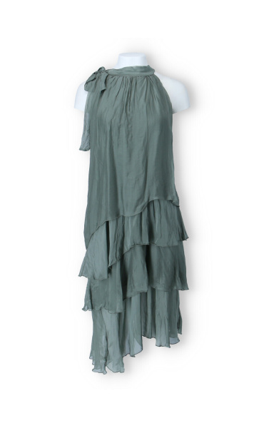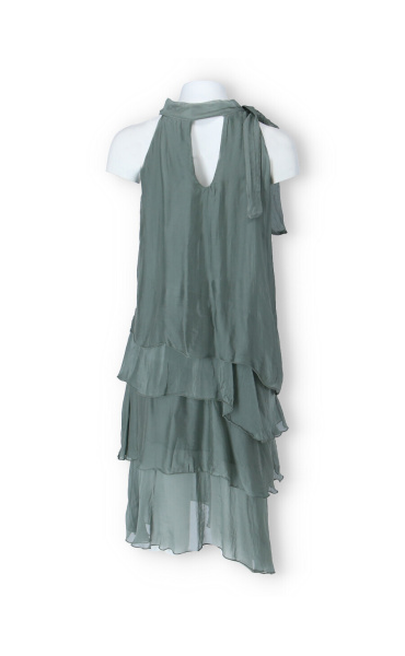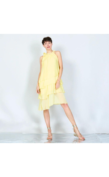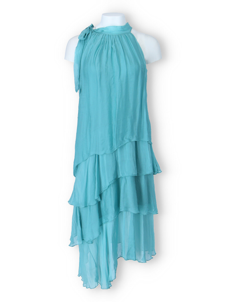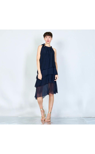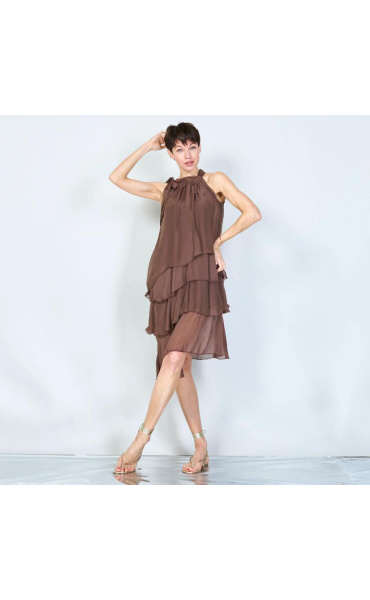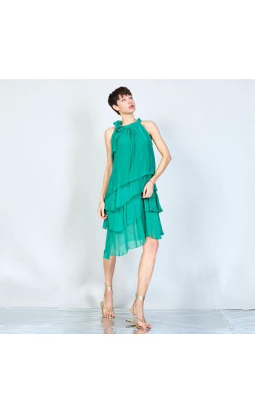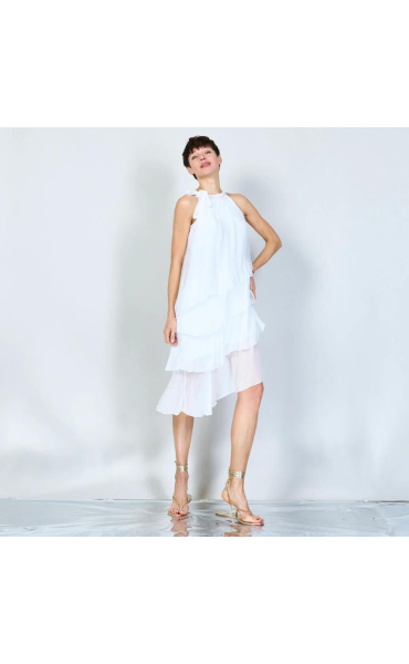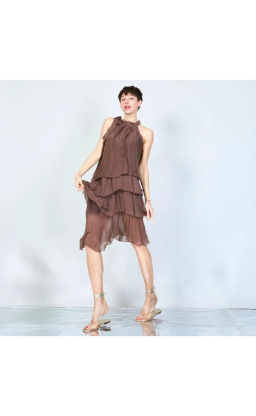 Módní hedvábné šaty volánového kaskádovitého střihu v midi délce. Šaty jsou bez rukávu se stojáčkem na uvázání kolem krku.