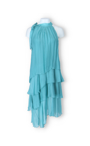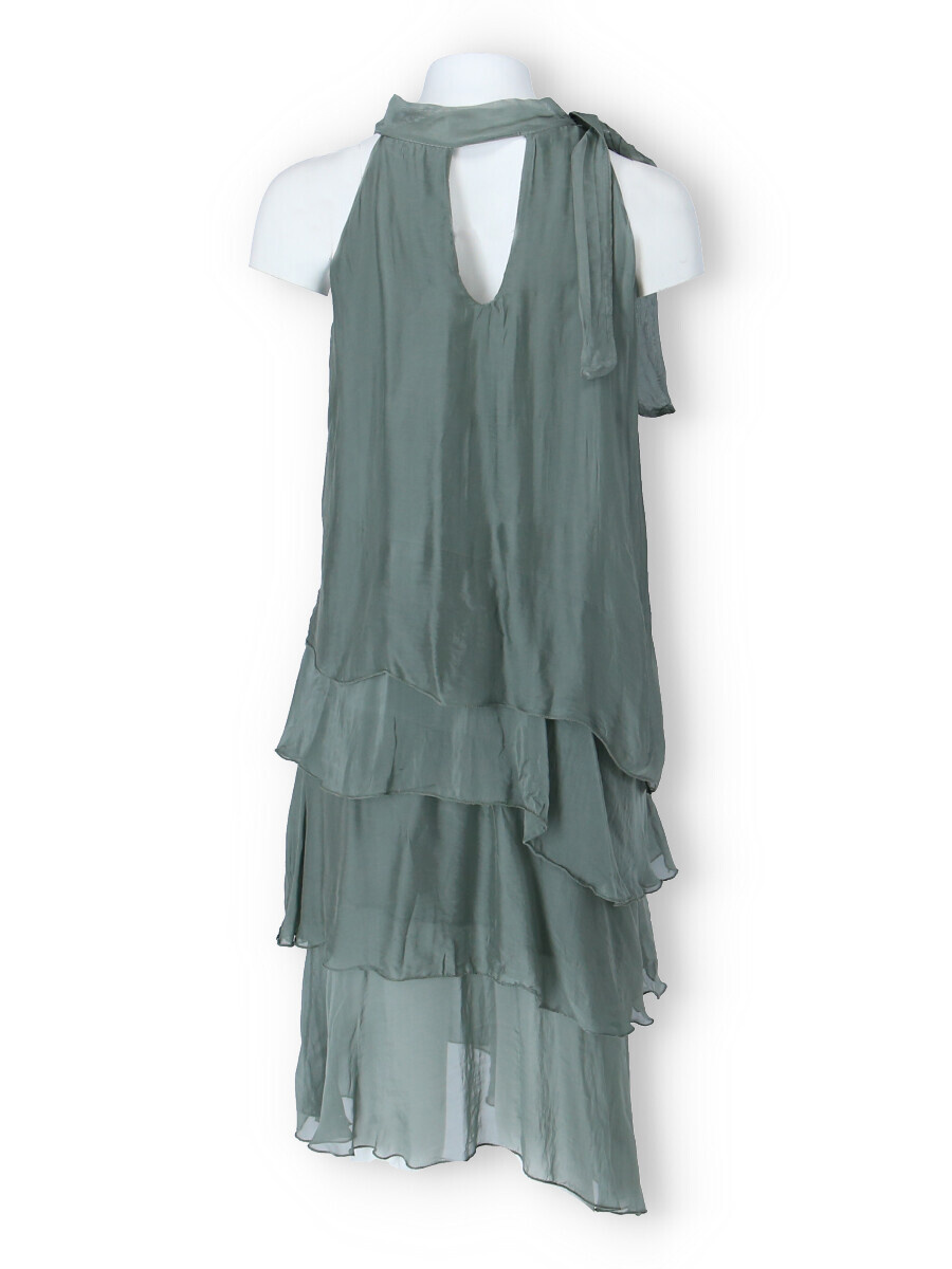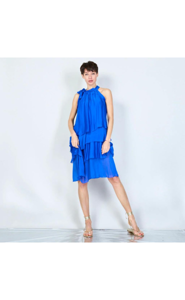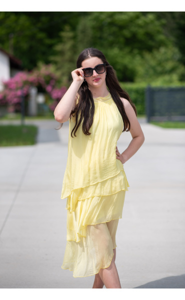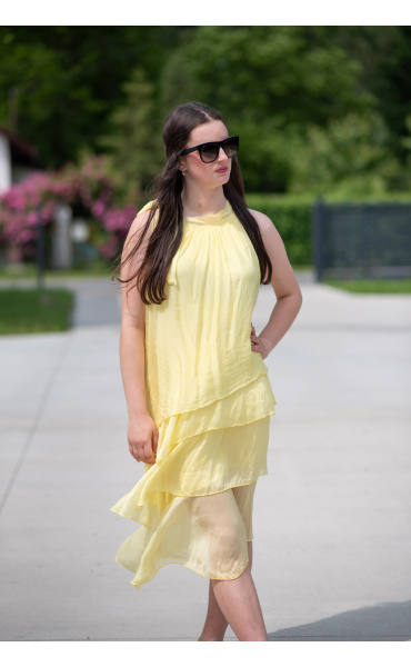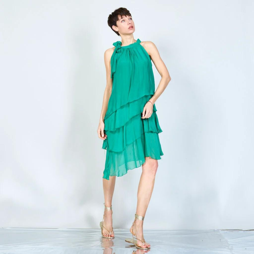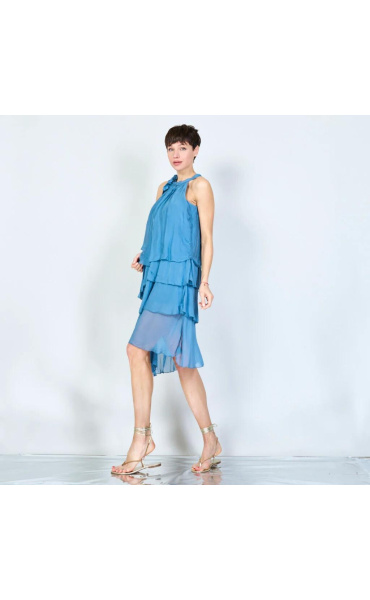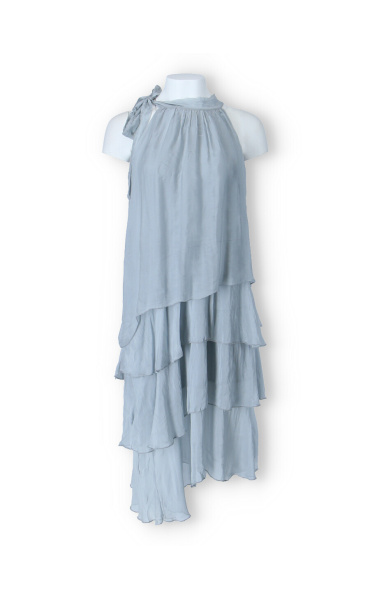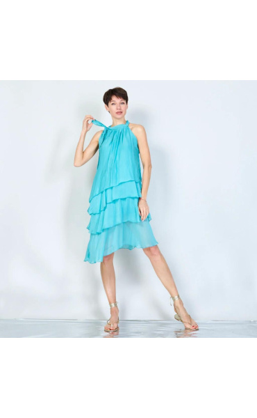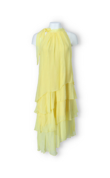 Módní hedvábné šaty volánového kaskádovitého střihu v midi délce. Šaty jsou bez rukávu se stojáčkem na uvázání kolem krku.