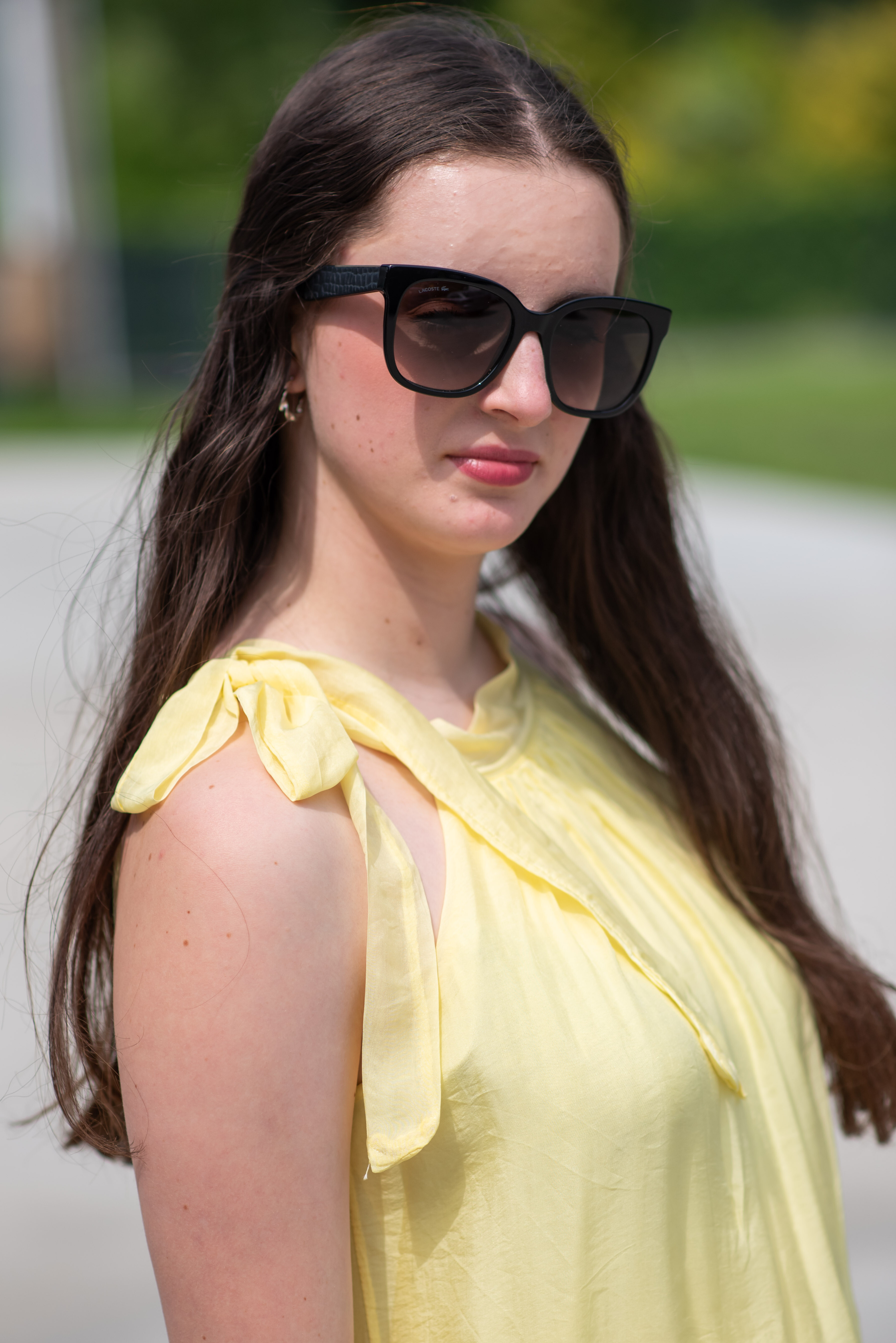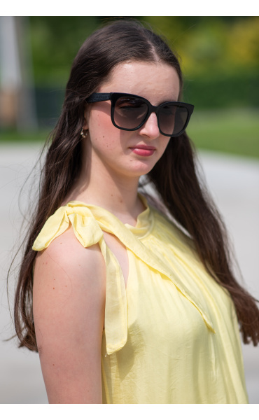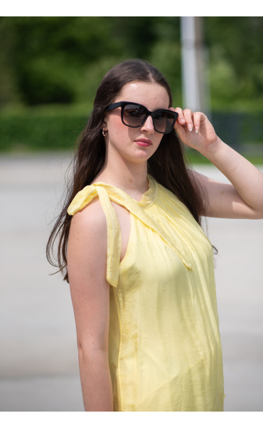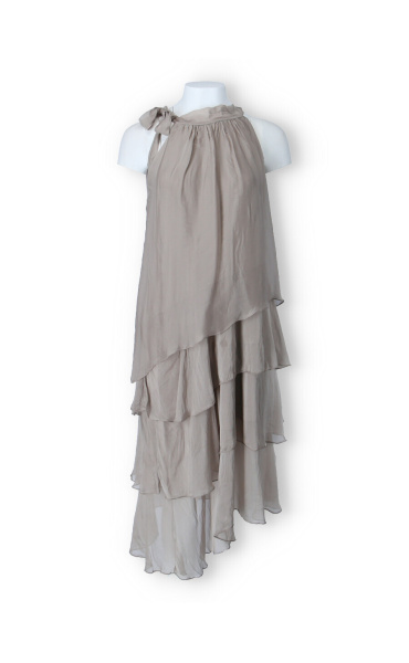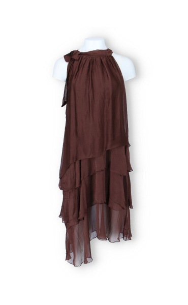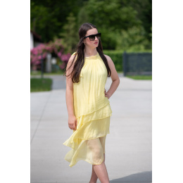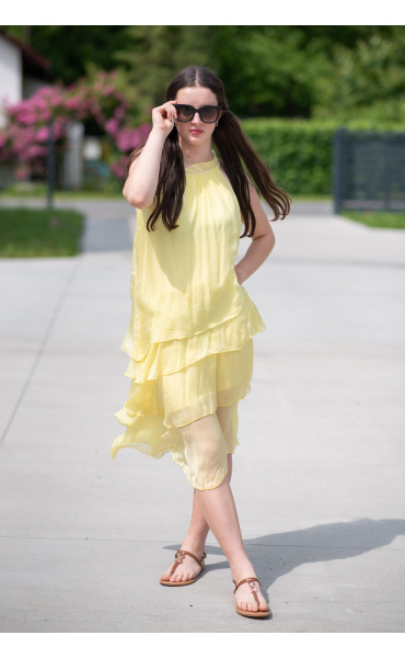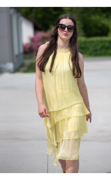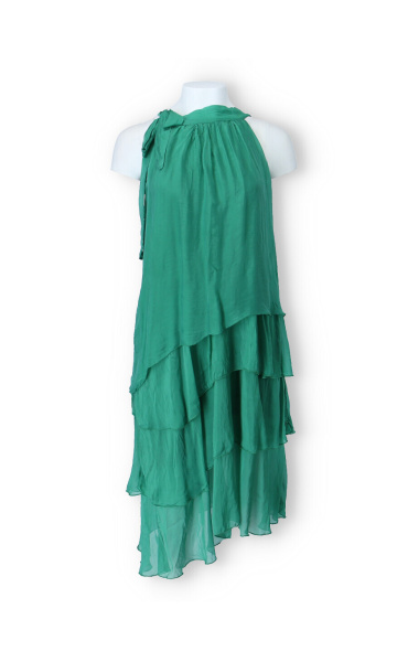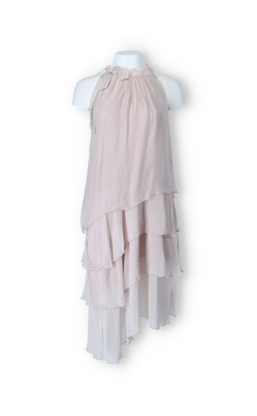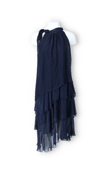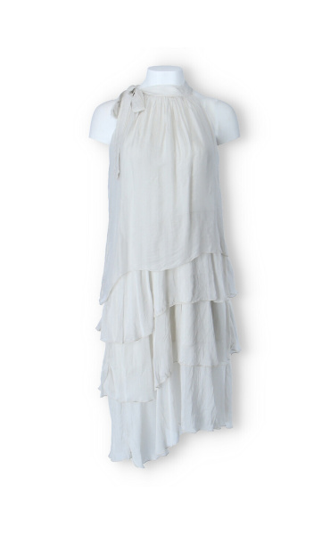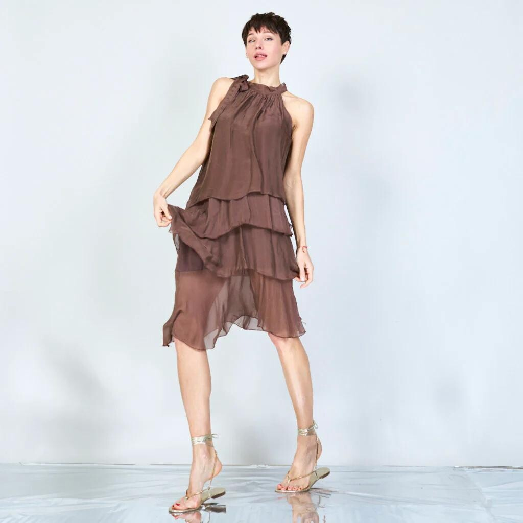 Módní hedvábné šaty volánového kaskádovitého střihu v midi délce. Šaty jsou bez rukávu se stojáčkem na uvázání kolem krku.