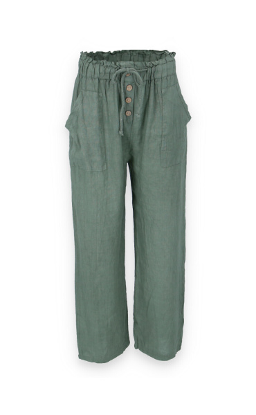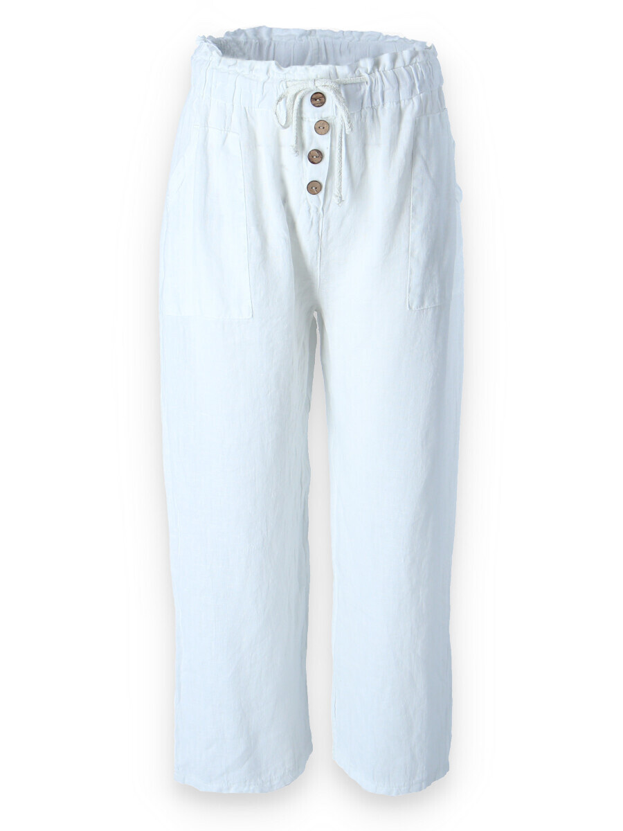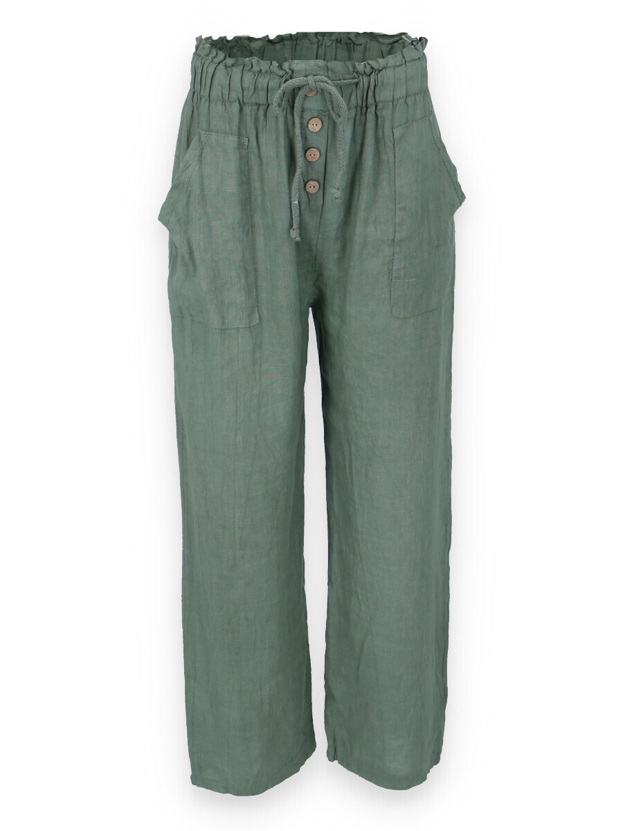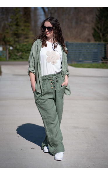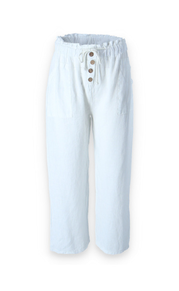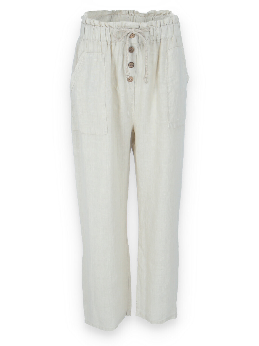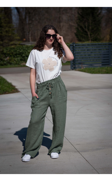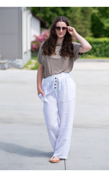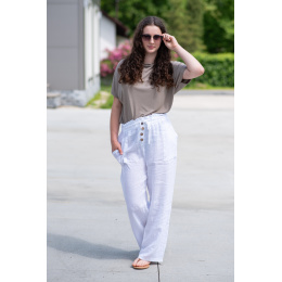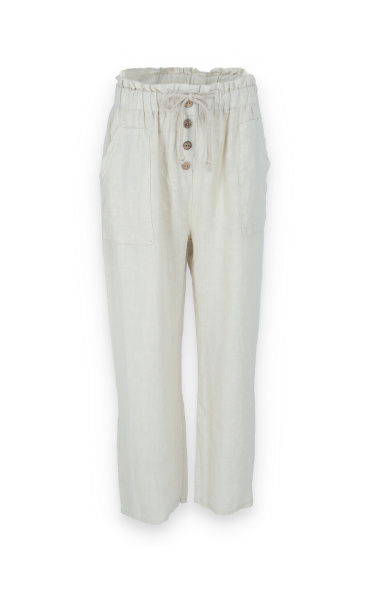 Lněné široké kalhoty v pase do gumy, kalhoty jsou doplněny dřevěnými knoflíčky v pase.
