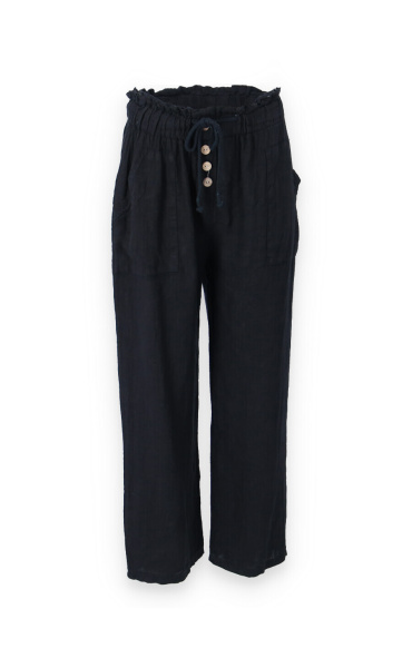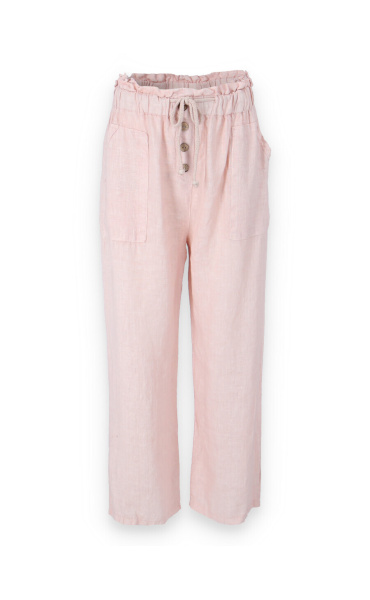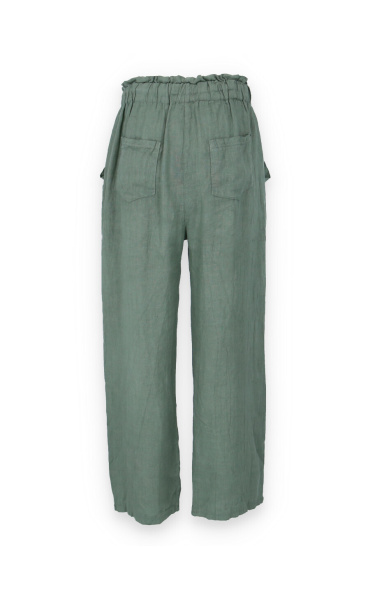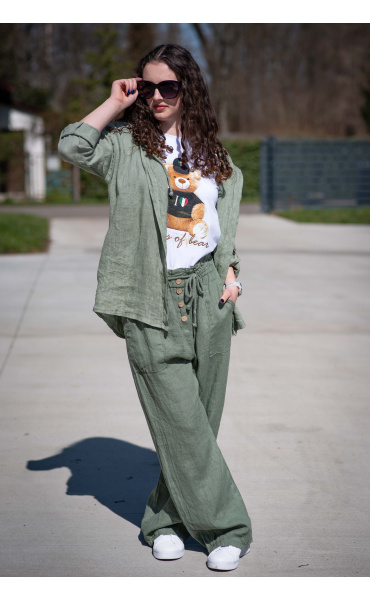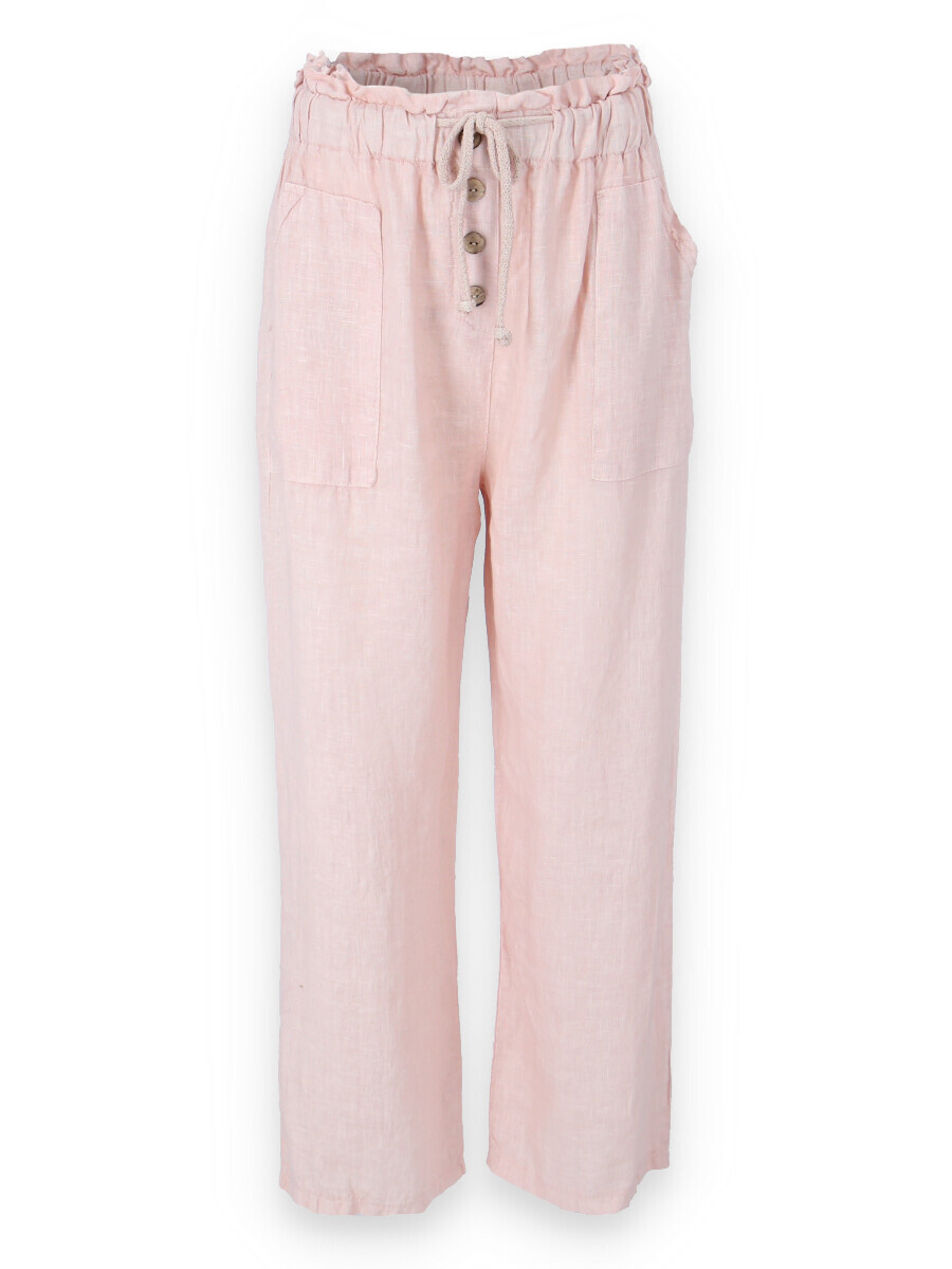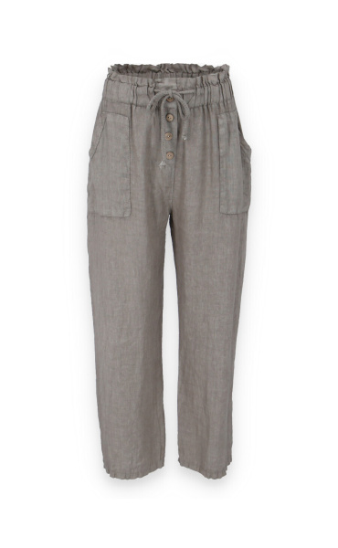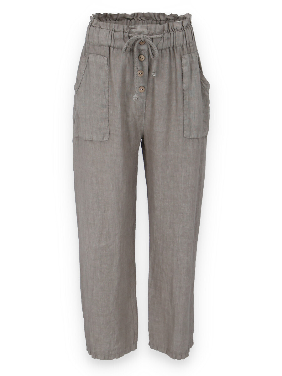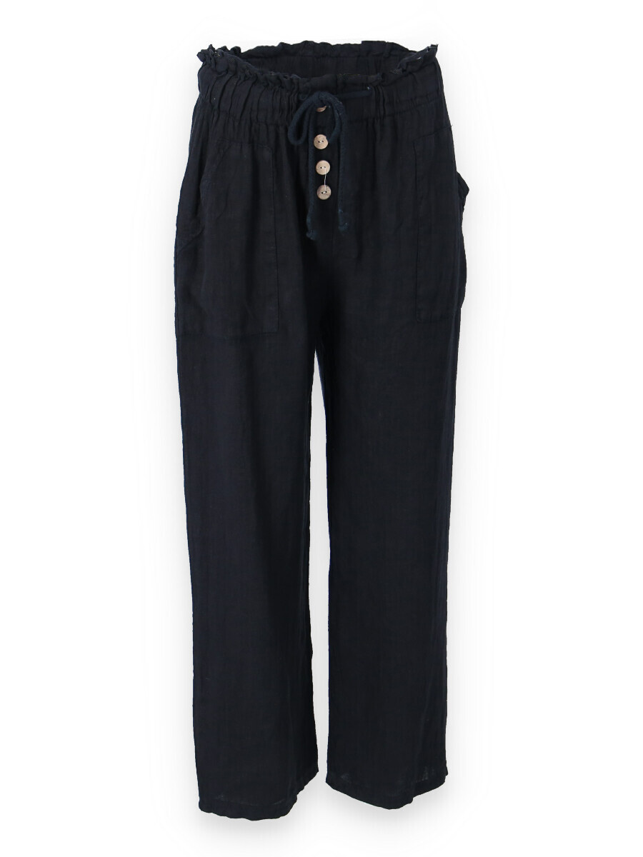 Lněné široké kalhoty v pase do gumy, kalhoty jsou doplněny dřevěnými knoflíčky v pase.