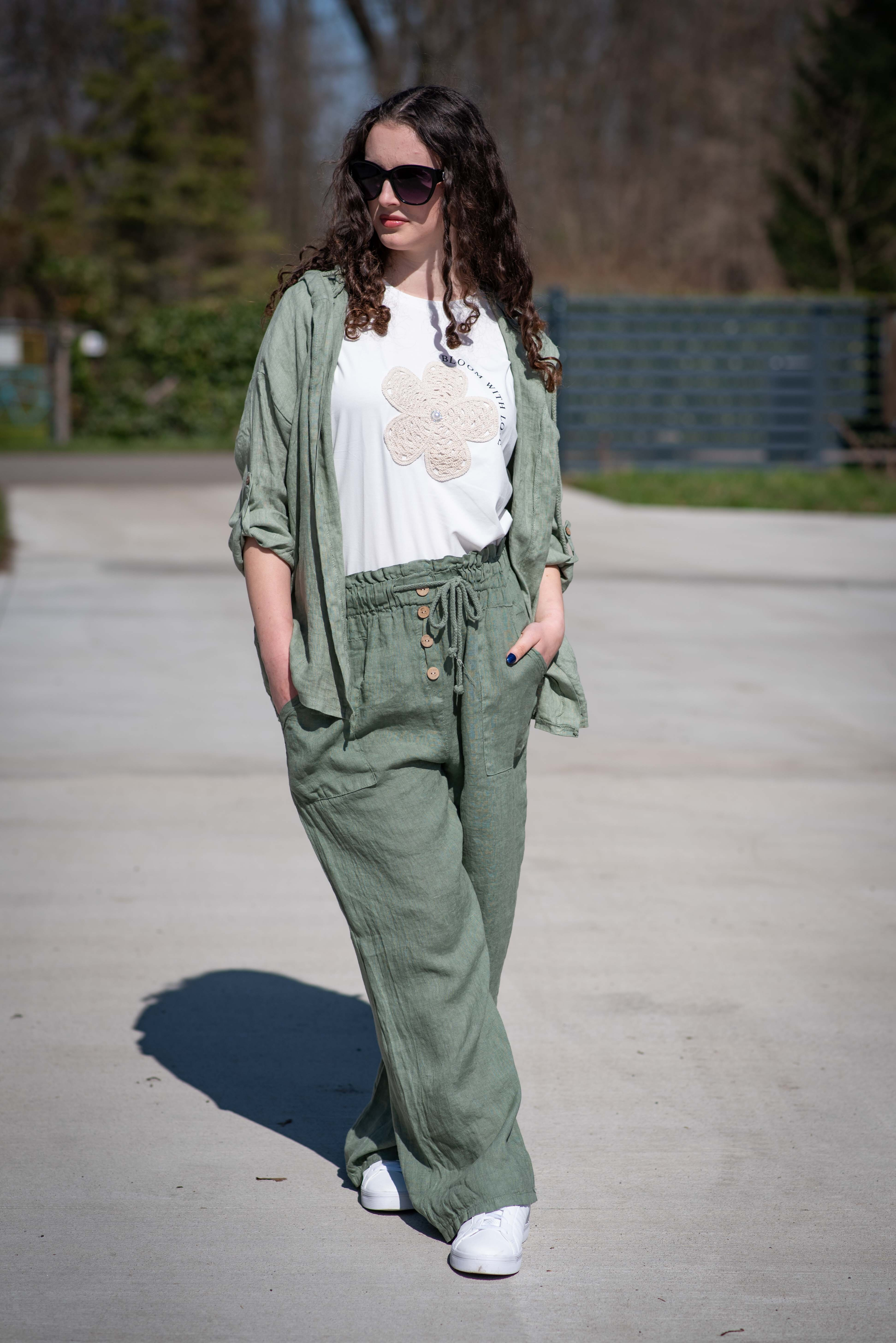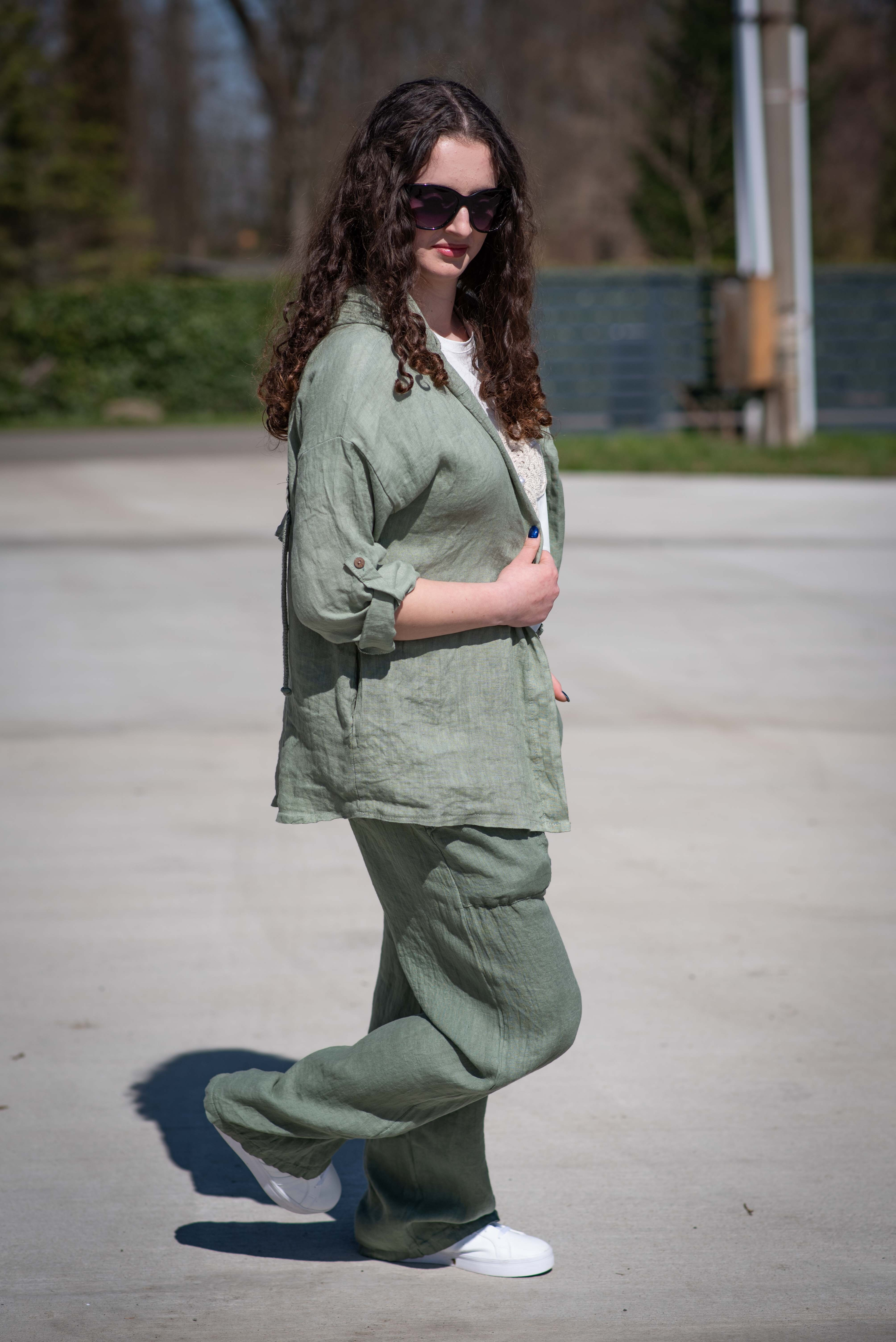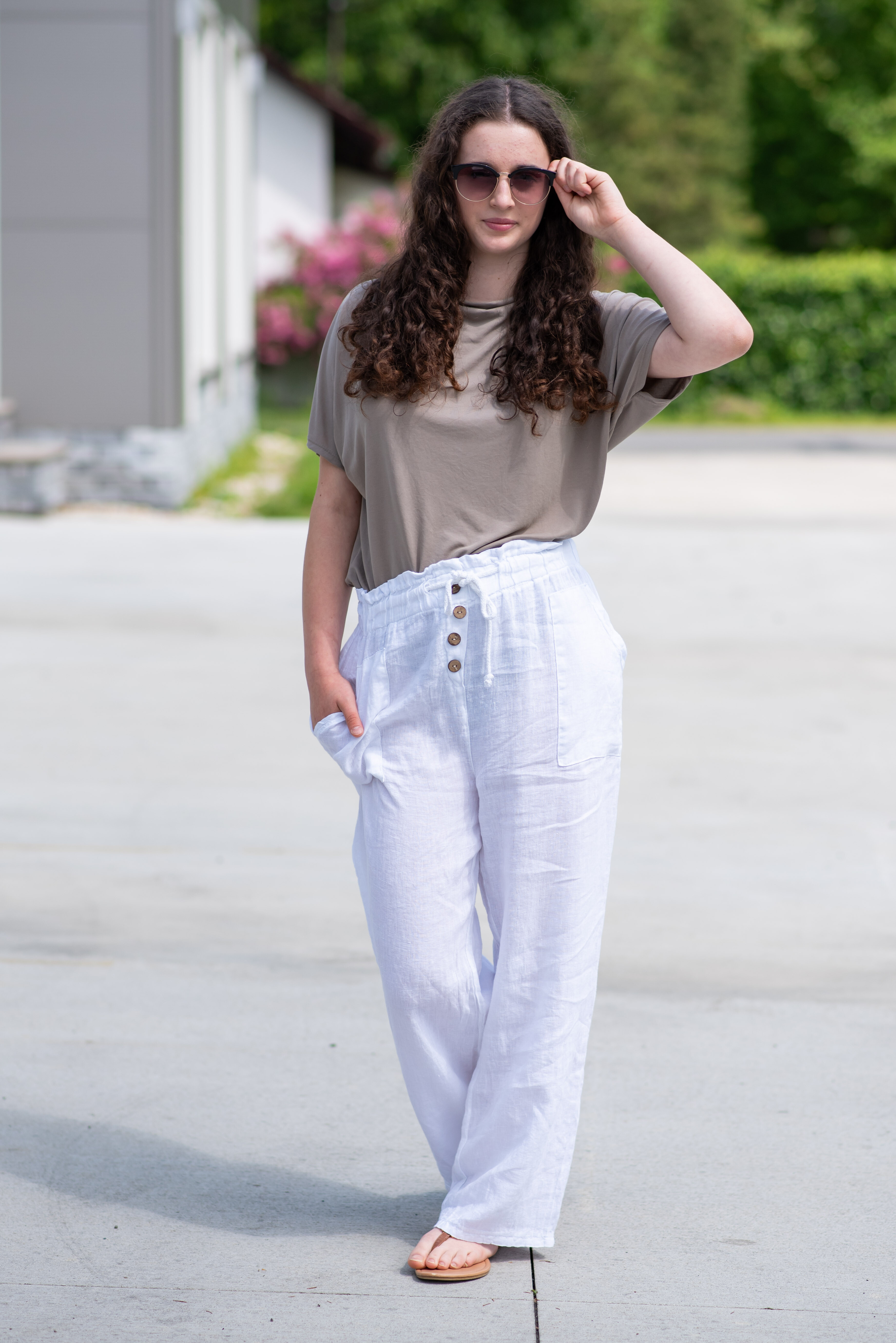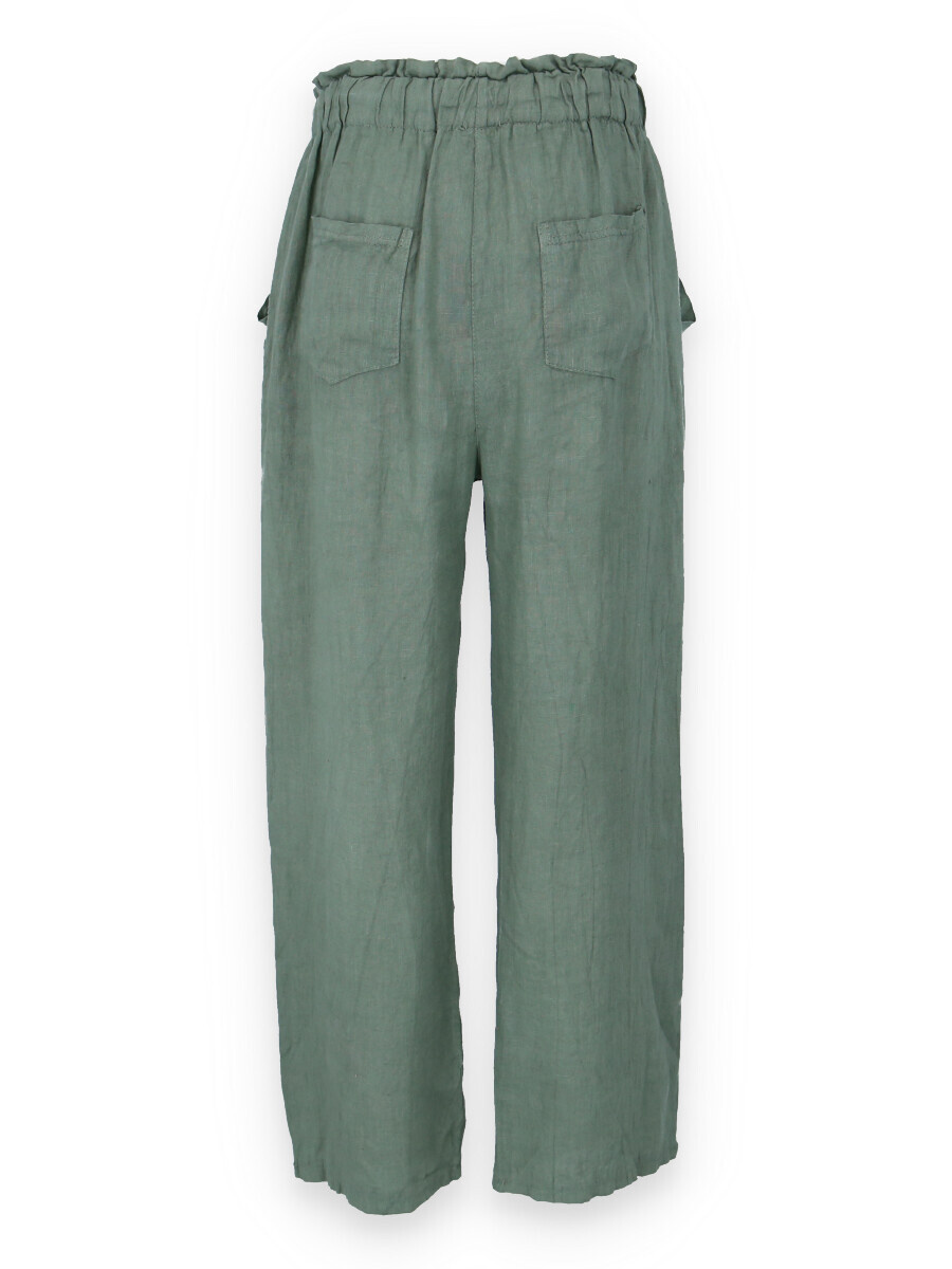 Lněné široké kalhoty v pase do gumy, kalhoty jsou doplněny dřevěnými knoflíčky v pase.