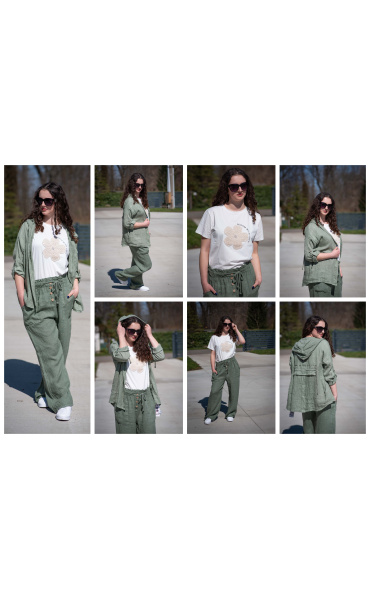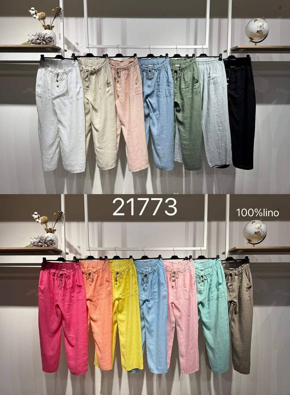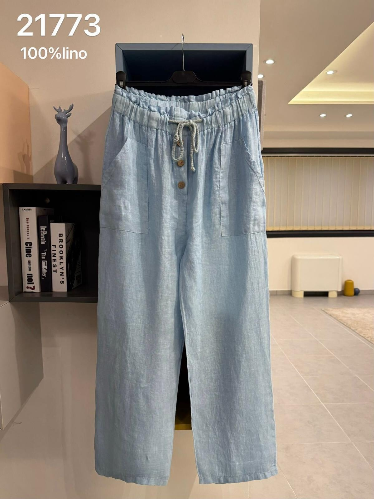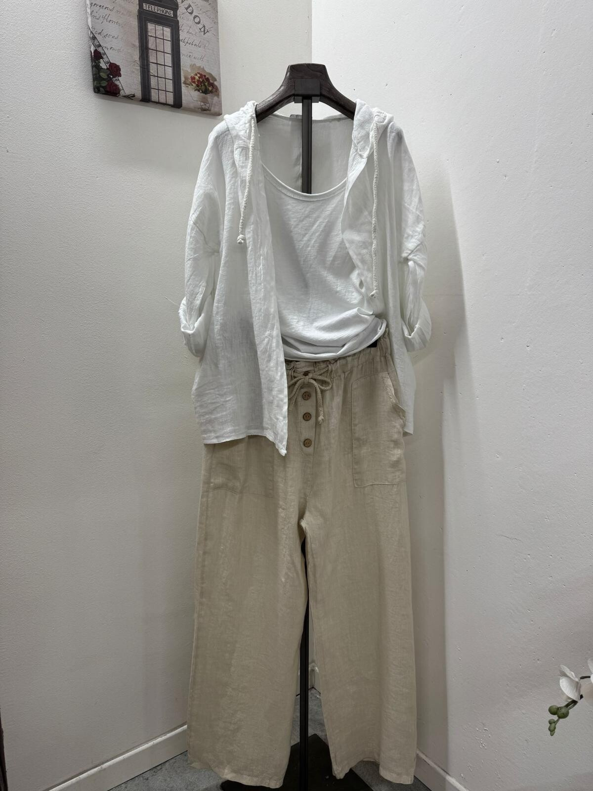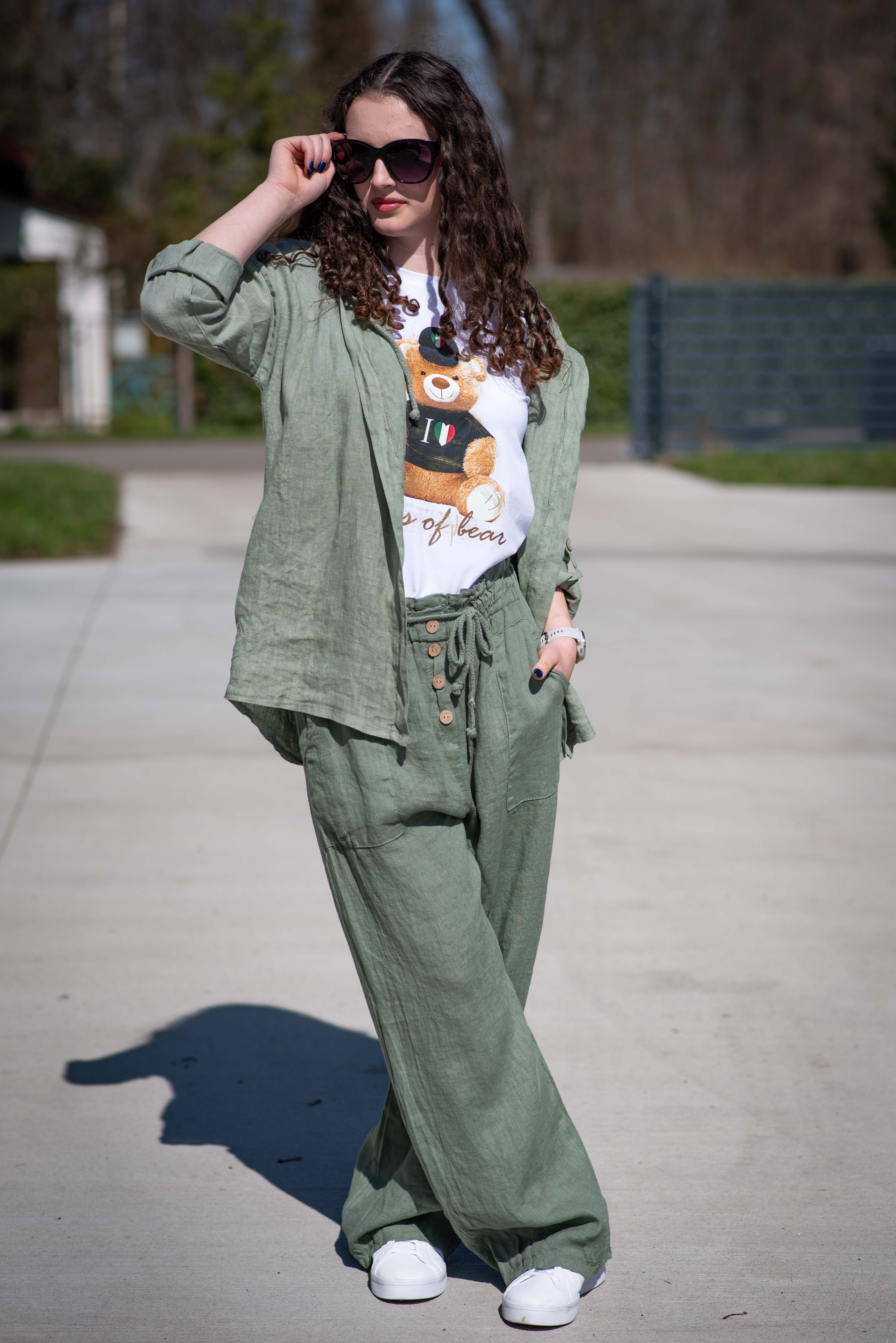 Lněné široké kalhoty v pase do gumy, kalhoty jsou doplněny dřevěnými knoflíčky v pase.