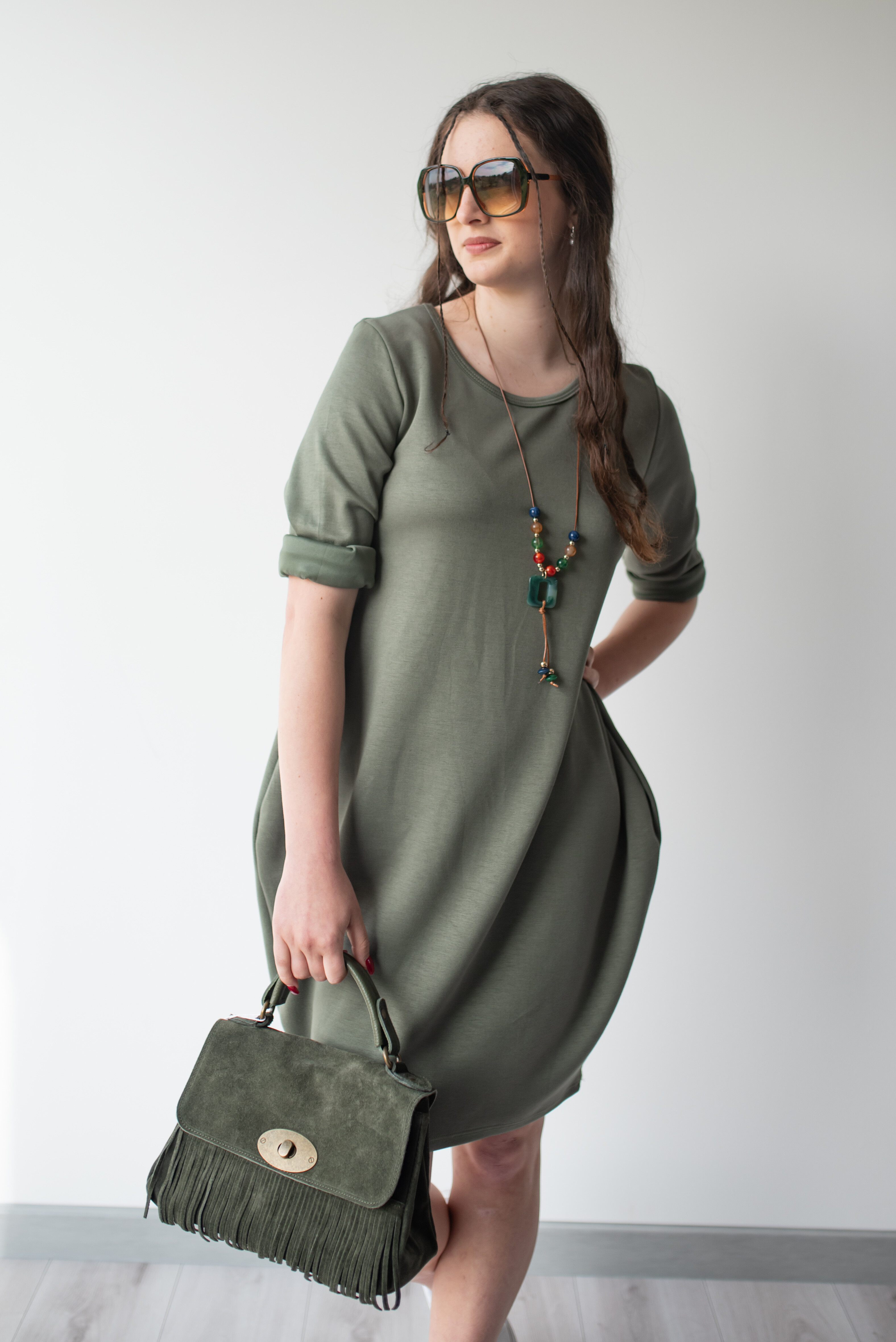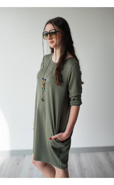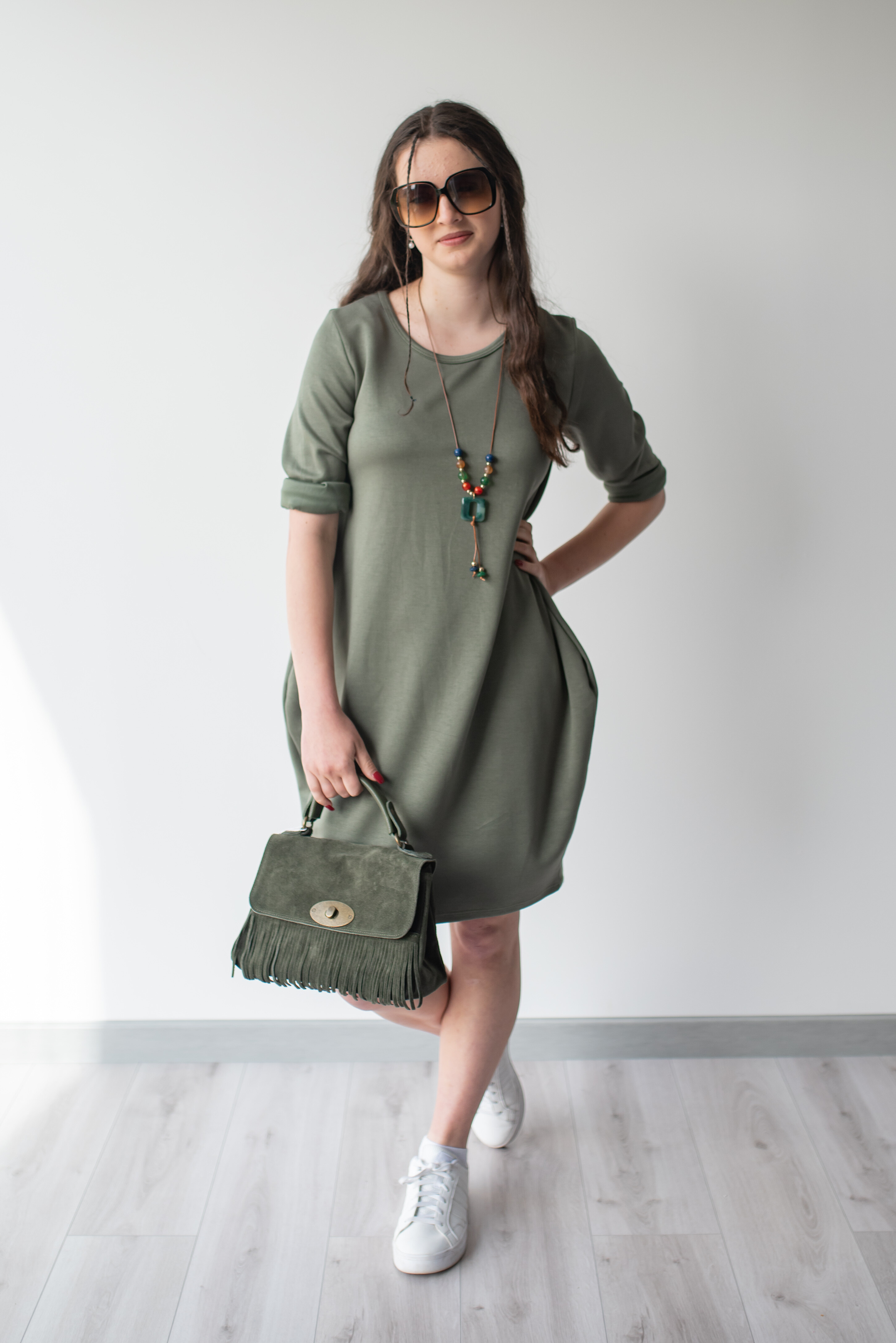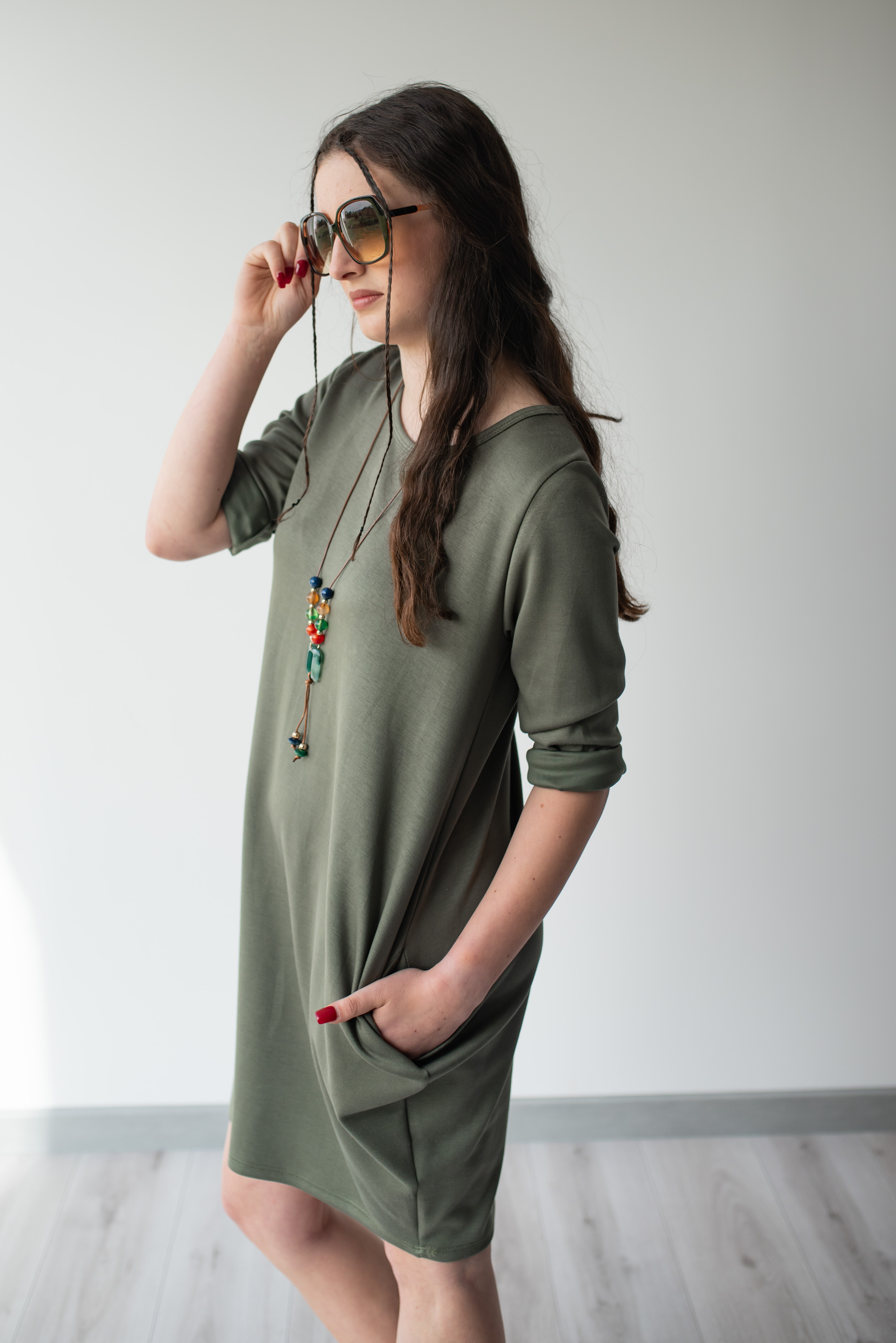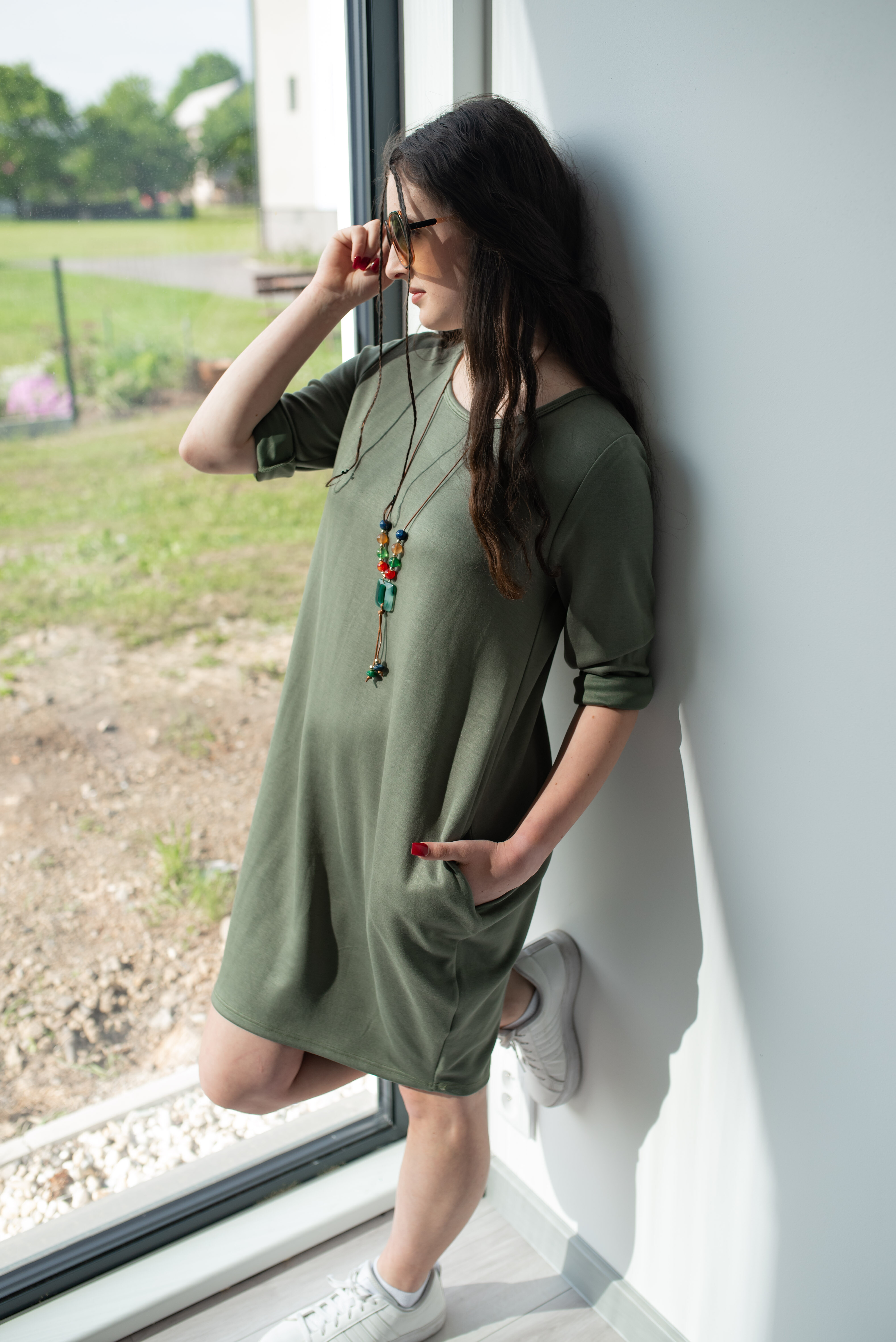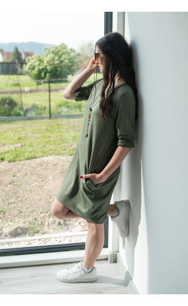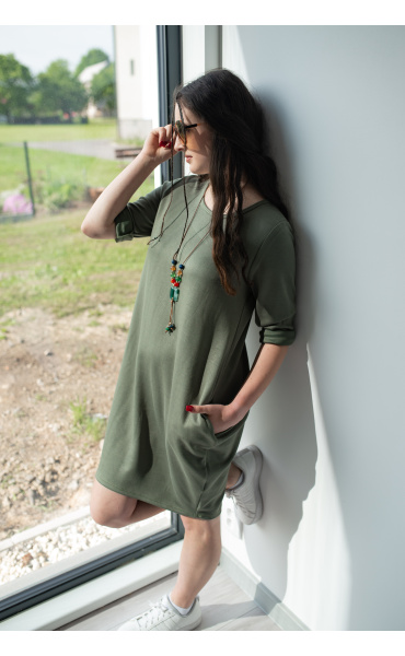 Šaty mají dlouhý rukáv, kulatý výstřih a po stranách všité kapsy.