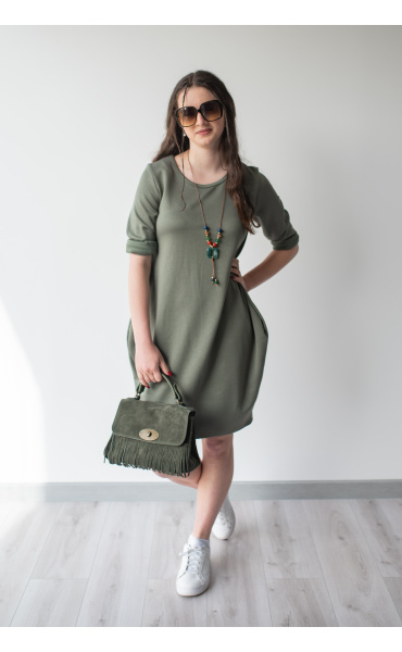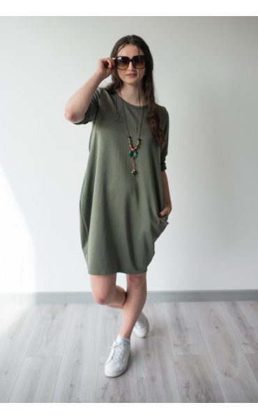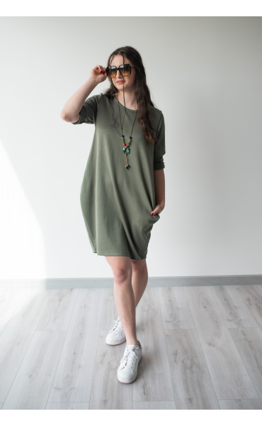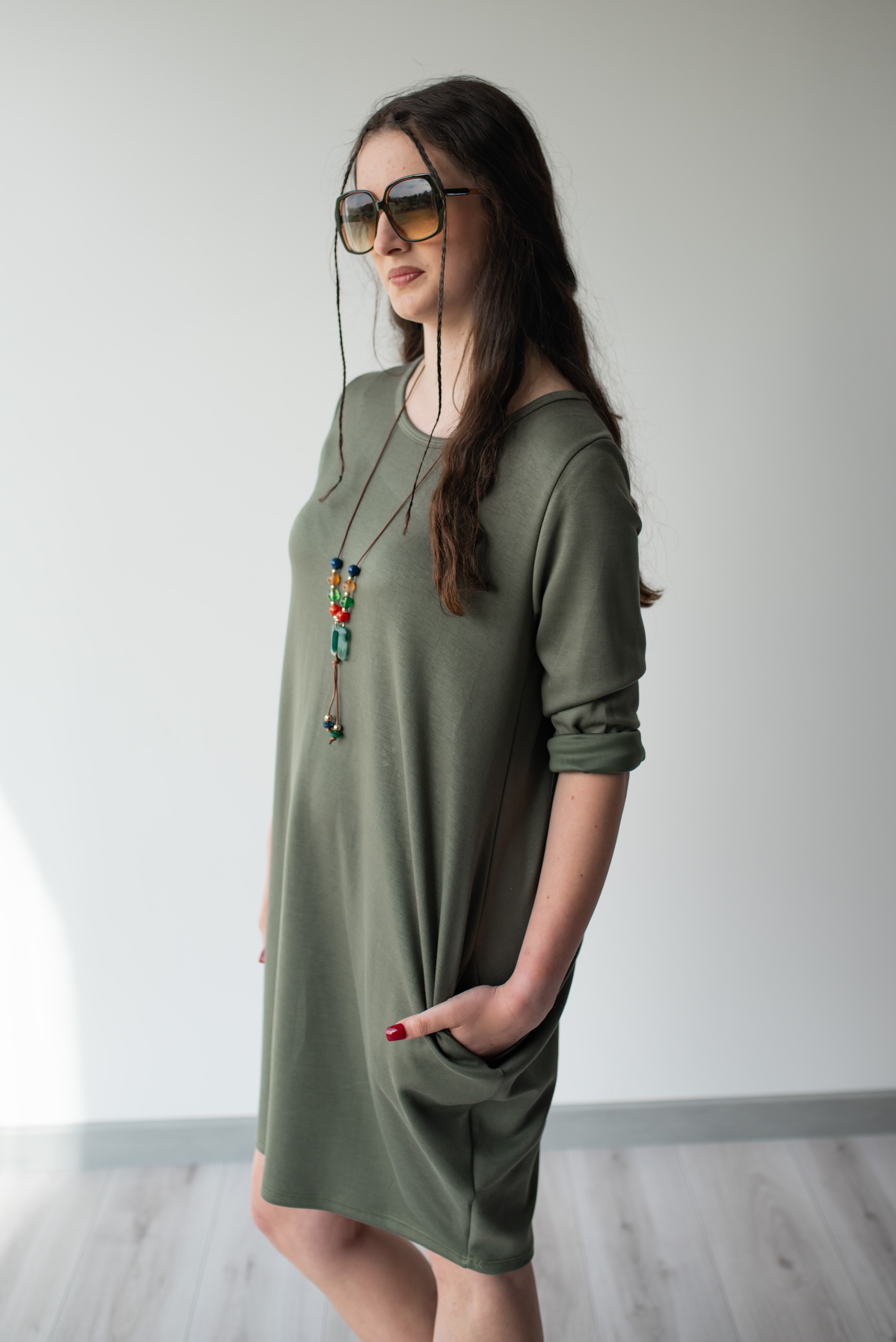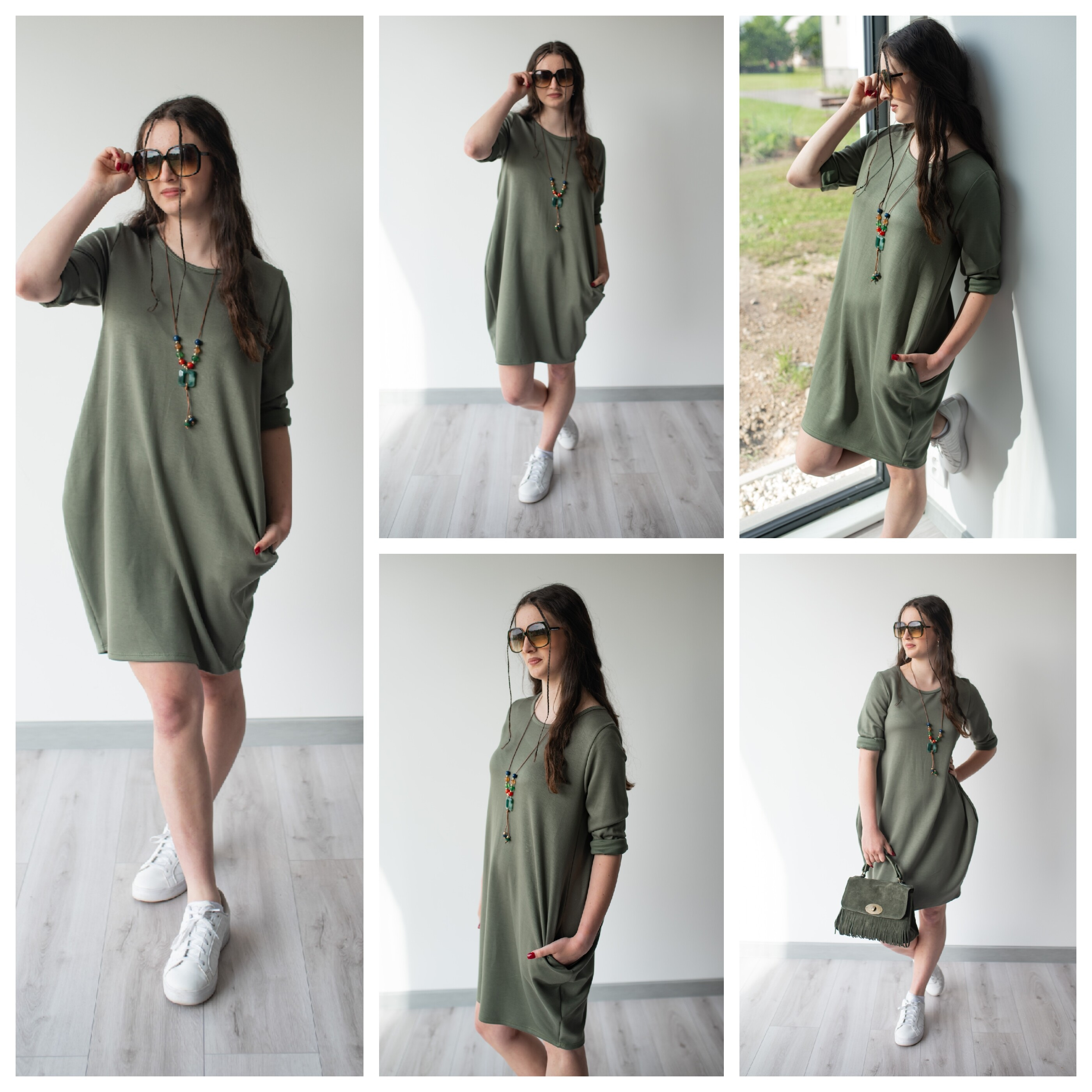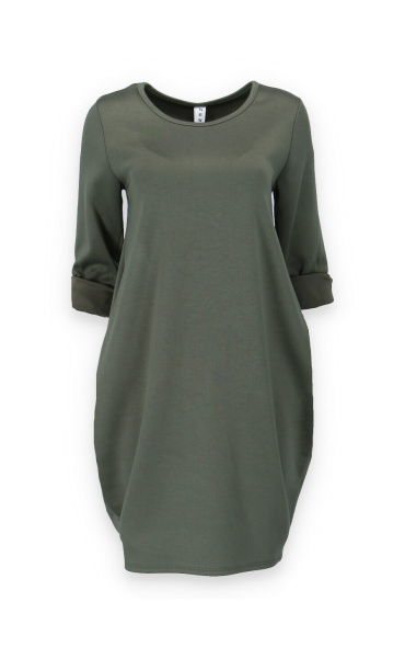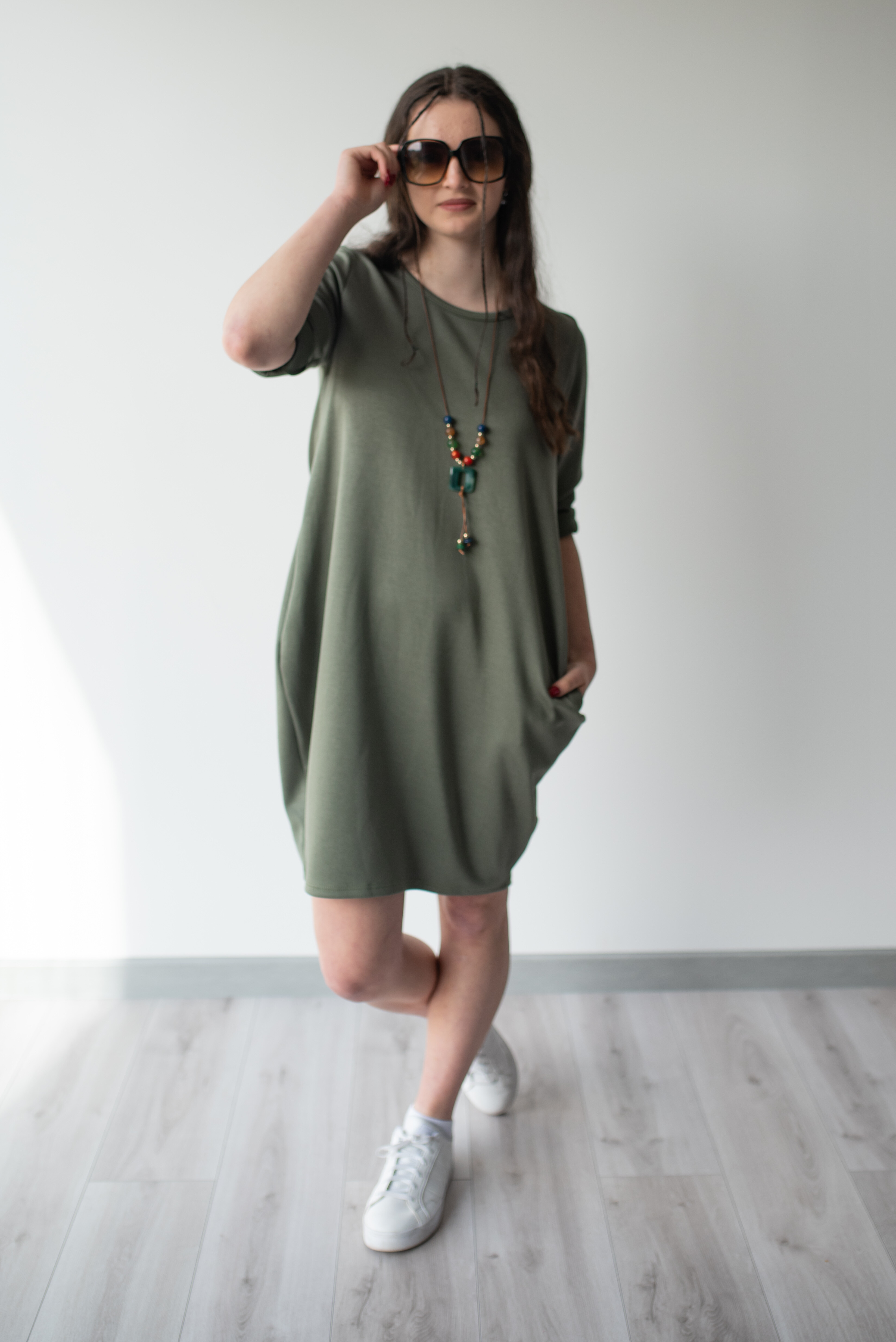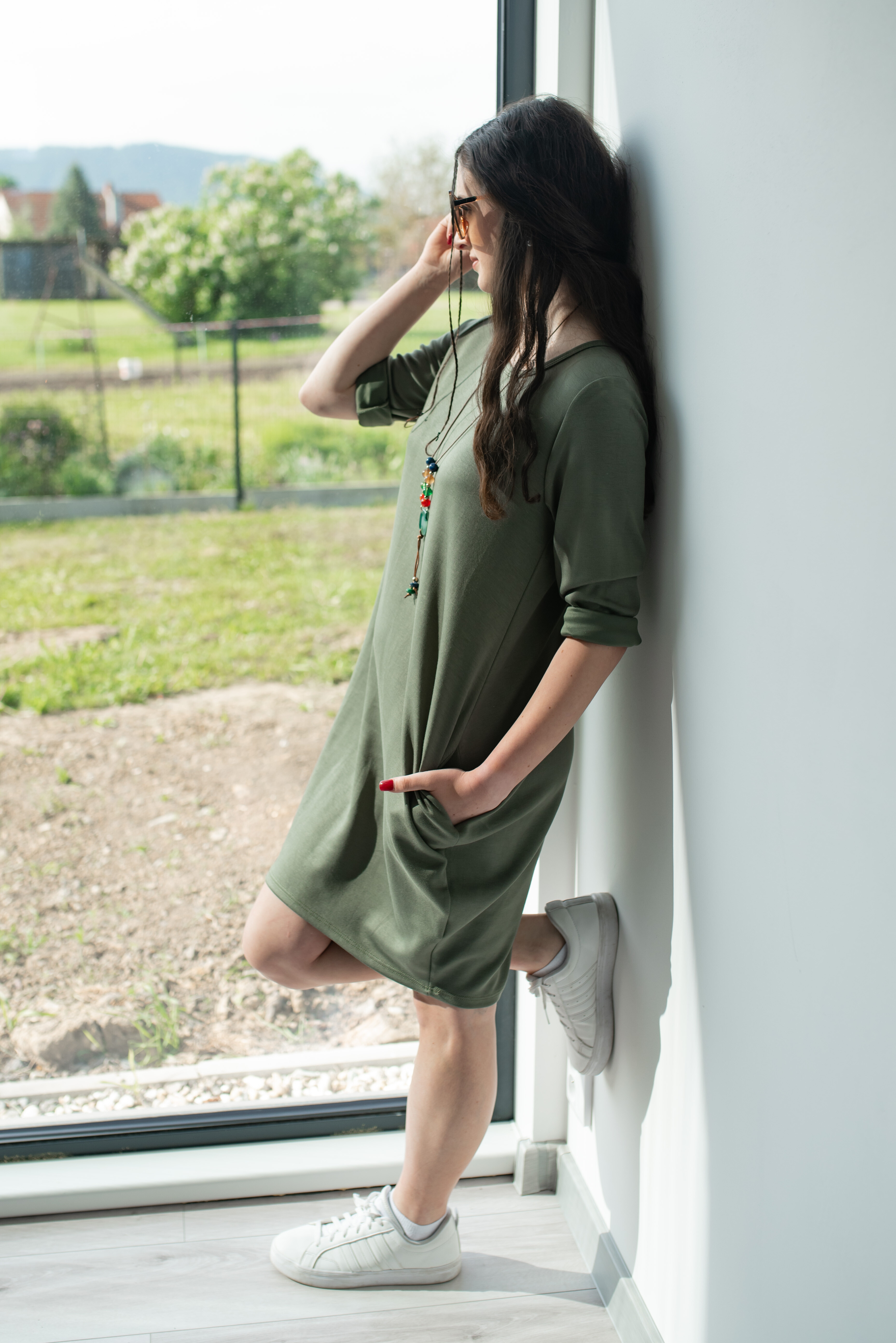 Šaty mají dlouhý rukáv, kulatý výstřih a po stranách všité kapsy.