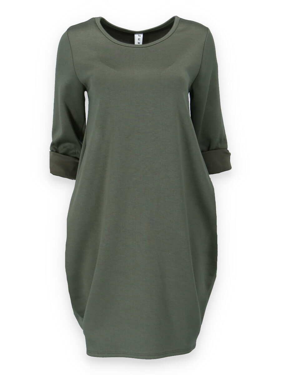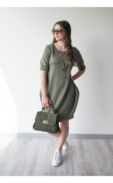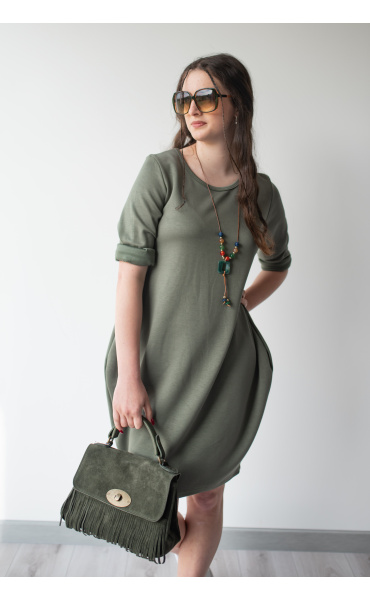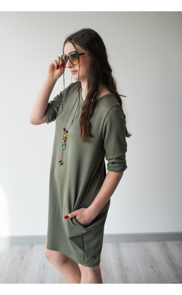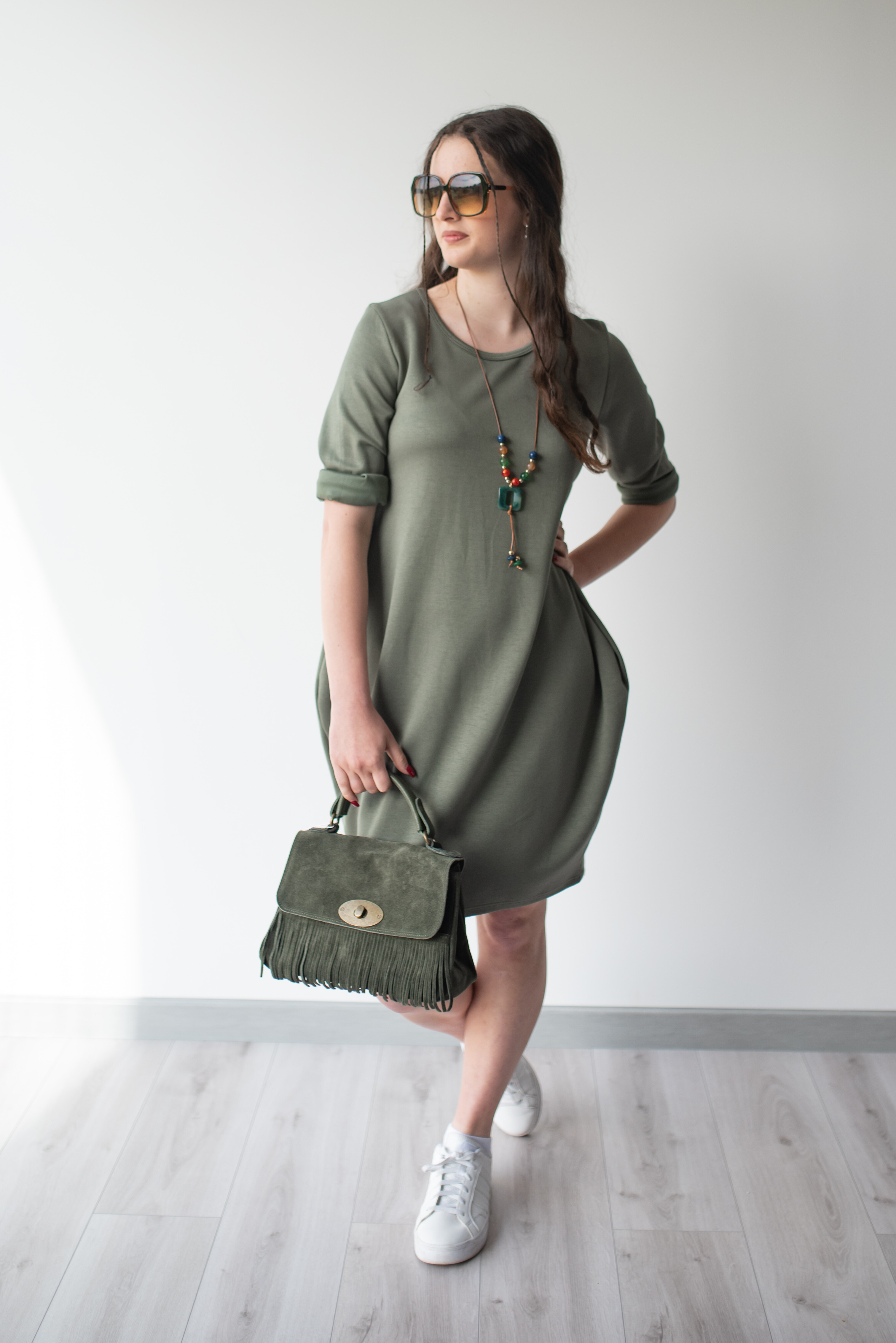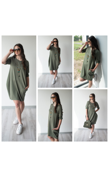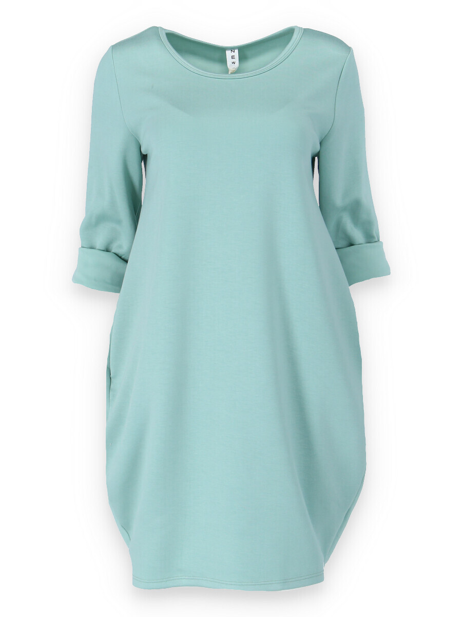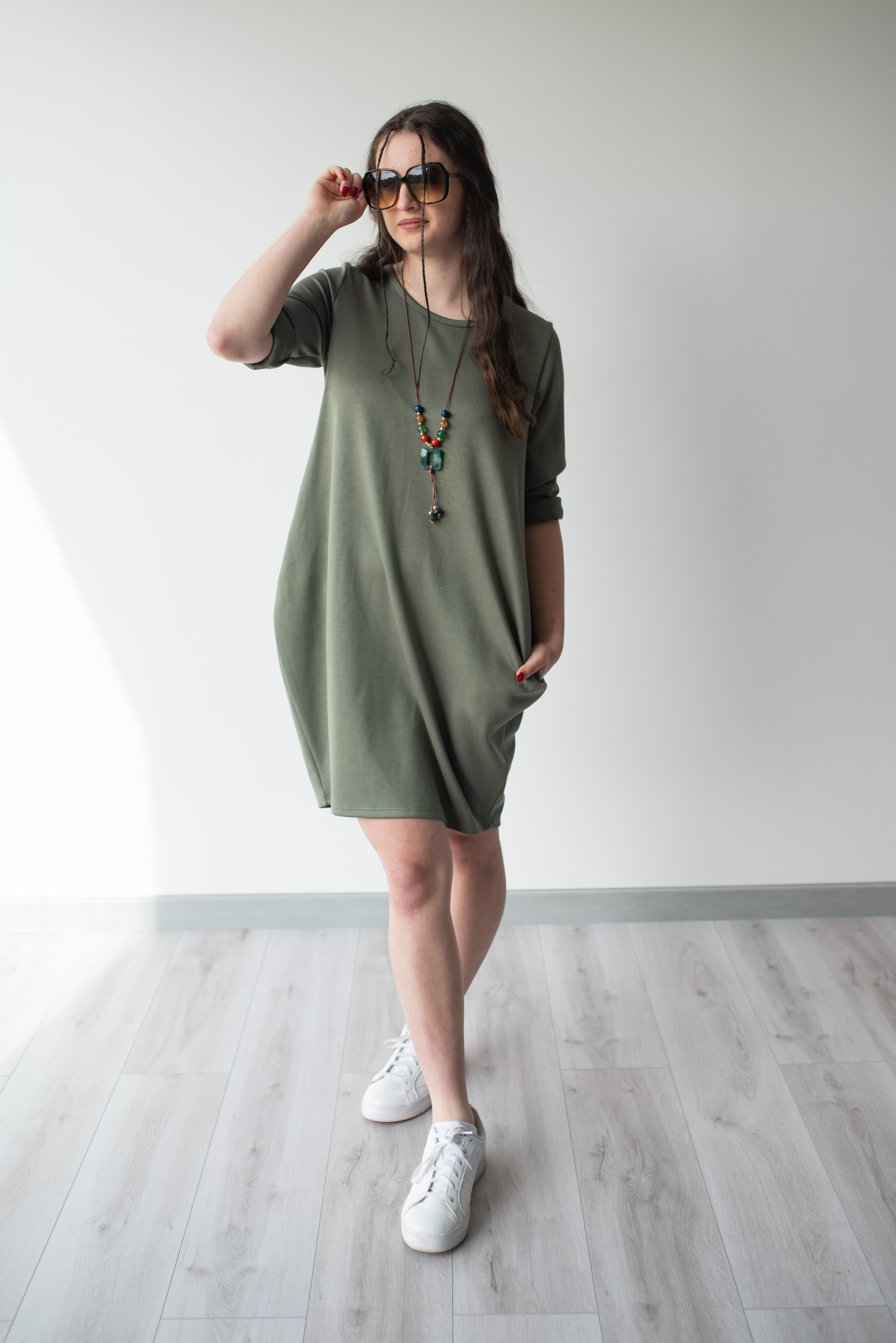 Šaty mají dlouhý rukáv, kulatý výstřih a po stranách všité kapsy.
