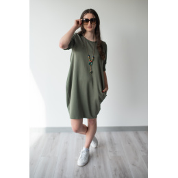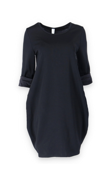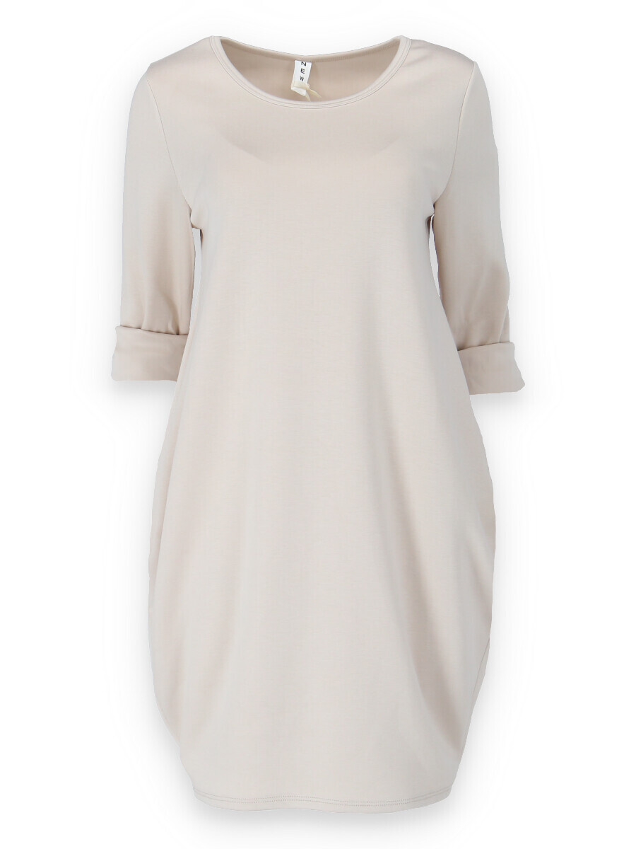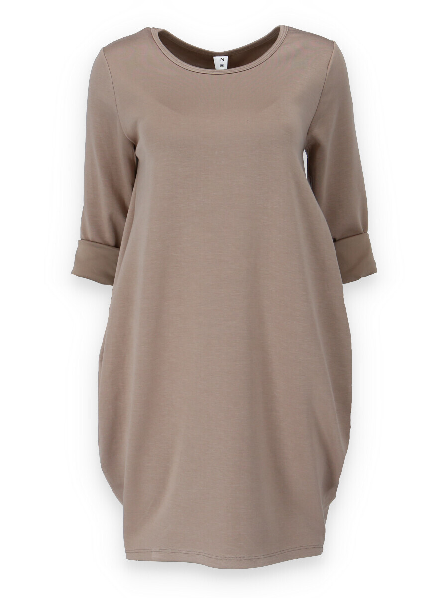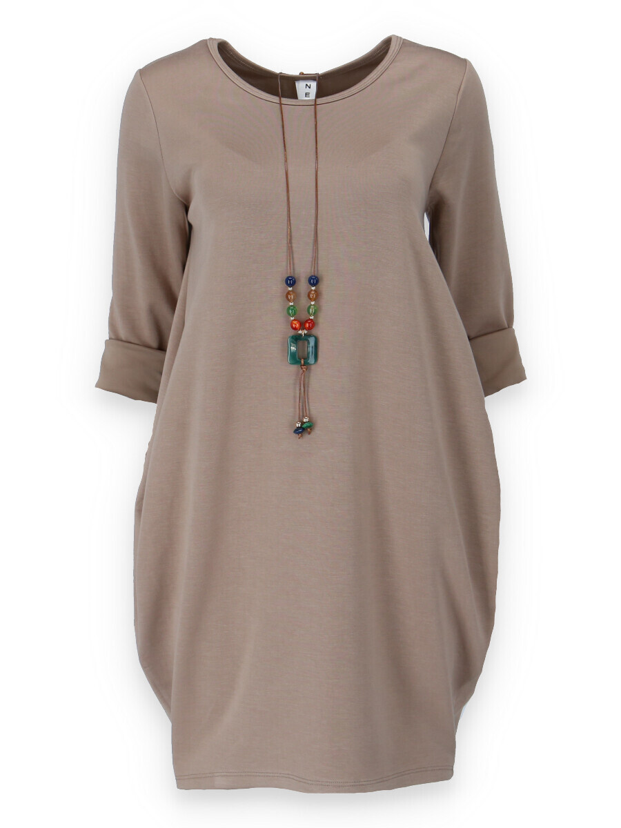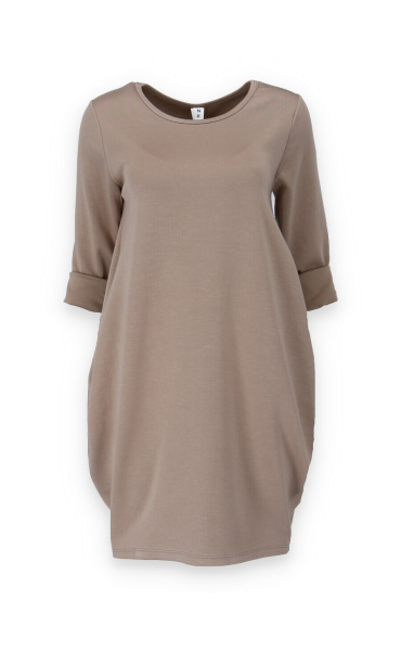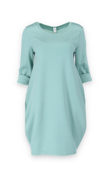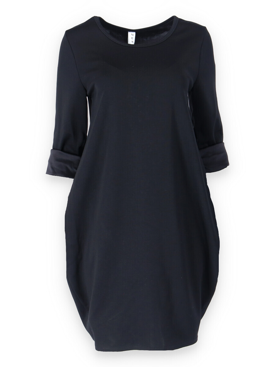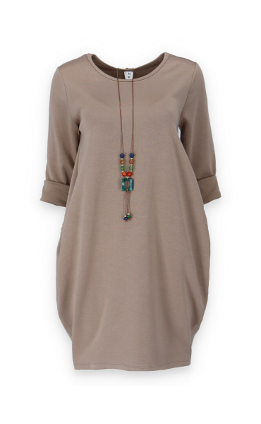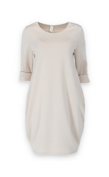 Šaty mají dlouhý rukáv, kulatý výstřih a po stranách všité kapsy.