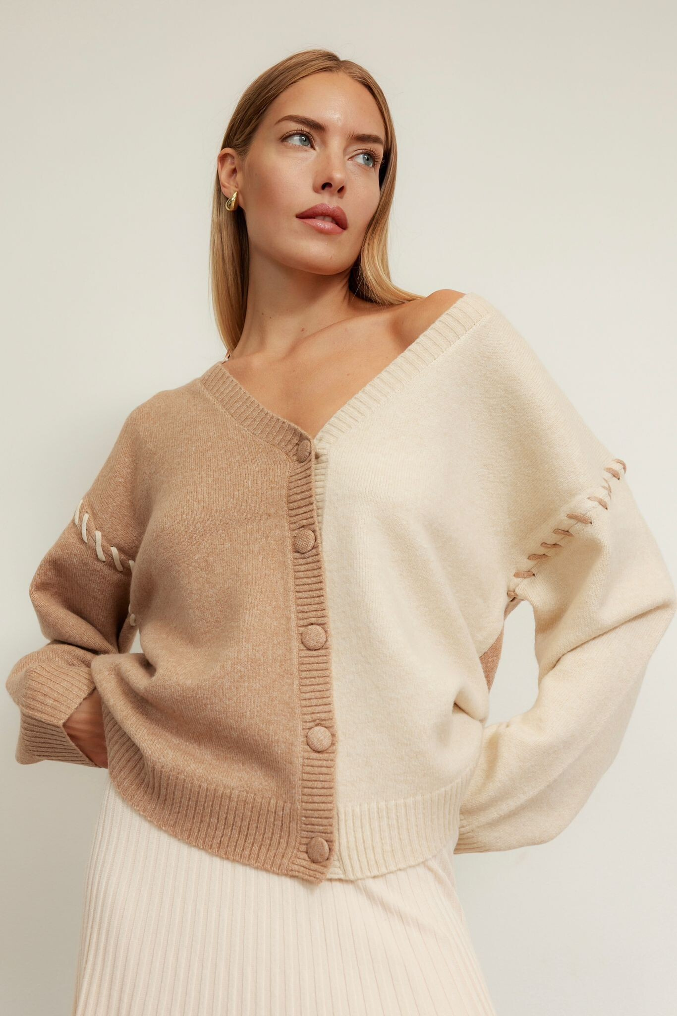 Elegantní vlněný svetřík s dlouhým rukávem a výstřihem do V. Svetr je krásně propracovaný, kombinovaný do dvou barev a je volnějšího střihu. Dovoz Itálie