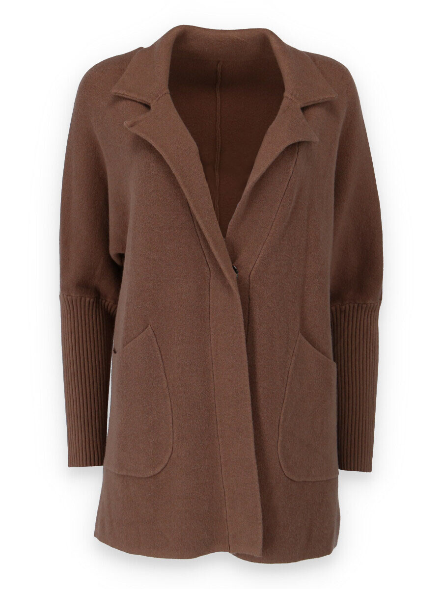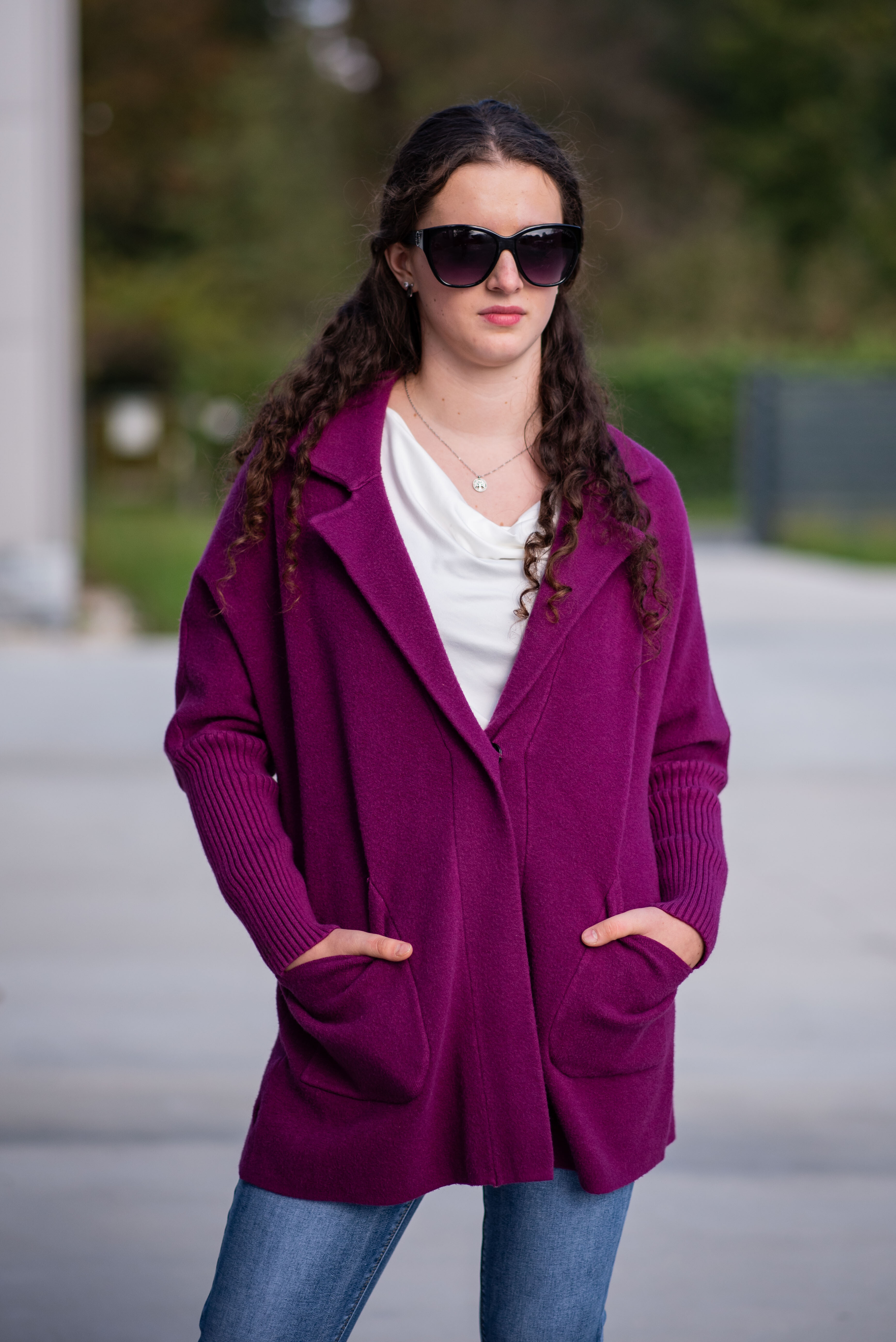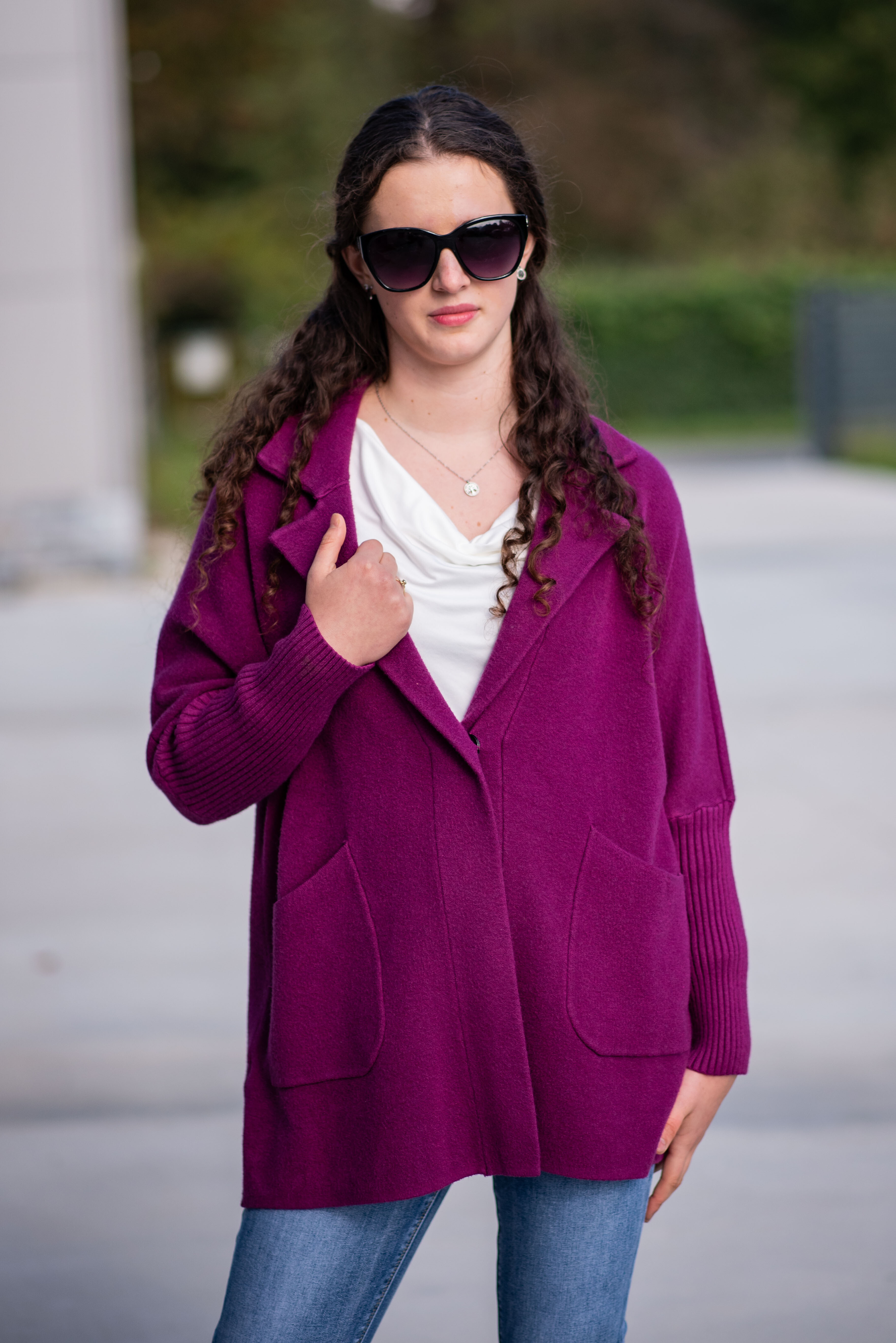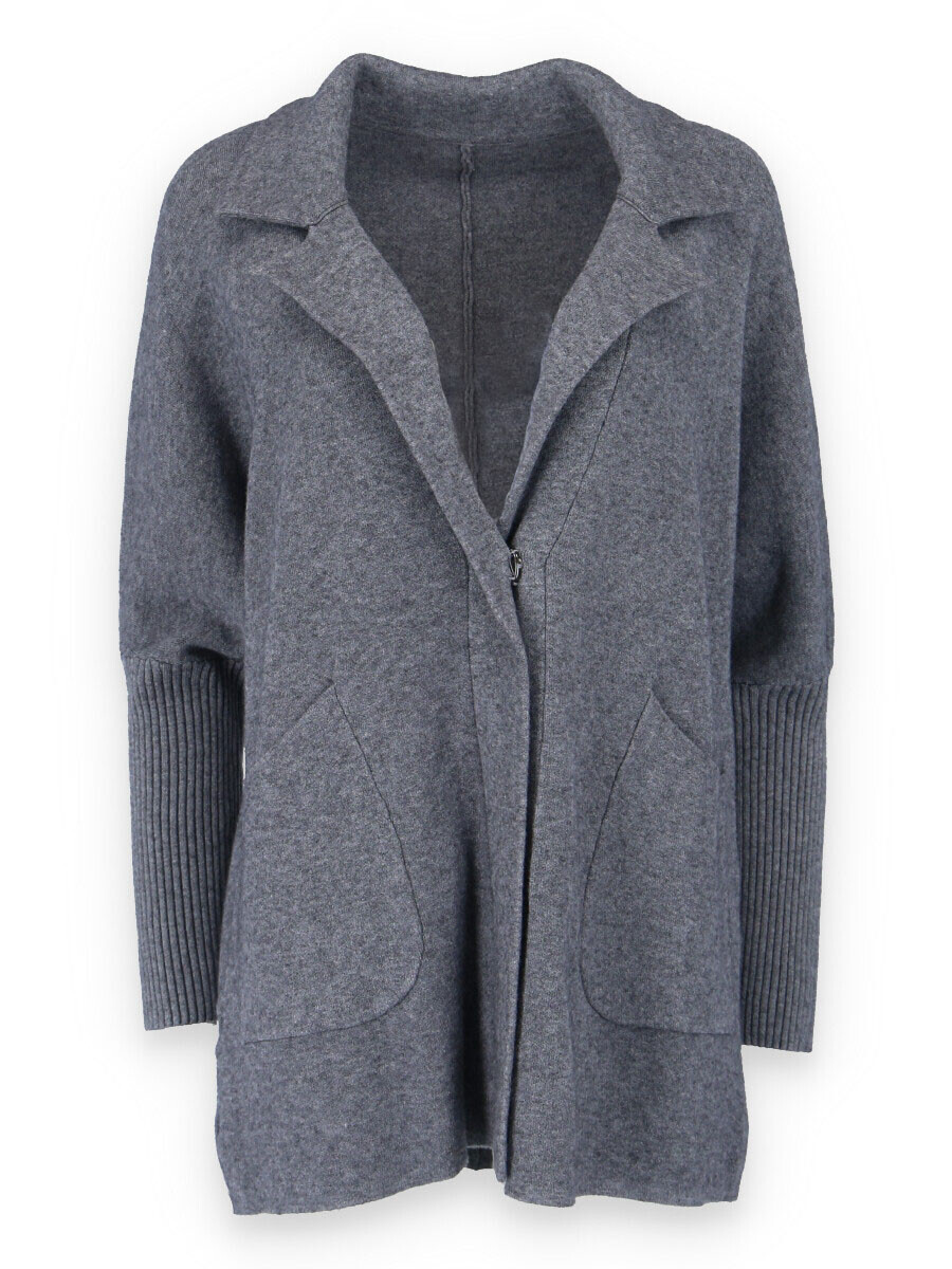 Úpletové sako/kabátek oversize střihu, sako má dlouhý rukáv, poslední 1/3 rukávu z úzkého úpletu, na přední části našité kapsy a zapínání na knoflík/druk, dovoz Itálie