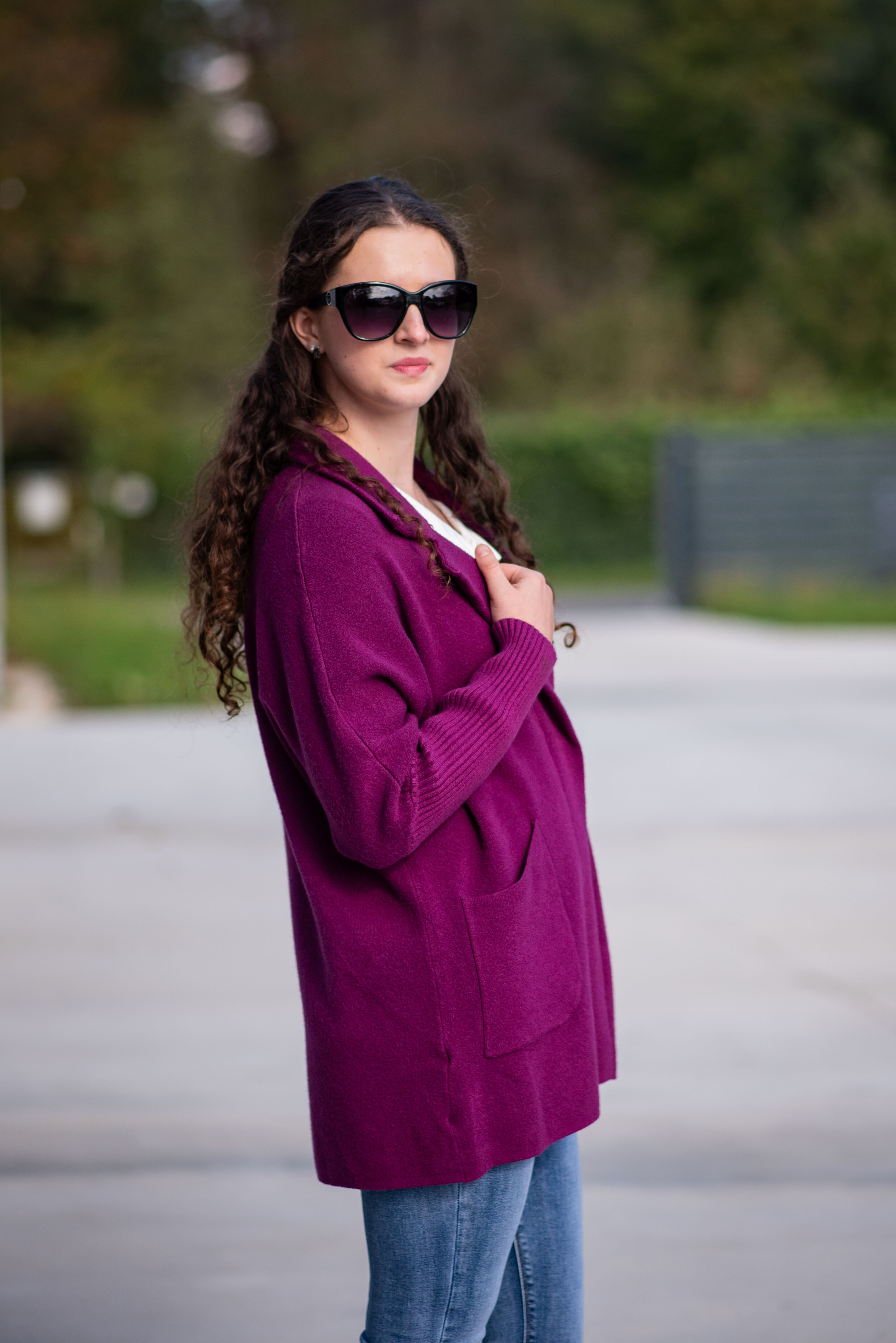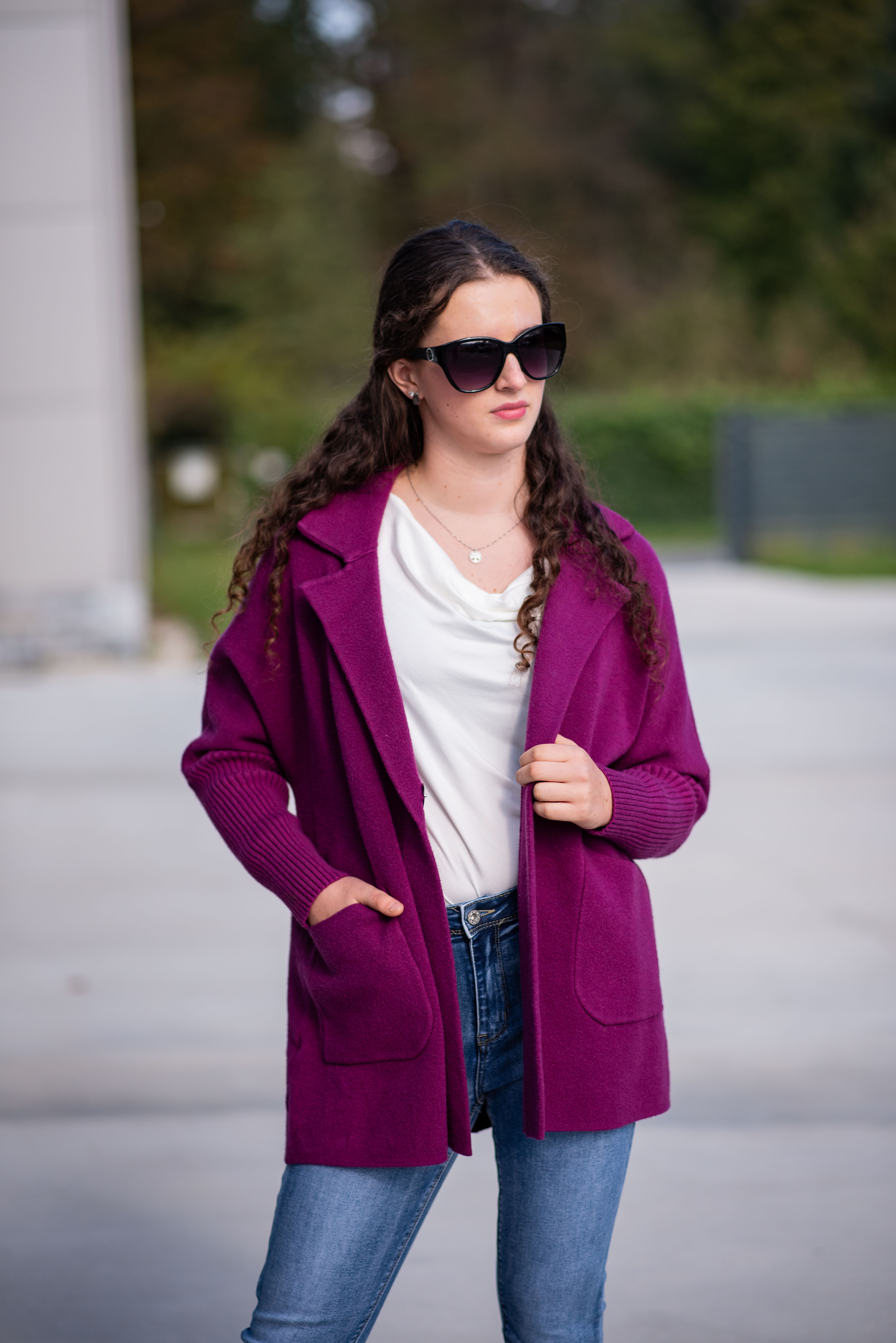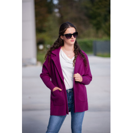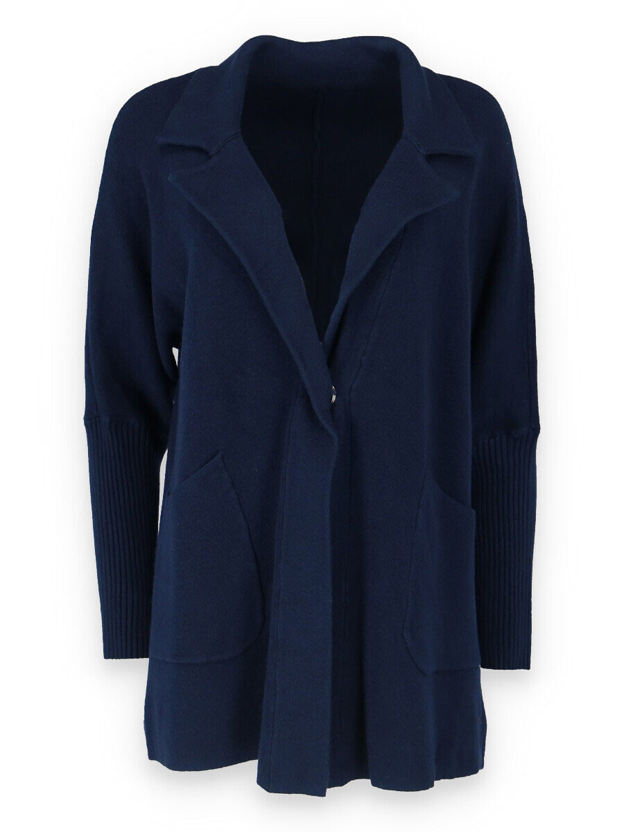 Úpletové sako/kabátek oversize střihu, sako má dlouhý rukáv, poslední 1/3 rukávu z úzkého úpletu, na přední části našité kapsy a zapínání na knoflík/druk, dovoz Itálie