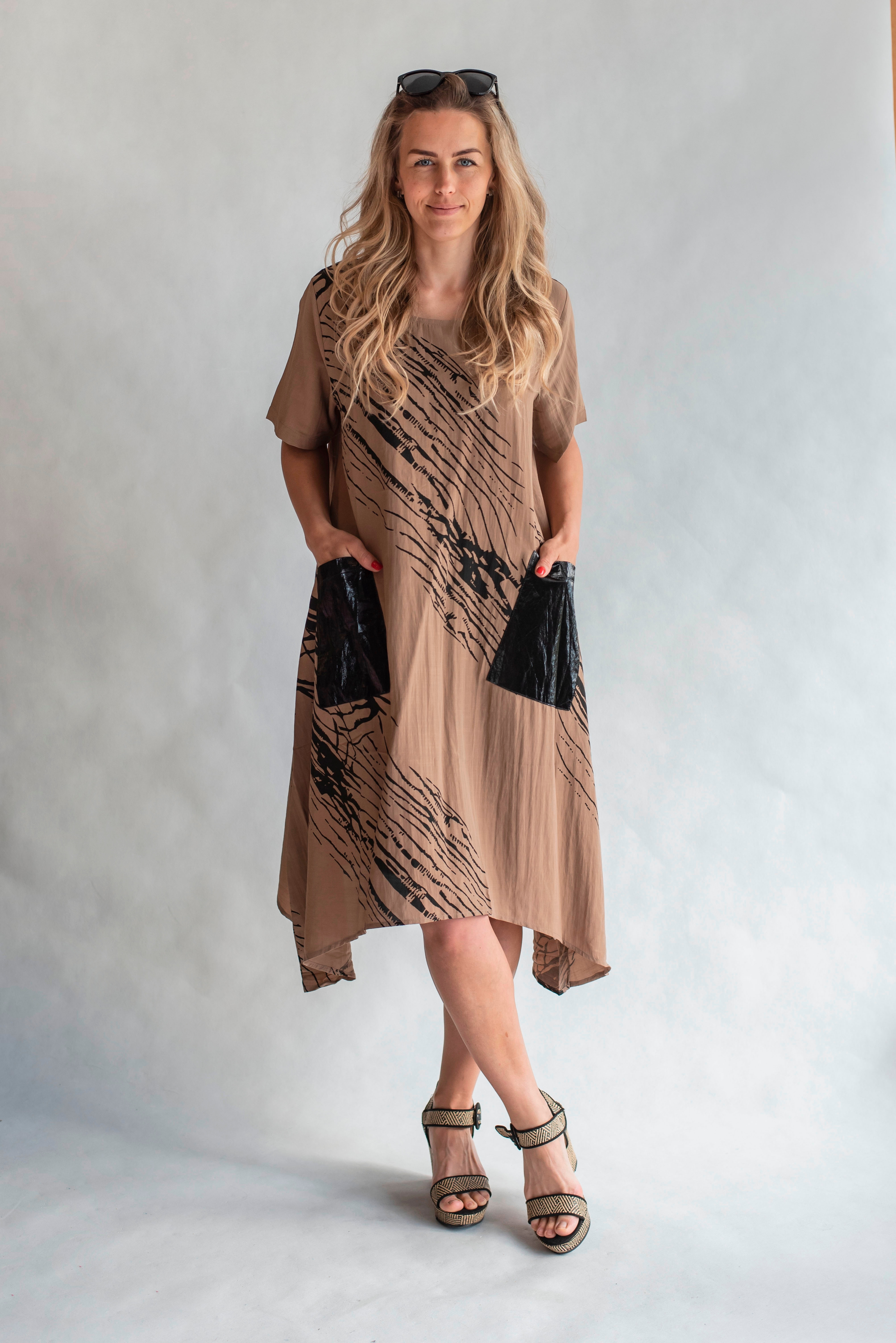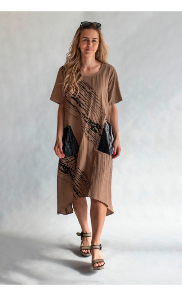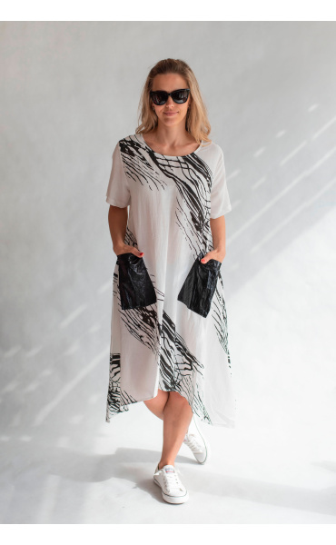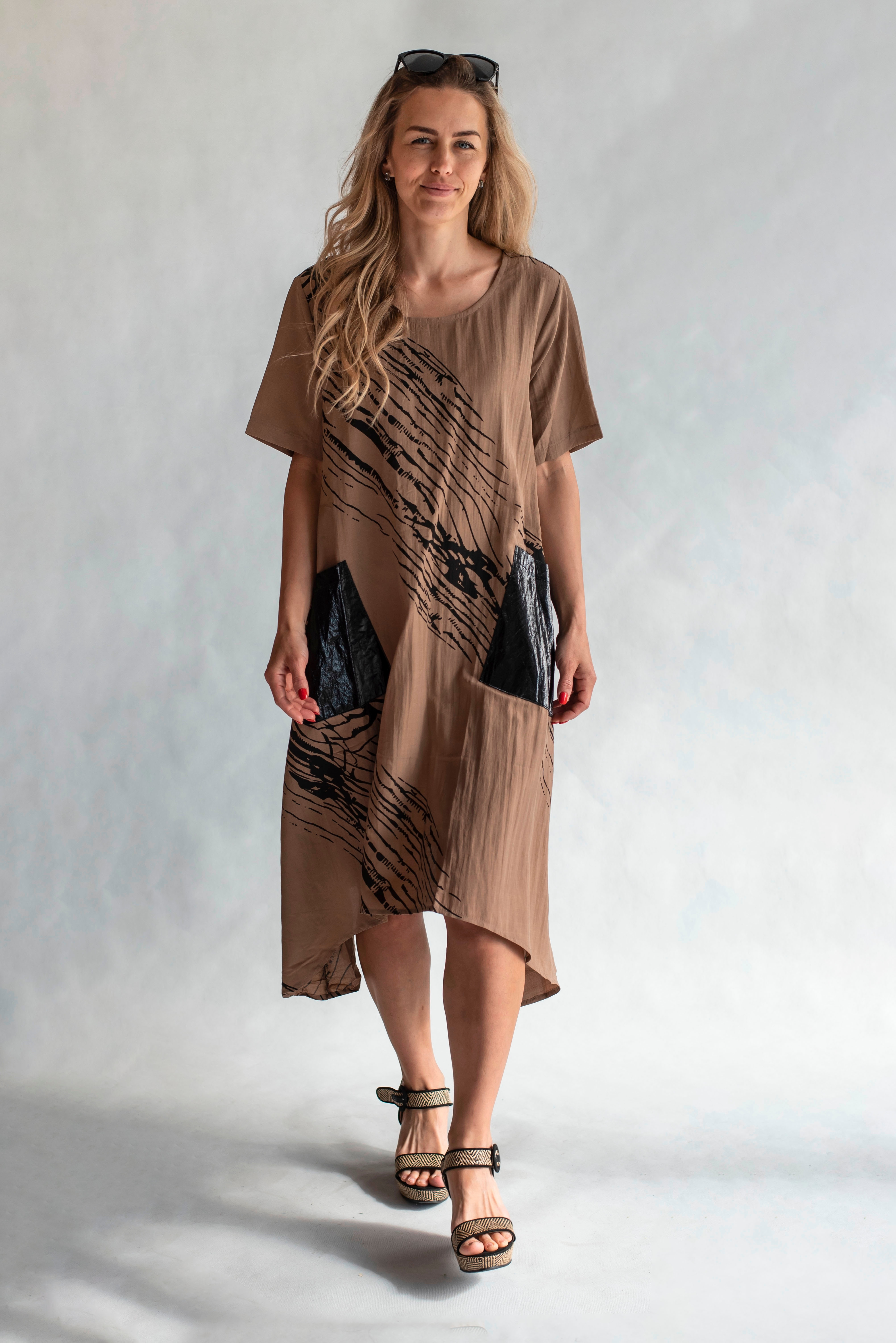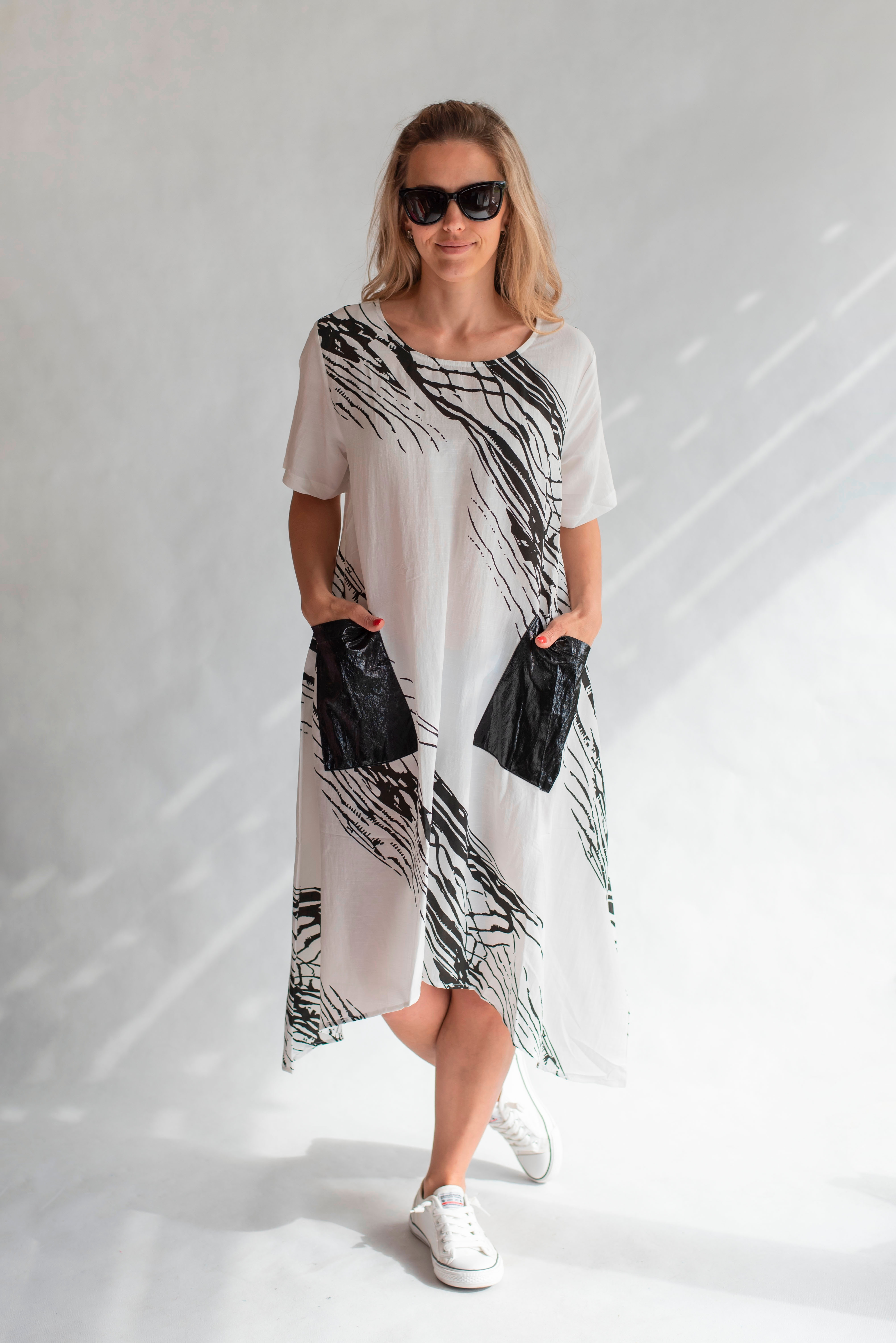 Trendy šatovka do cípu s krátkým rukávem, jednoduchým potiskem, kulatý výstřih a našitými kapsami.