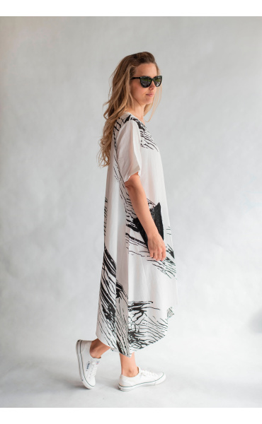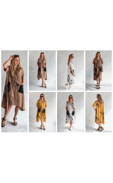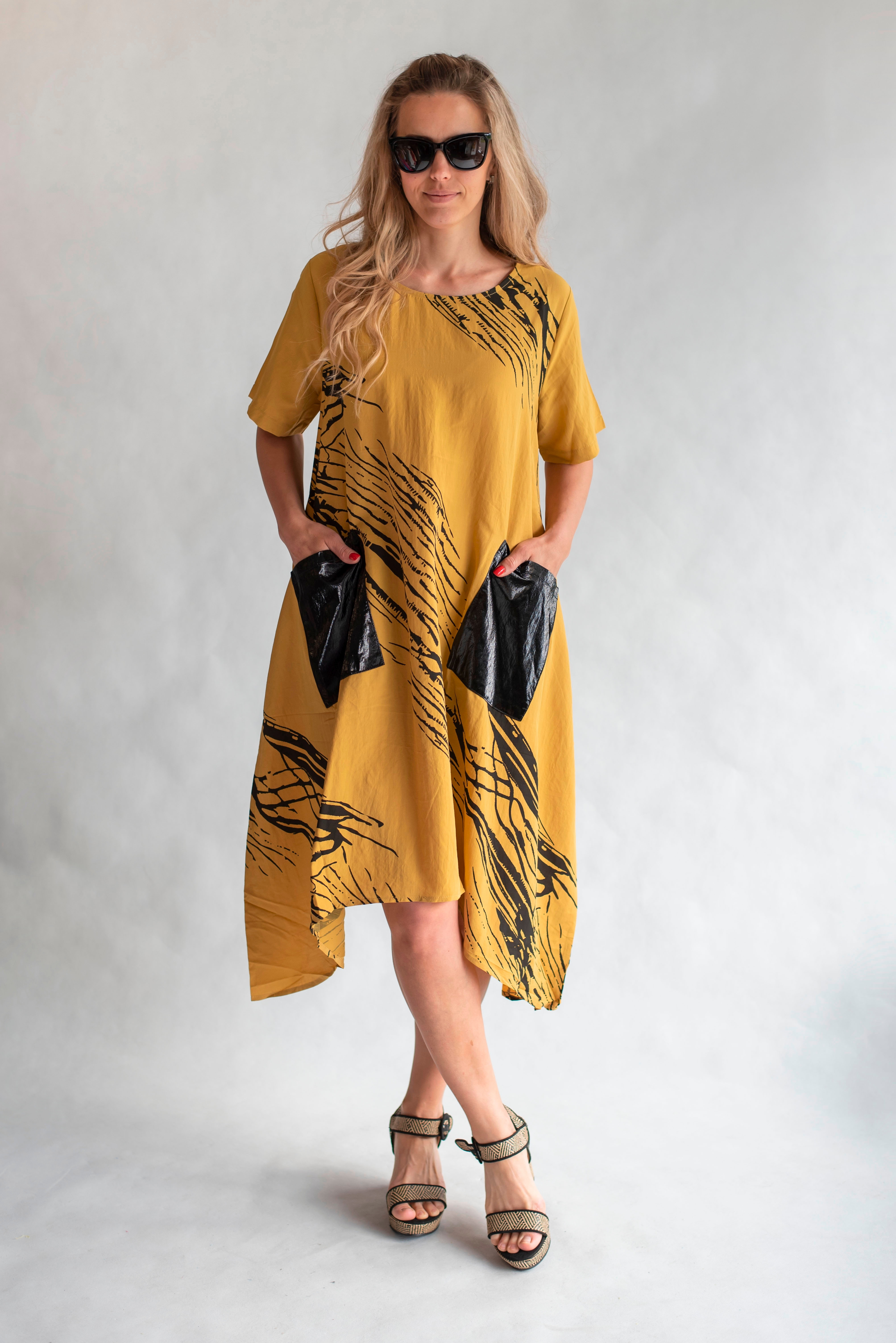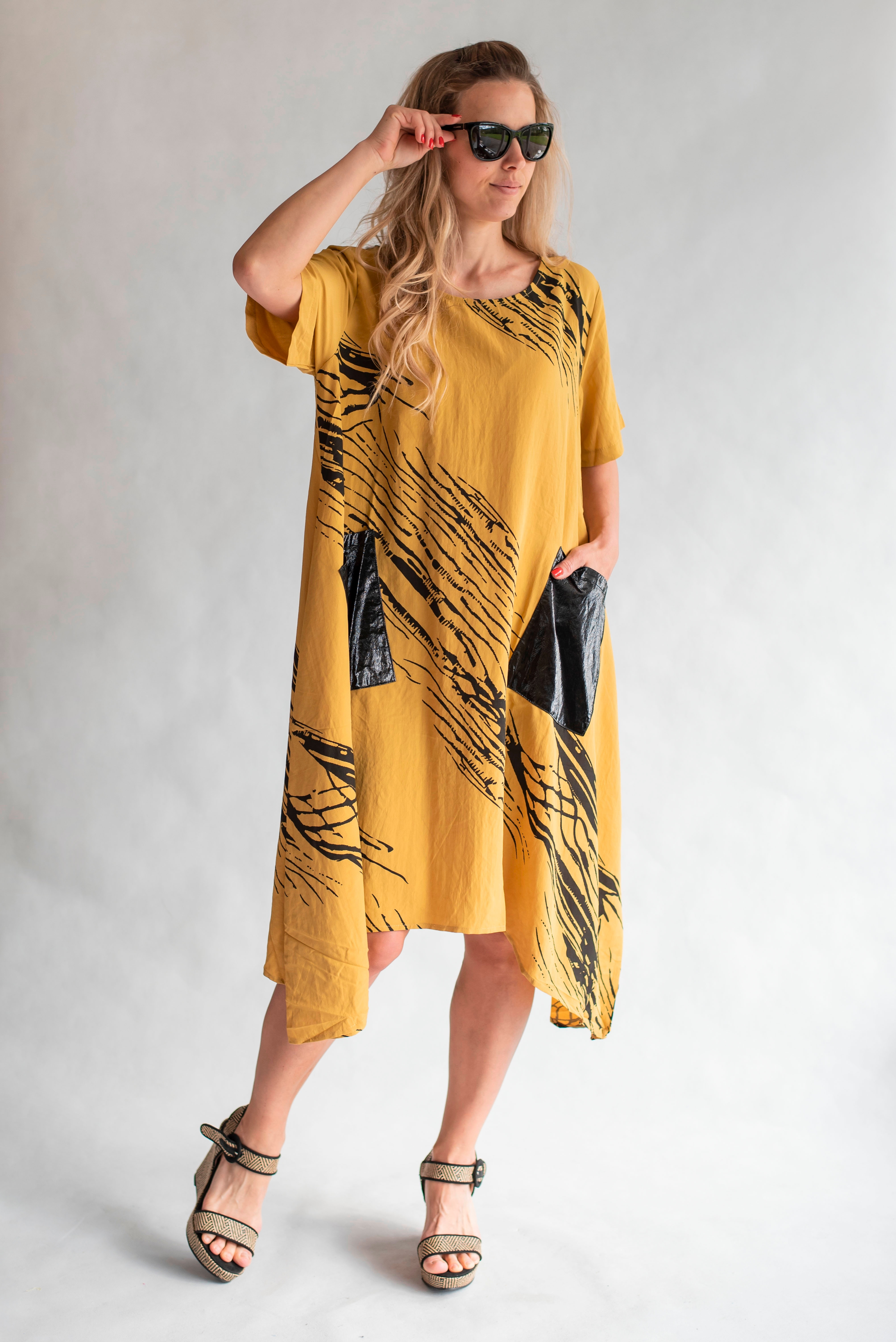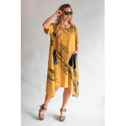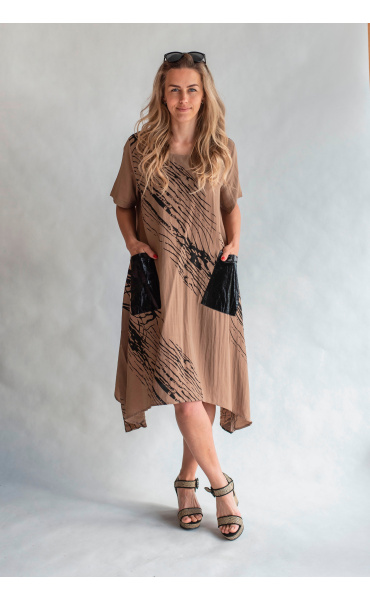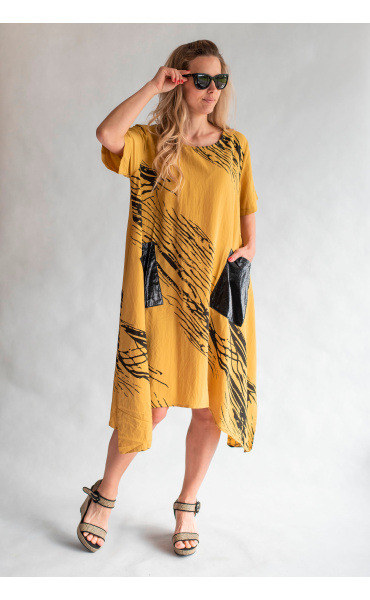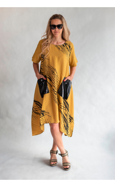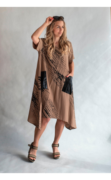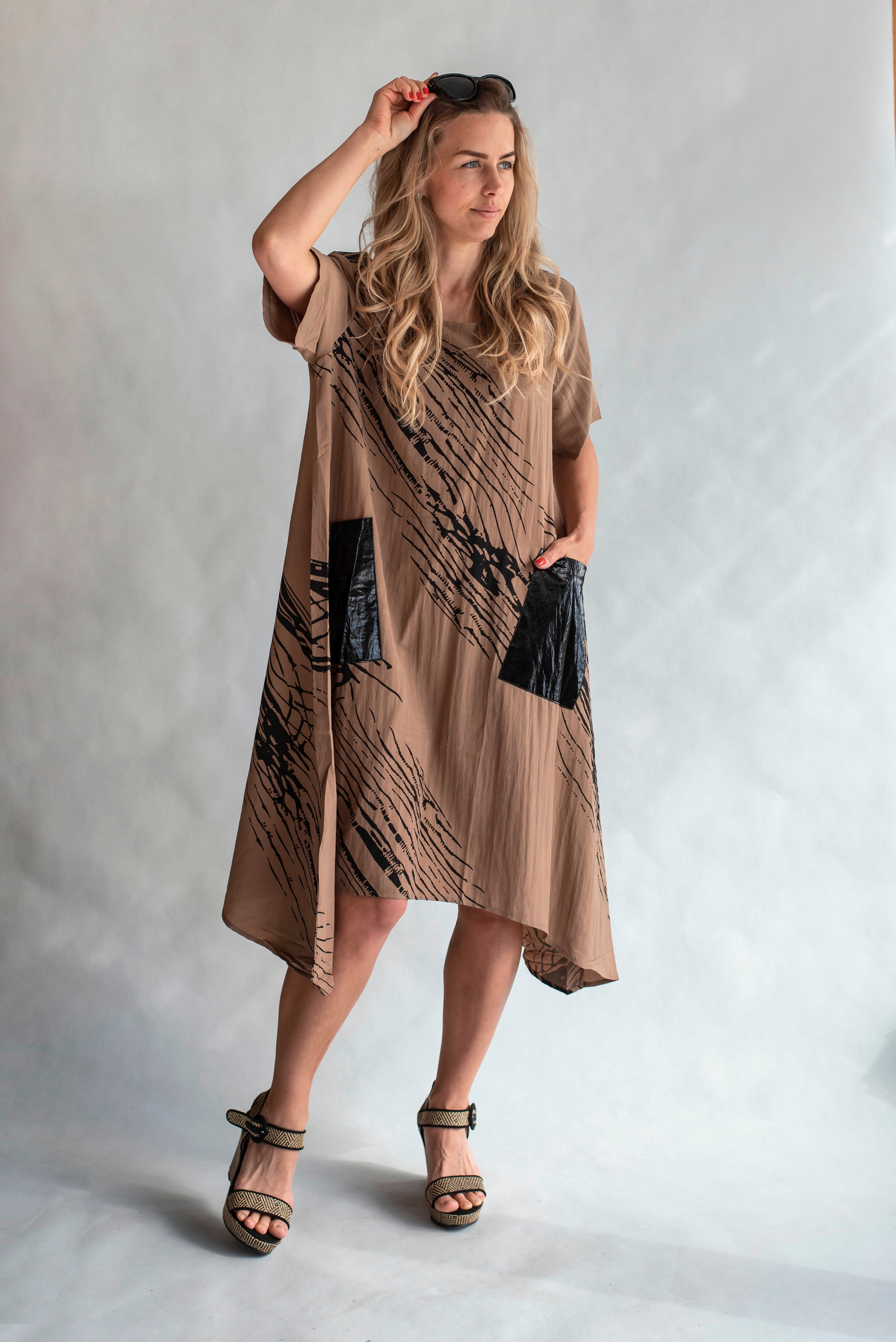 Trendy šatovka do cípu s krátkým rukávem, jednoduchým potiskem, kulatý výstřih a našitými kapsami.