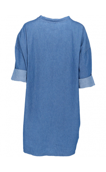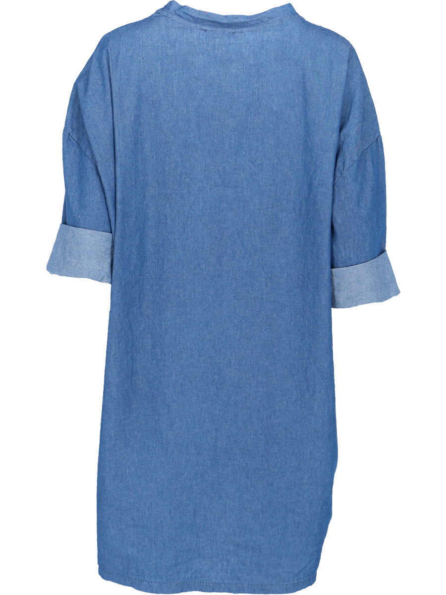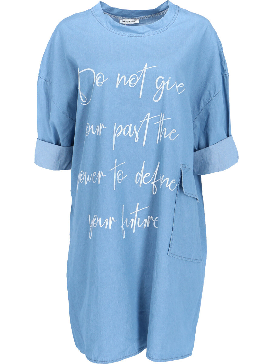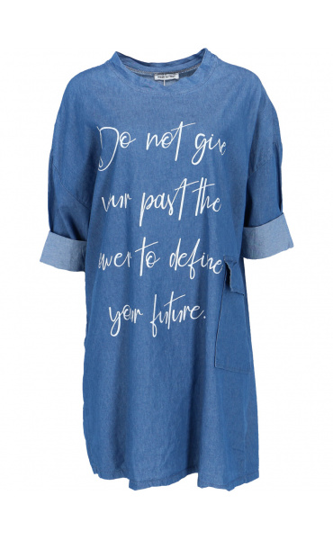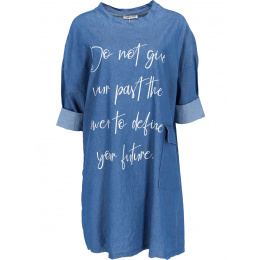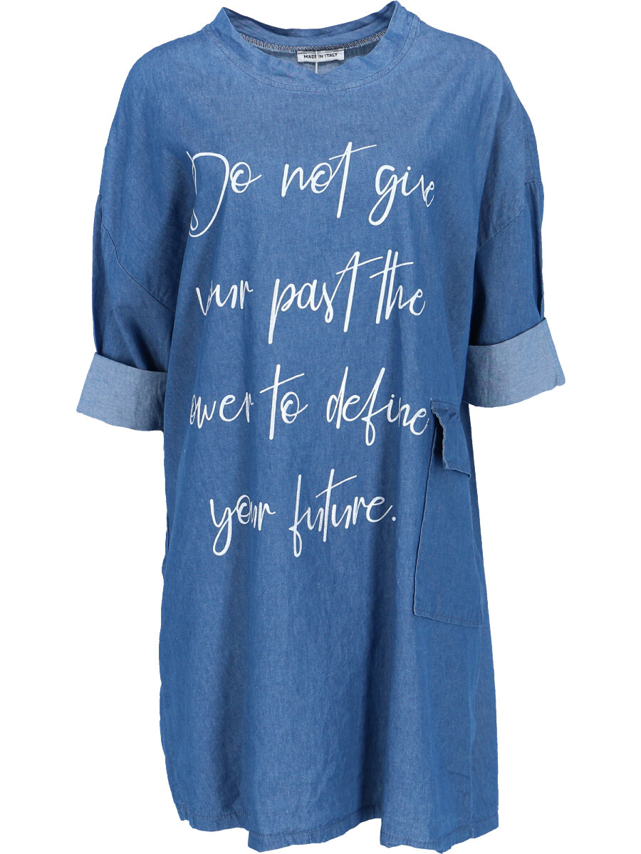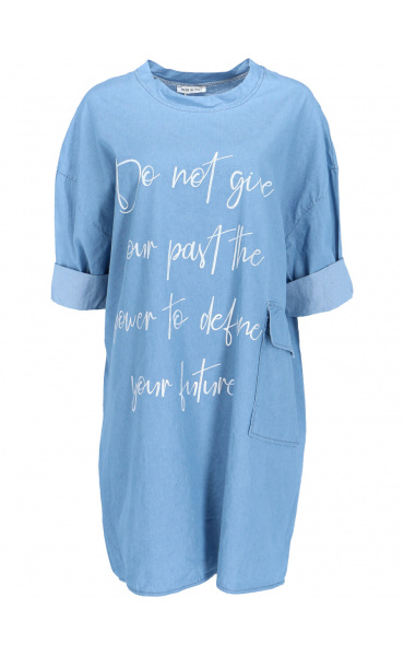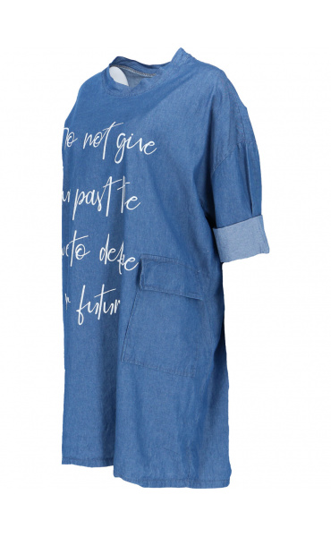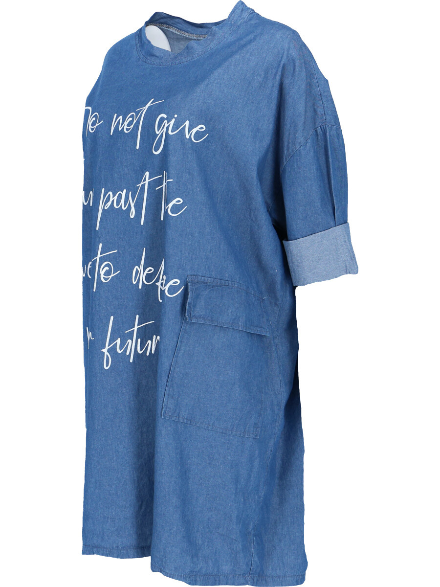 Dámská, jeansová, bavlněná volnočasová šatovka - doplněná o stylové kapsy v bocích a decentní plastický potisk.