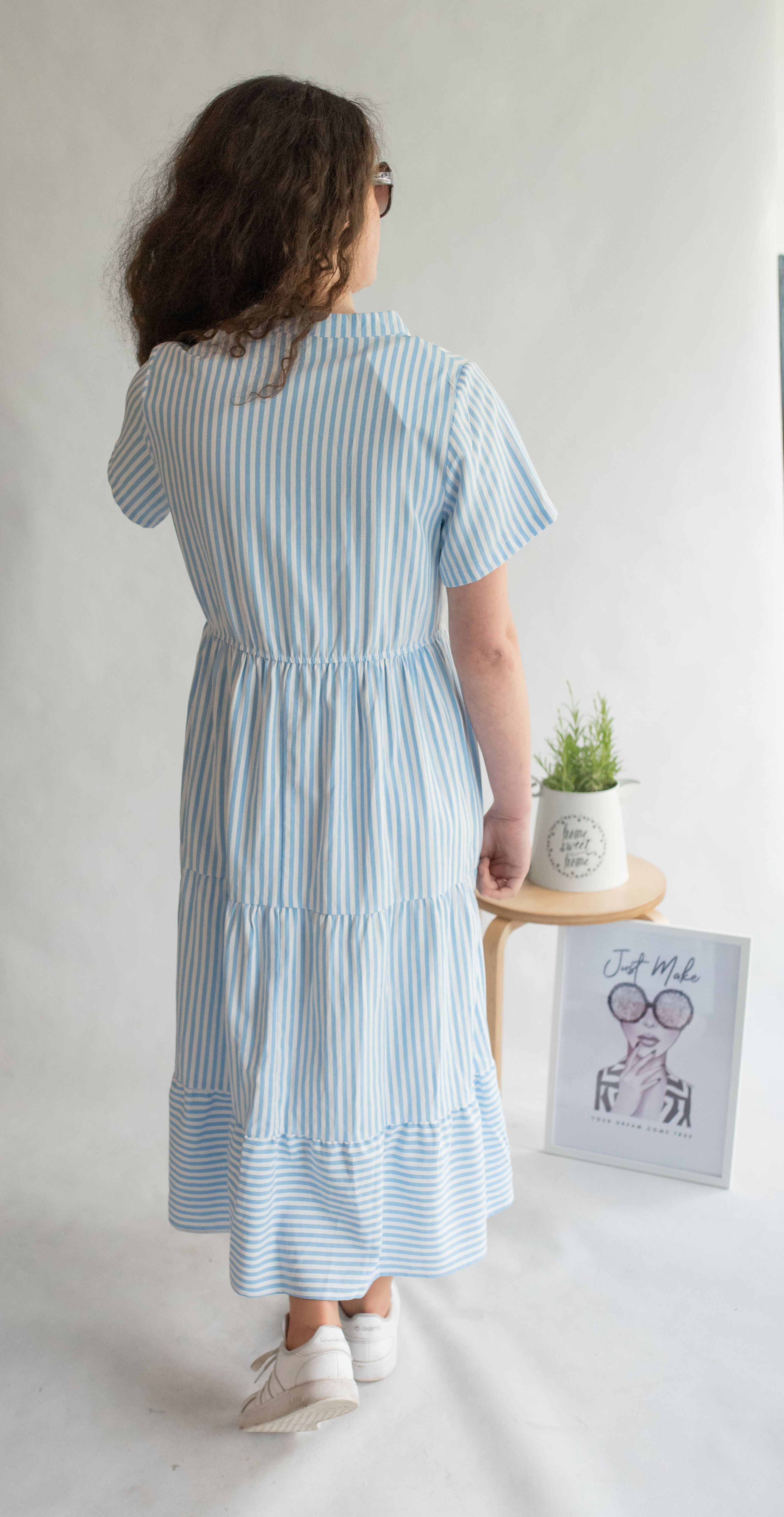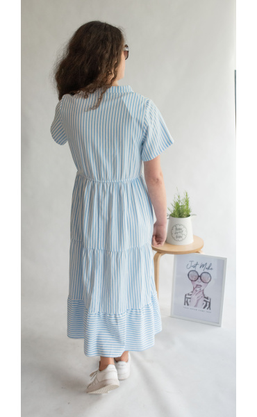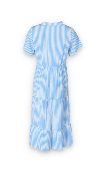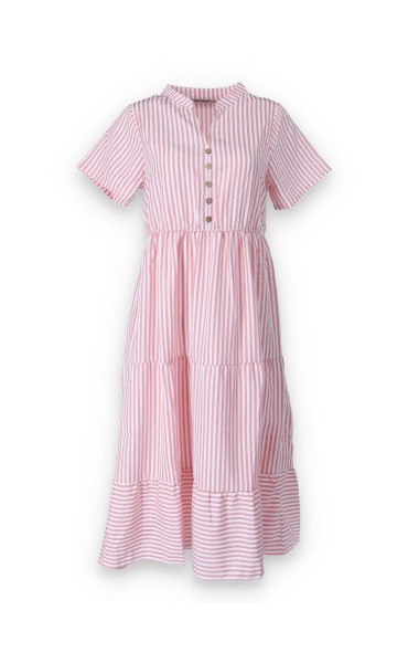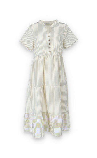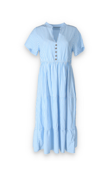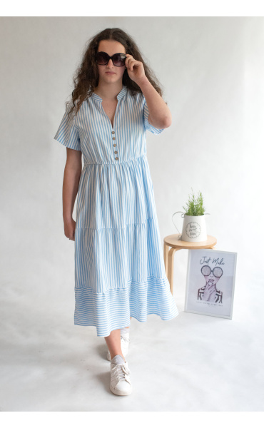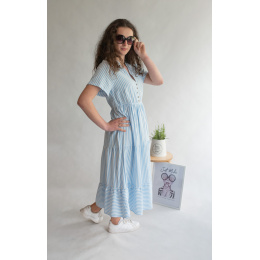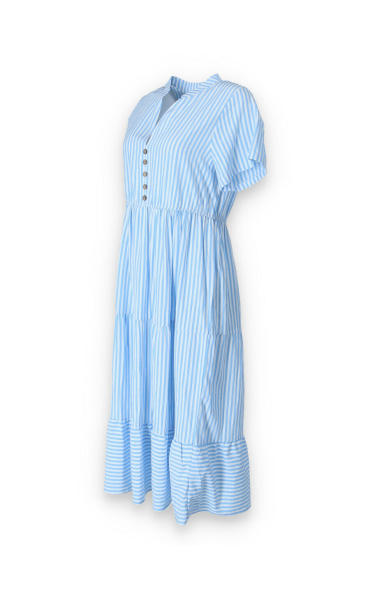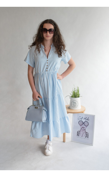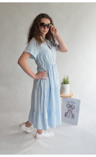 Letní pruhované šaty s krátkým rukávem, na přední straně doplněno o knoflíky v oblasti hrudníku. Šaty jsou volánové a v pase na gumu.