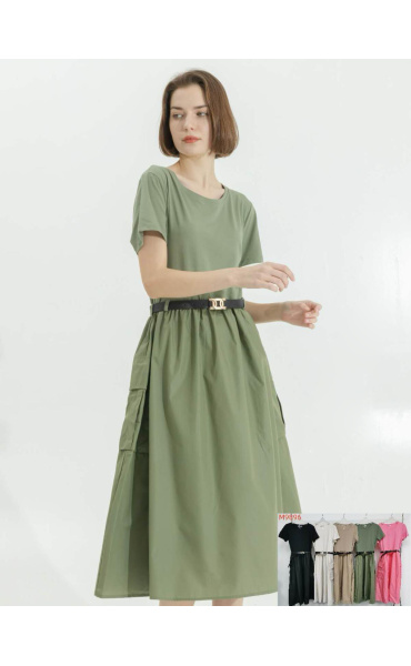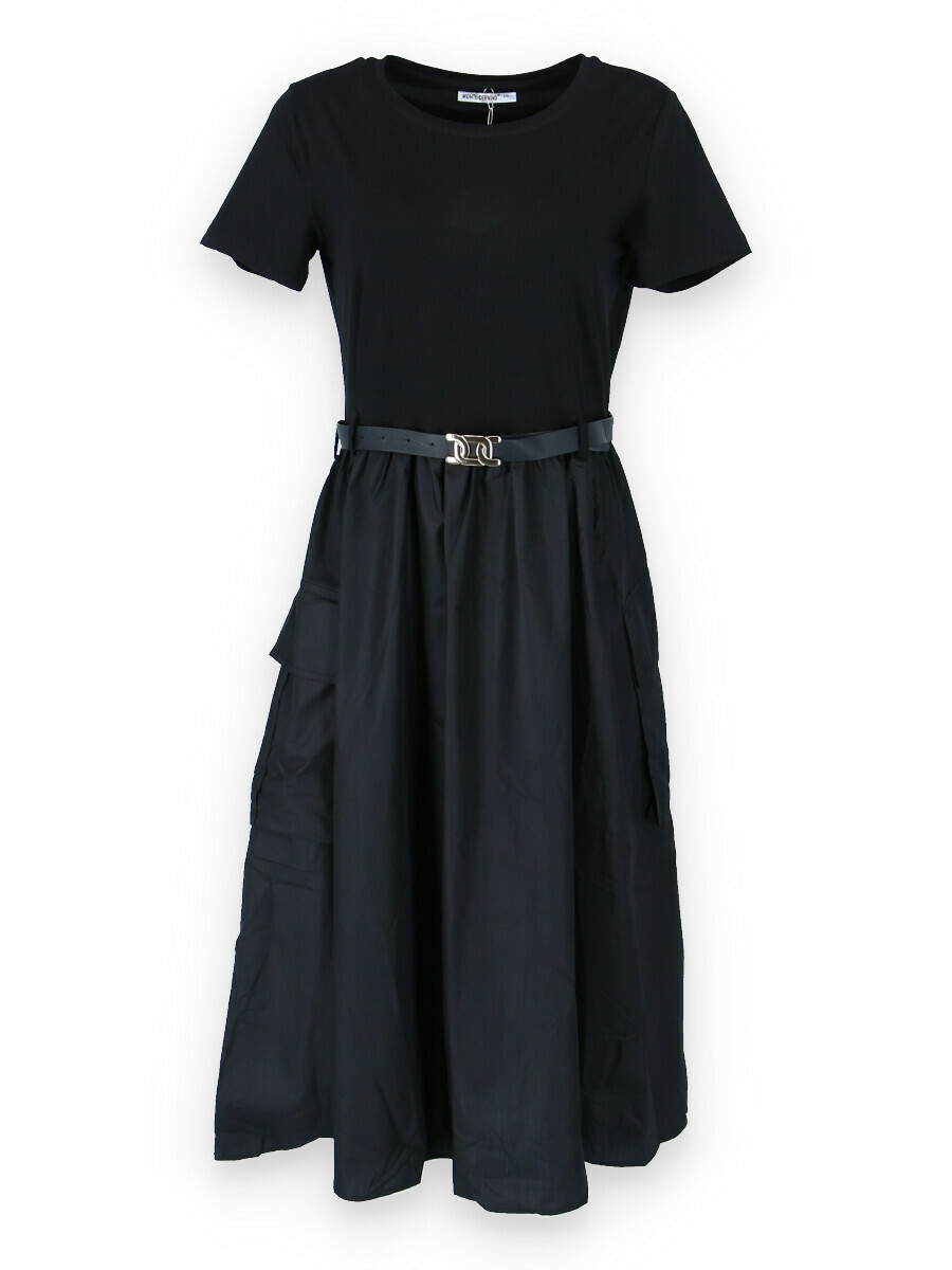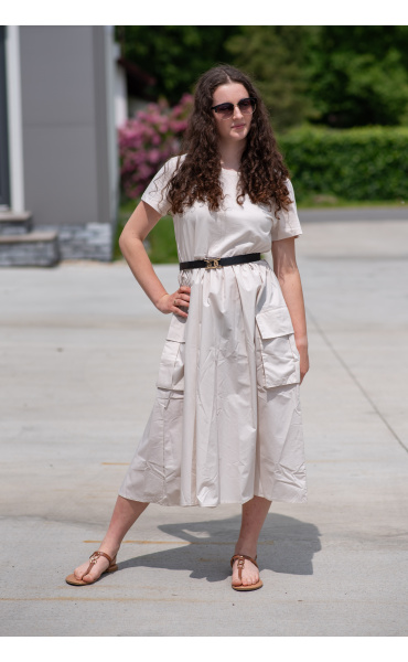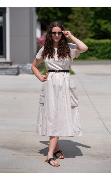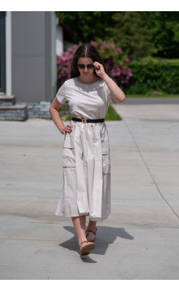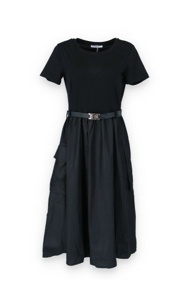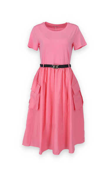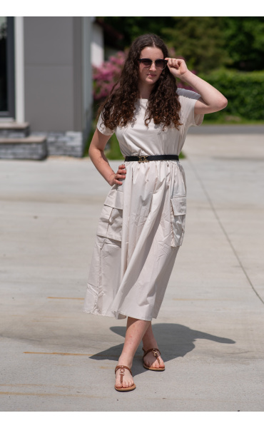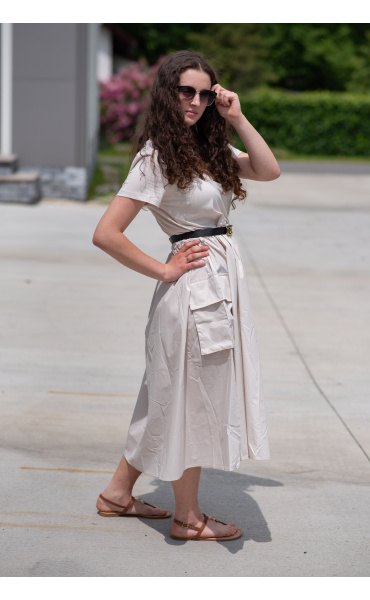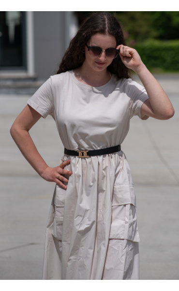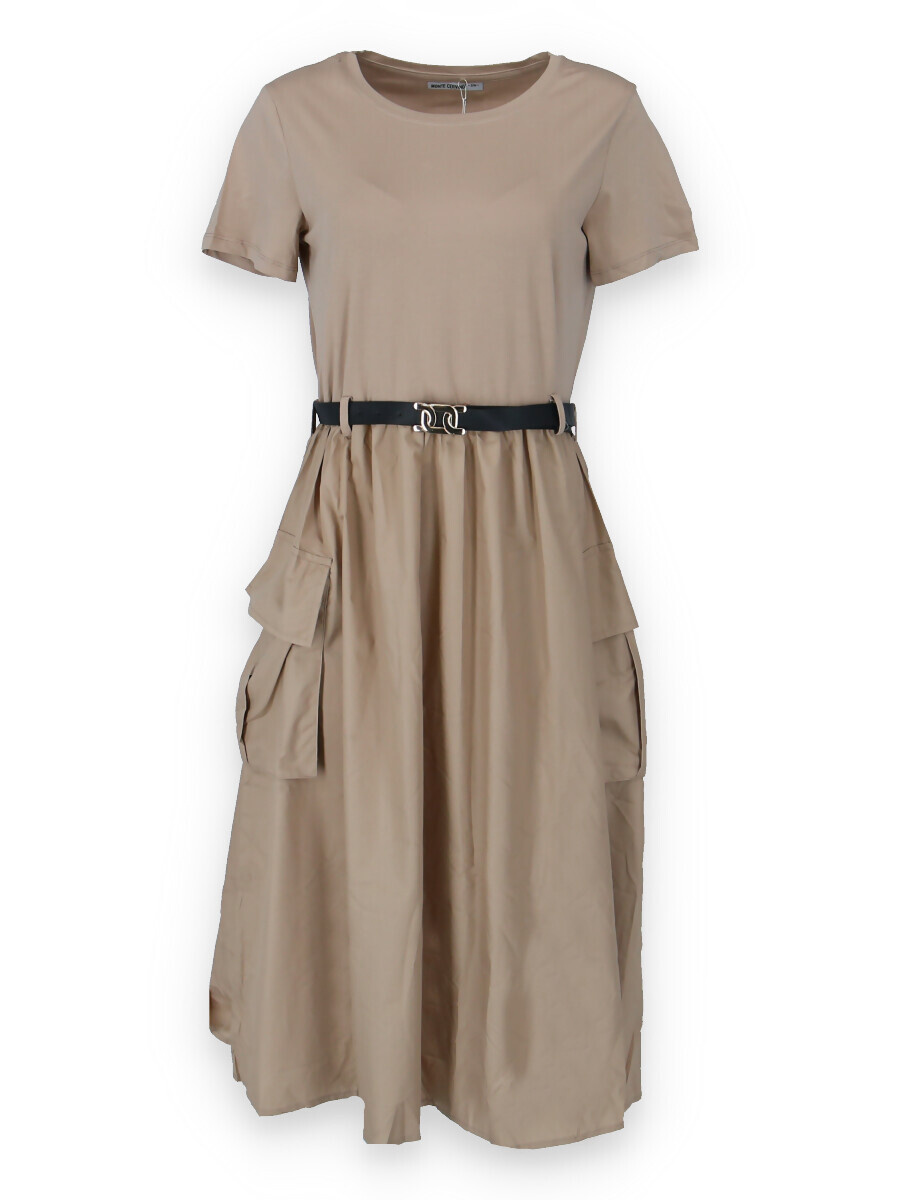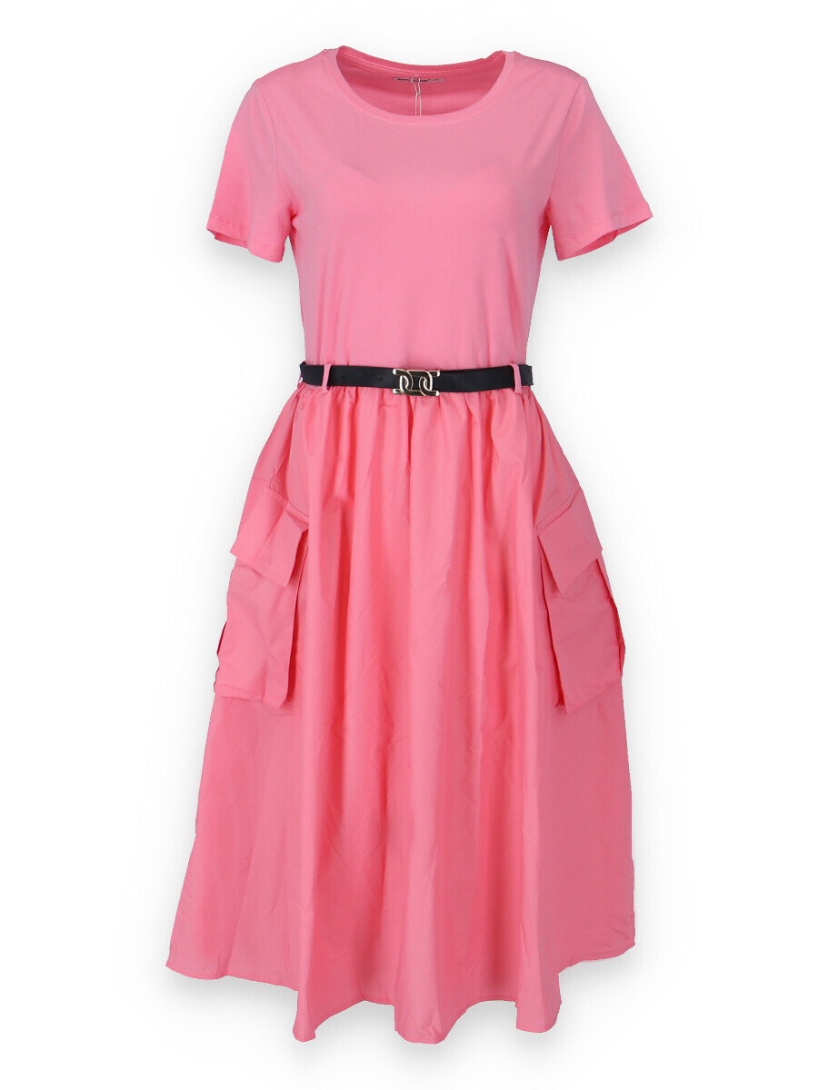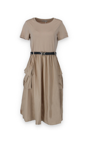 Trendy šaty s krátkým rukávem, doplněné páskem. Ve spodní části našité kapsy.