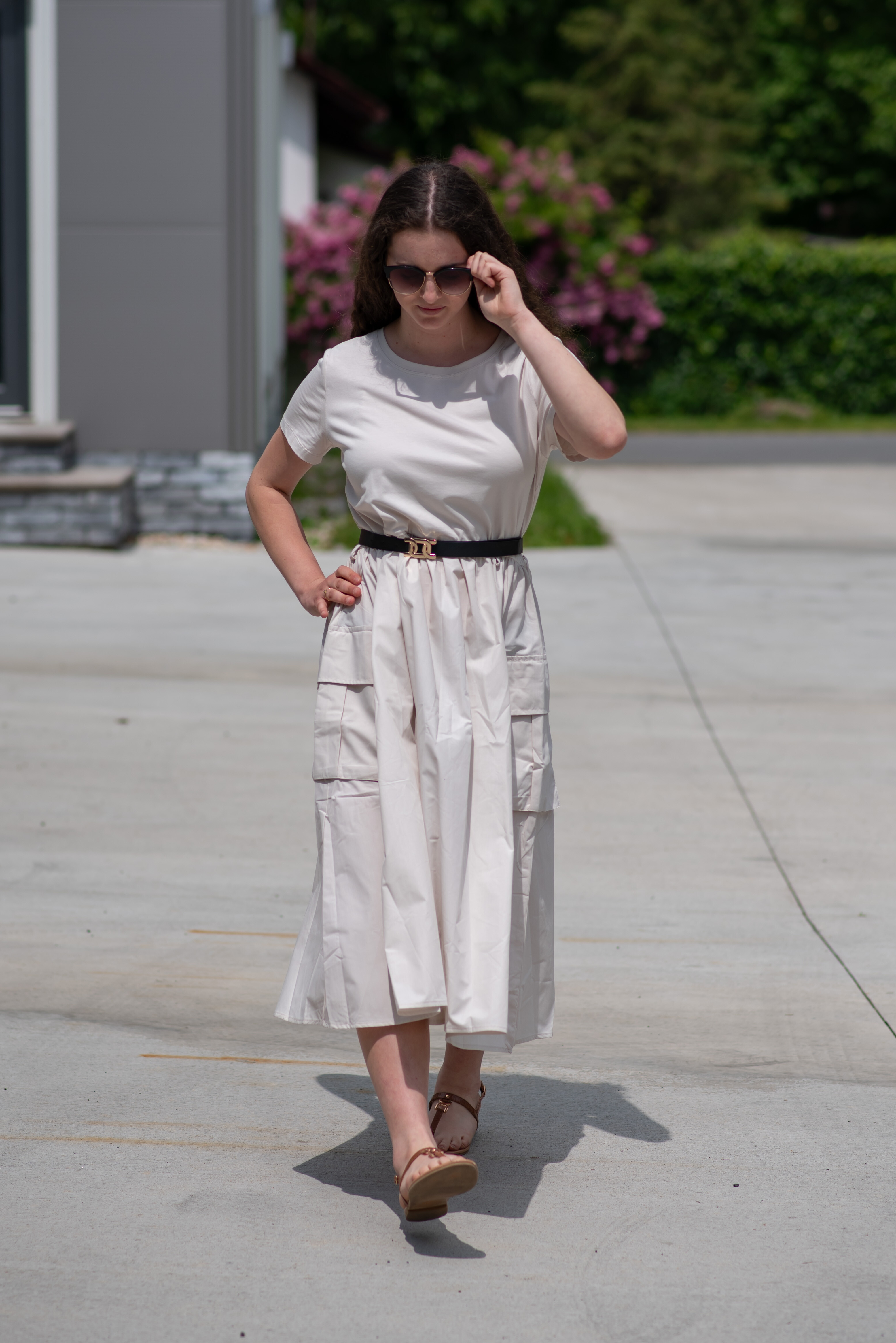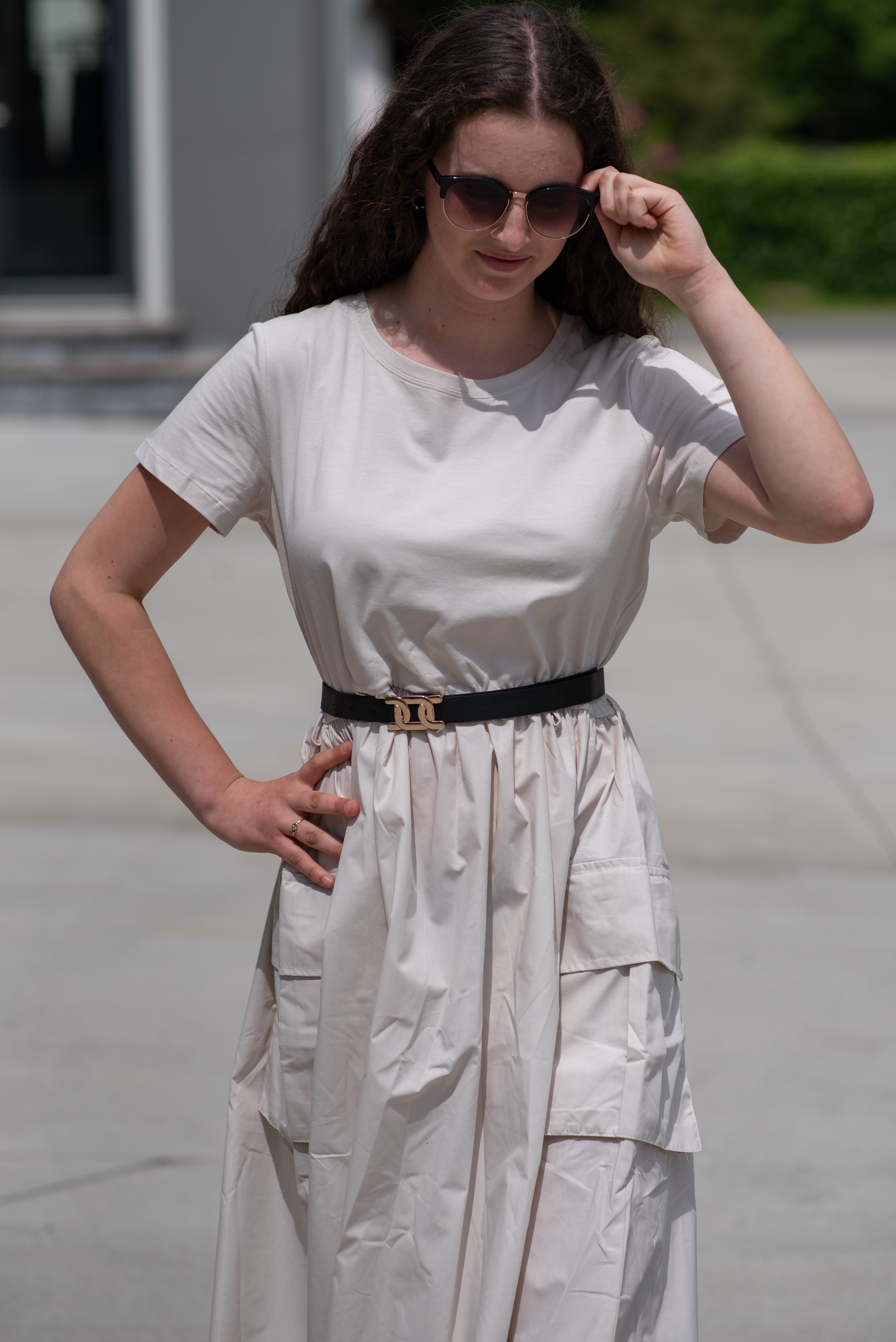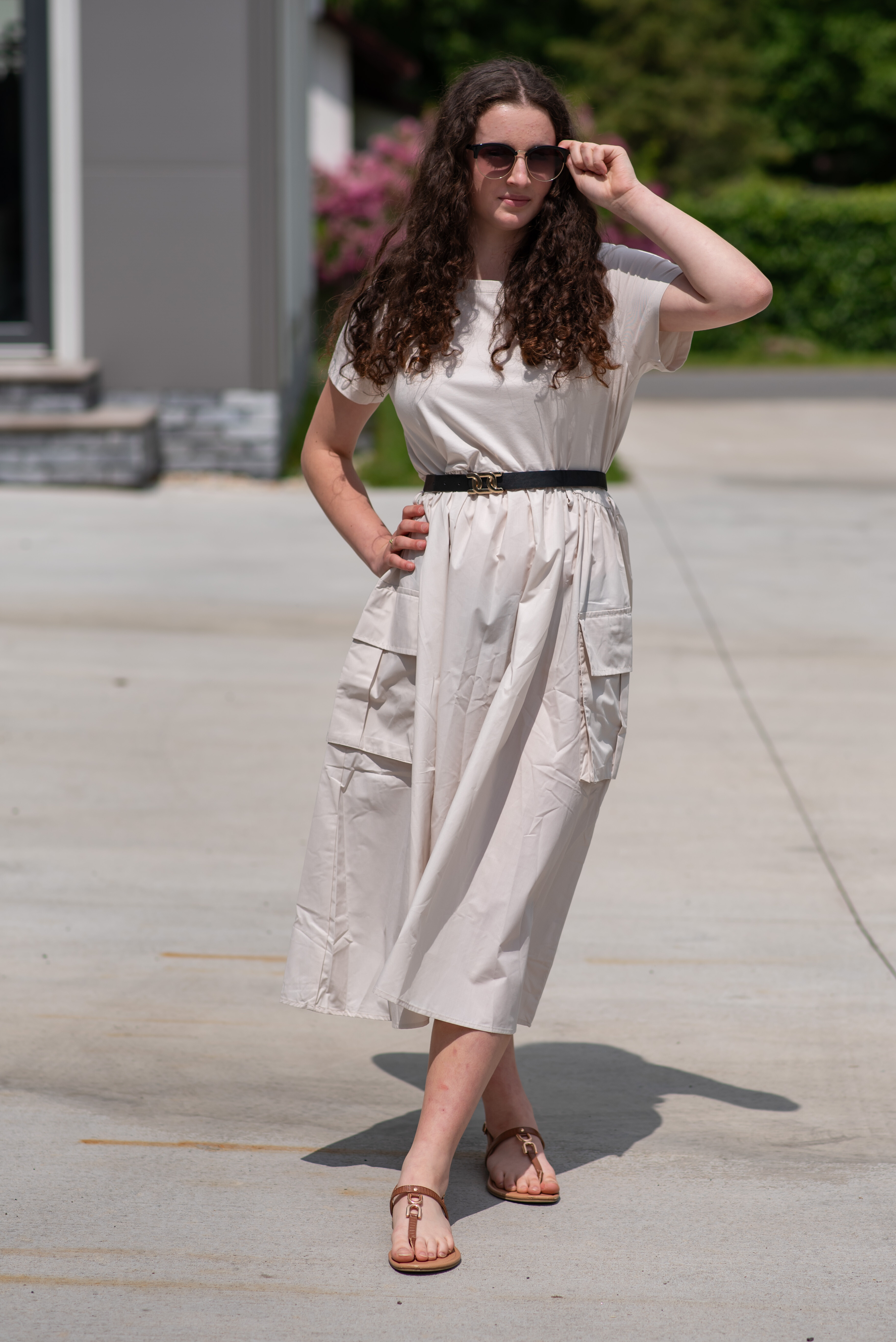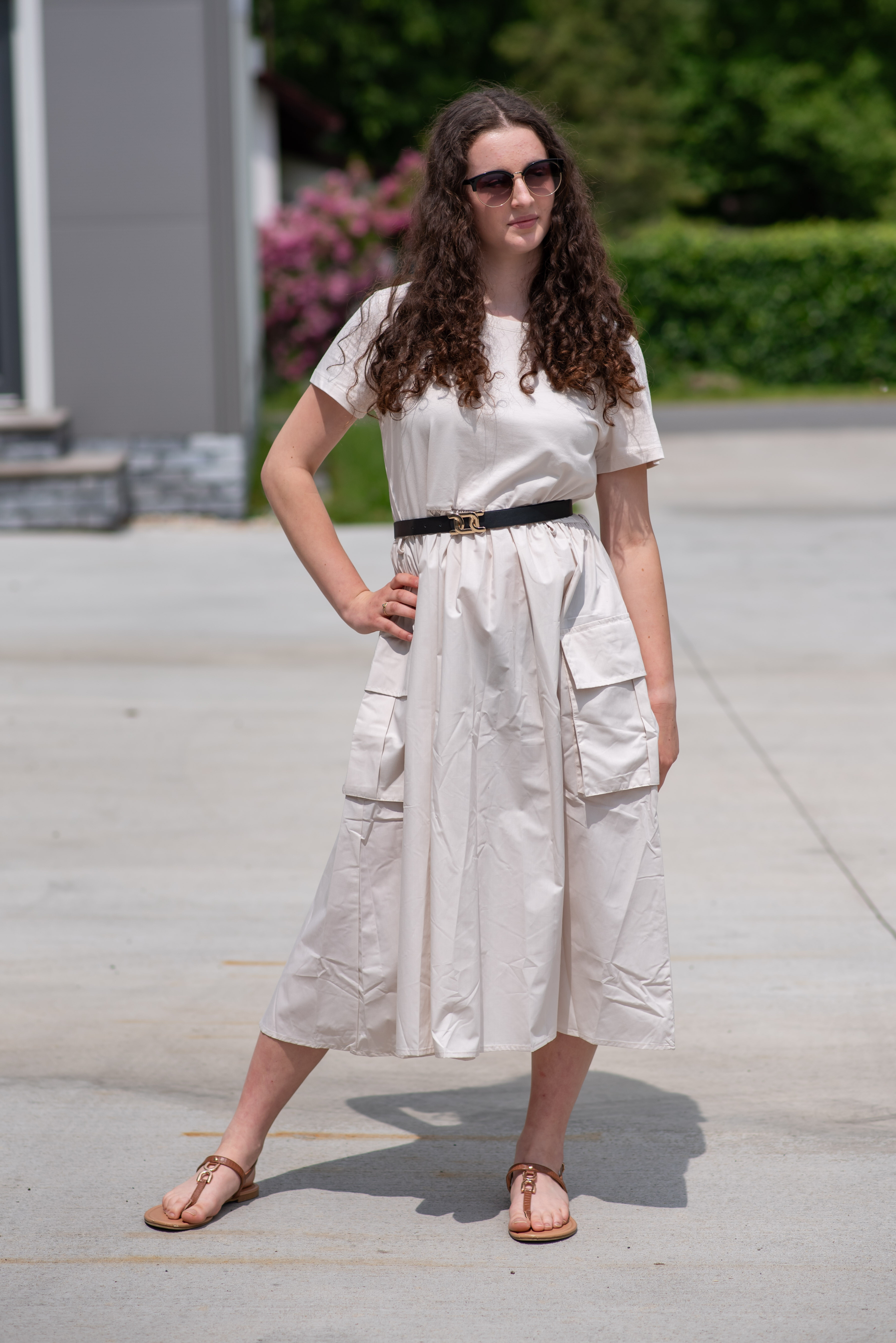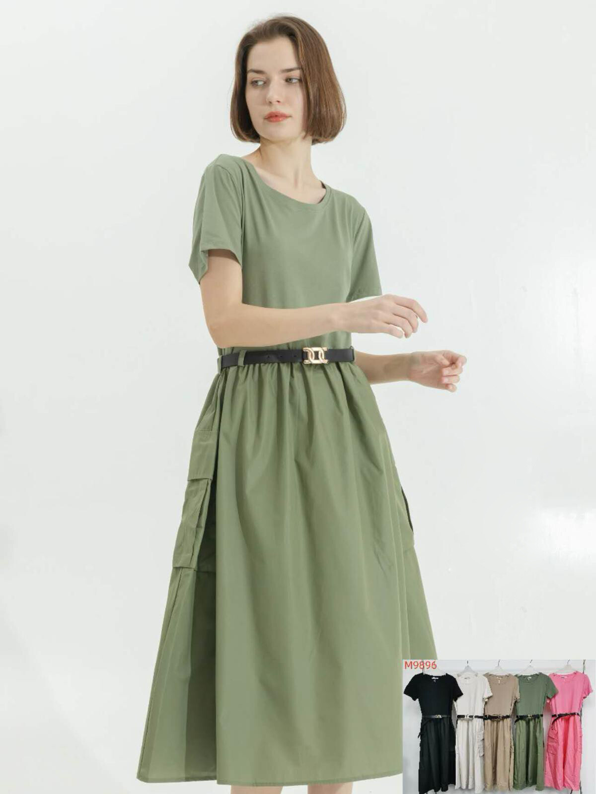 Trendy šaty s krátkým rukávem, doplněné páskem. Ve spodní části našité kapsy.