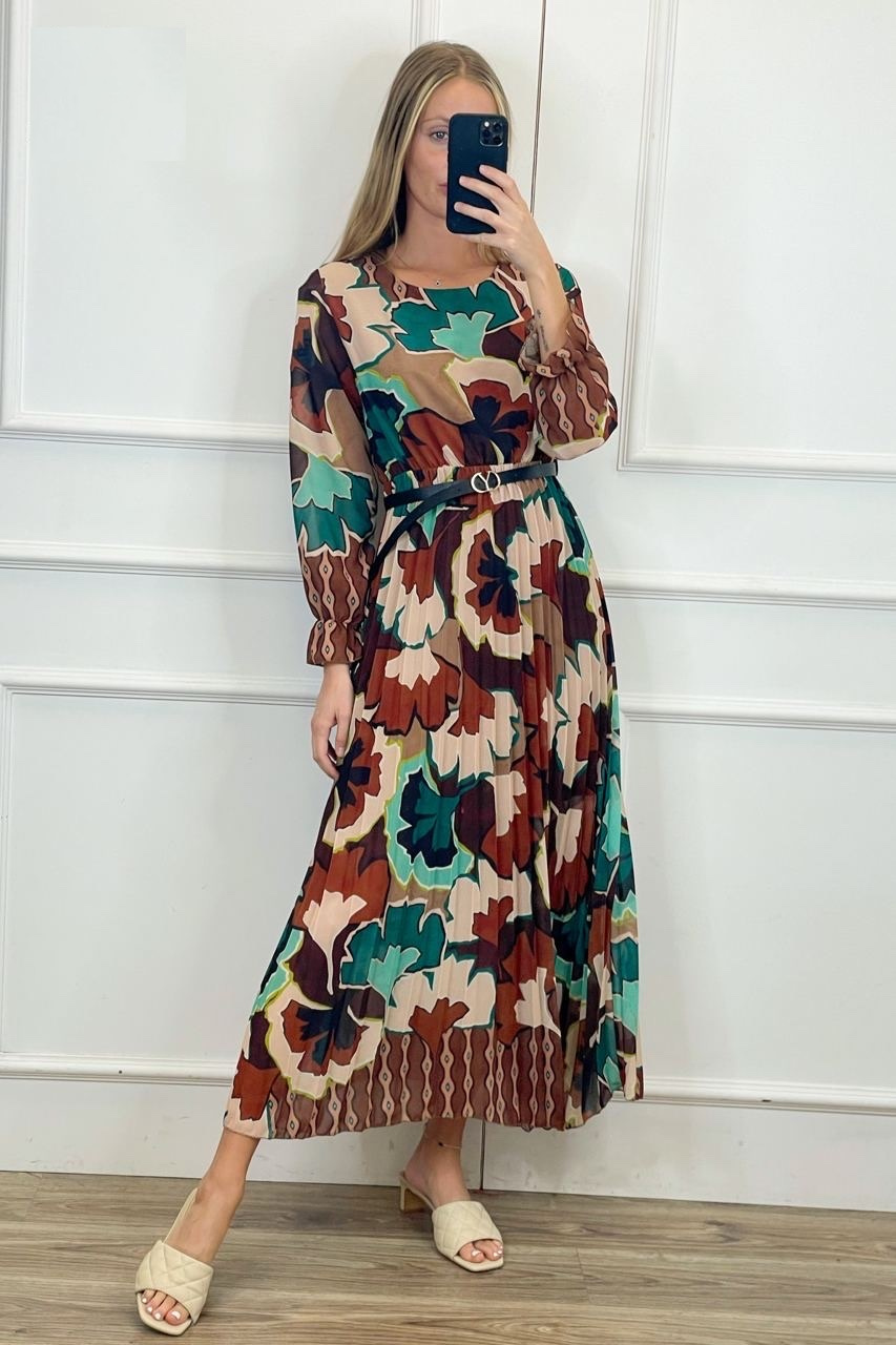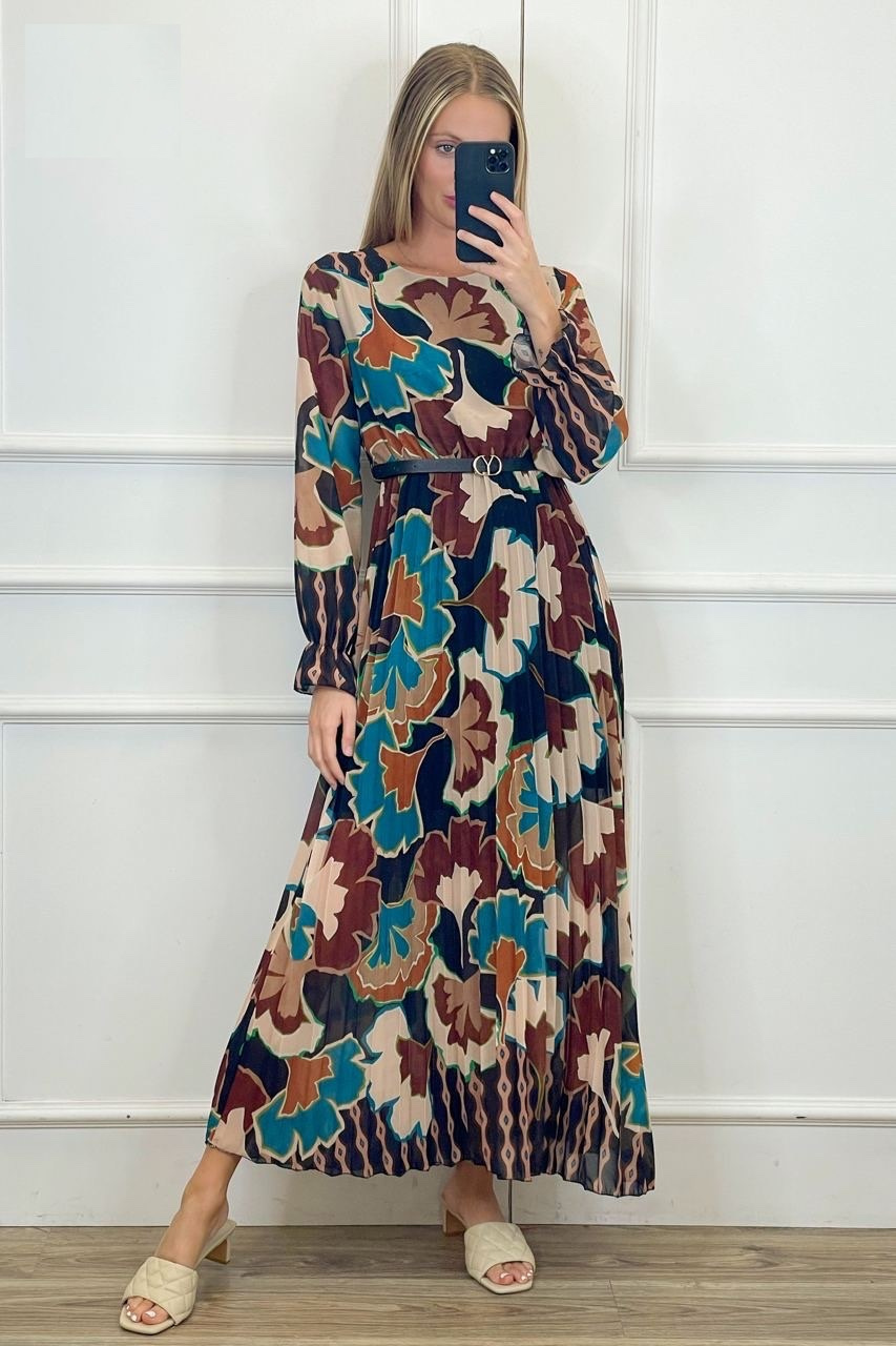 Módní dlouhé plisé dámské šaty s páskem , podšívkou a u vpase