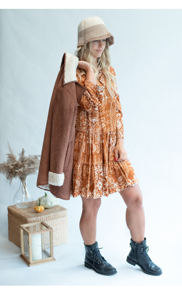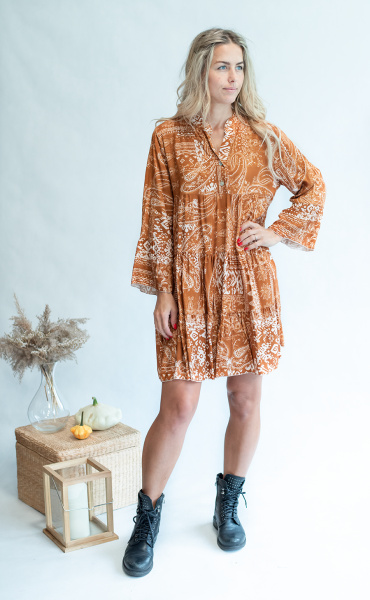 Módní vzorované krátké dámské šaty s 3/4 rukávem, volánový rukáv. Vyrobeno v Itálii