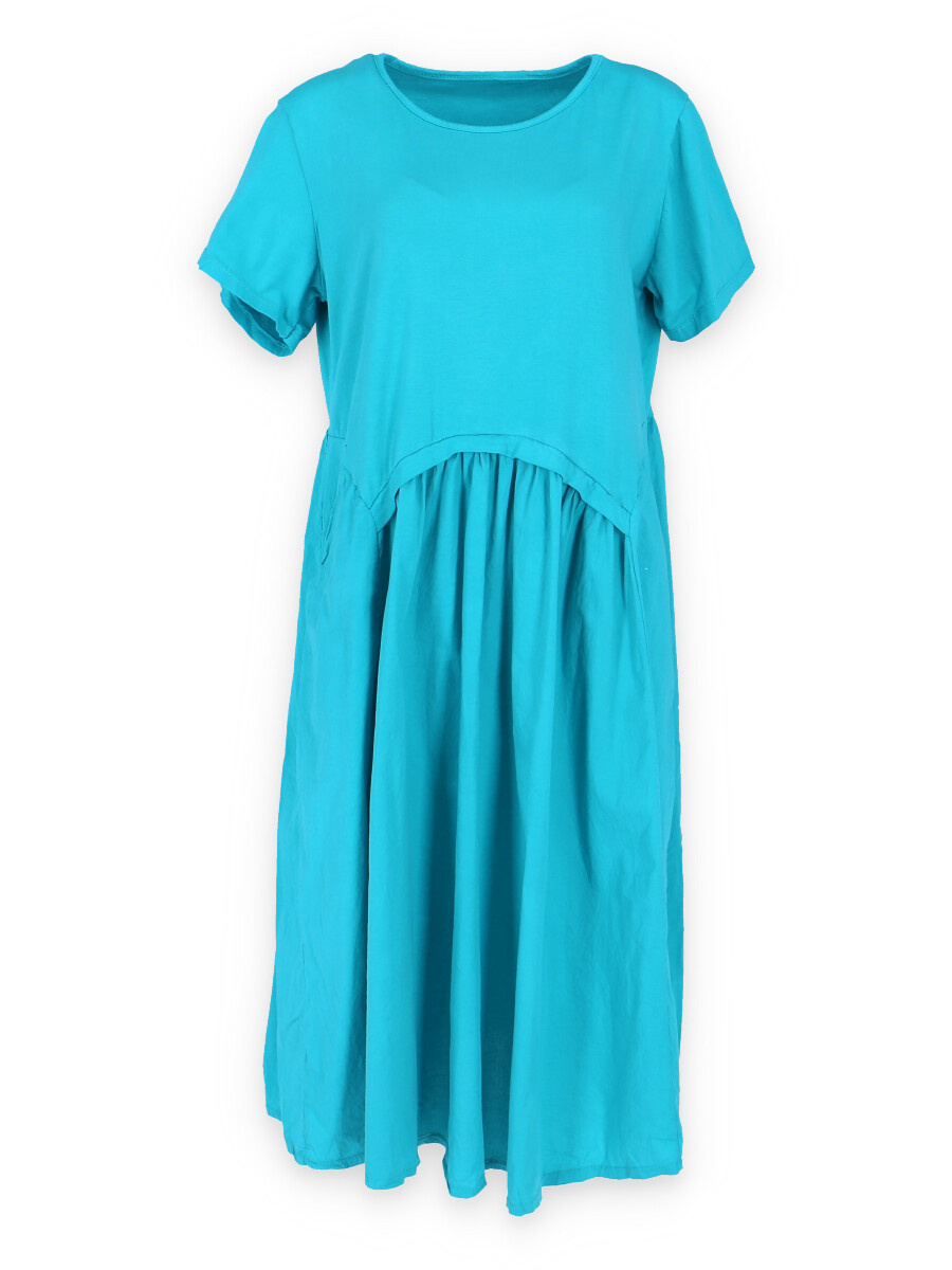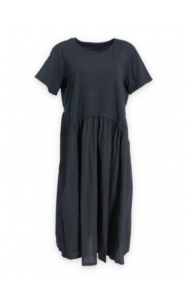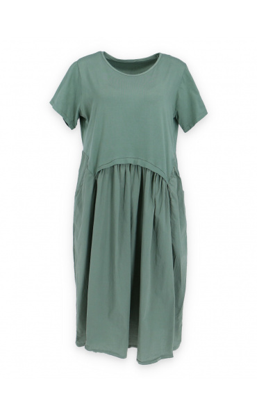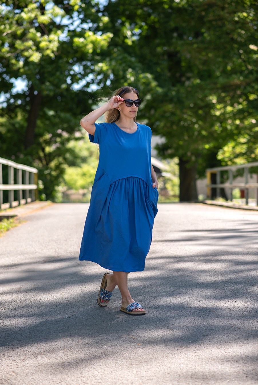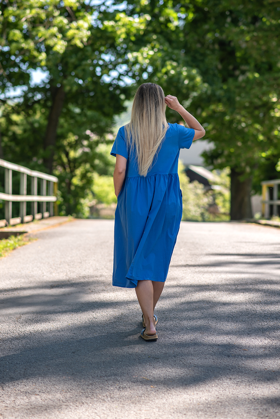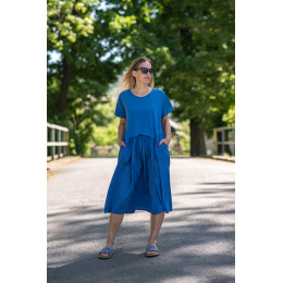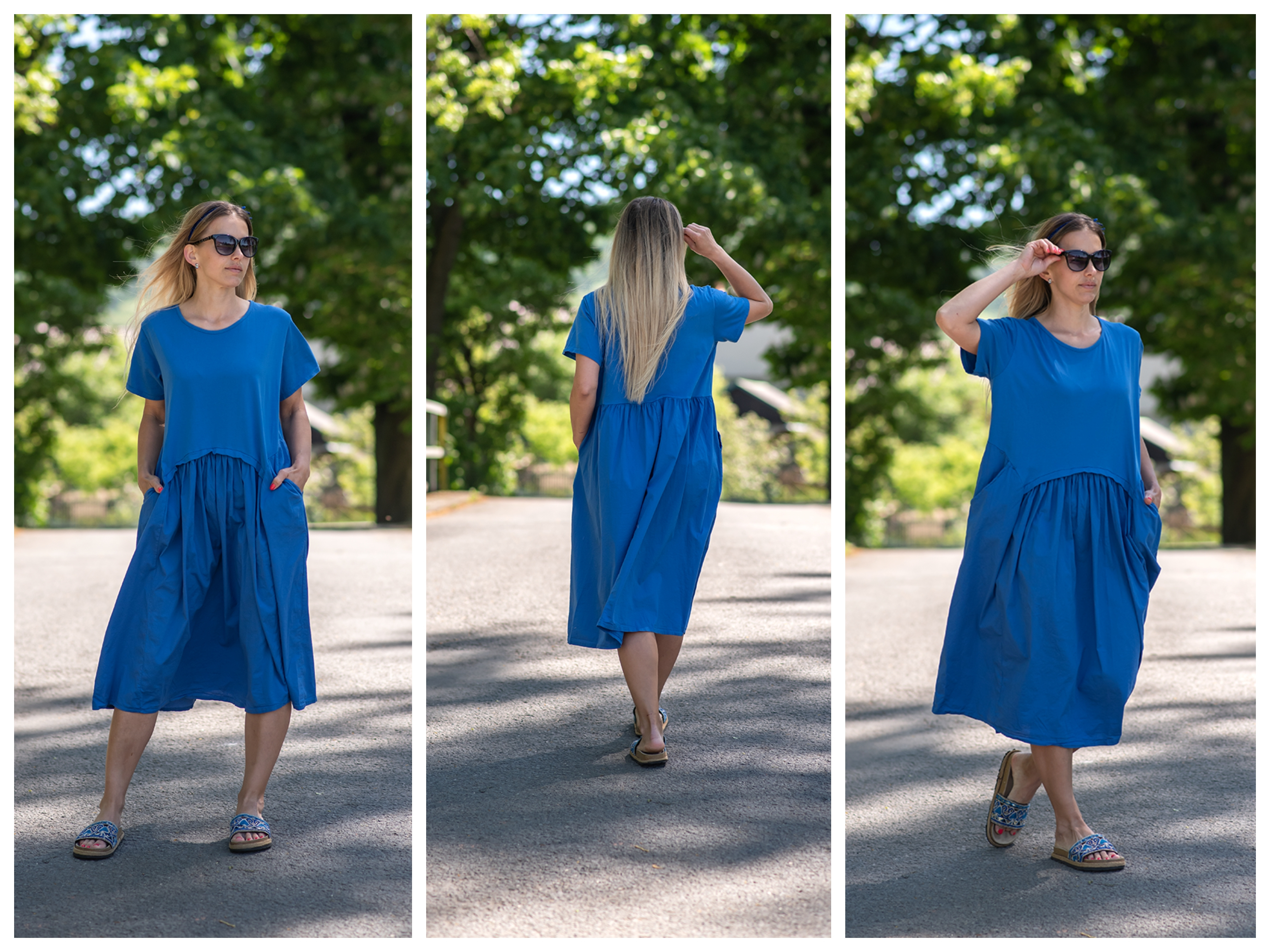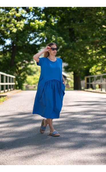 Dlouhé bavlněné balonové letní šaty s krátkým rukávem a kapsami po stranách.