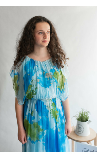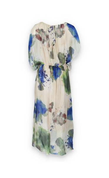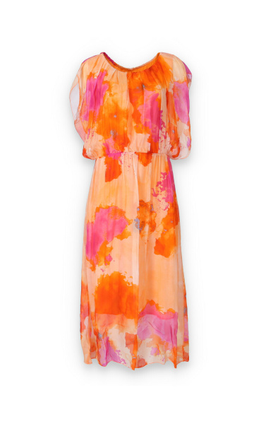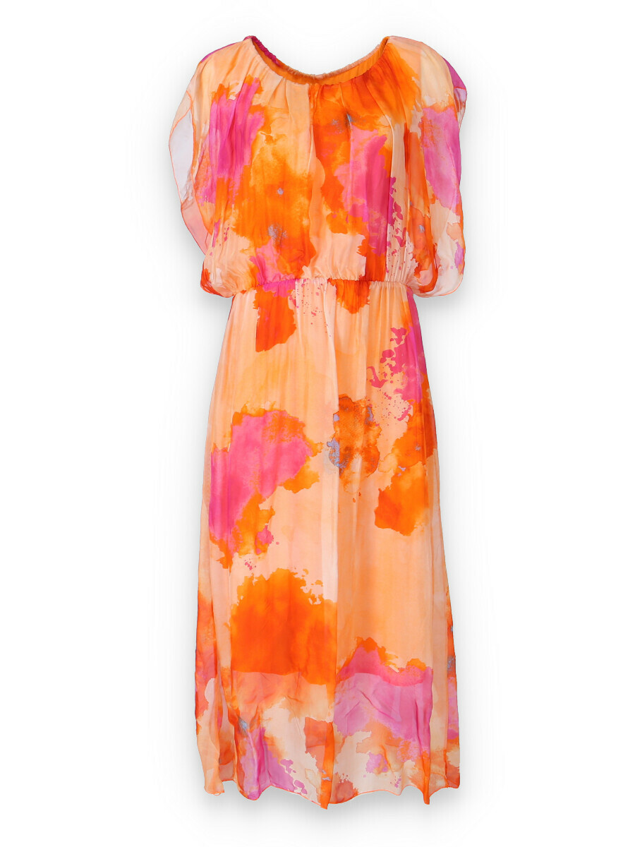 Letní hedvábné šaty s podšívkou, v pase do gumy, kulatý výstřih.