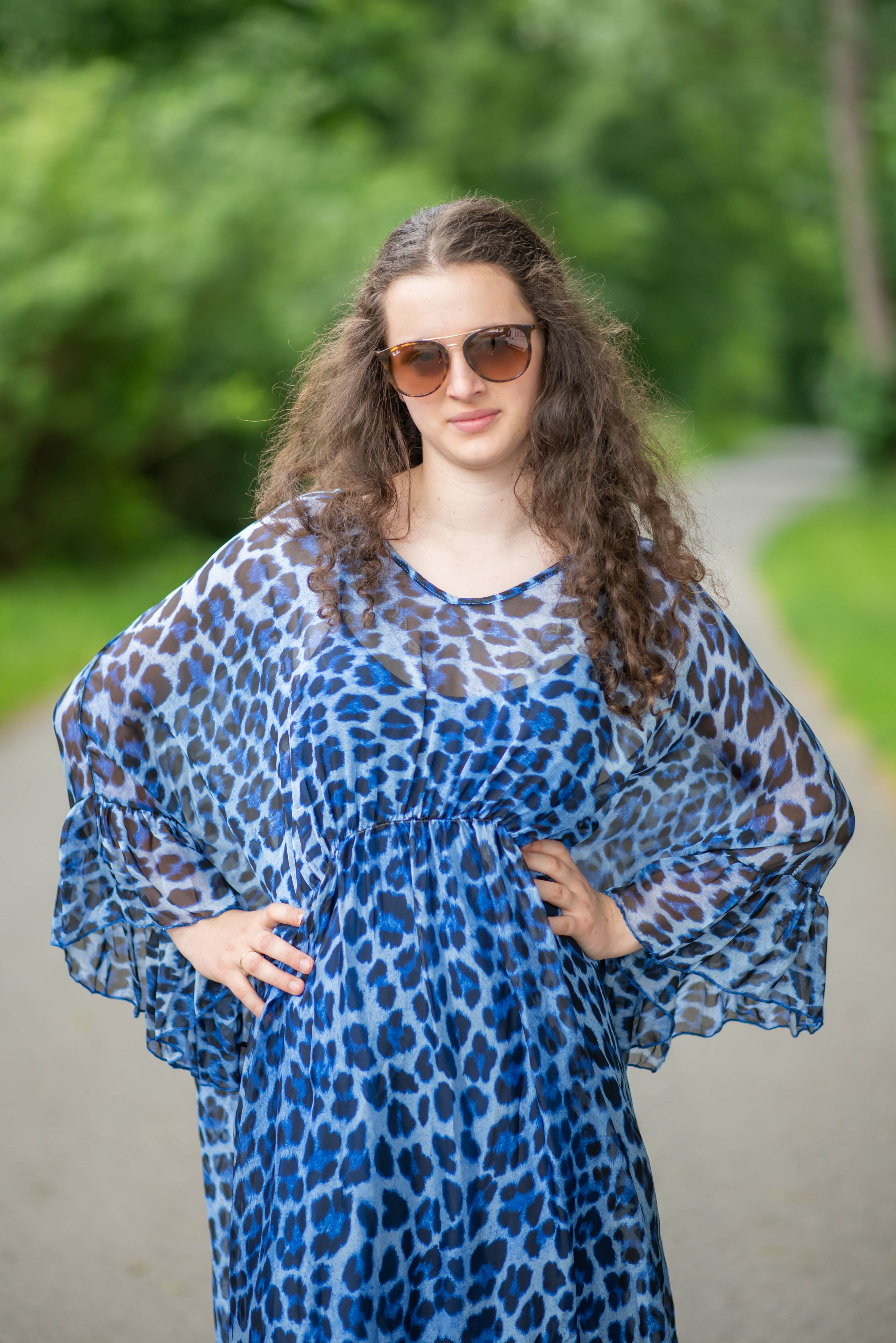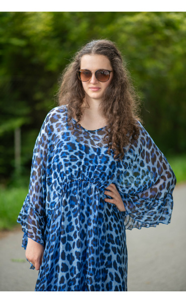 Módní letní hedvábné šaty s podšívkou, spuštěné rukávy do raglánu. Šaty mají pod prsy gumičkové řasení.