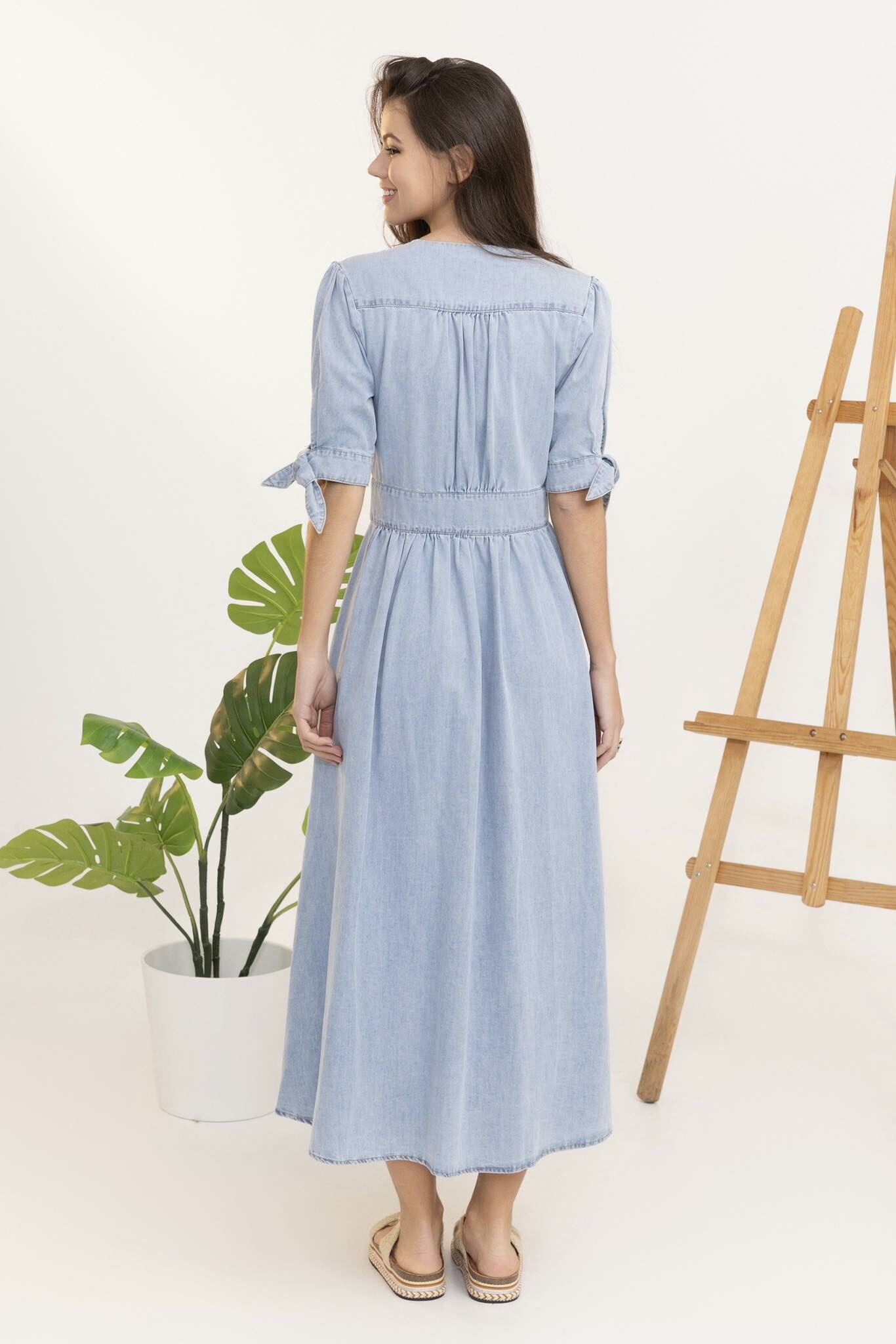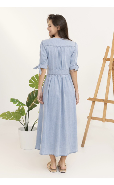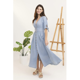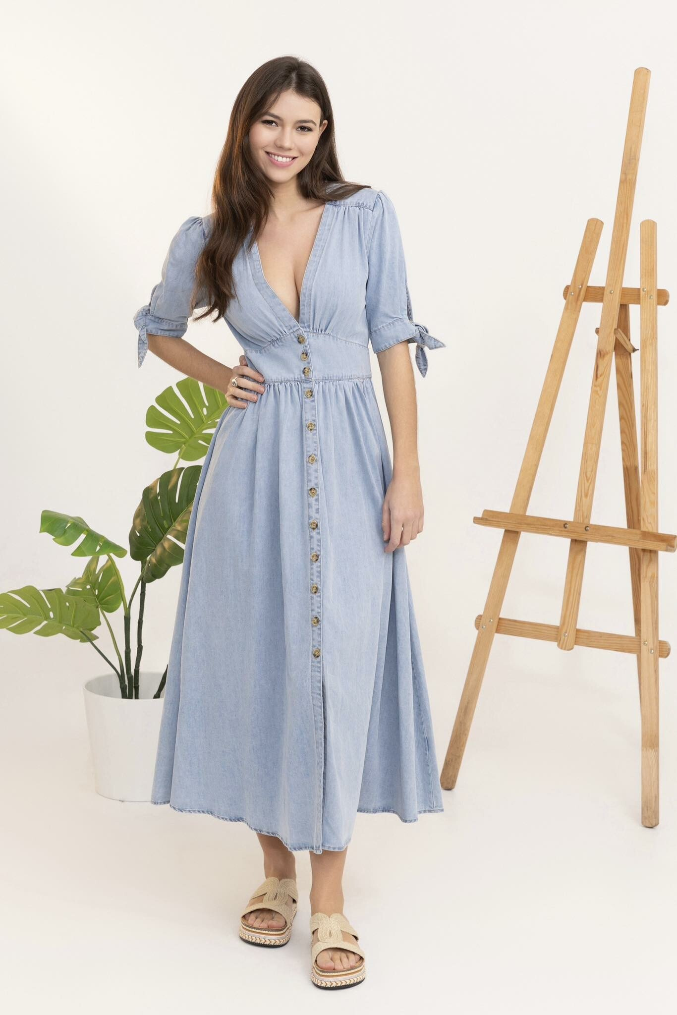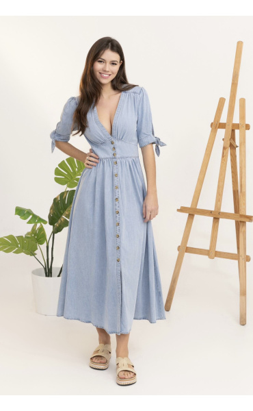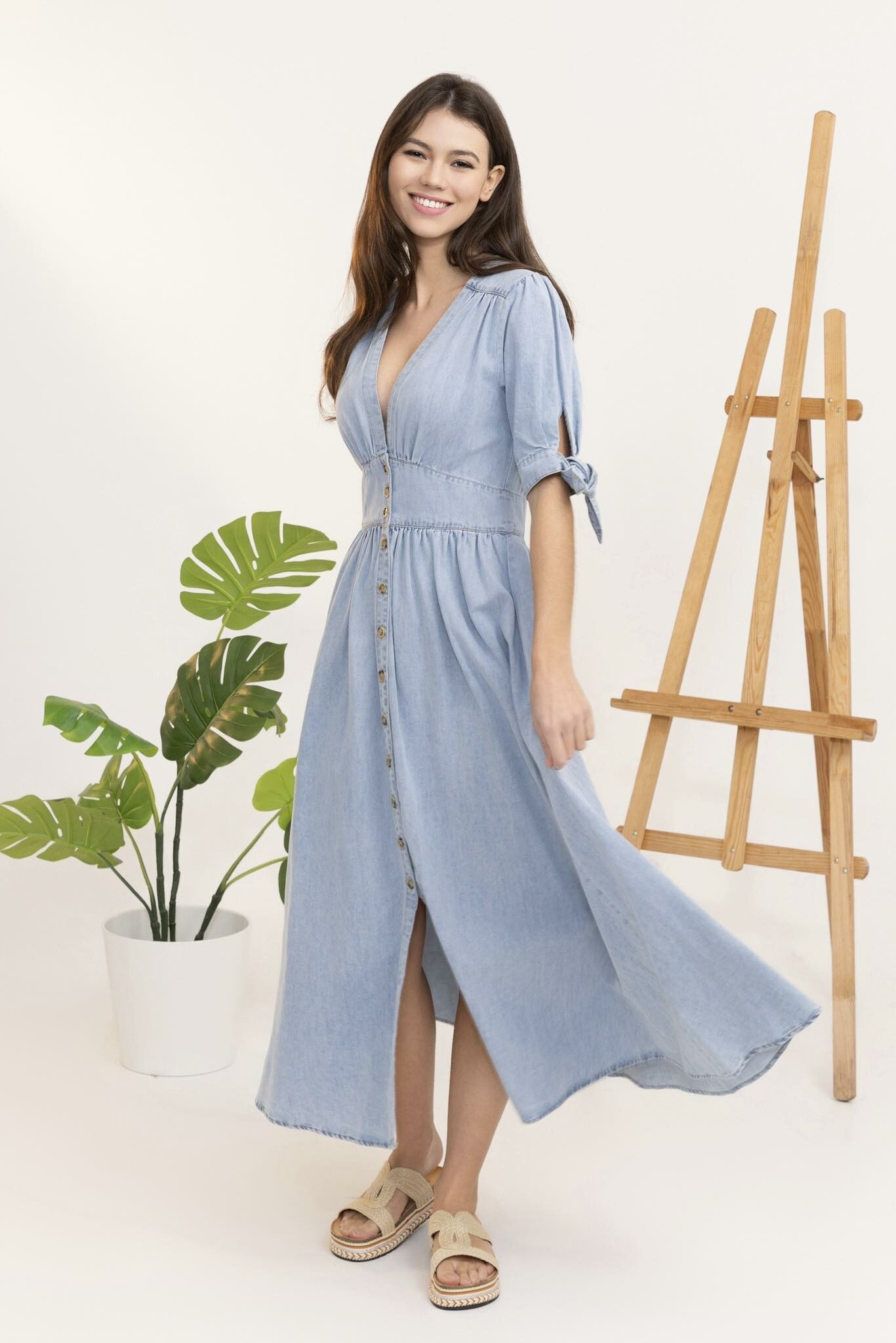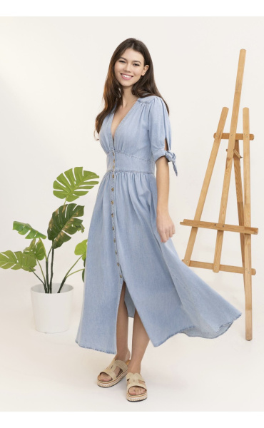 Stylové dlouhé džínové šaty s límečkem. Maxi džínové šaty s rozšířeným střihem, výstřih do V. Šaty mají mírně nabírané polorukávy s mašlí, jsou celopropínací. Jarní kousek, který by neměl chybět v žádném šatníku.