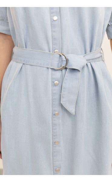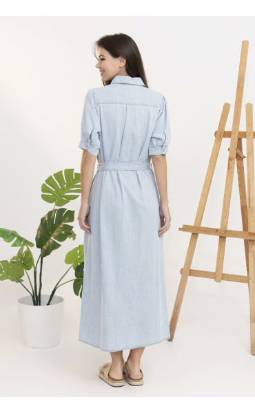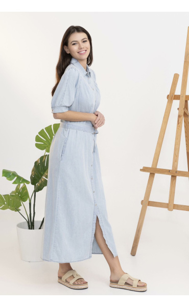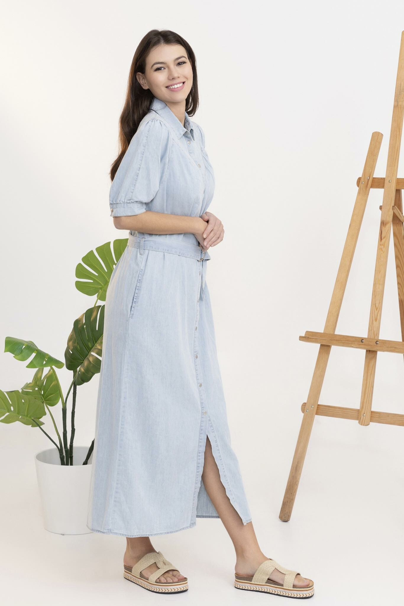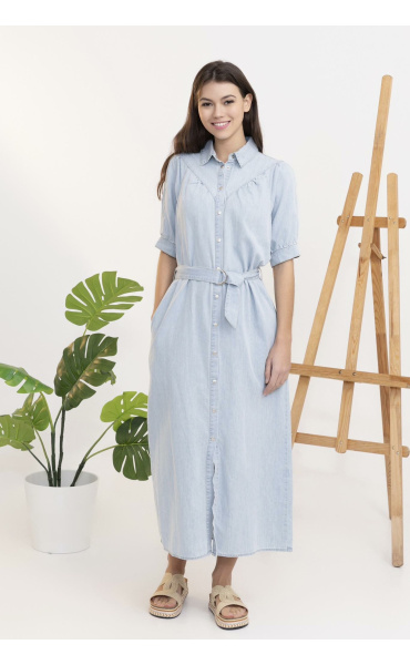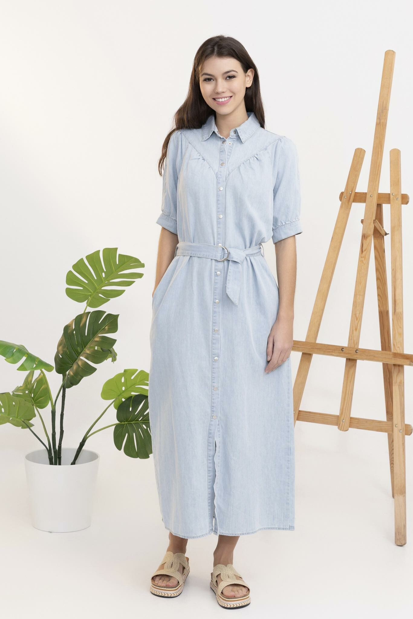 Stylové dlouhé džínové šaty košilového střihu. Maxi džínové šaty z odlehčeného materiálu. Mají krátké nabírané rukávy, všité boční kapsy a pásek na uvázání ve stejném tónu.  Jarní kousek, který by neměl chybět v žádném šatníku moderní ženy.