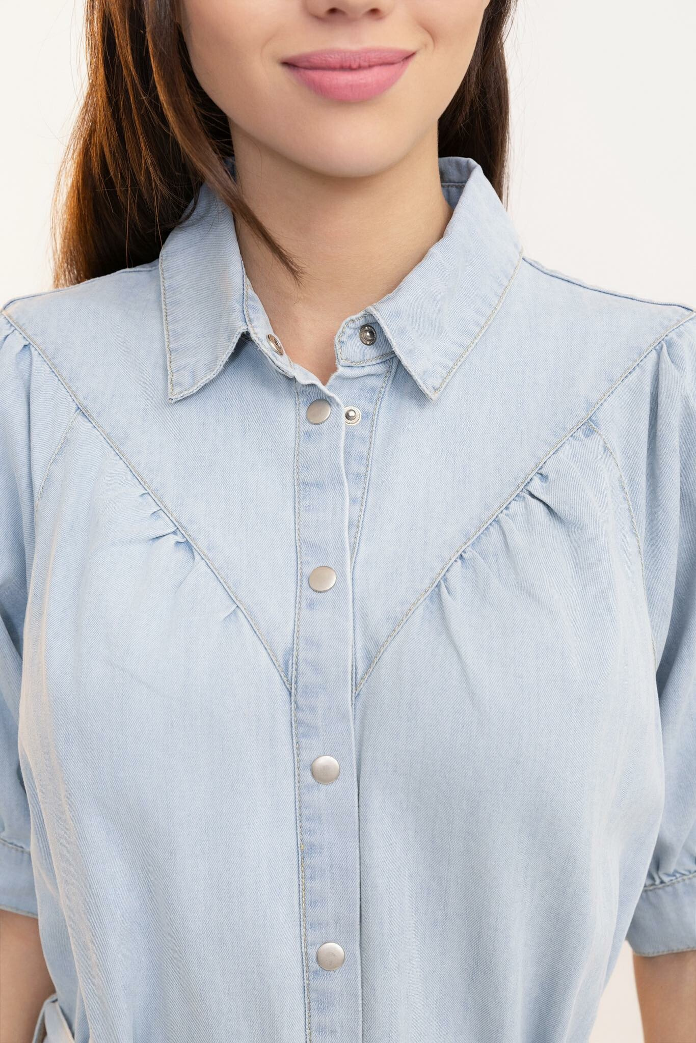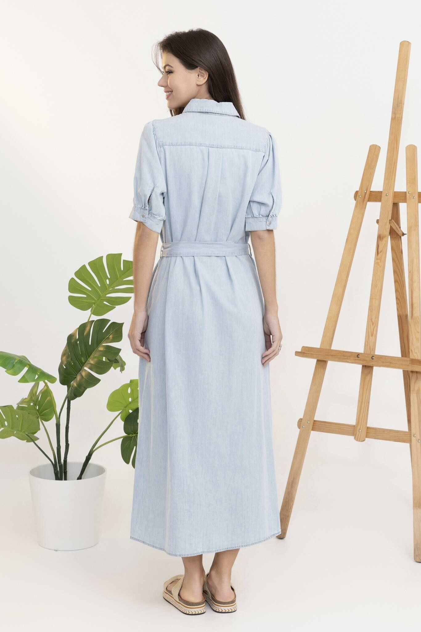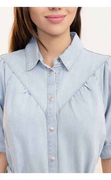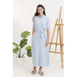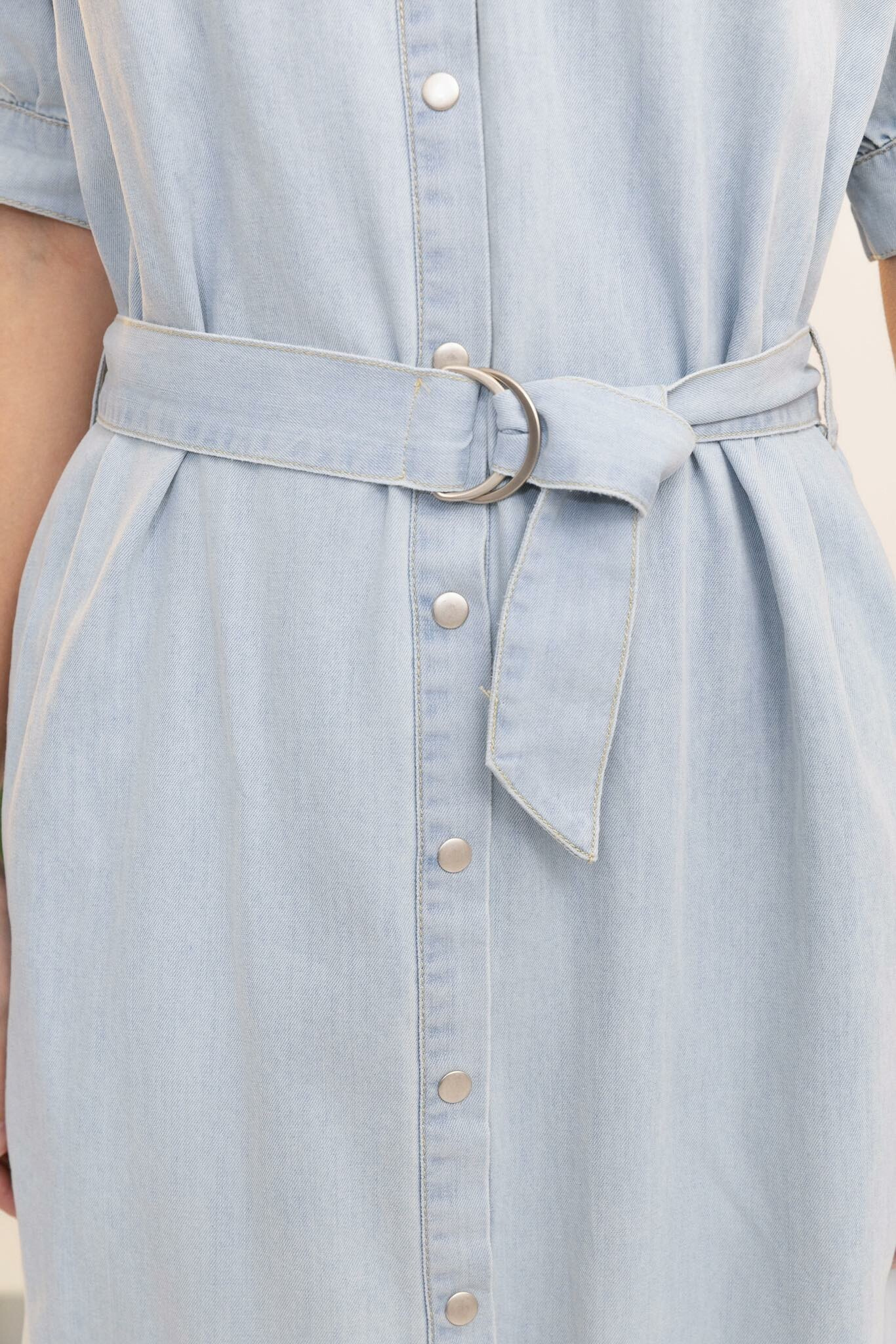 Stylové dlouhé džínové šaty košilového střihu. Maxi džínové šaty z odlehčeného materiálu. Mají krátké nabírané rukávy, všité boční kapsy a pásek na uvázání ve stejném tónu.  Jarní kousek, který by neměl chybět v žádném šatníku moderní ženy.