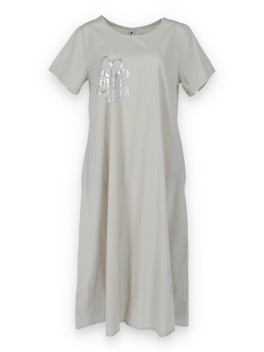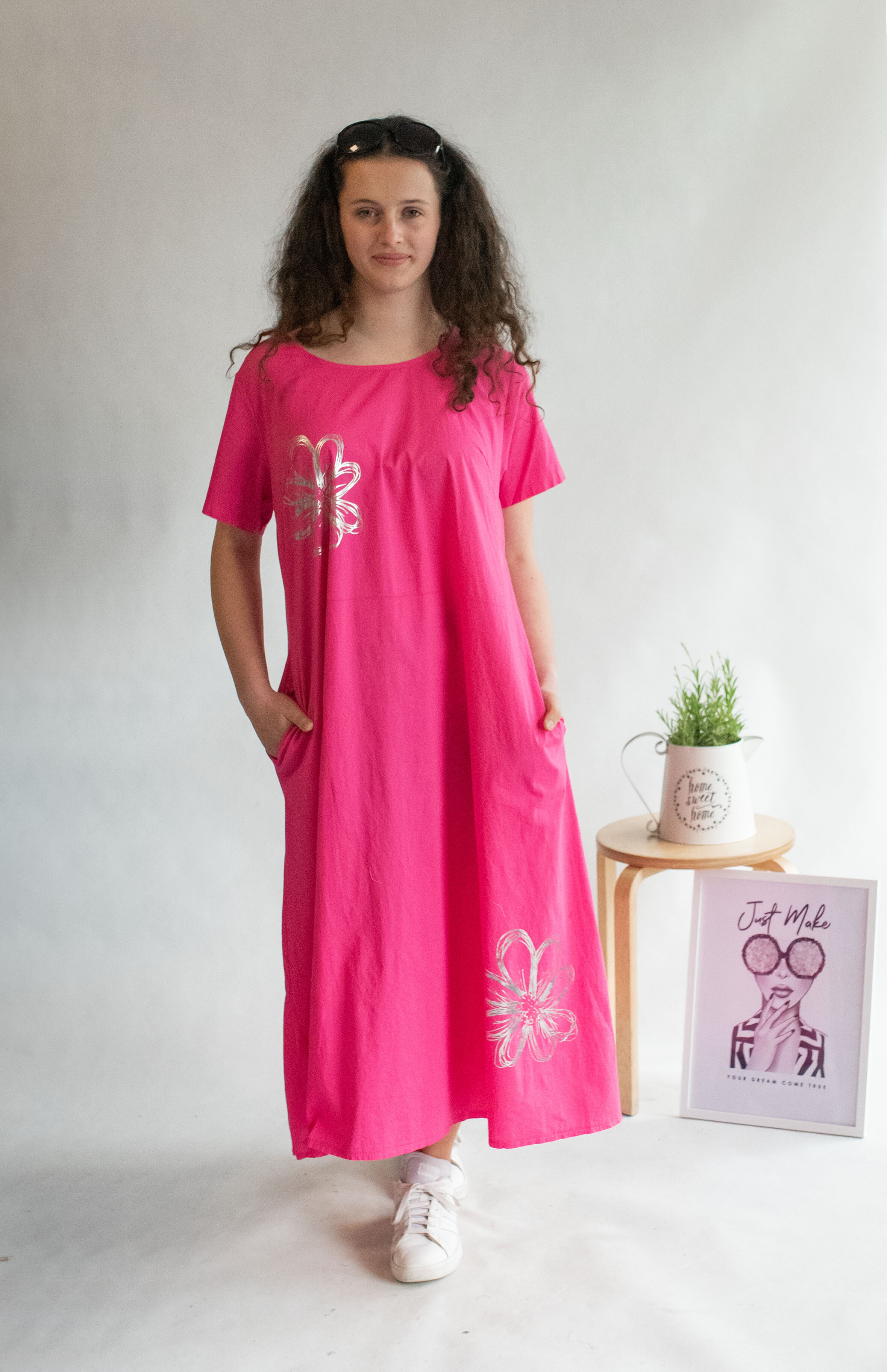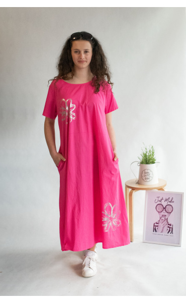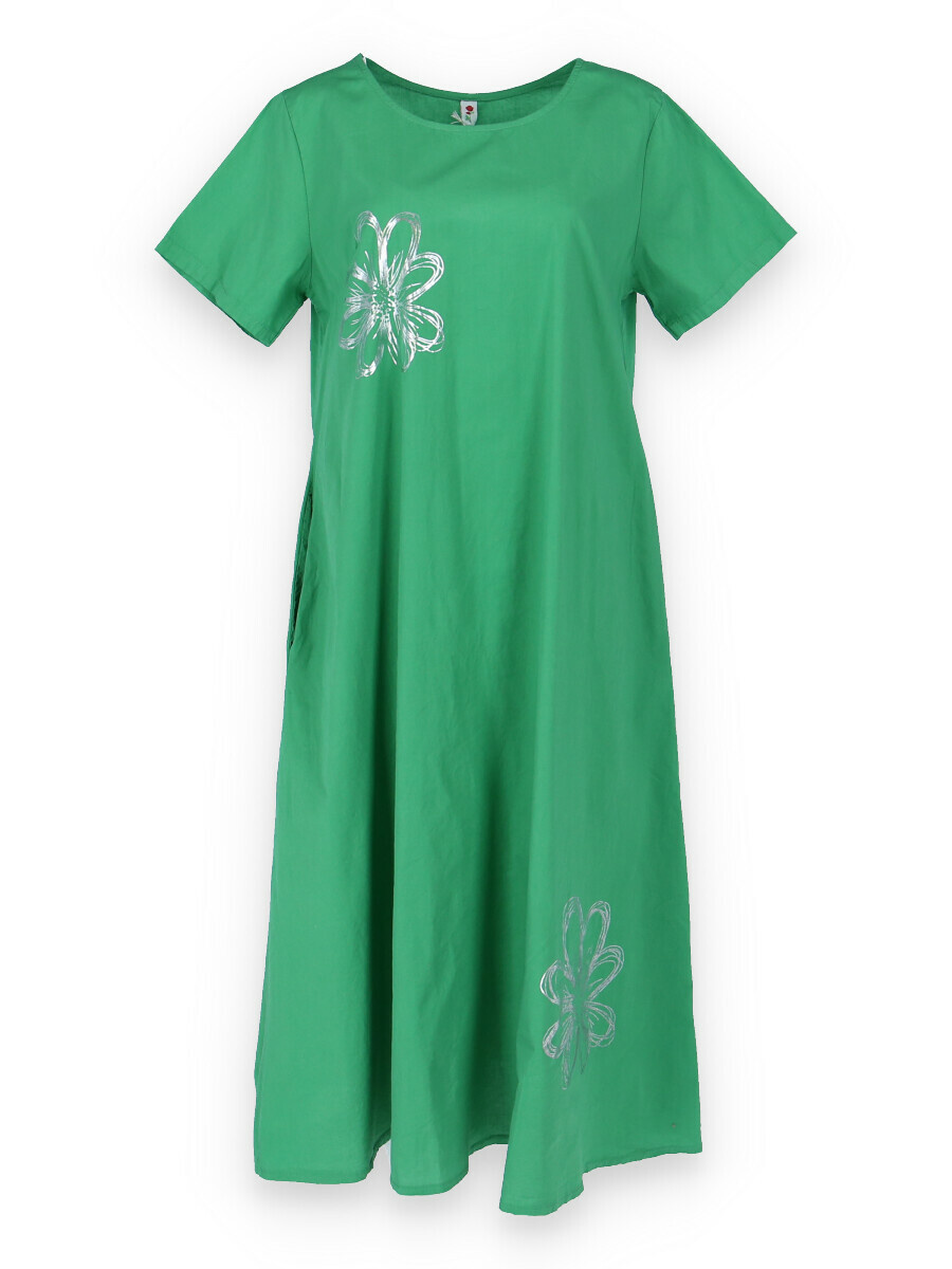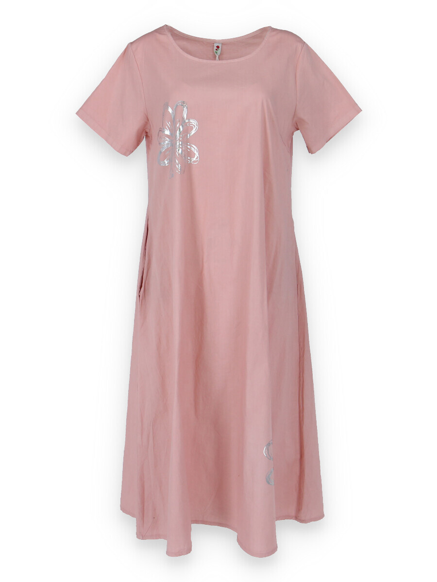 Dlouhé šaty s krátkým rukávem, všité kapsy po stranách, kulatý výstřih.