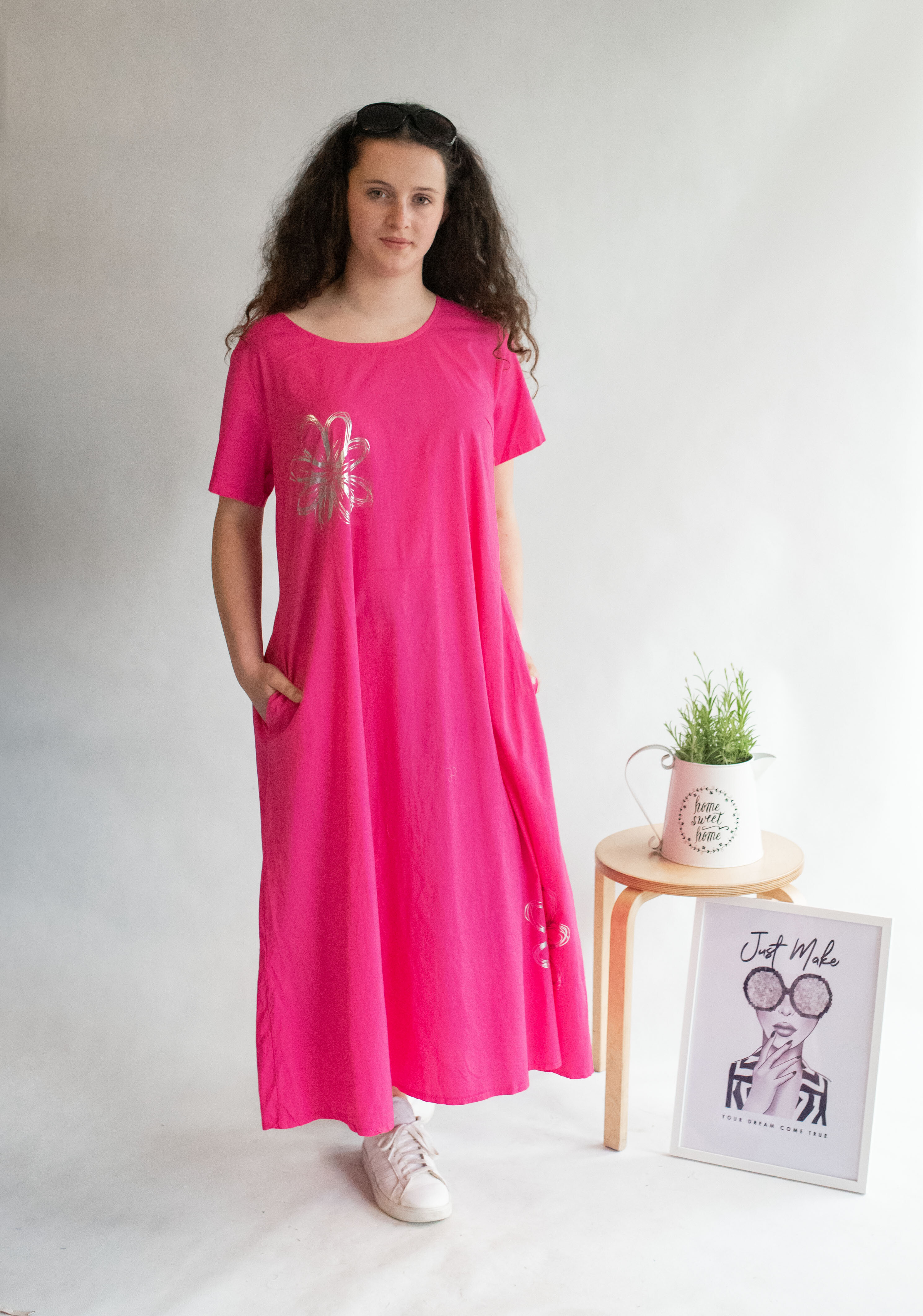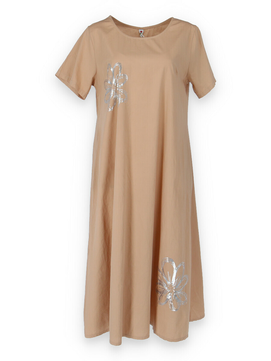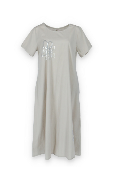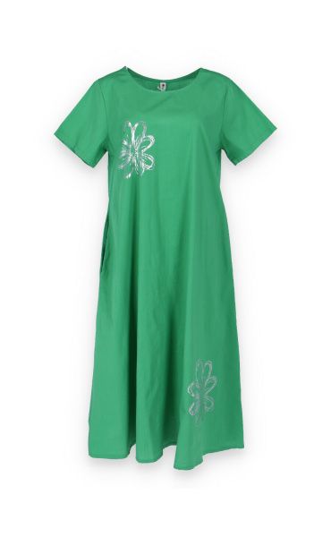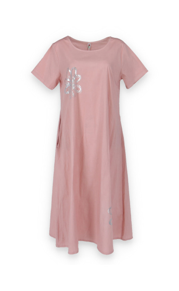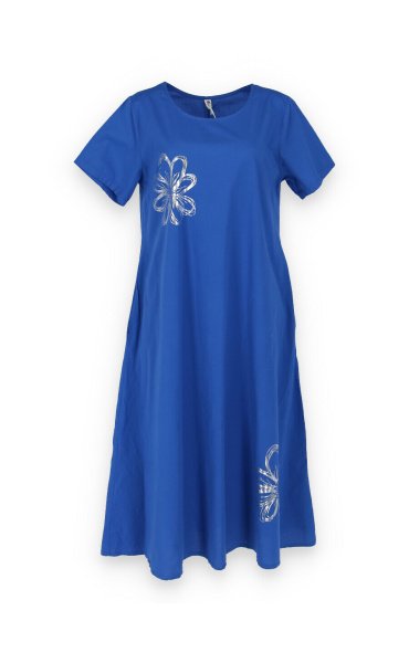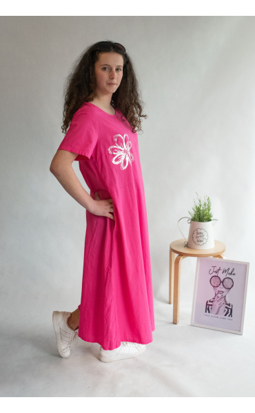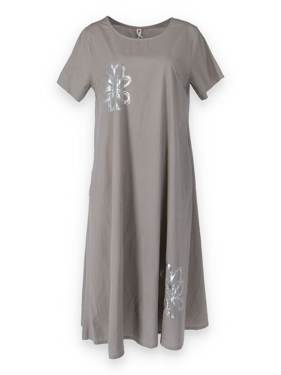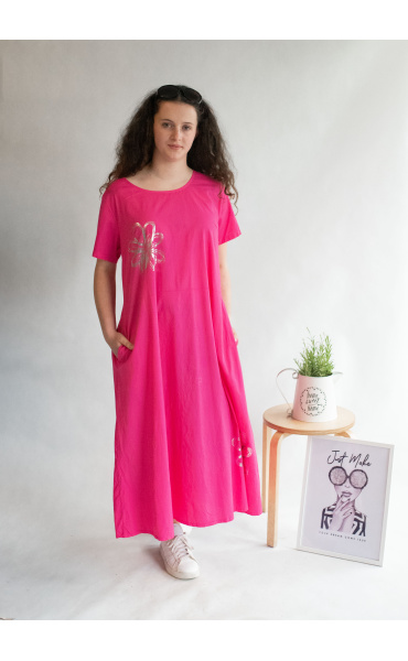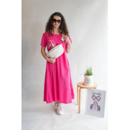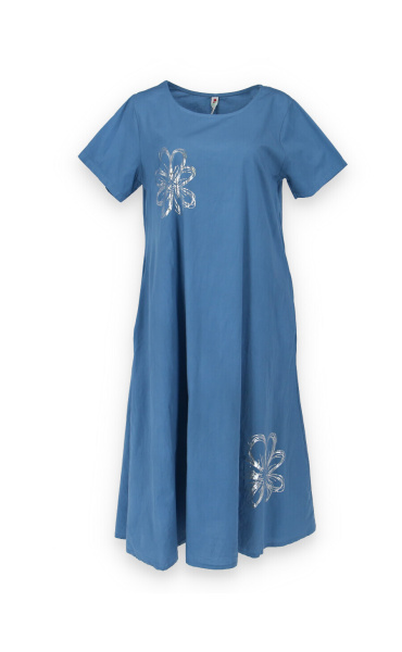 Dlouhé šaty s krátkým rukávem, všité kapsy po stranách, kulatý výstřih.