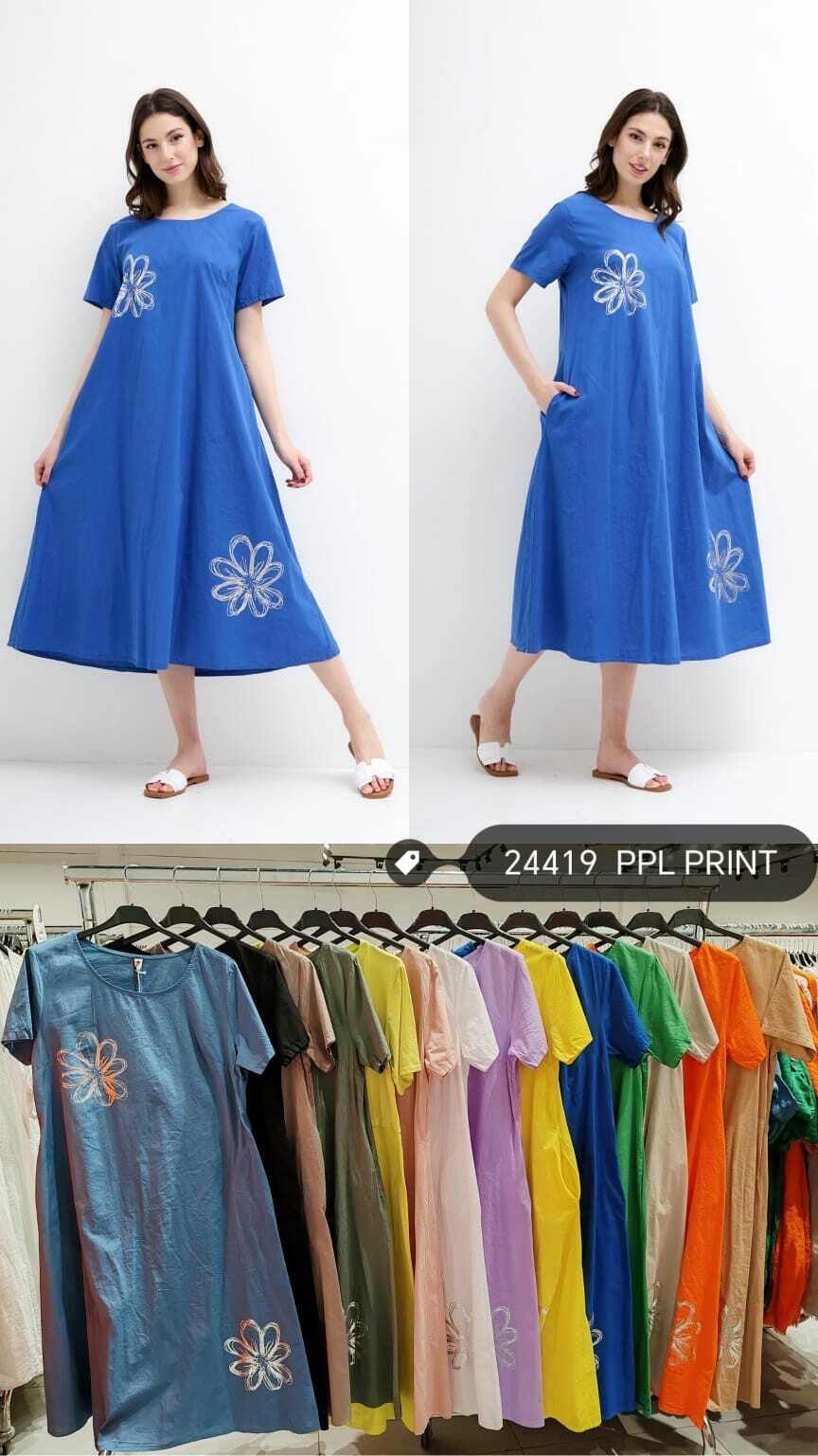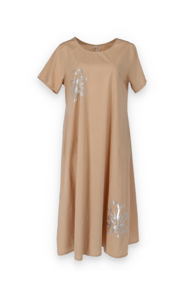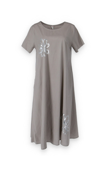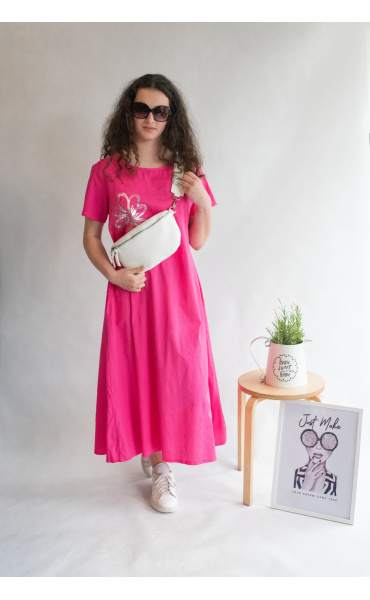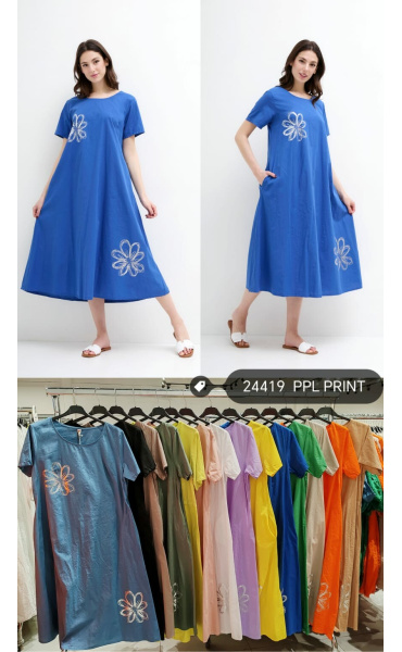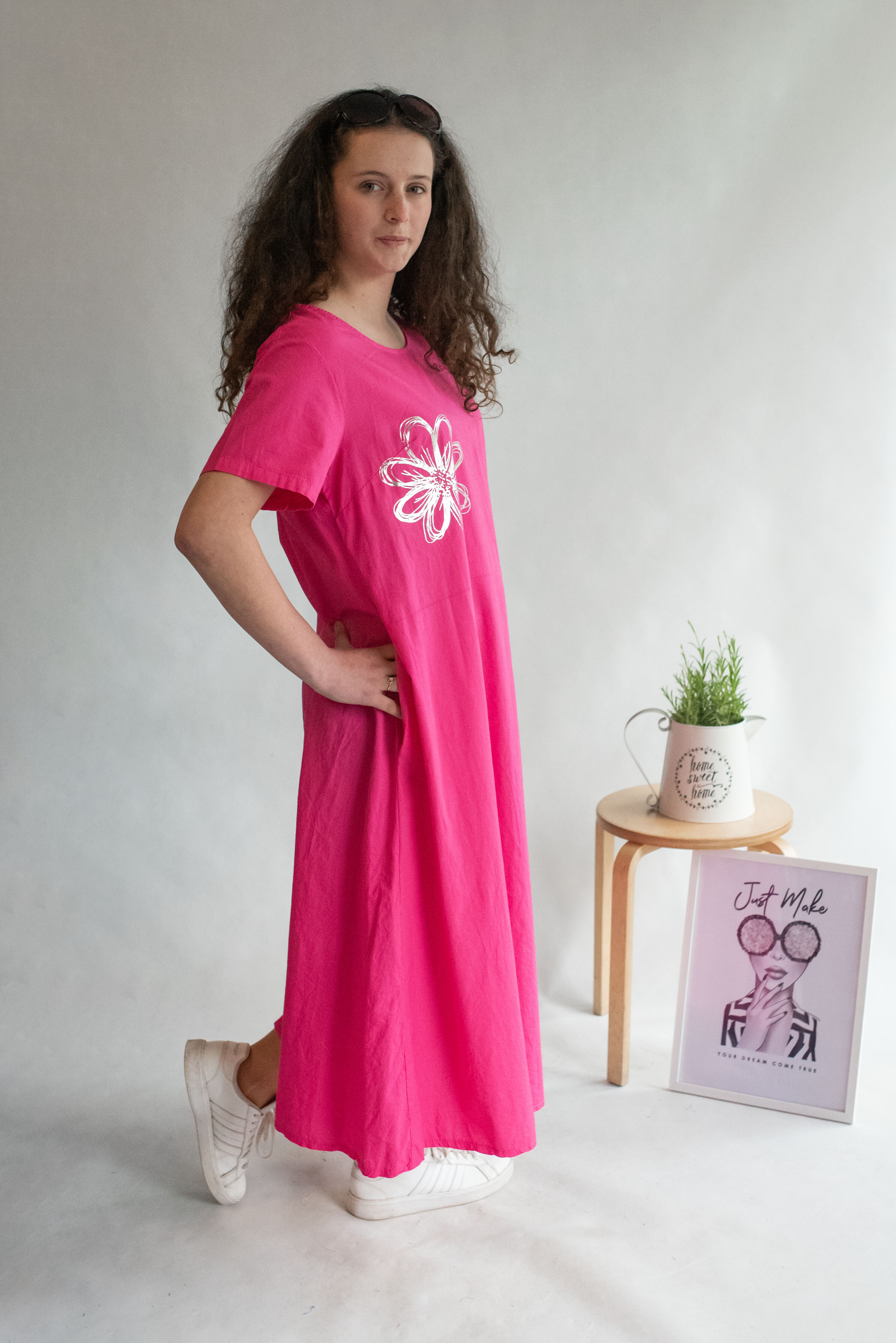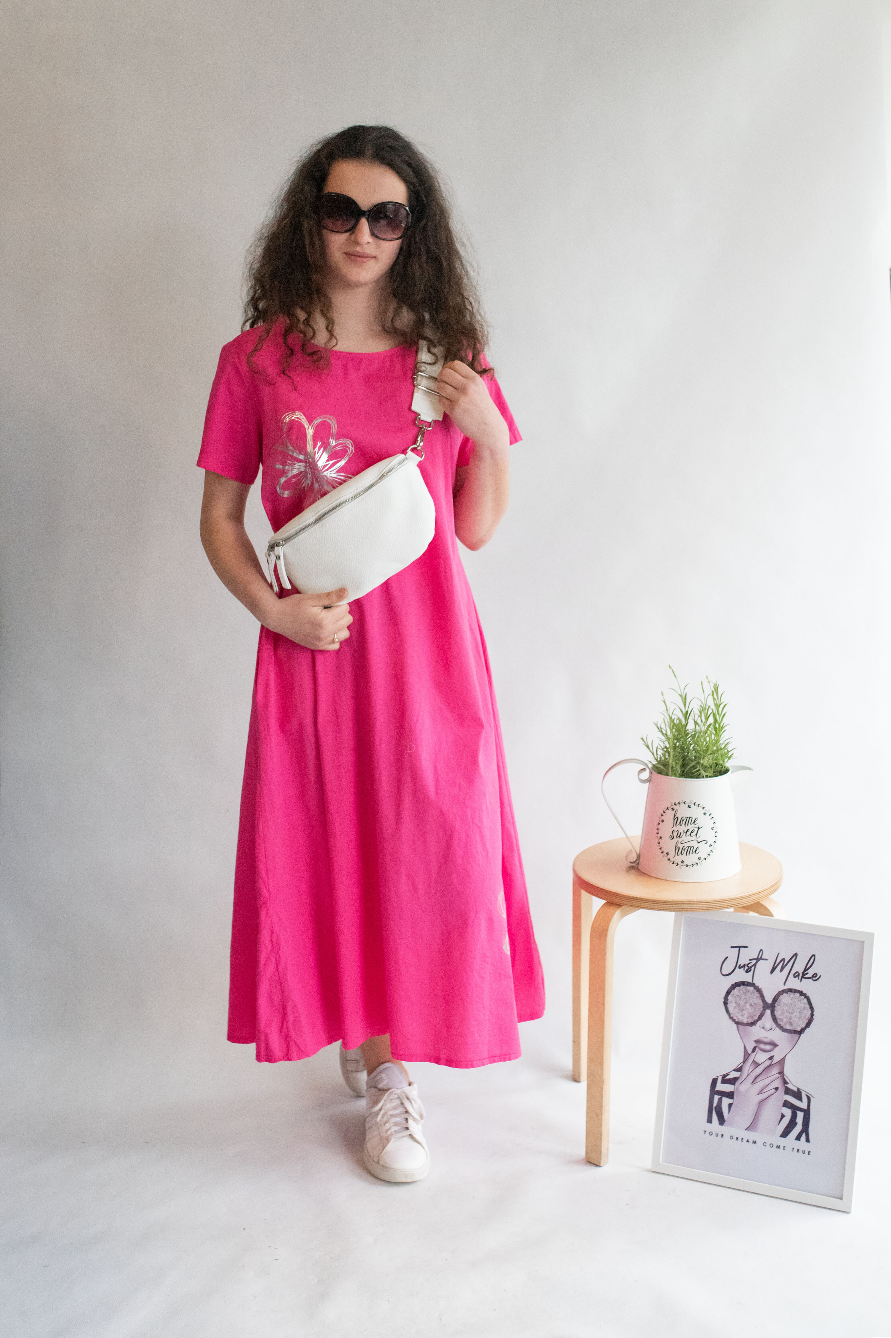 Dlouhé šaty s krátkým rukávem, všité kapsy po stranách, kulatý výstřih.