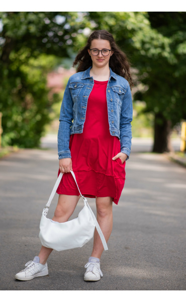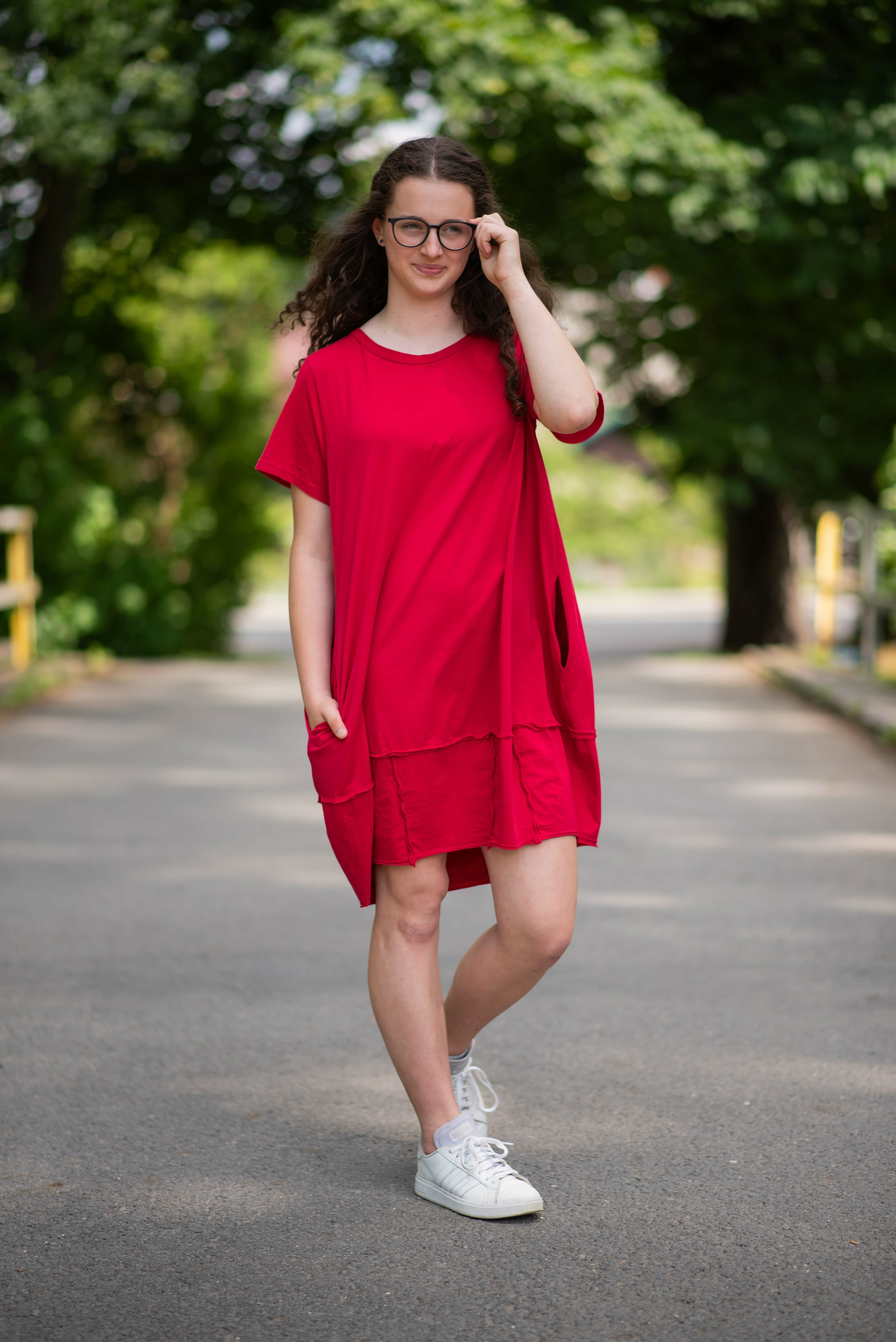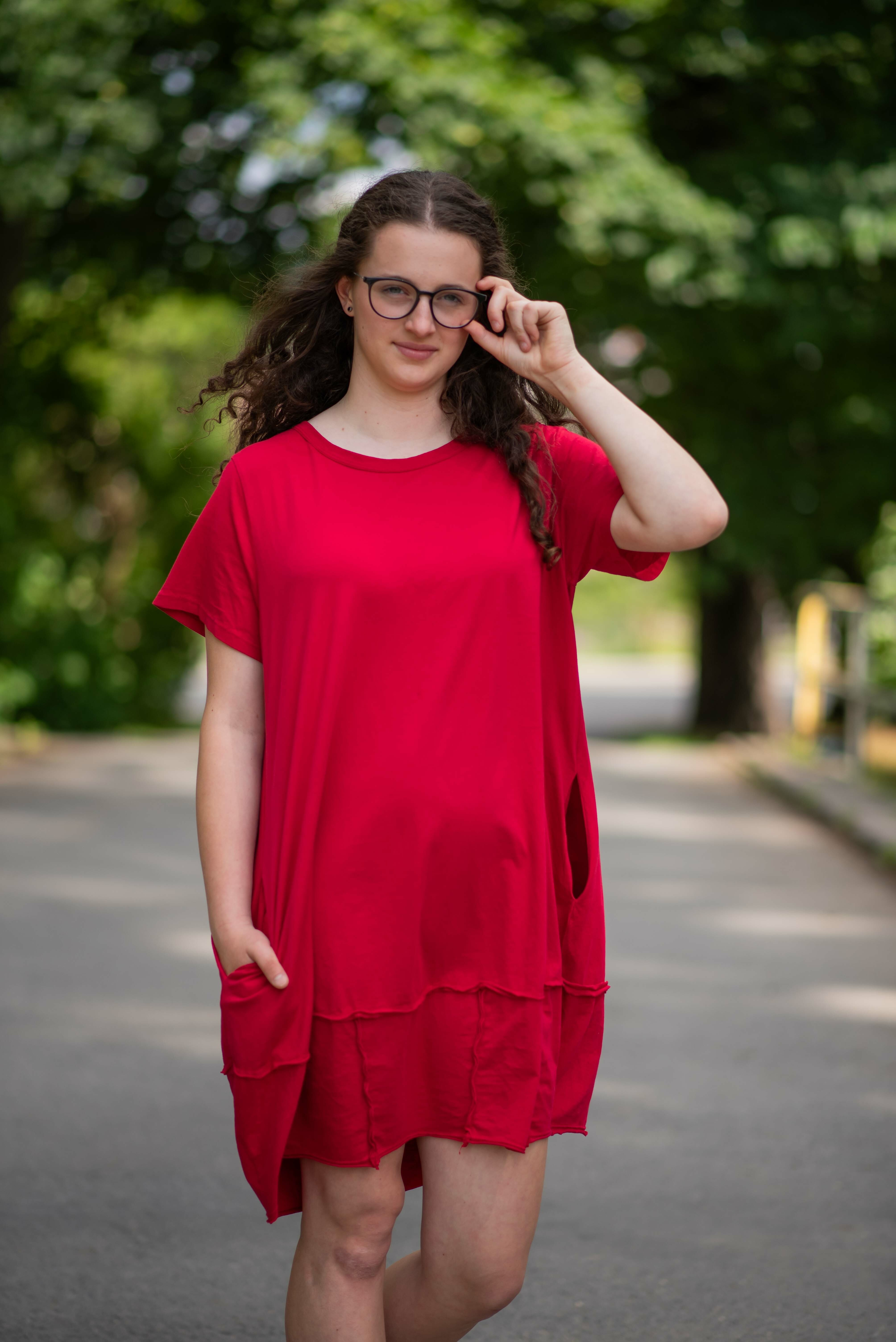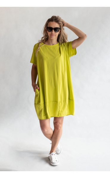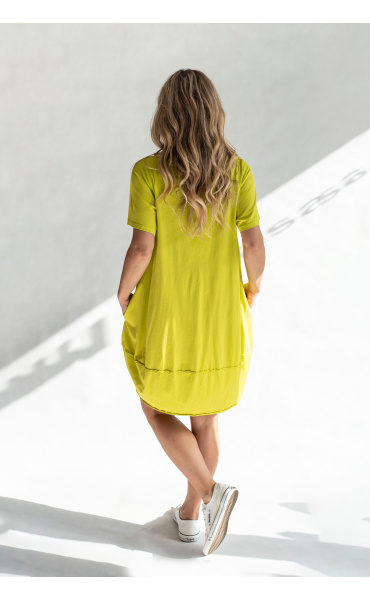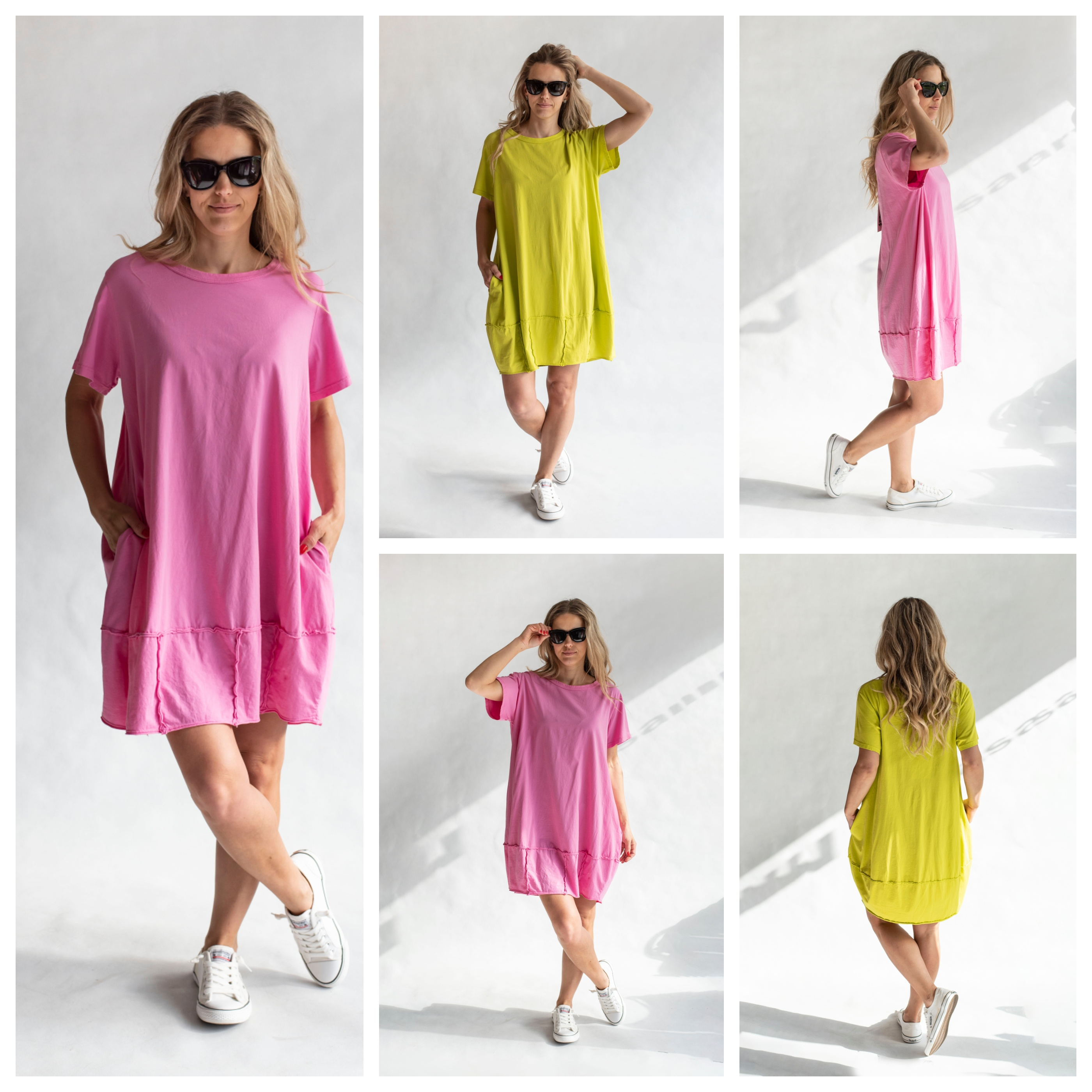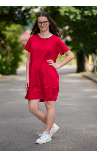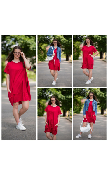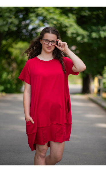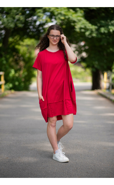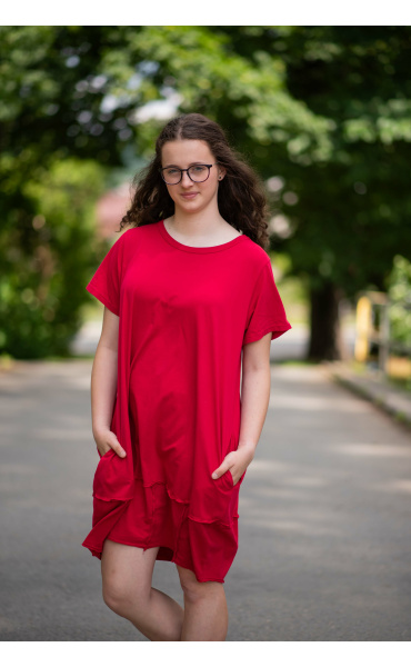 Módní bavlněné krátké šaty s krátkým rukávem a všitými kapsami.