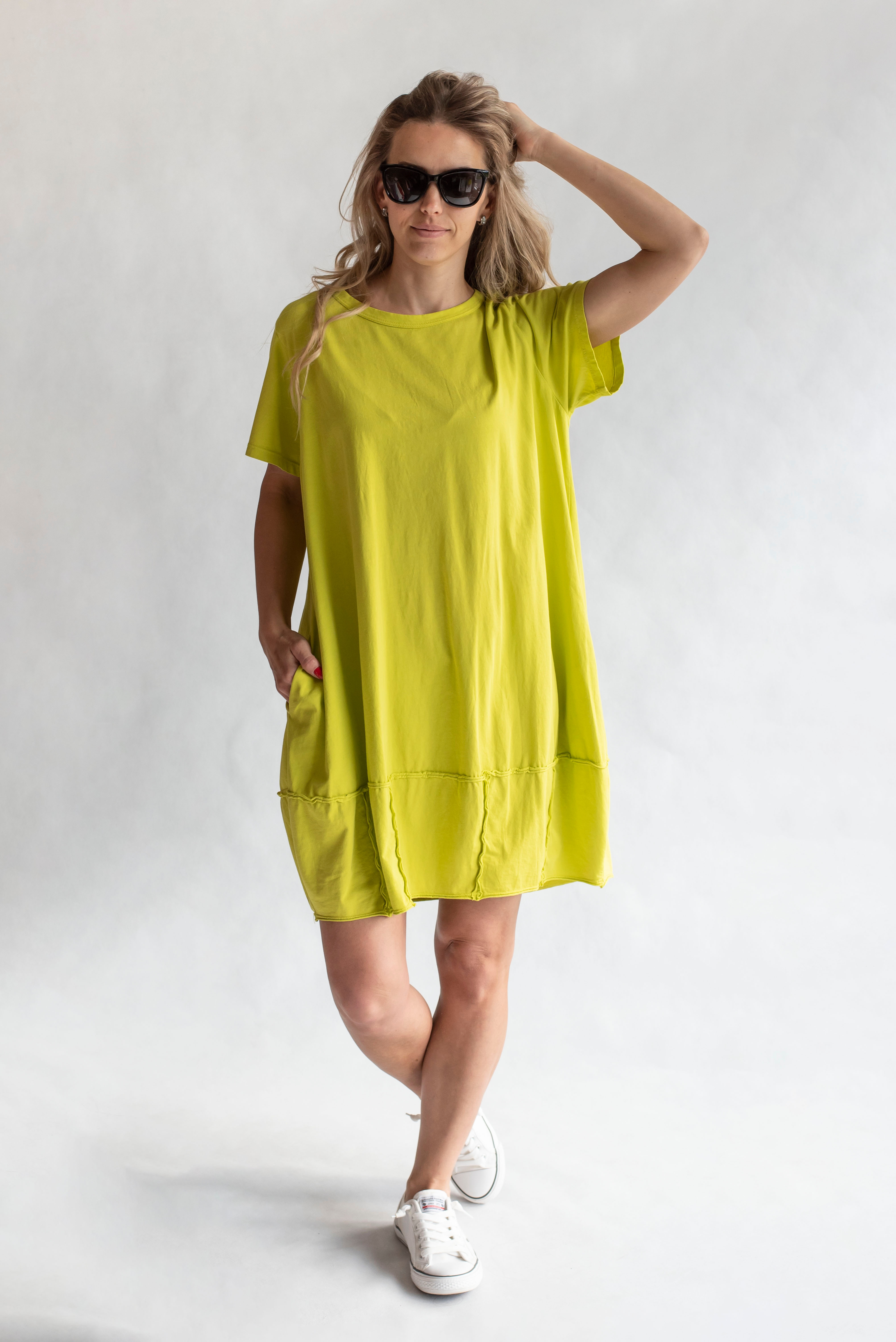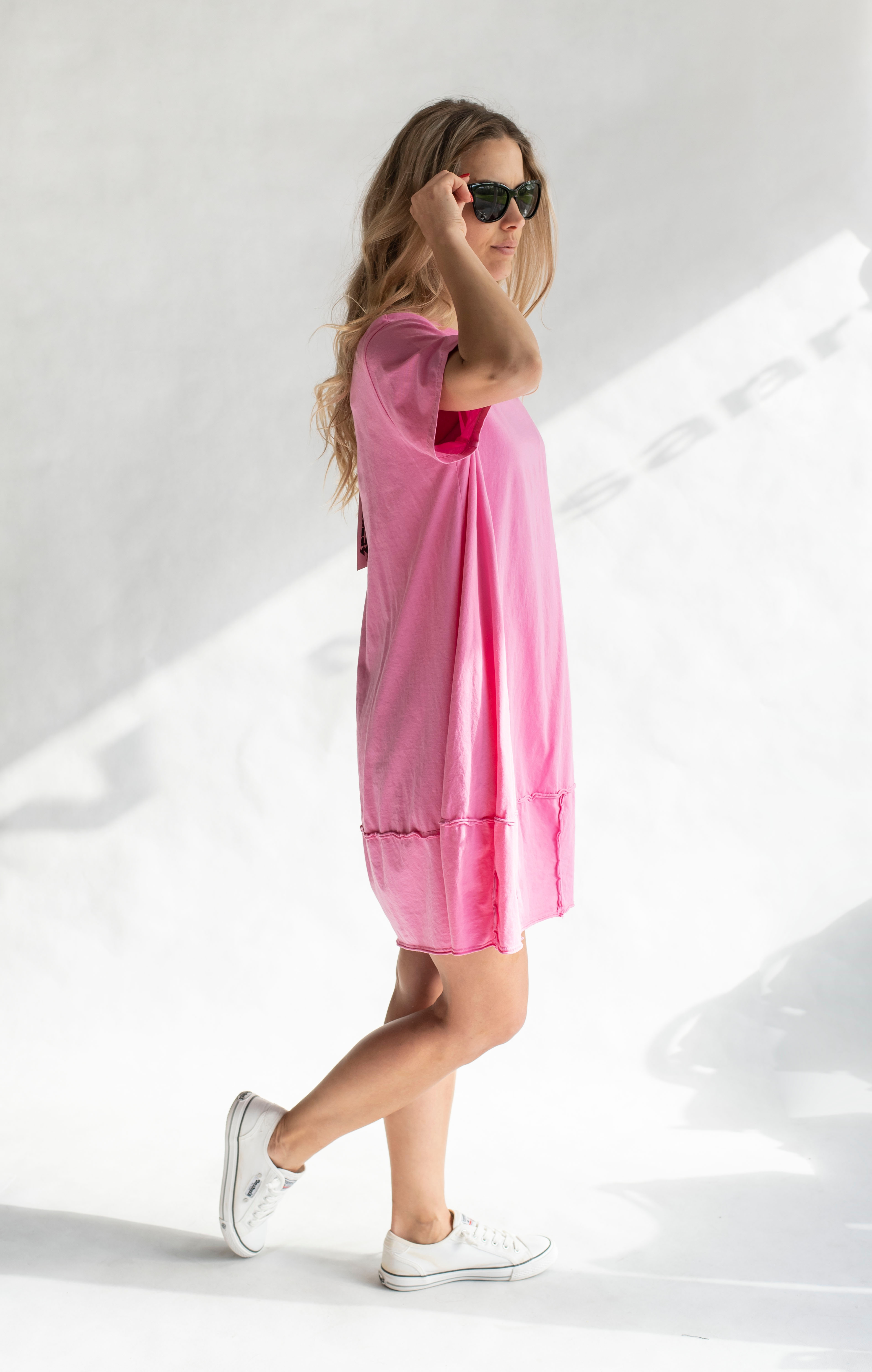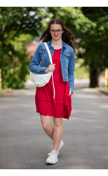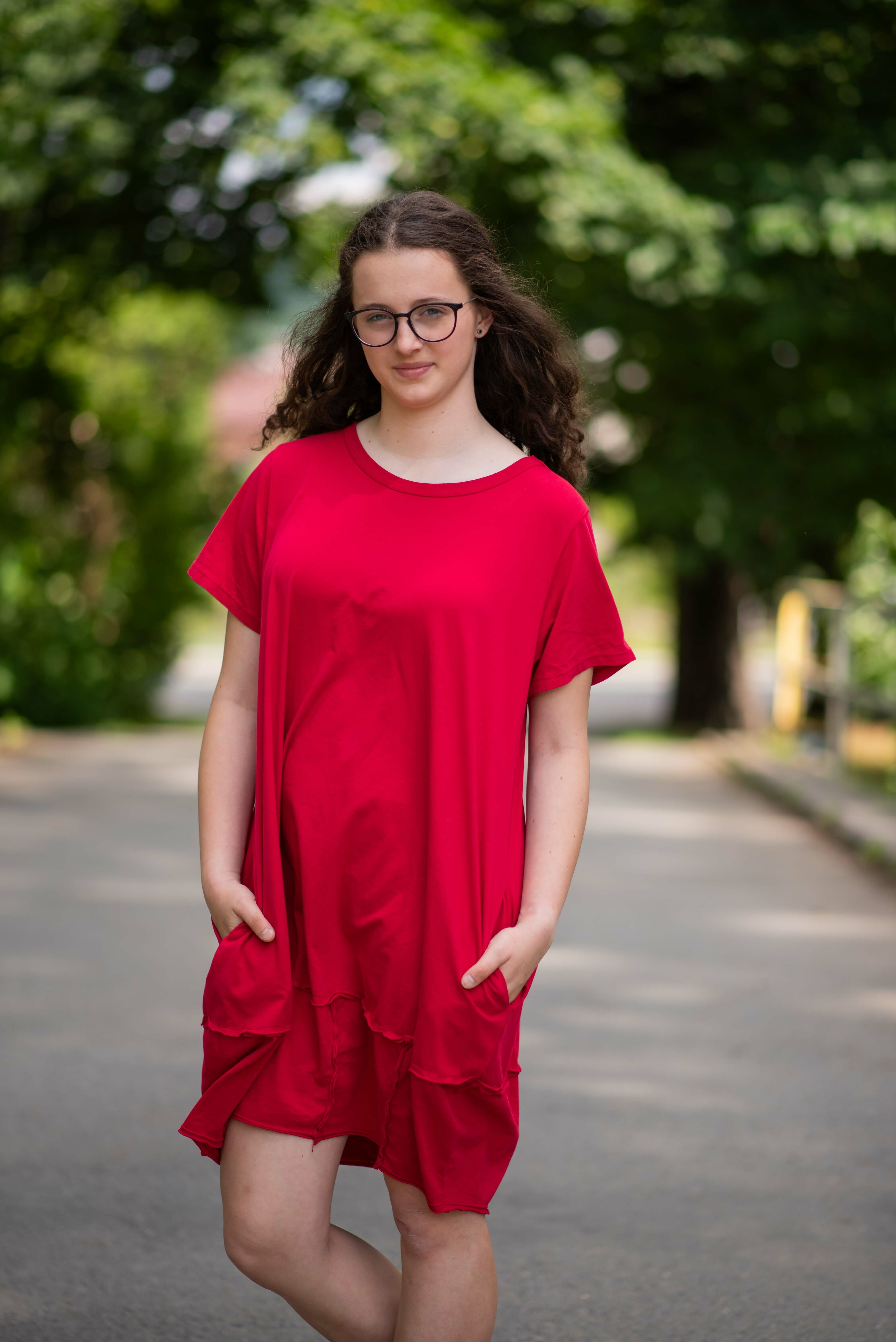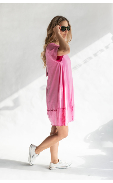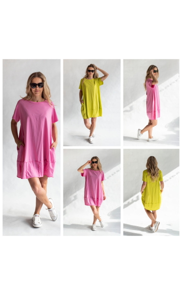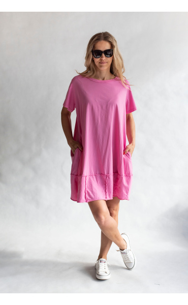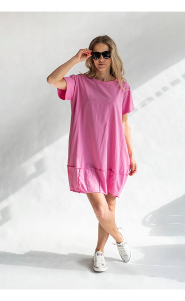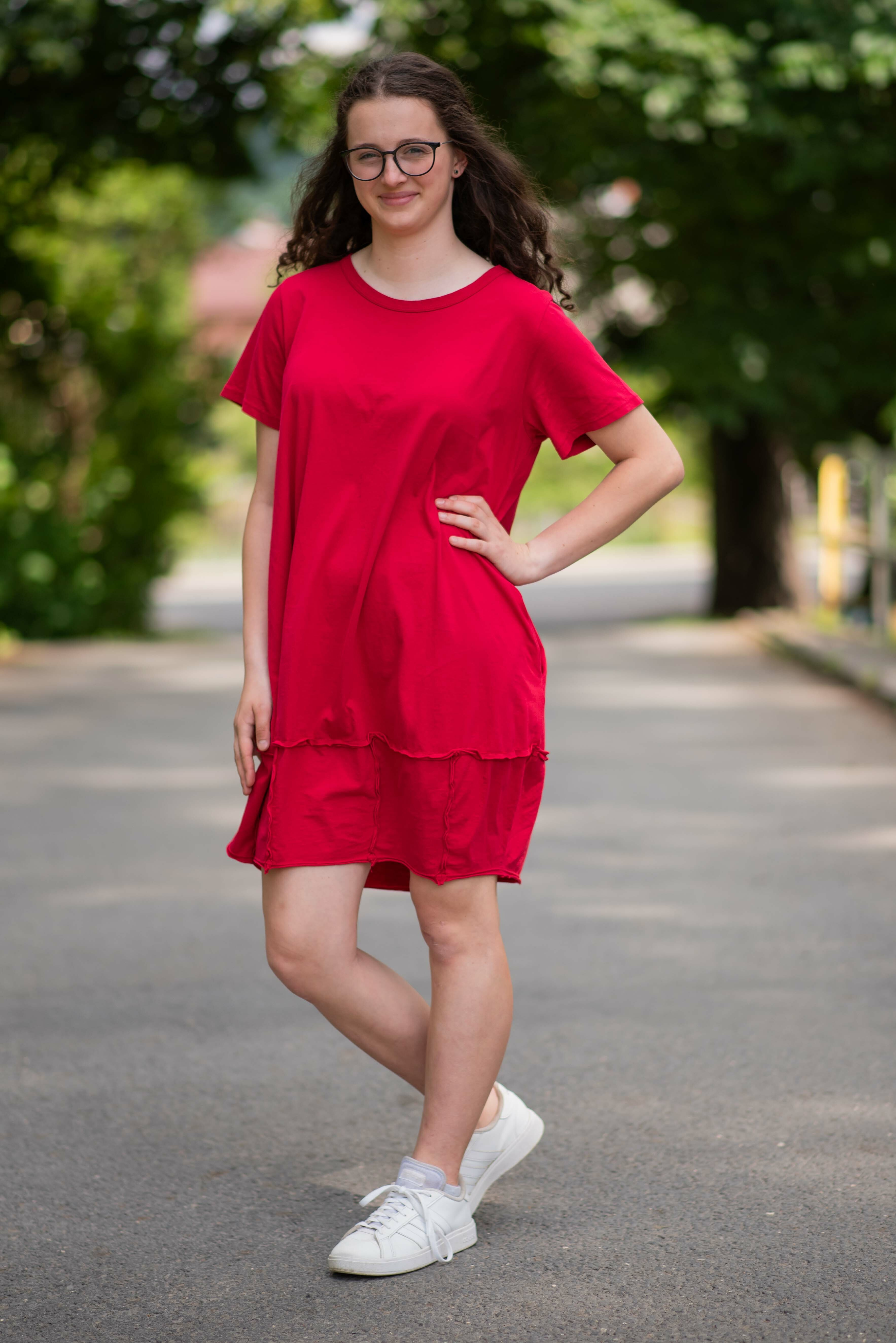 Módní bavlněné krátké šaty s krátkým rukávem a všitými kapsami.